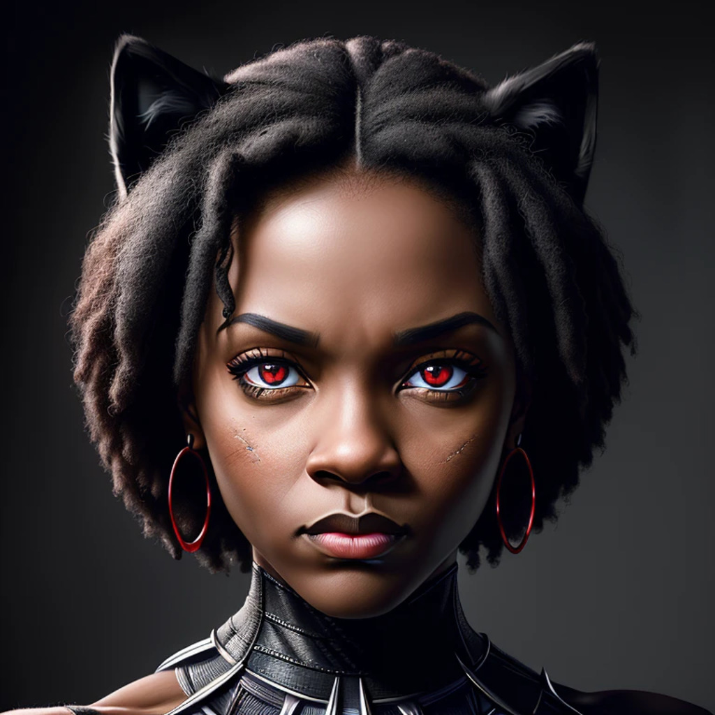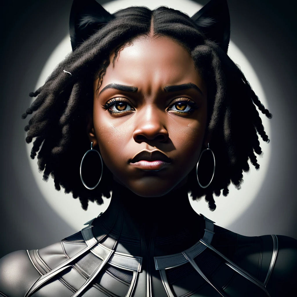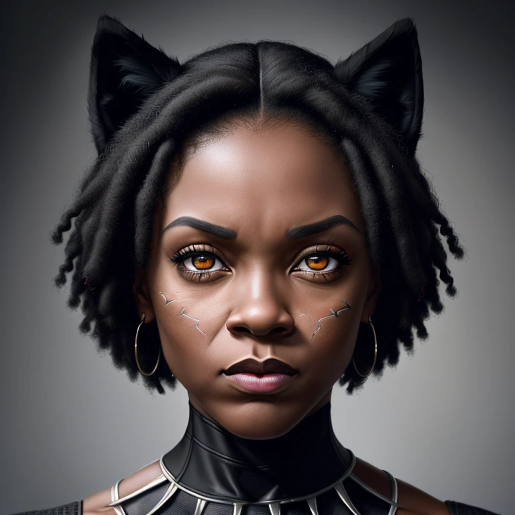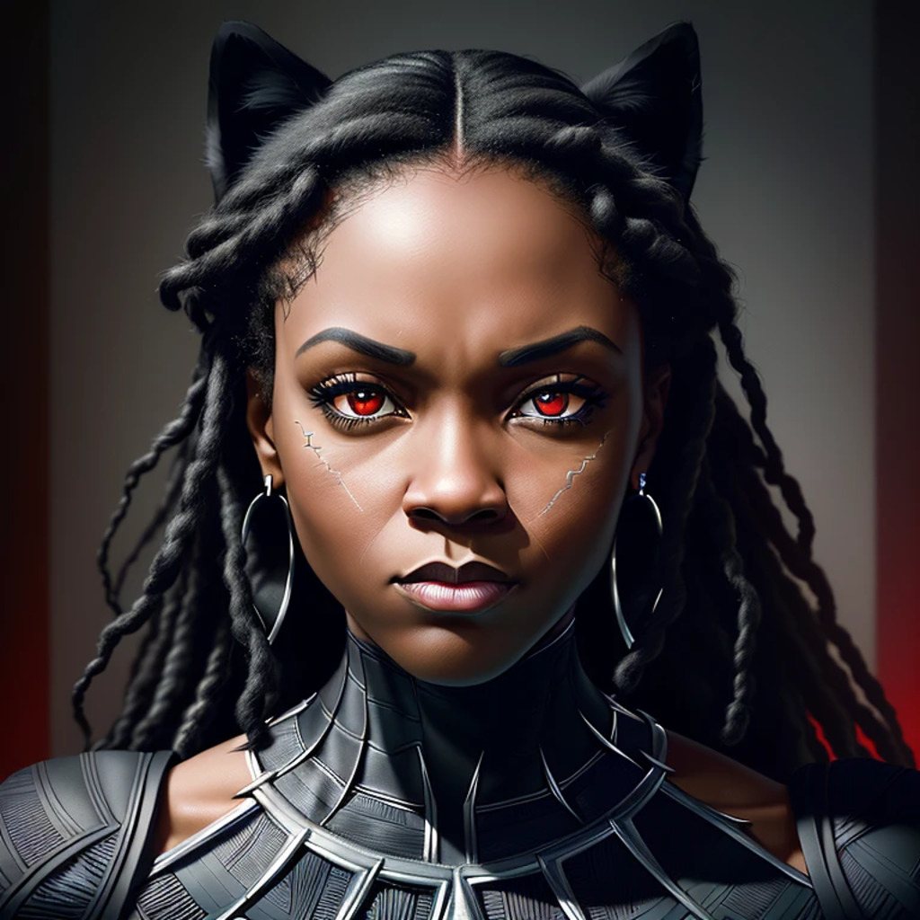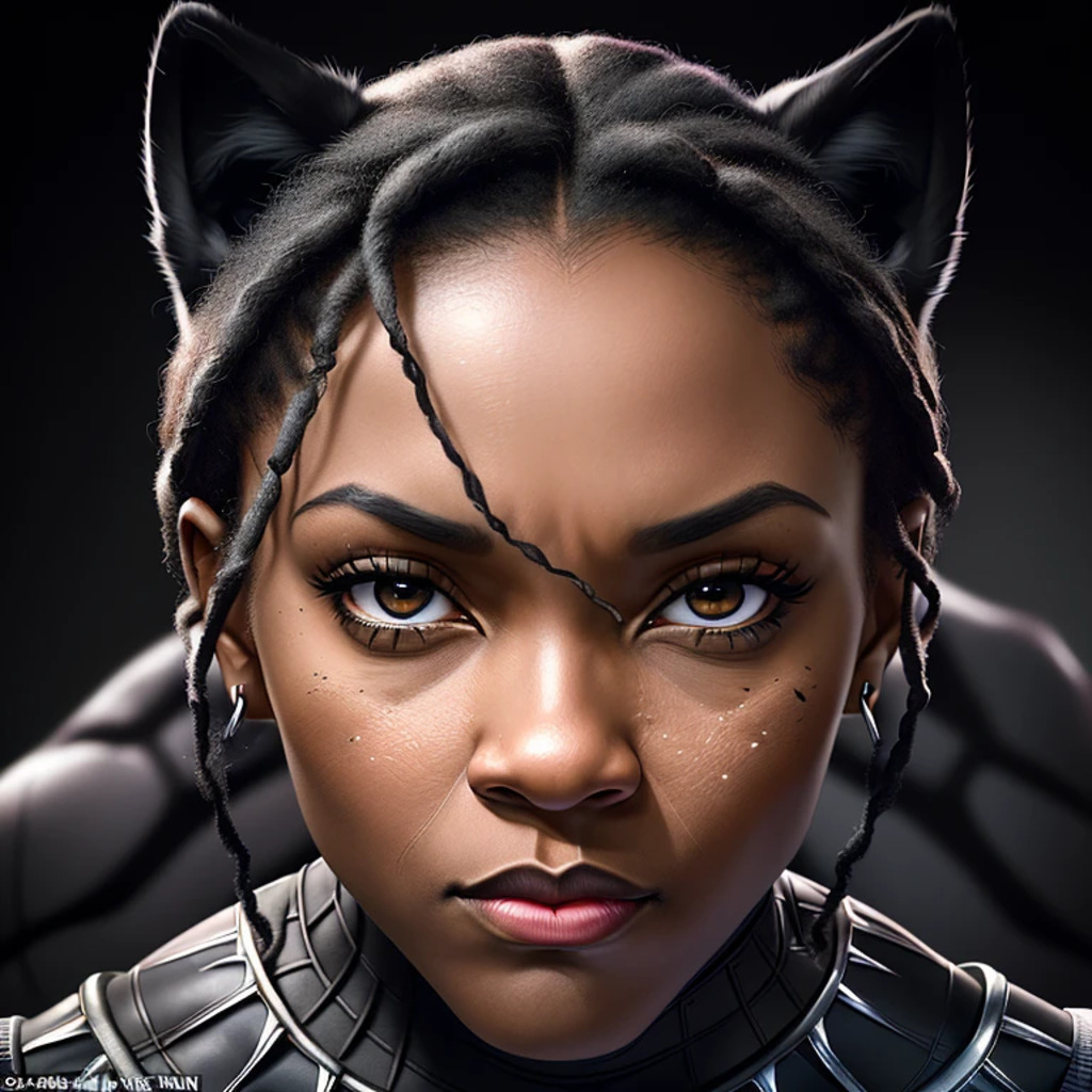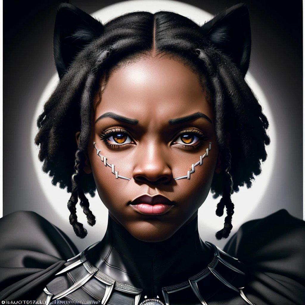 a portrait photography of a strong (black panther: black woman: 0.5), beautiful (black eyes)