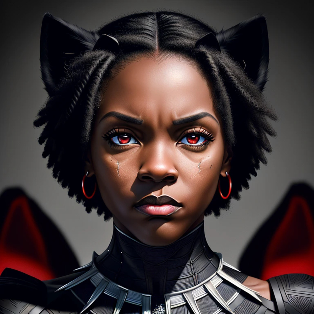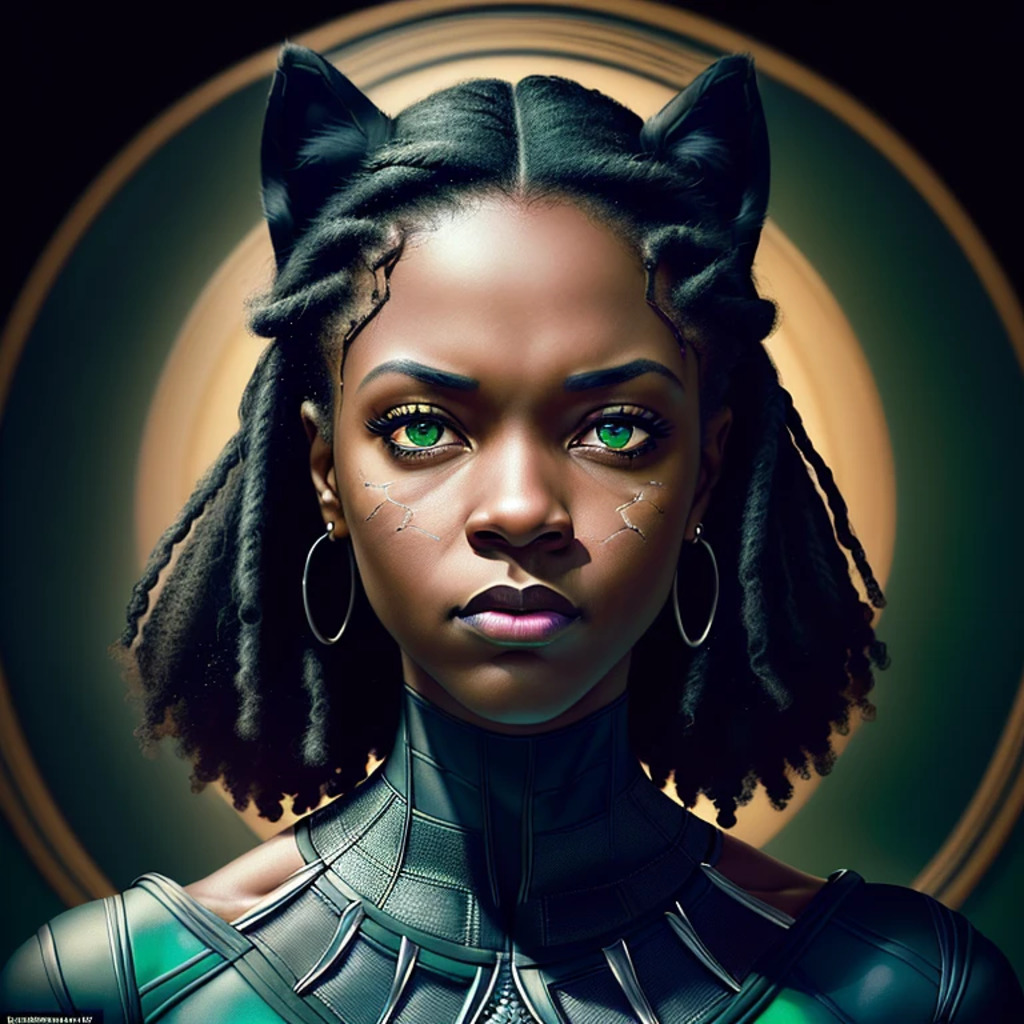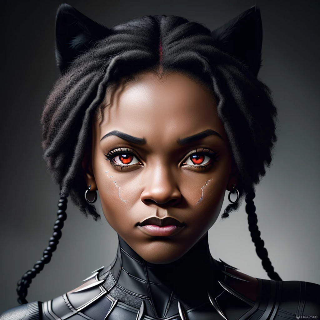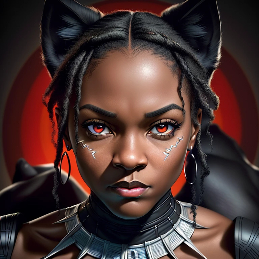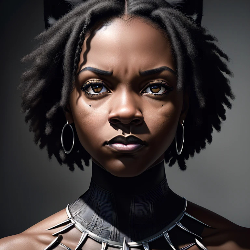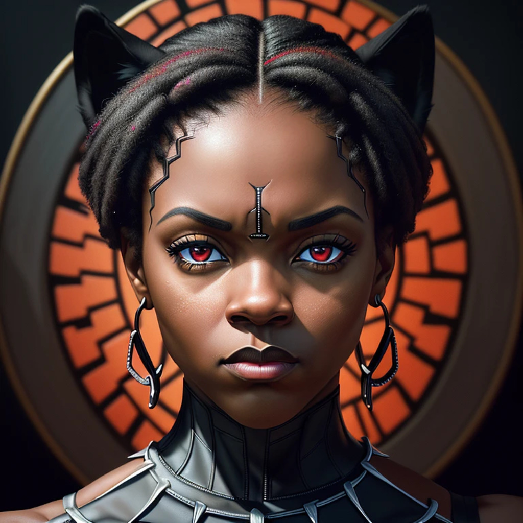 a portrait photography of a strong (black panther: black woman: 0.5), beautiful (black eyes)