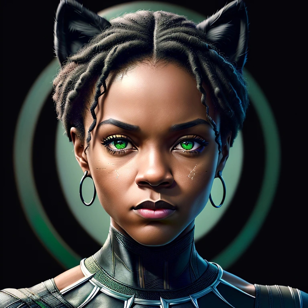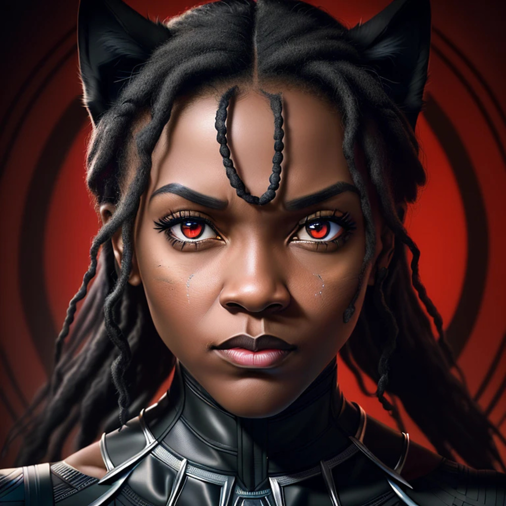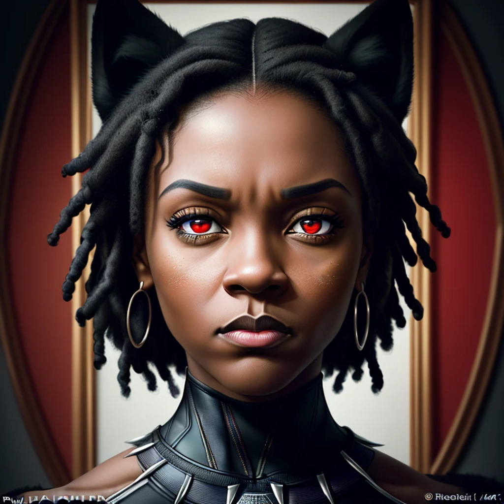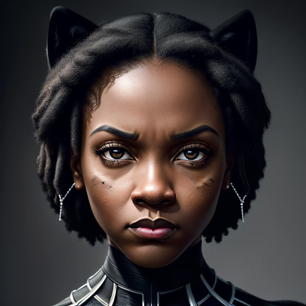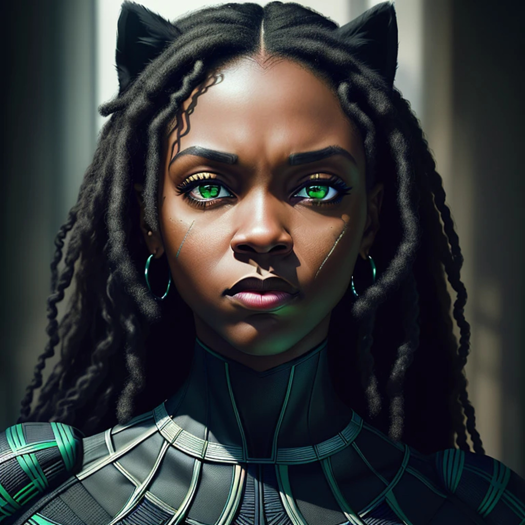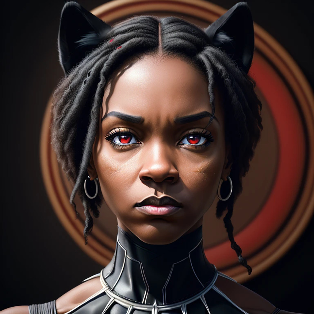 a portrait photography of a strong (black panther: black woman: 0.5), beautiful (black eyes)