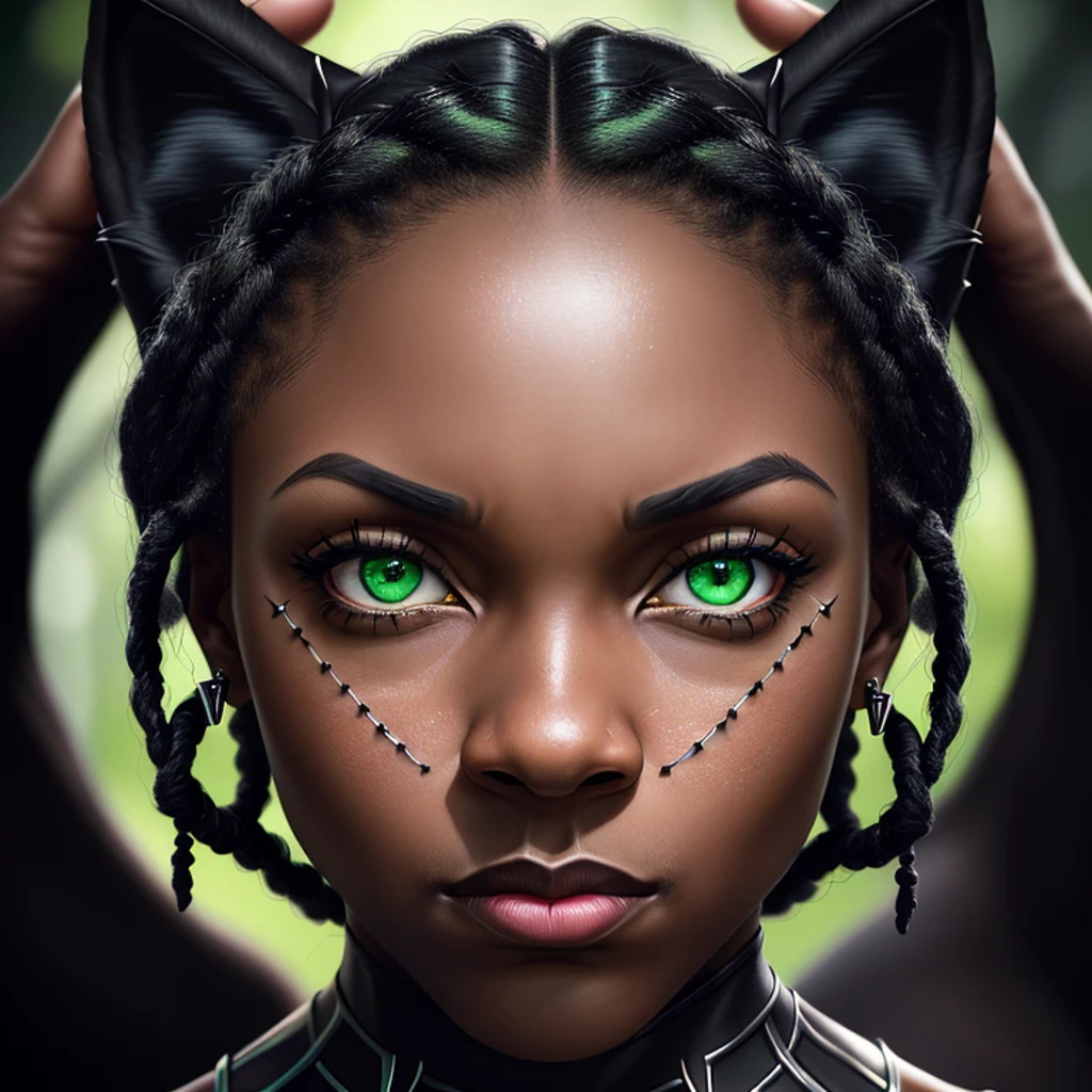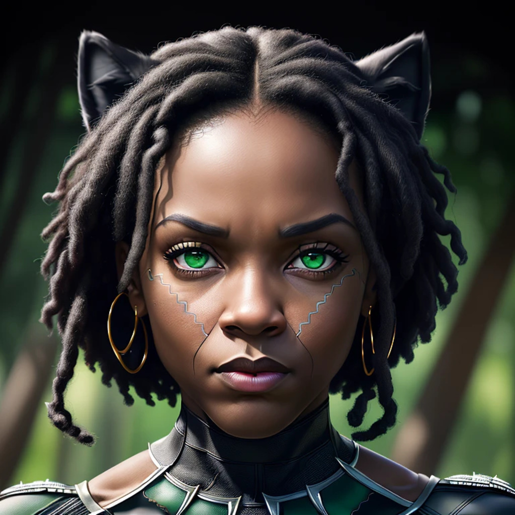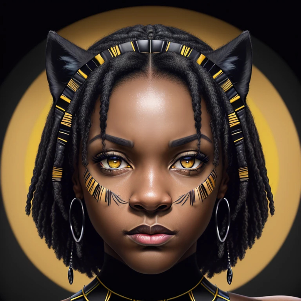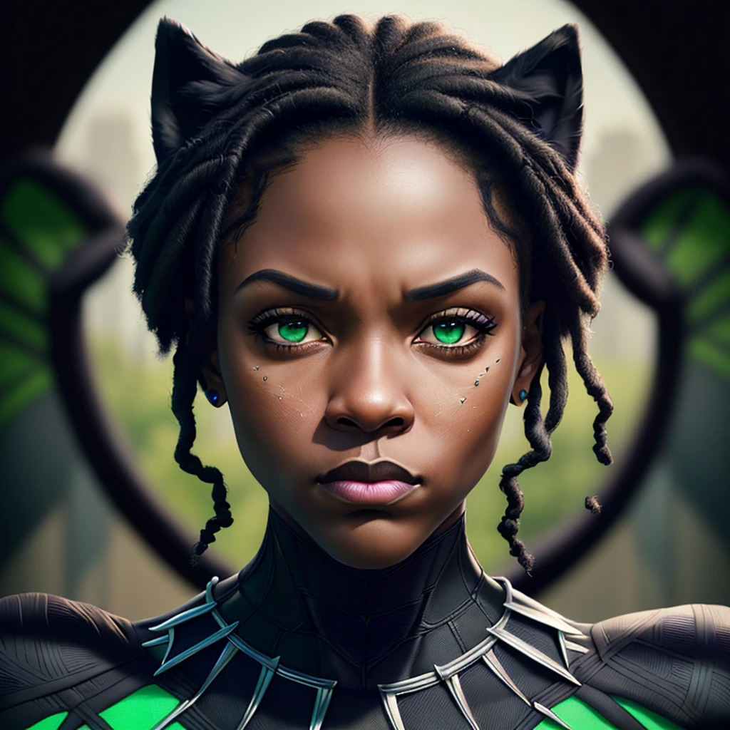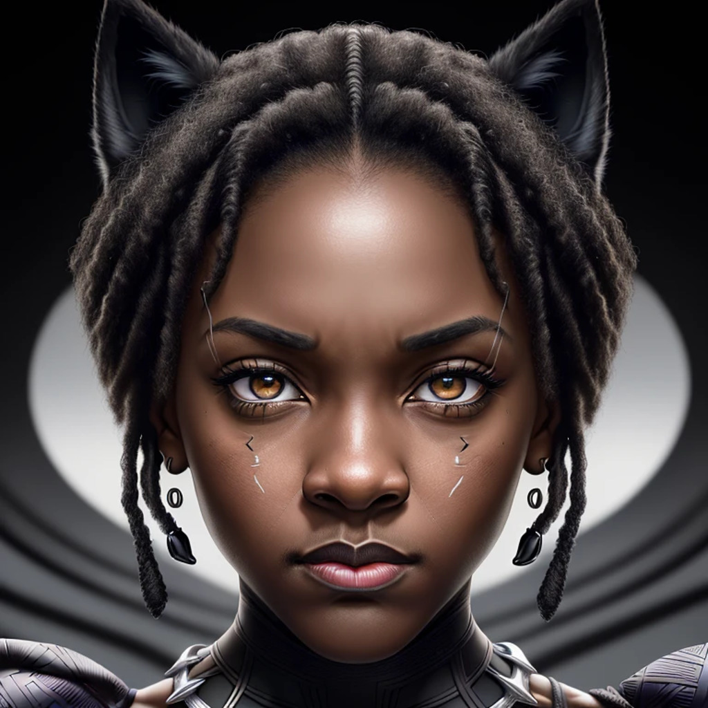 a portrait photography of a strong (black panther: black woman: 0.5), beautiful (black eyes)