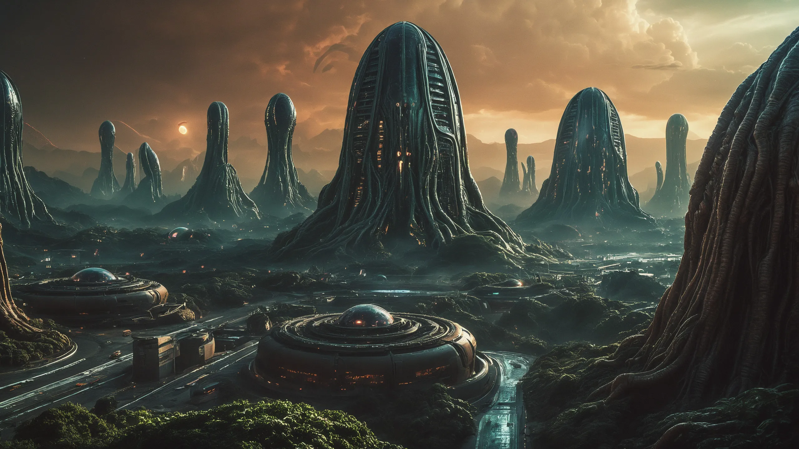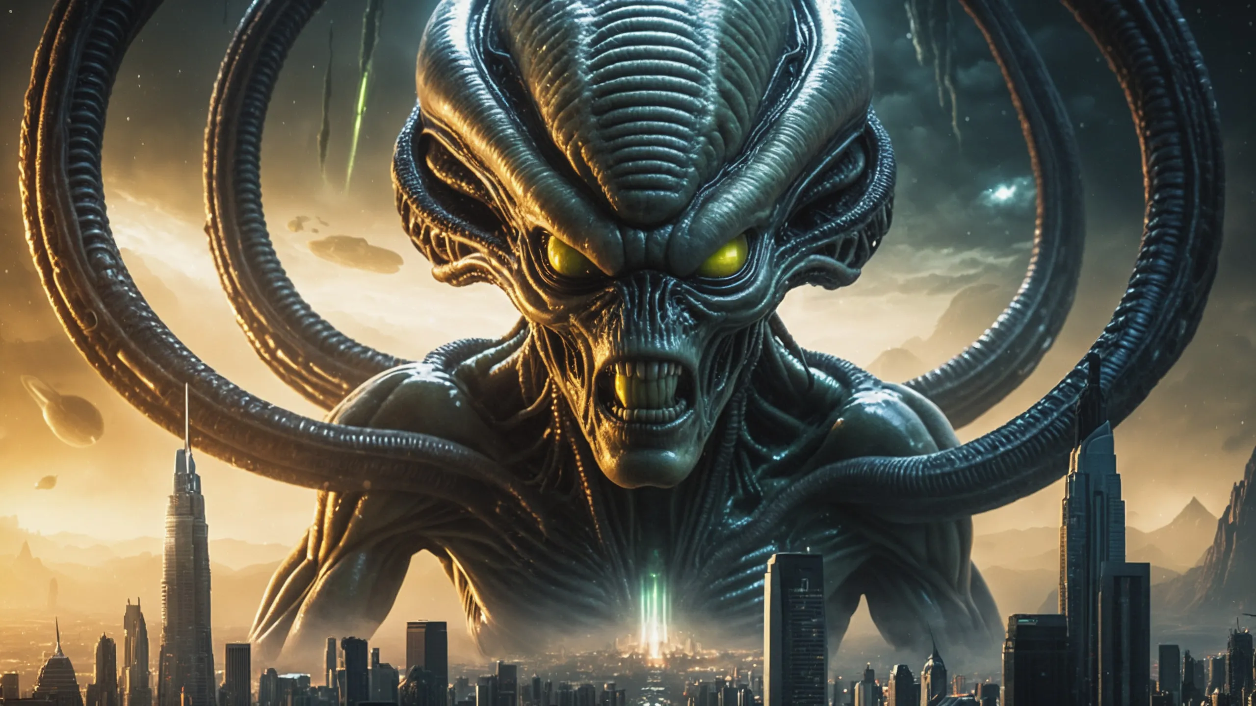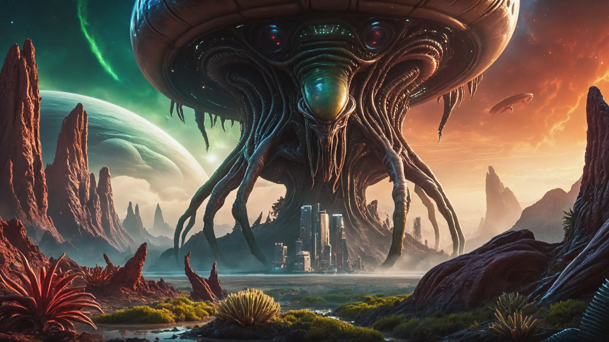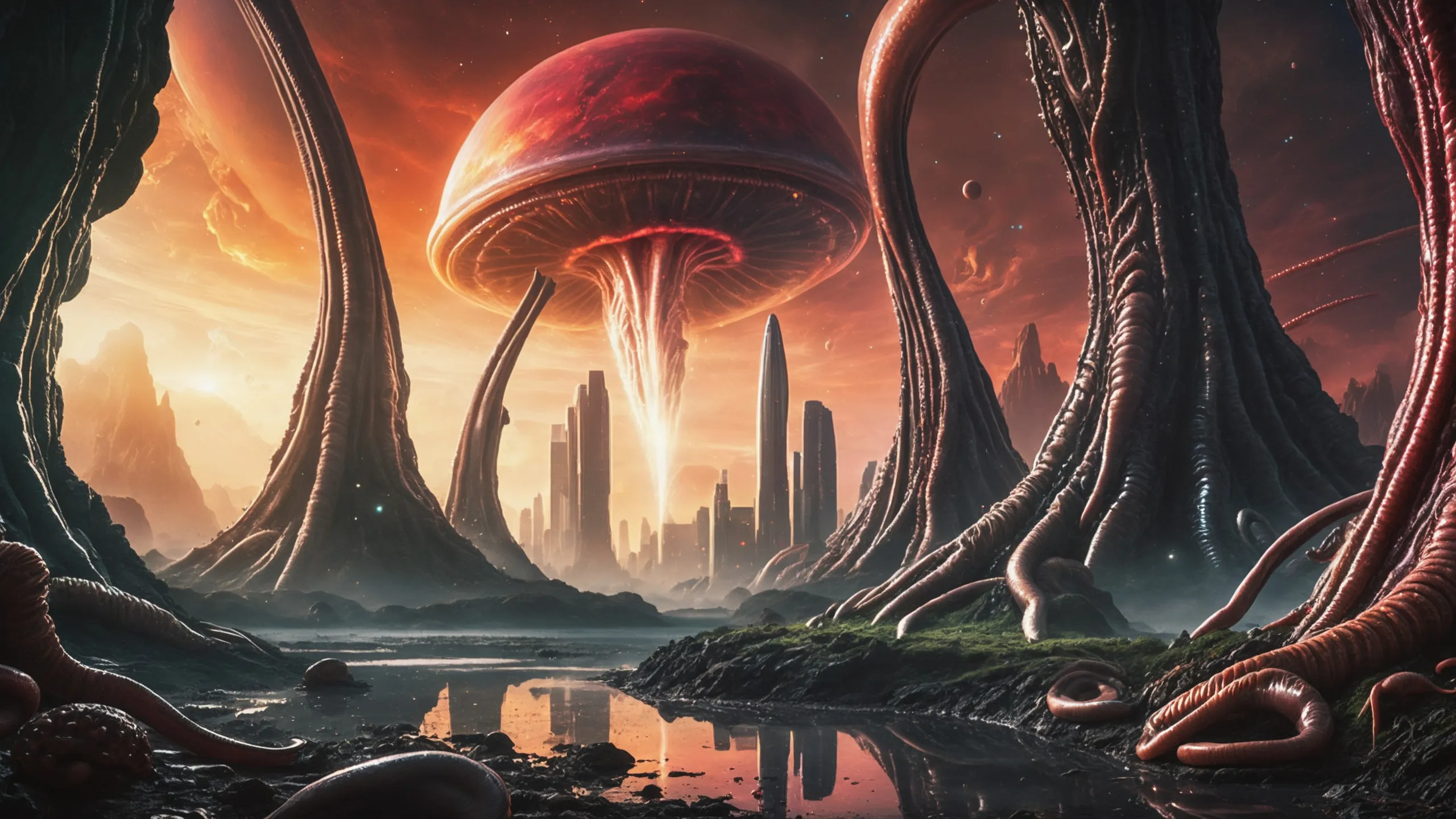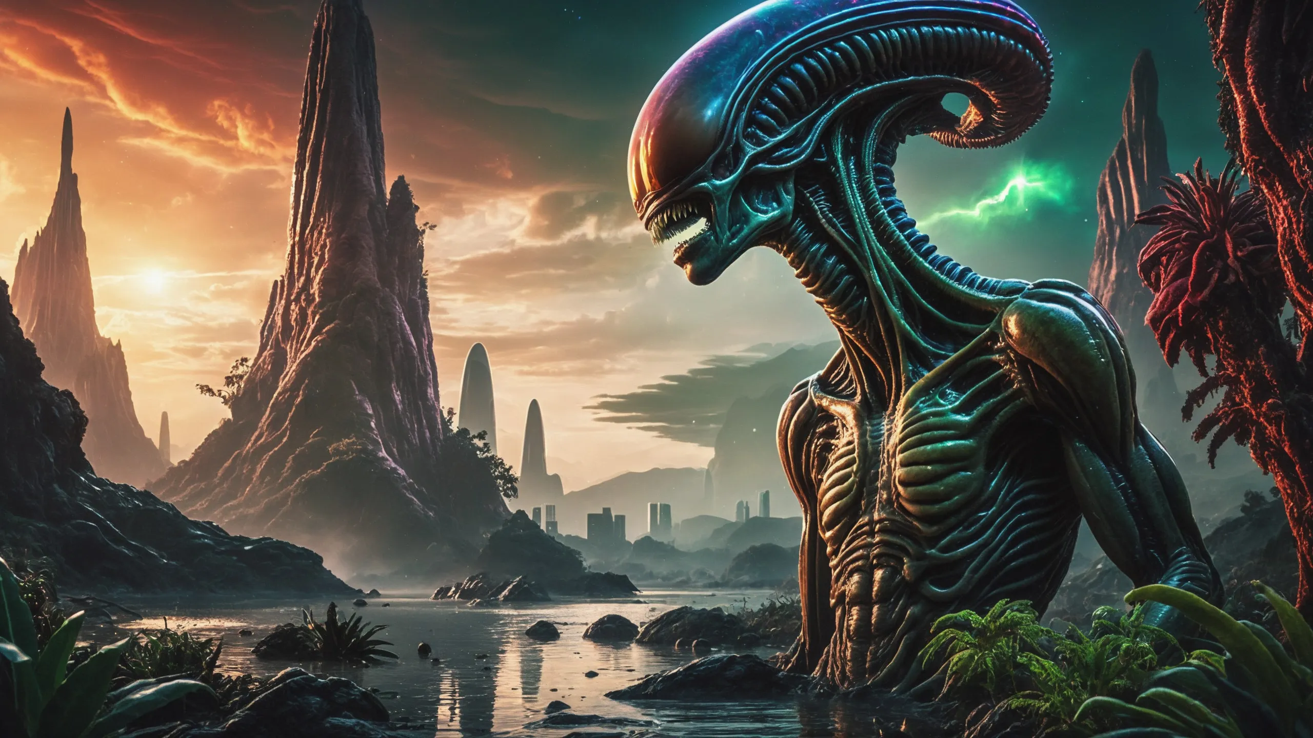 Cinematic epic scene of a (Sience Fiction, alien {mega city|cityscape|landscape|space station|outer space|world}:1.5).