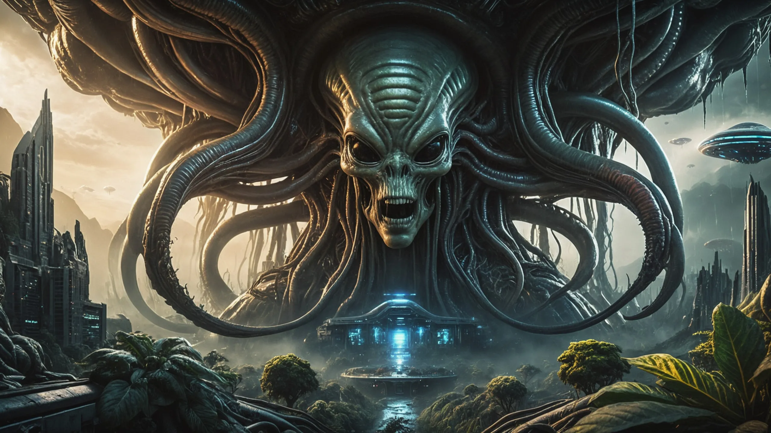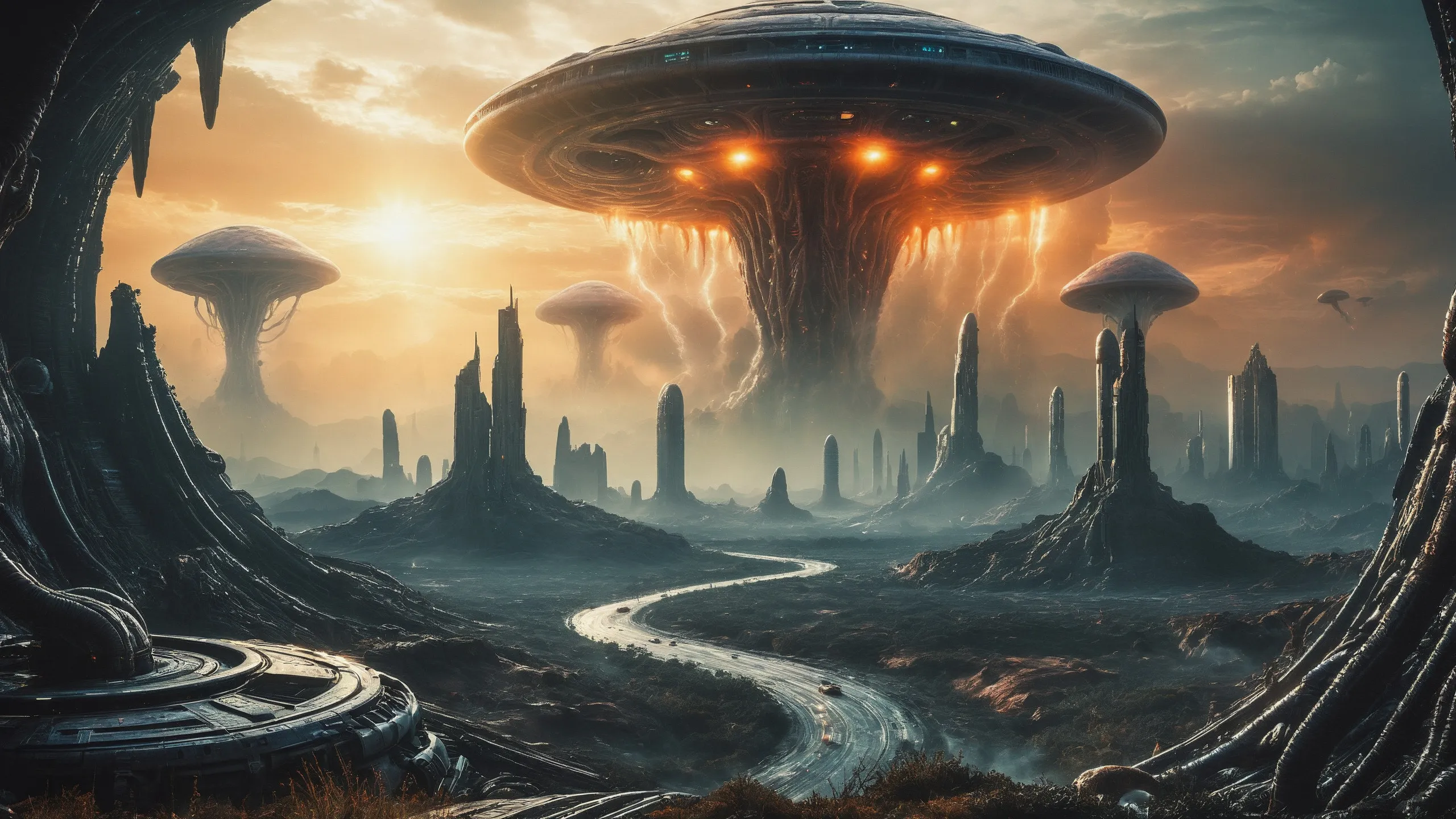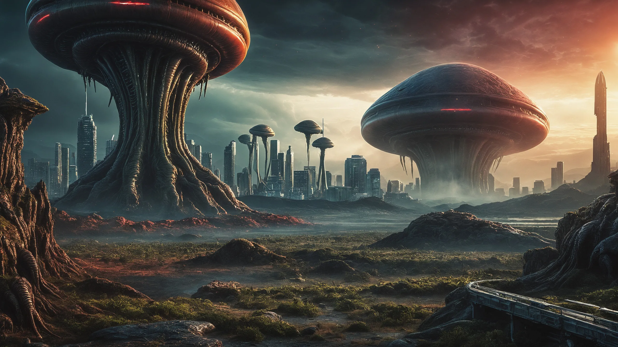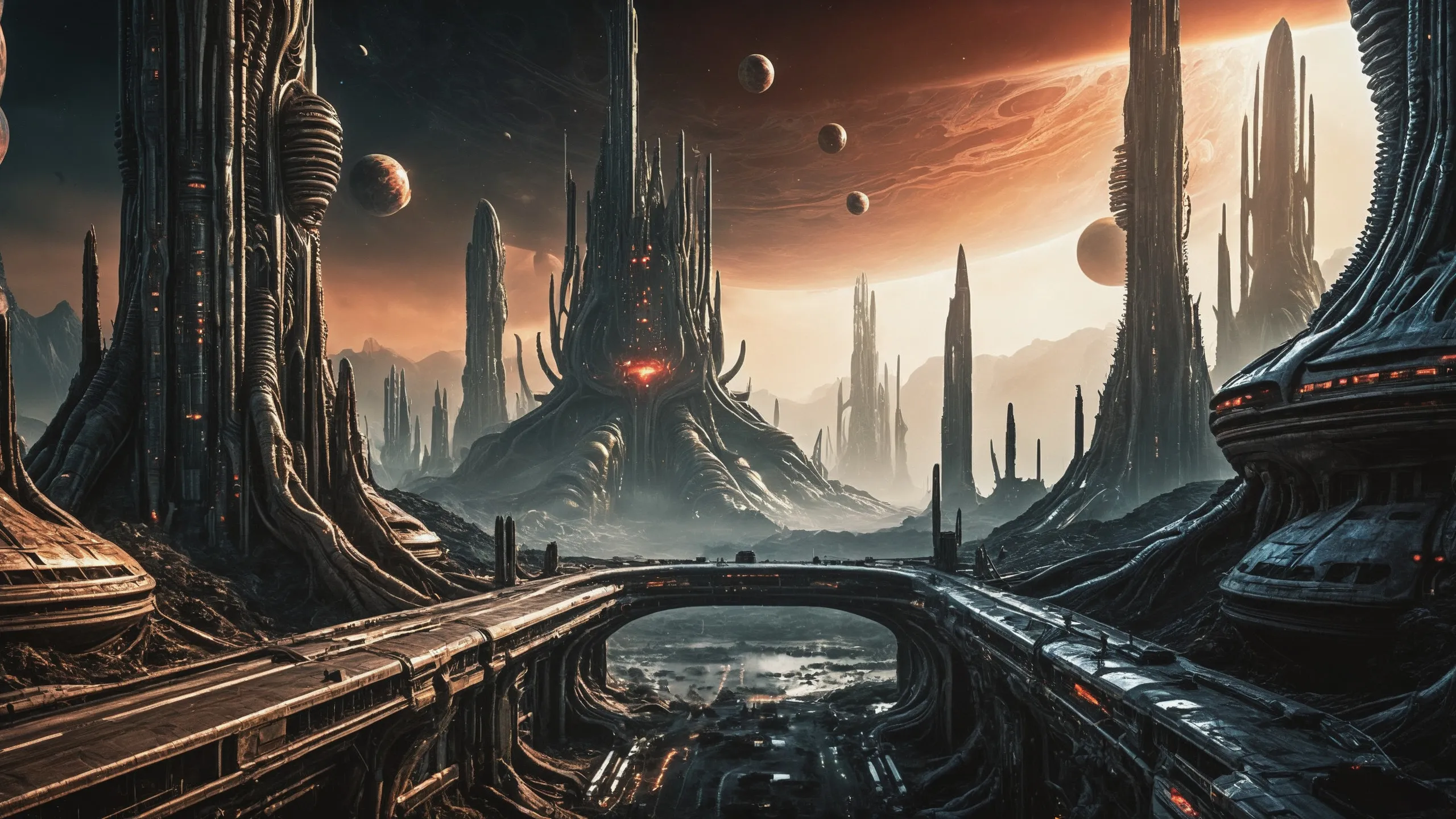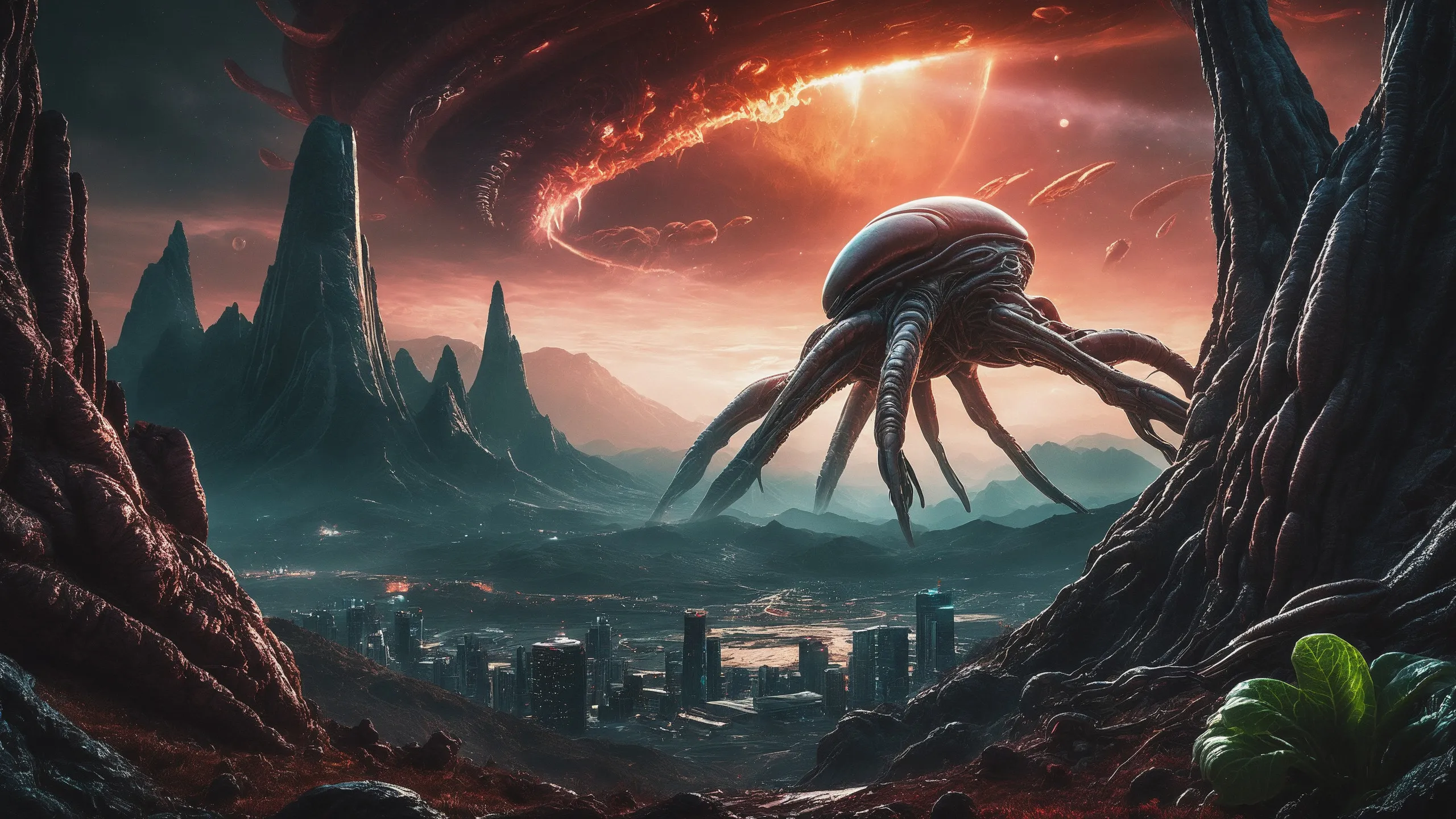 Cinematic epic scene of a (Sience Fiction, alien {mega city|cityscape|landscape|space station|outer space|world}:1.5).