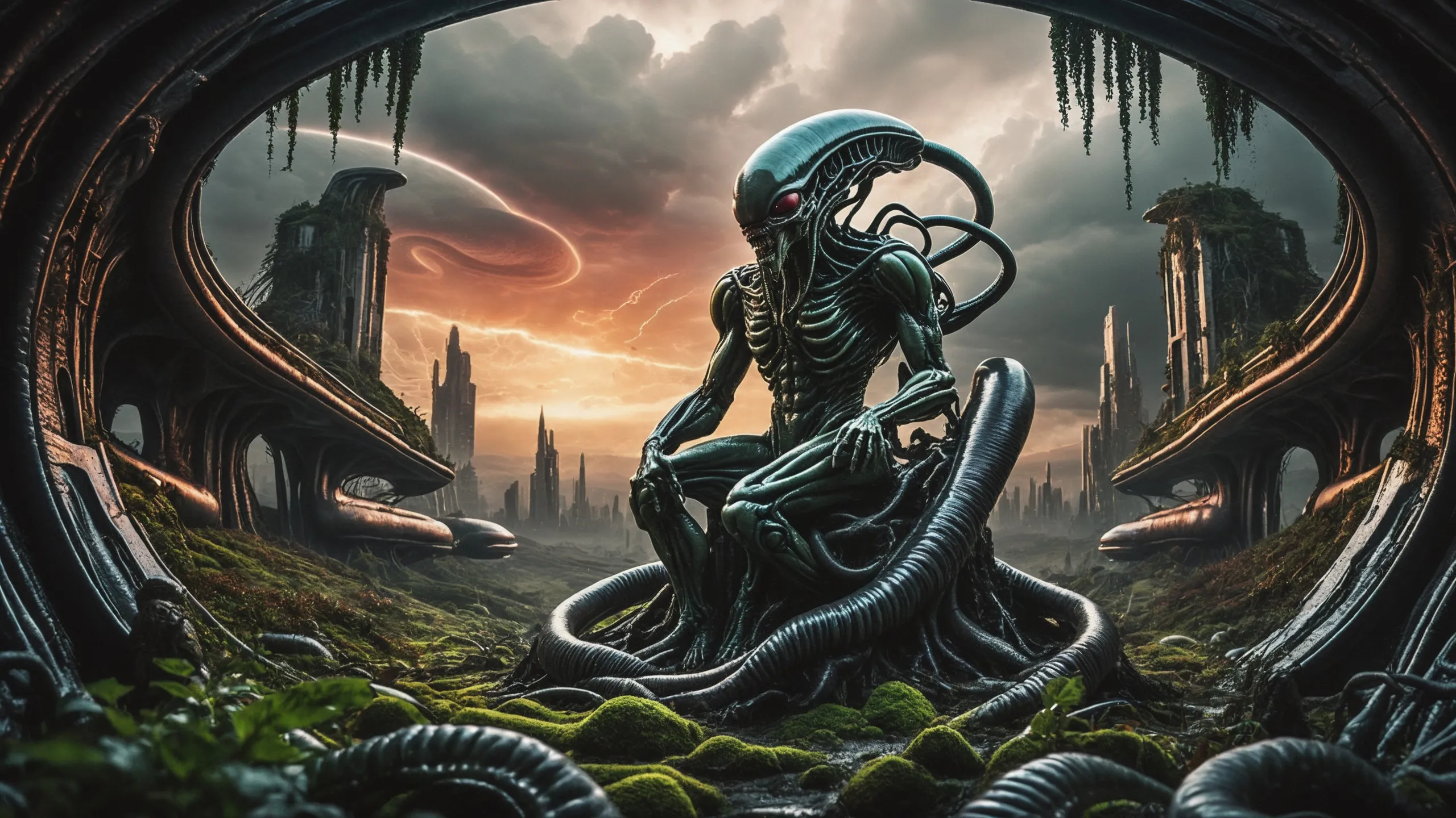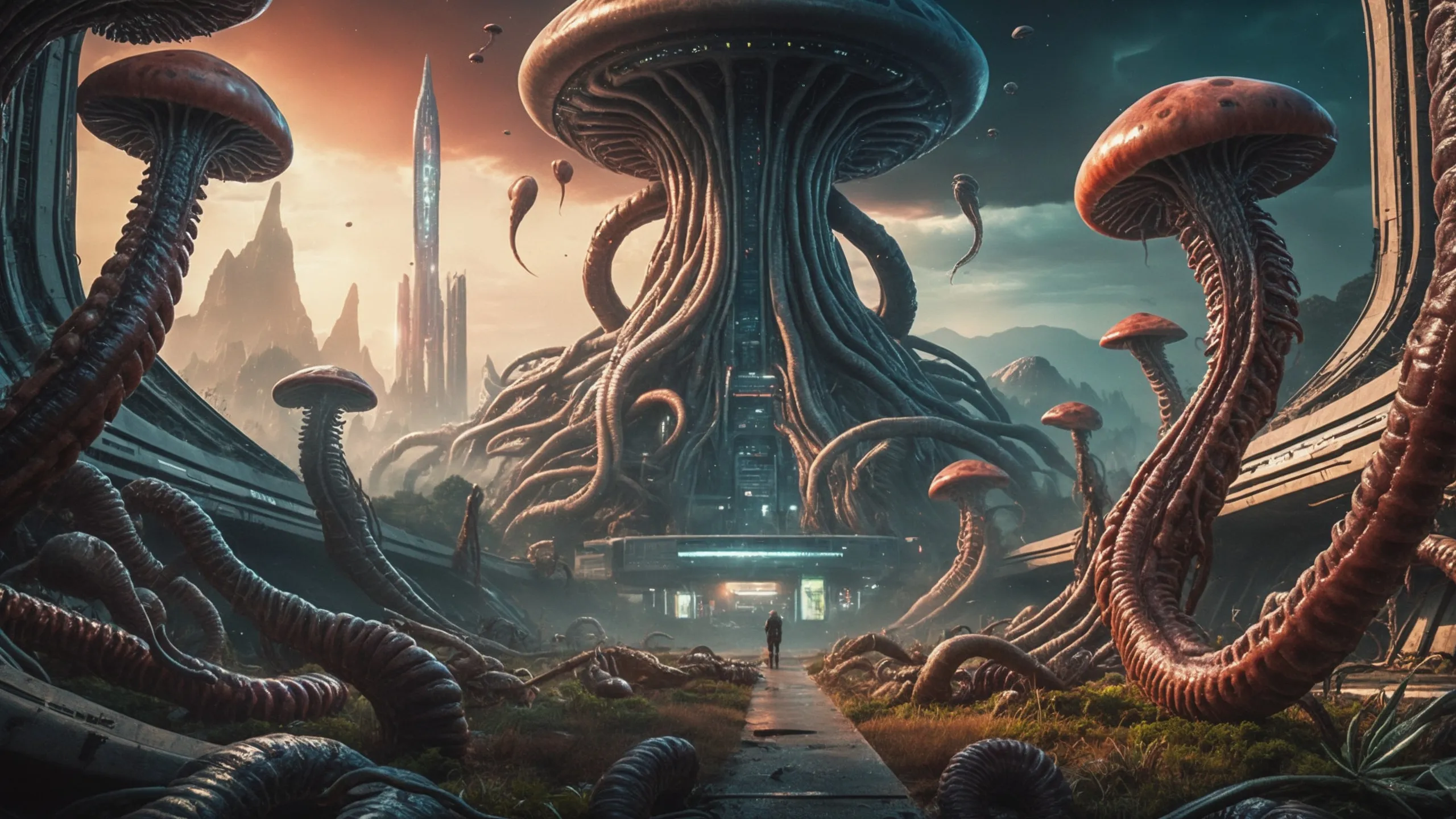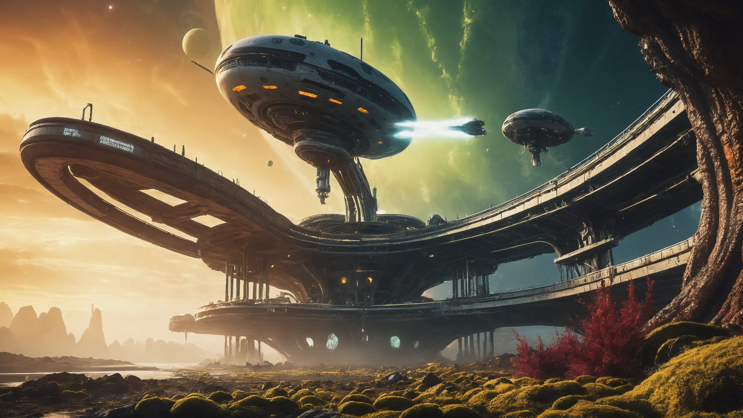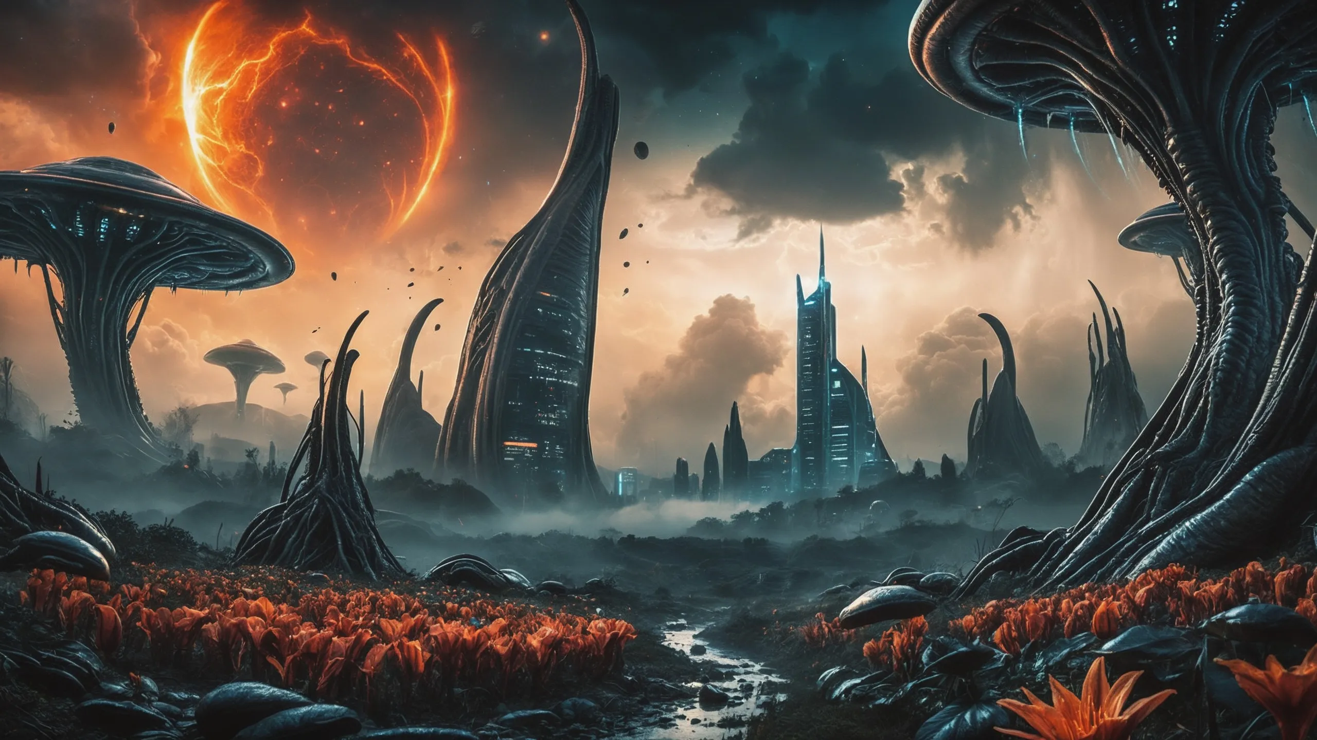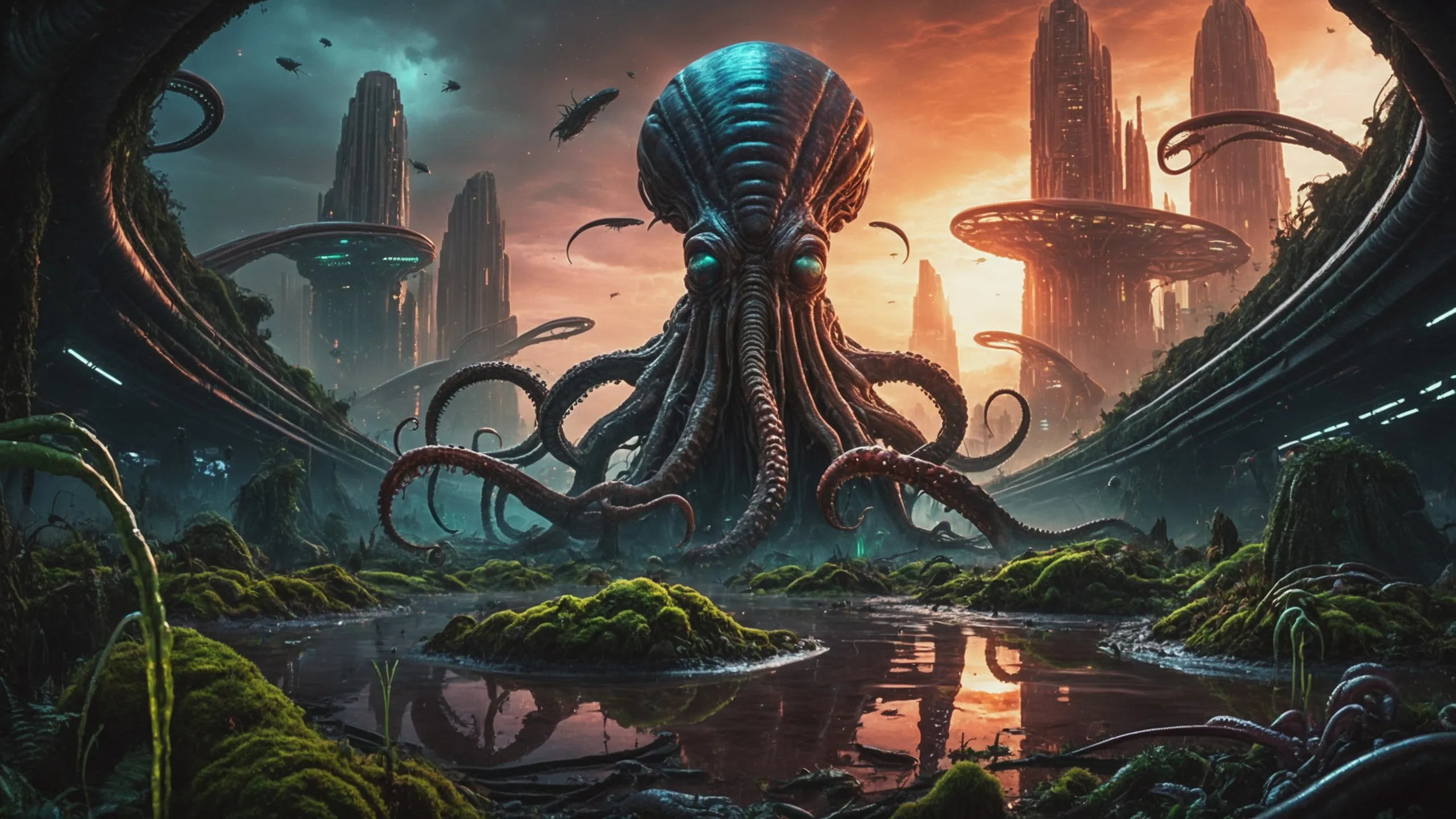 Cinematic epic scene of a (Sience Fiction, alien {mega city|cityscape|landscape|space station|outer space|world}:1.5).