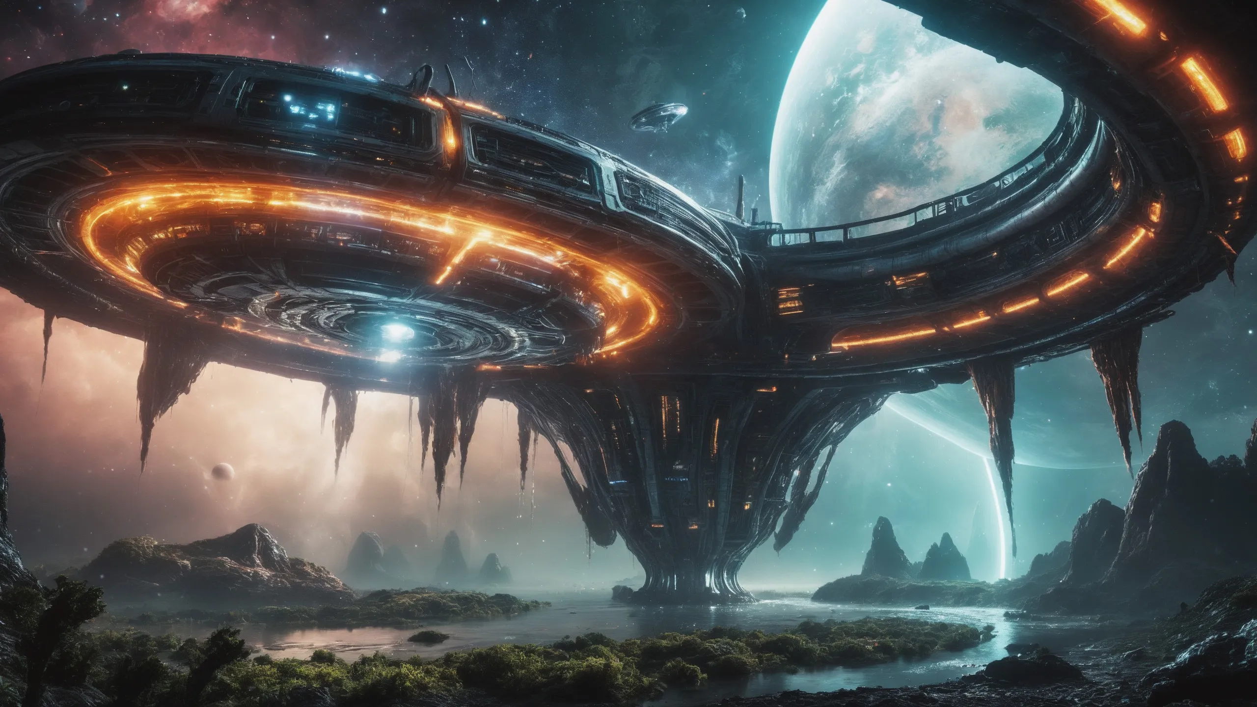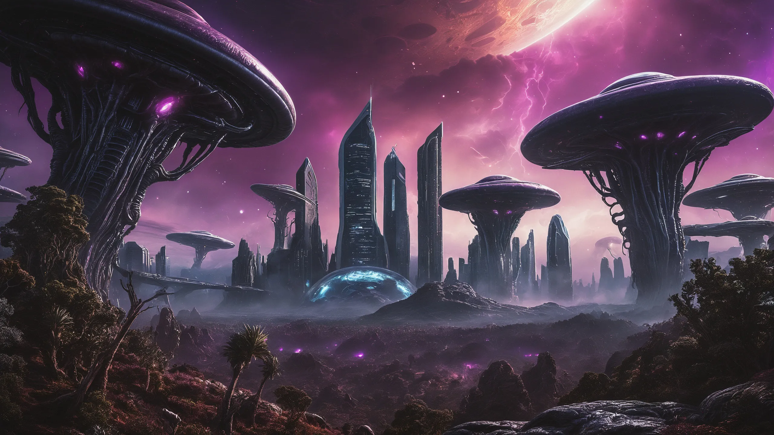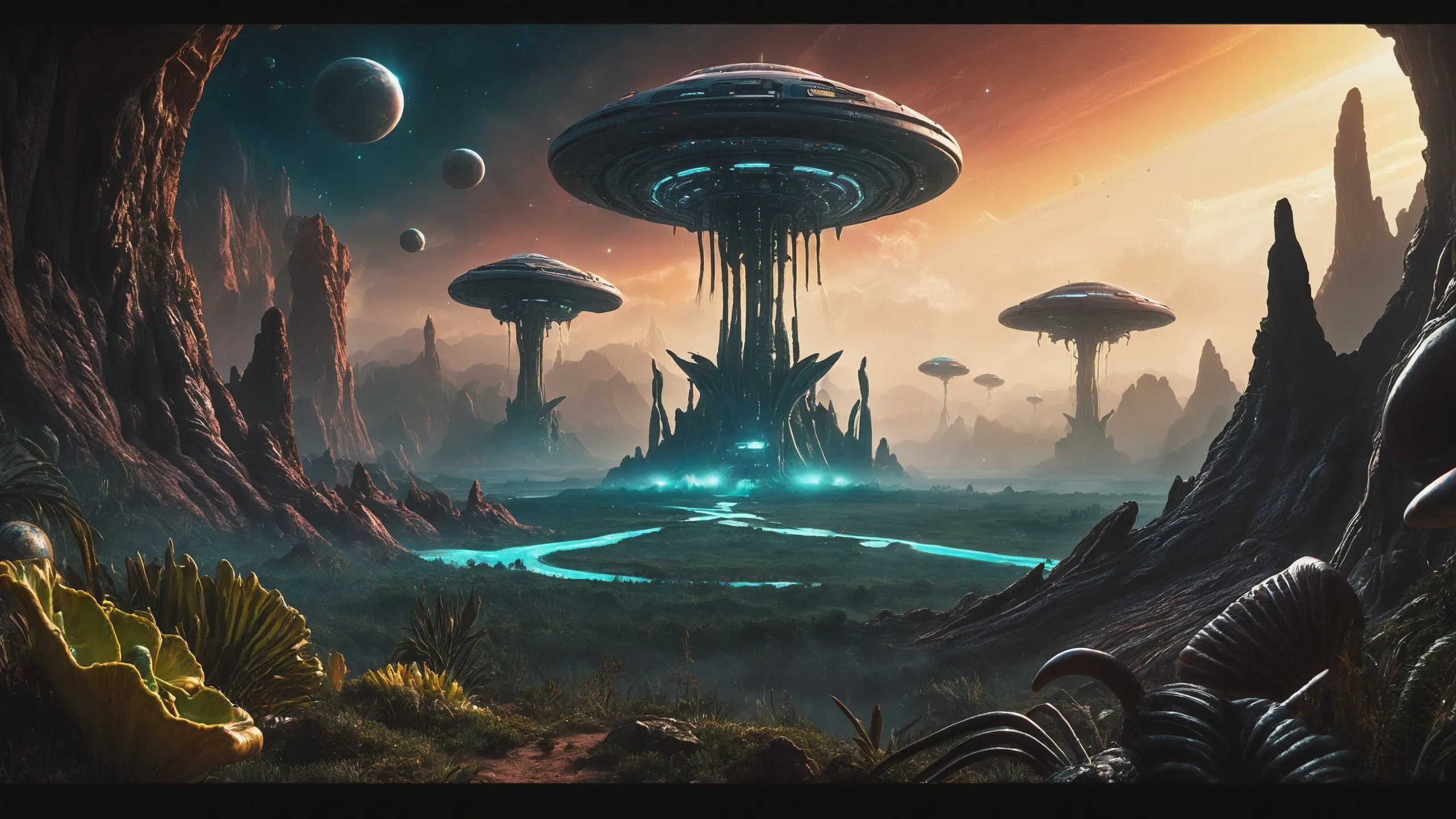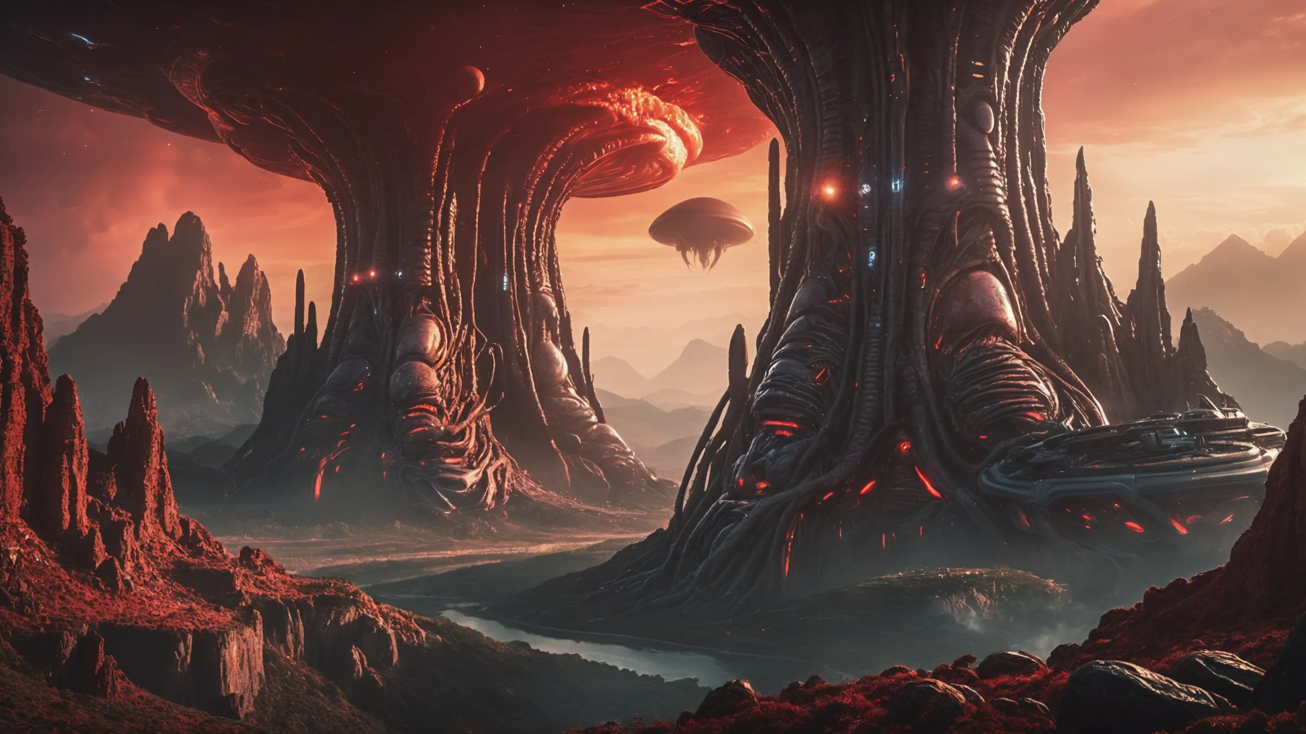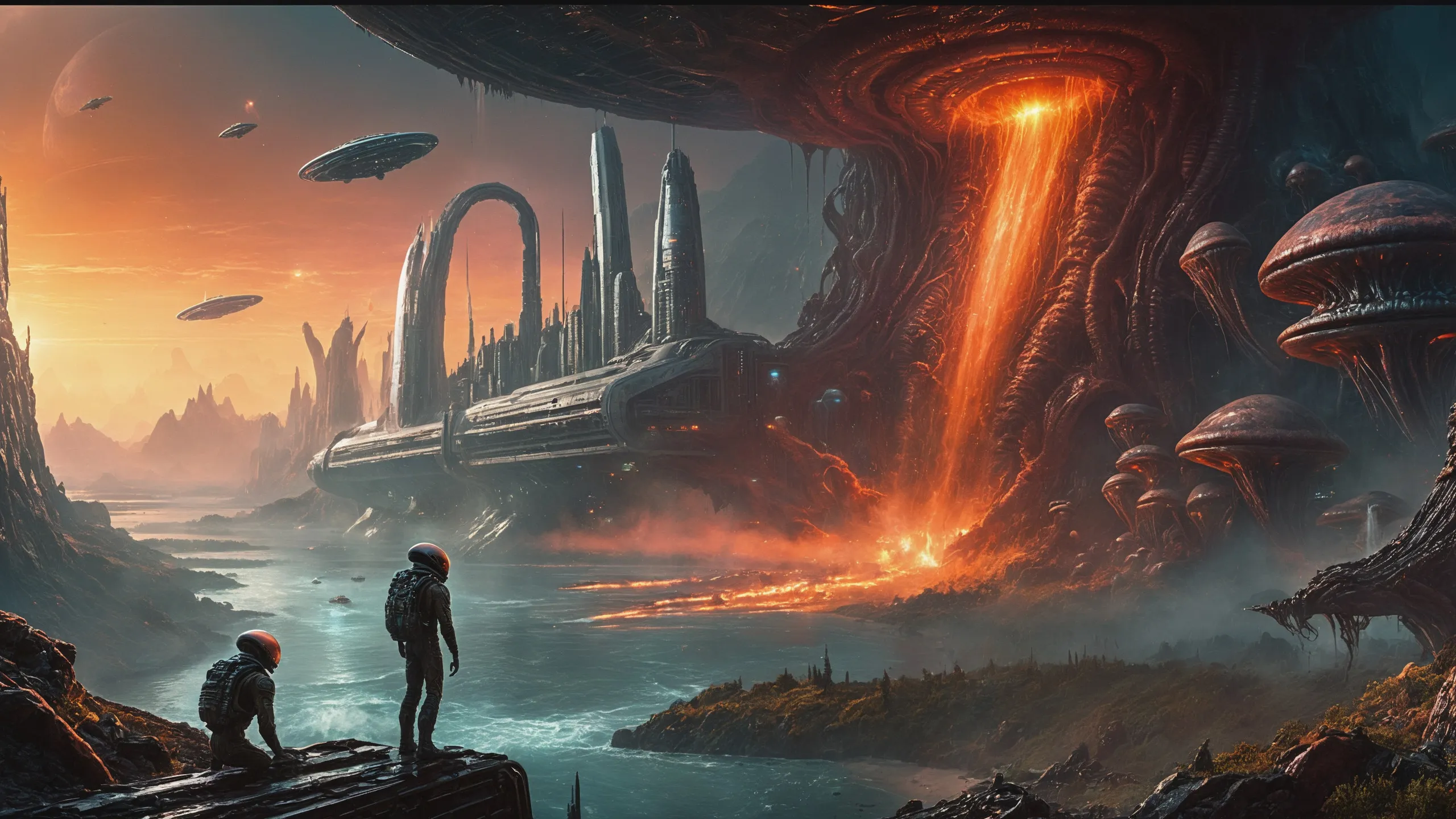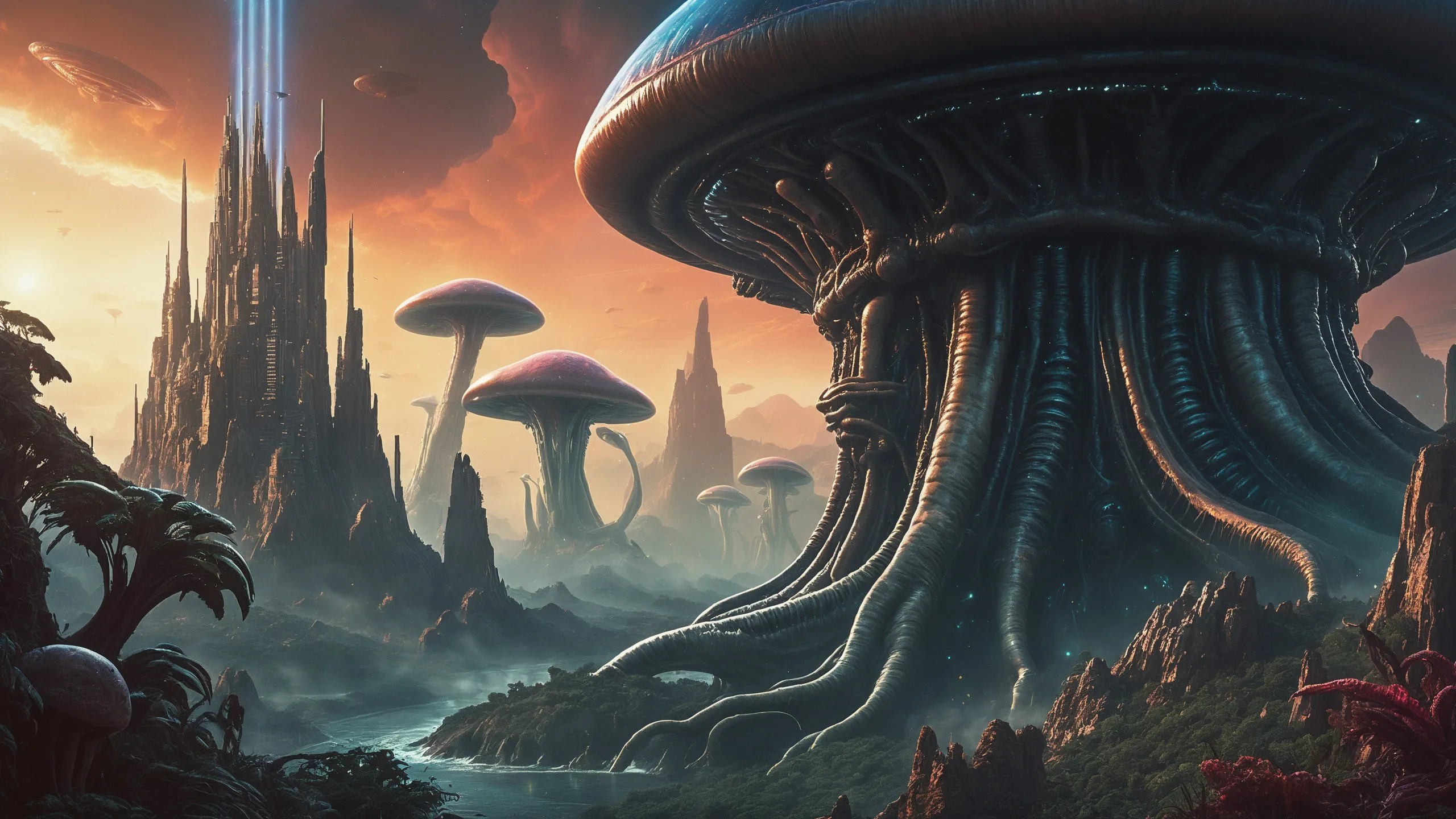 Cinematic epic scene of a (Sience Fiction, alien {mega city|cityscape|landscape|space station|outer space|world}:1.5).