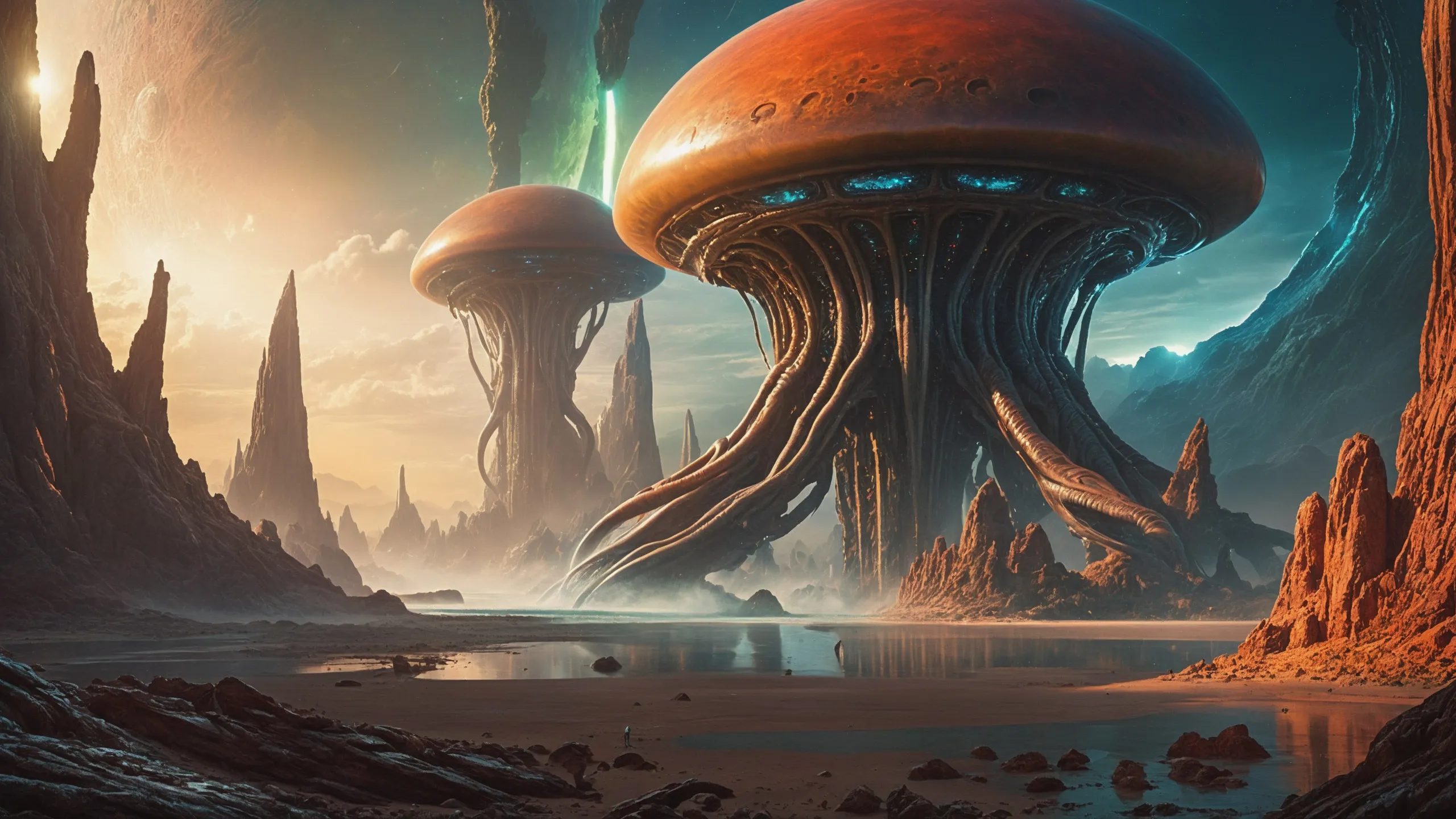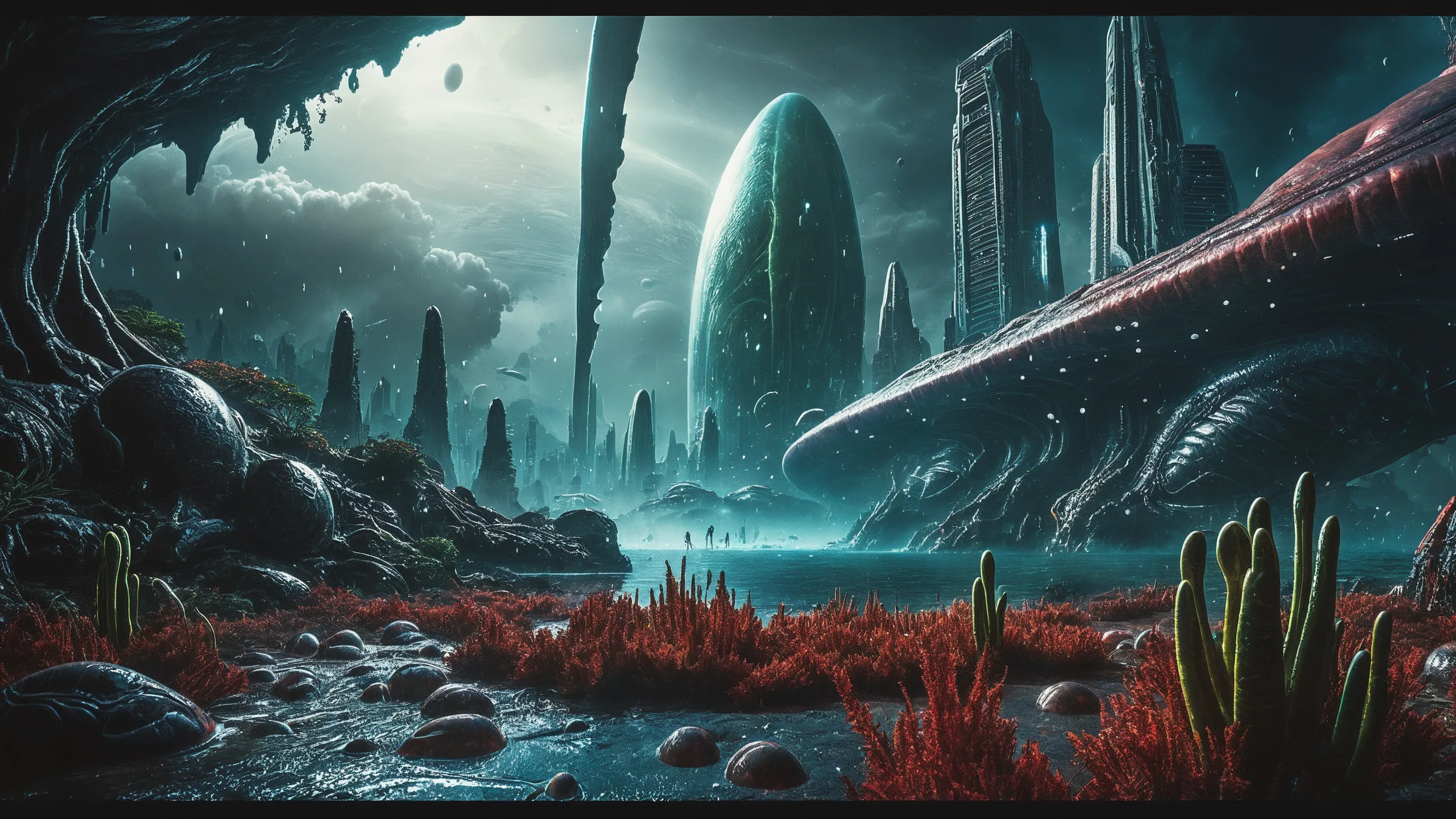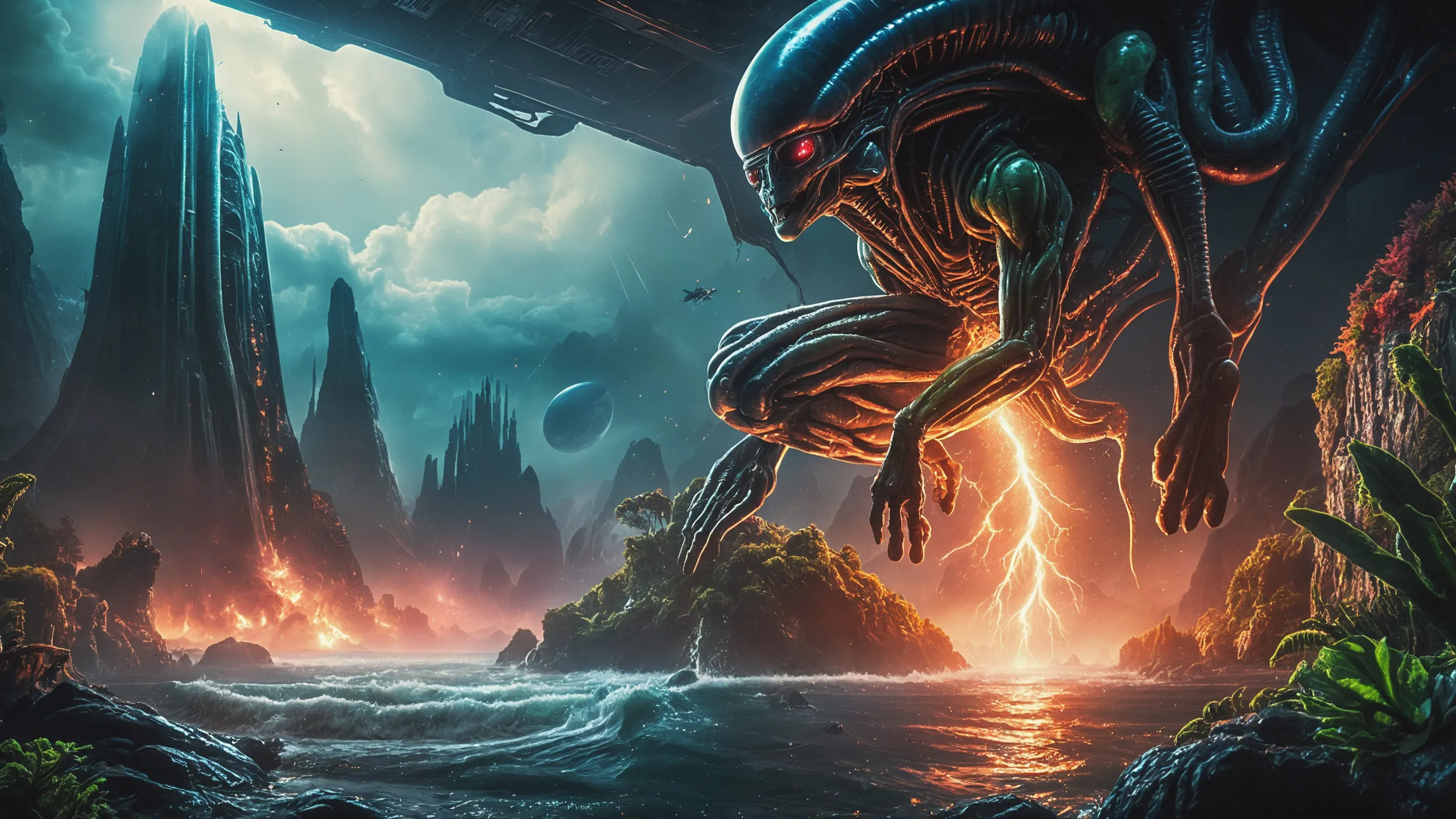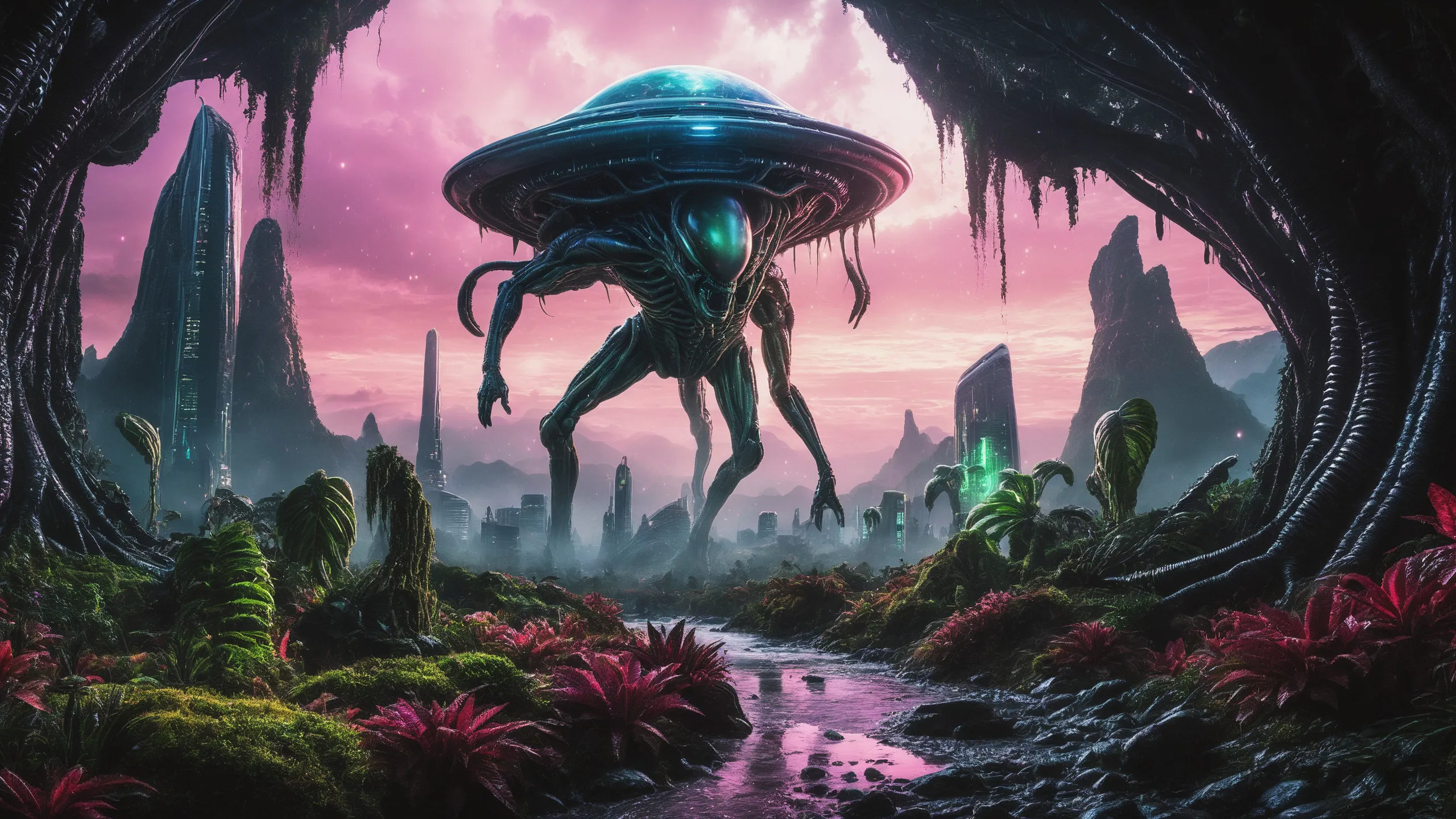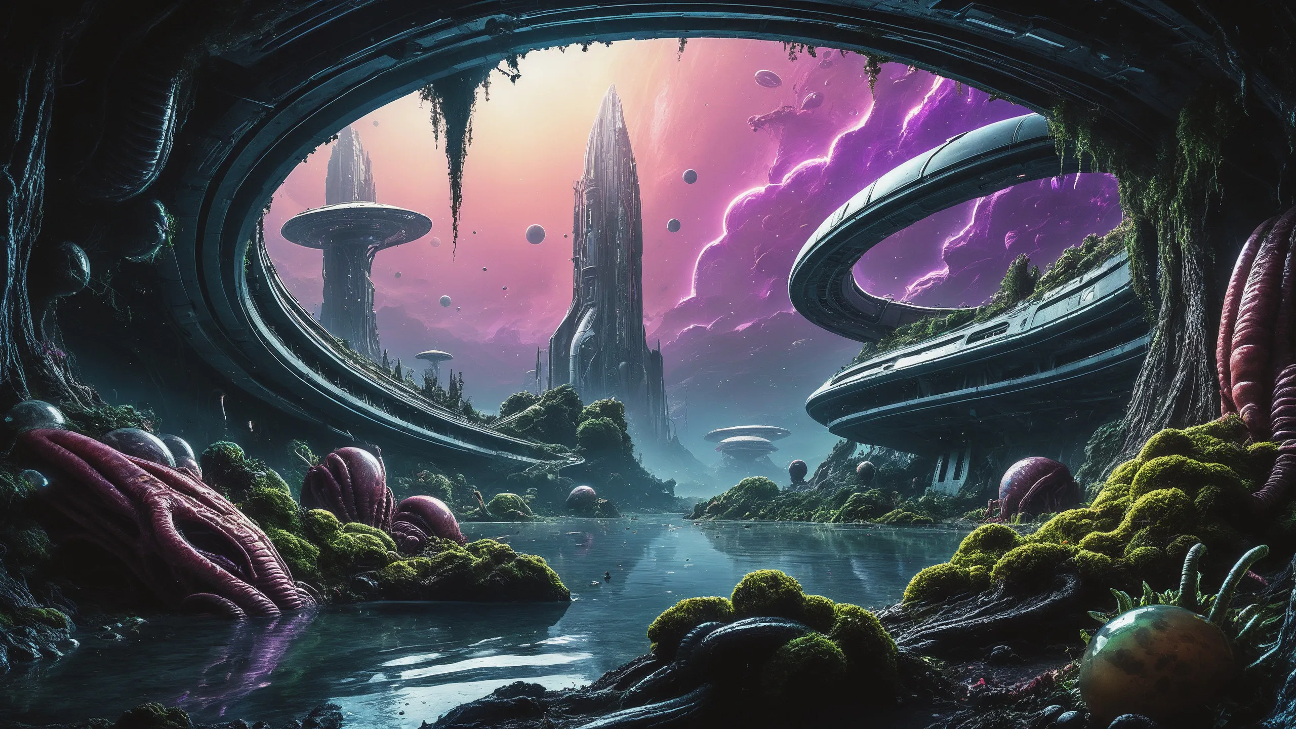 Cinematic epic scene of a (Sience Fiction, alien {mega city|cityscape|landscape|space station|outer space|world}:1.5).