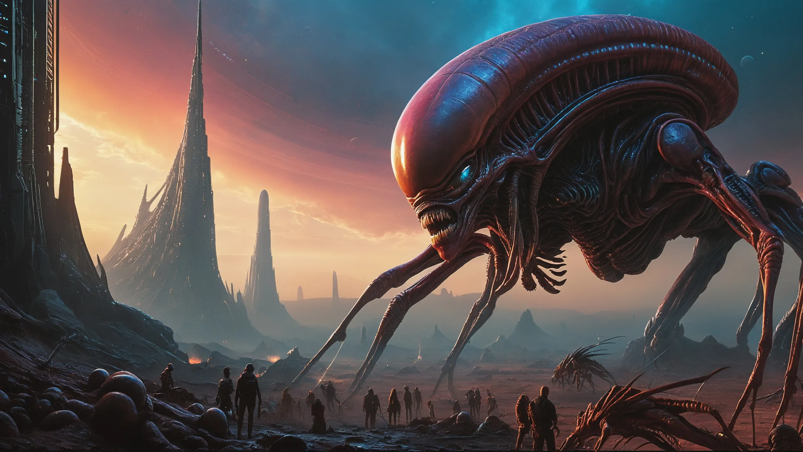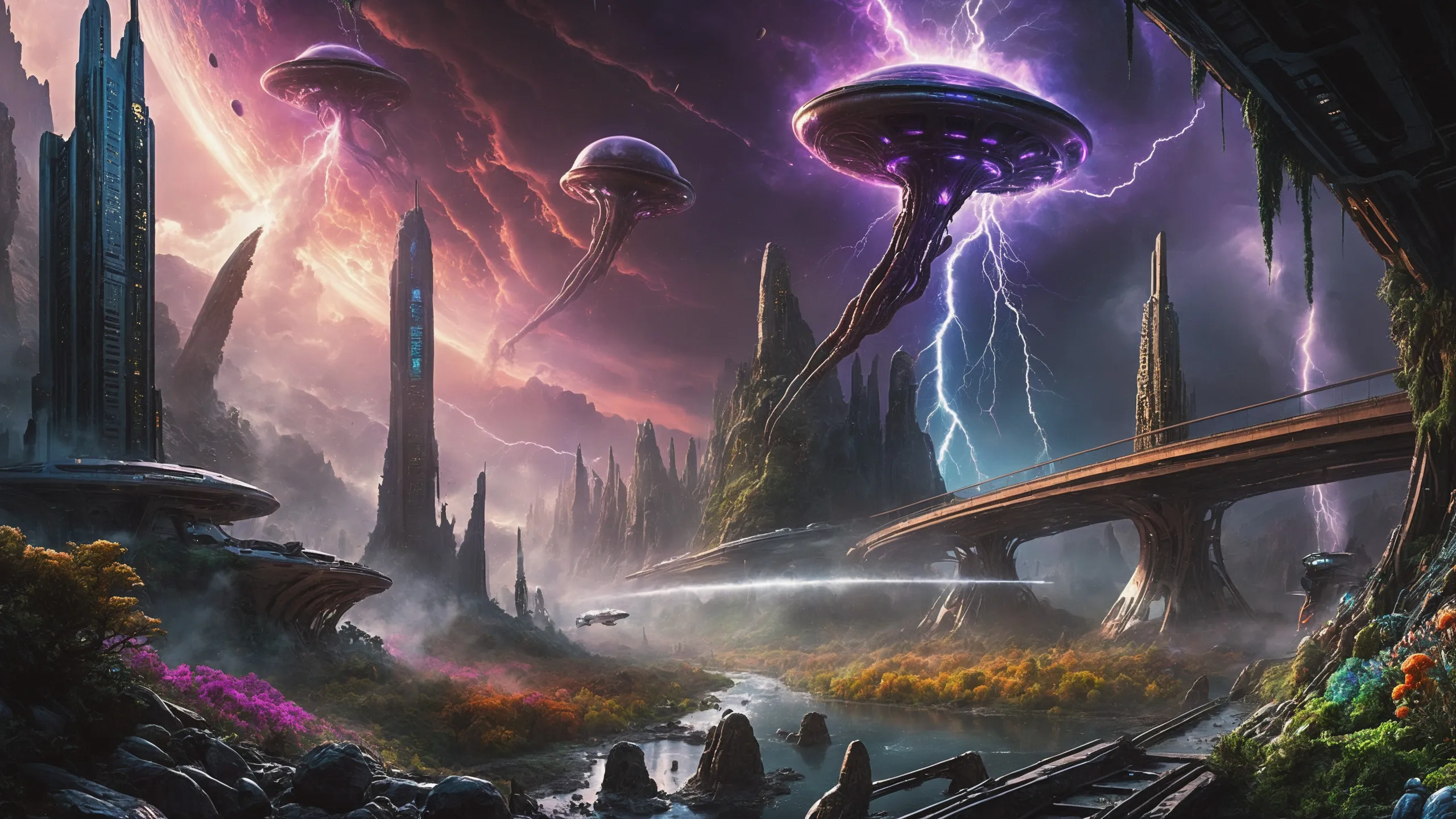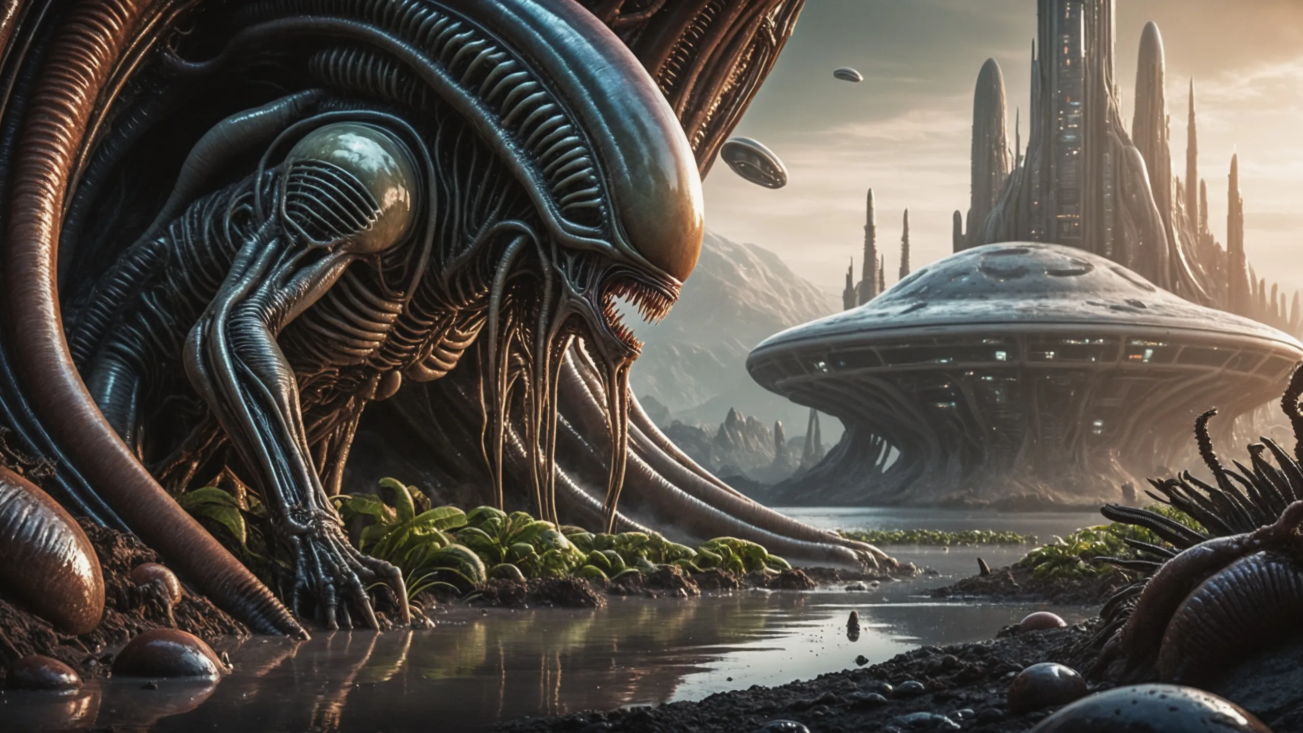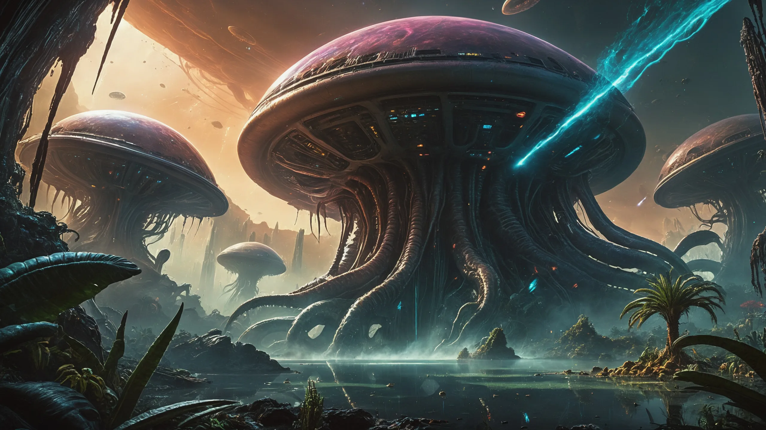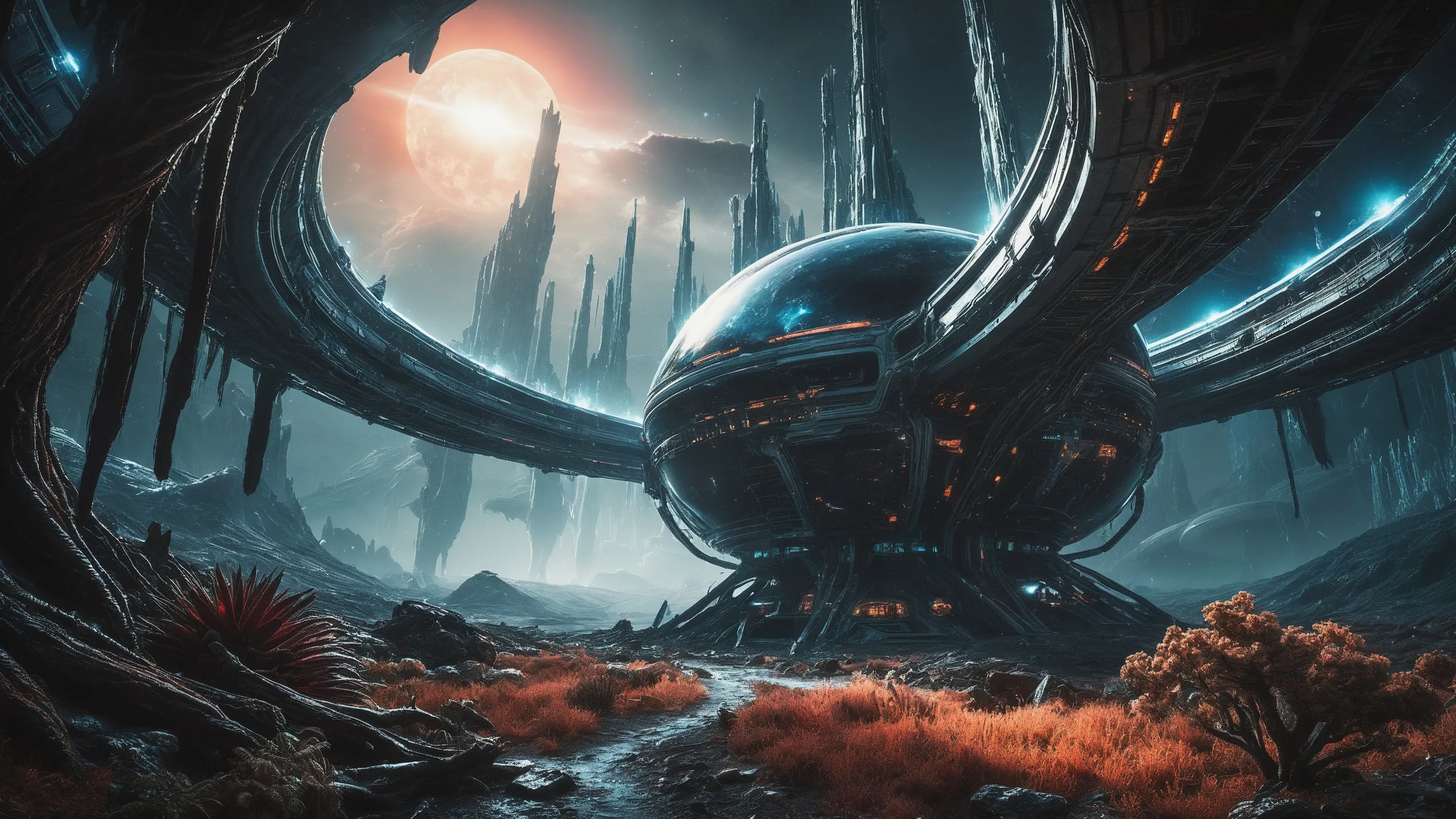 Cinematic epic scene of a (Sience Fiction, alien {mega city|cityscape|landscape|space station|outer space|world}:1.5).