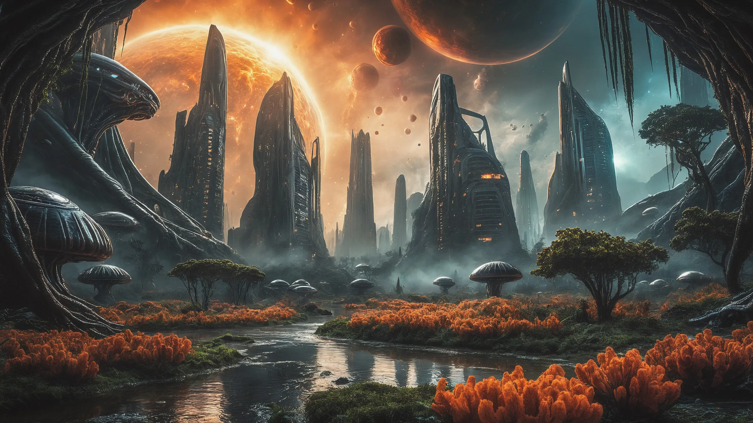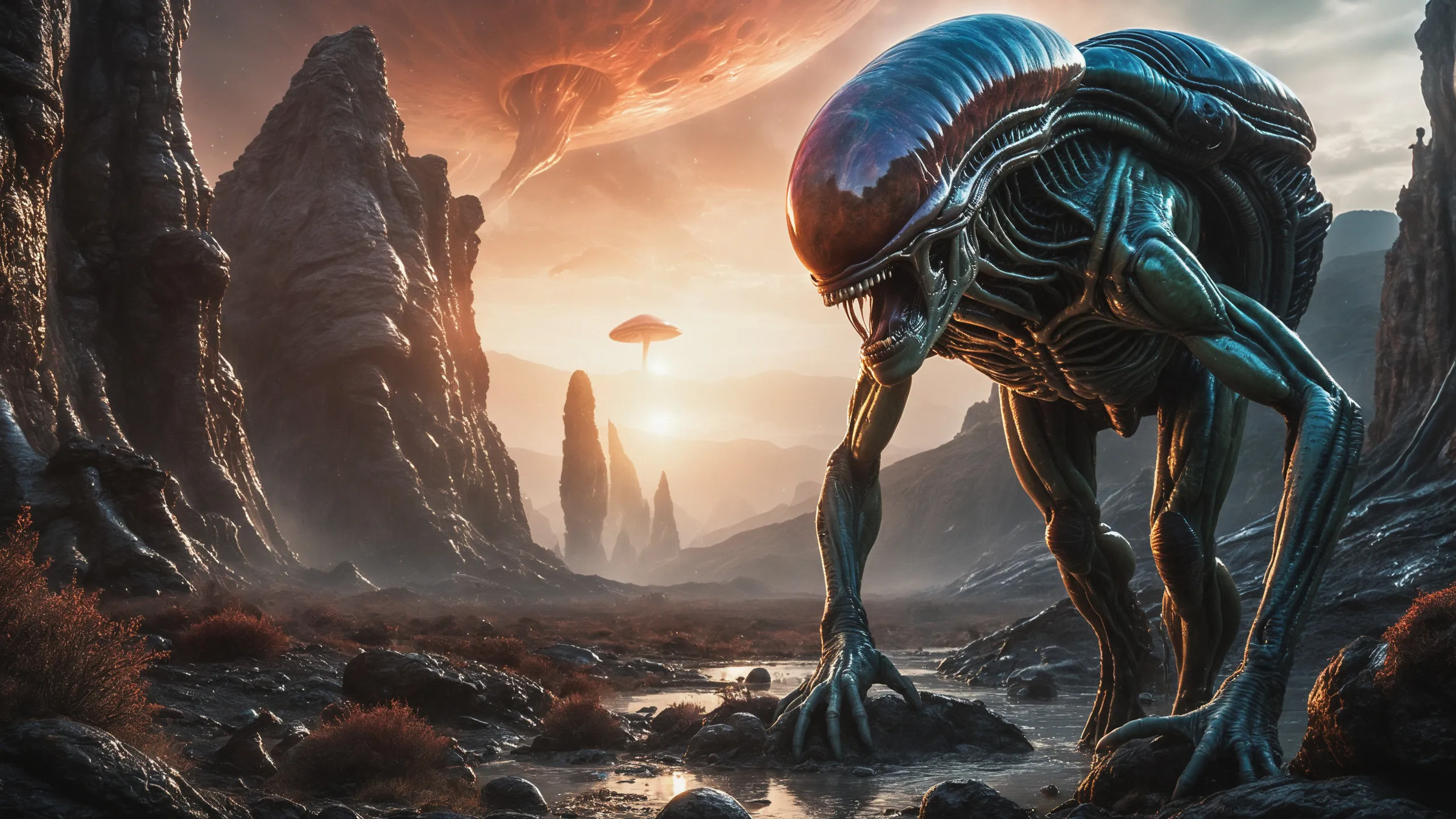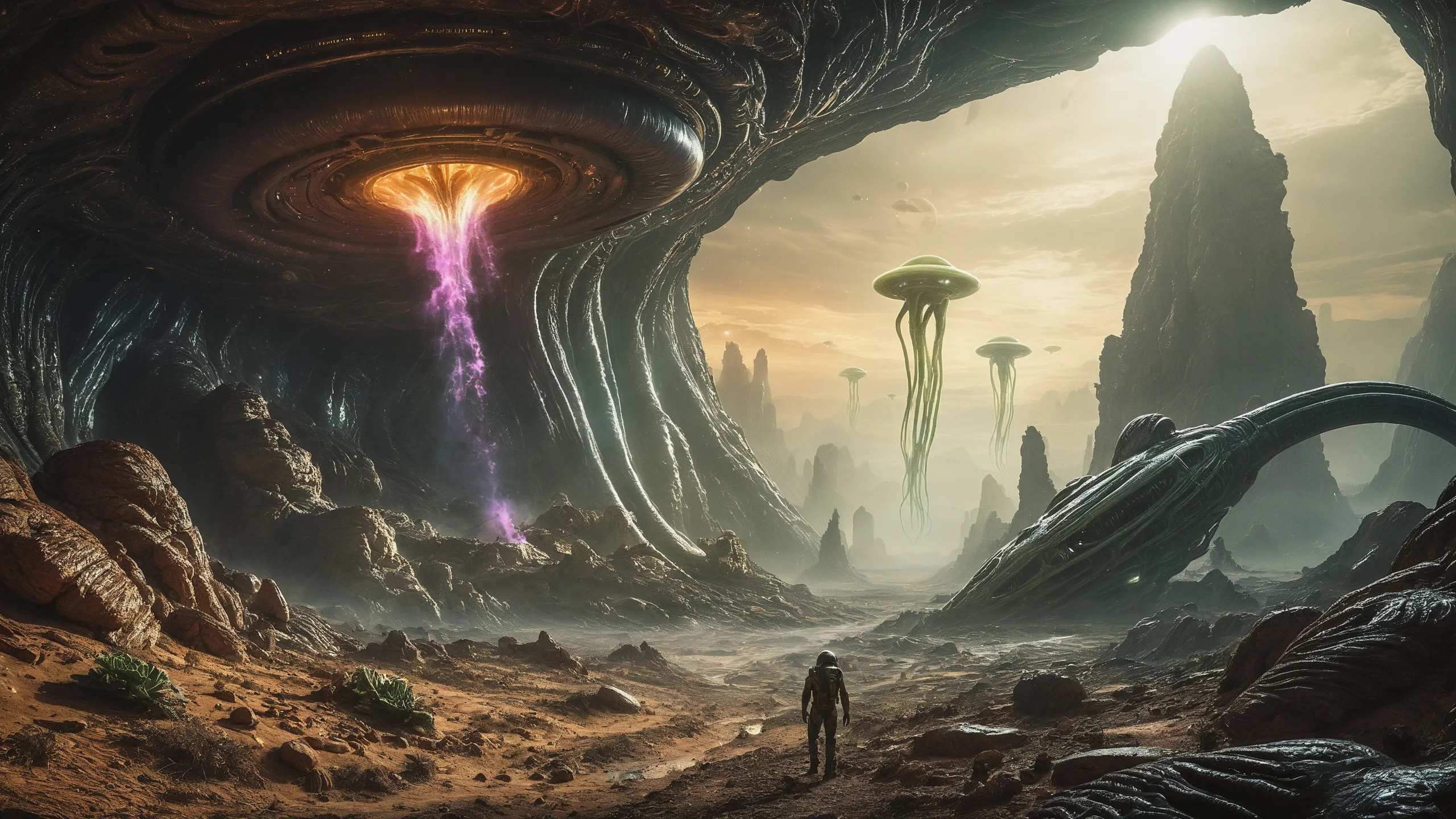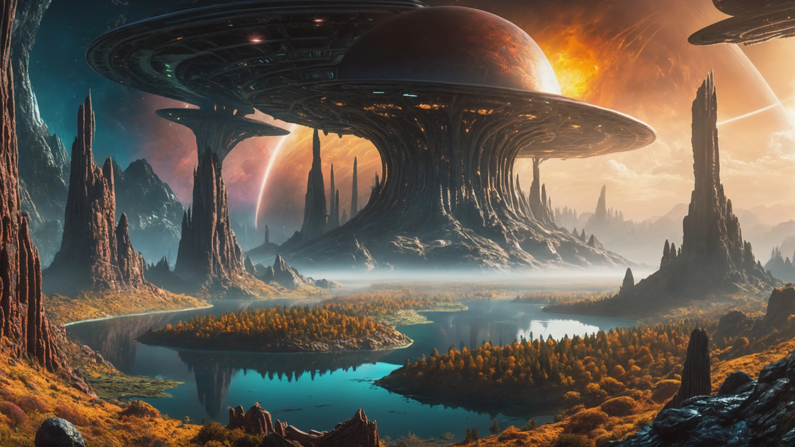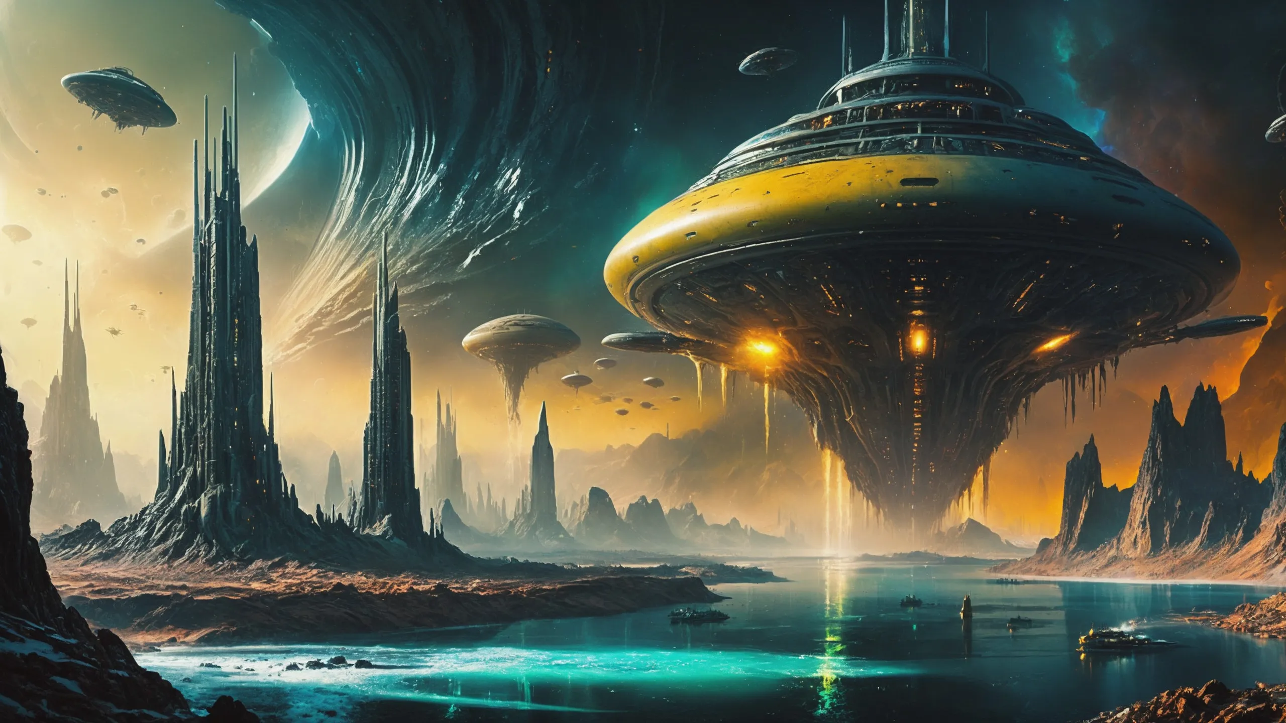 Cinematic epic scene of a (Sience Fiction, alien {mega city|cityscape|landscape|space station|outer space|world}:1.5).