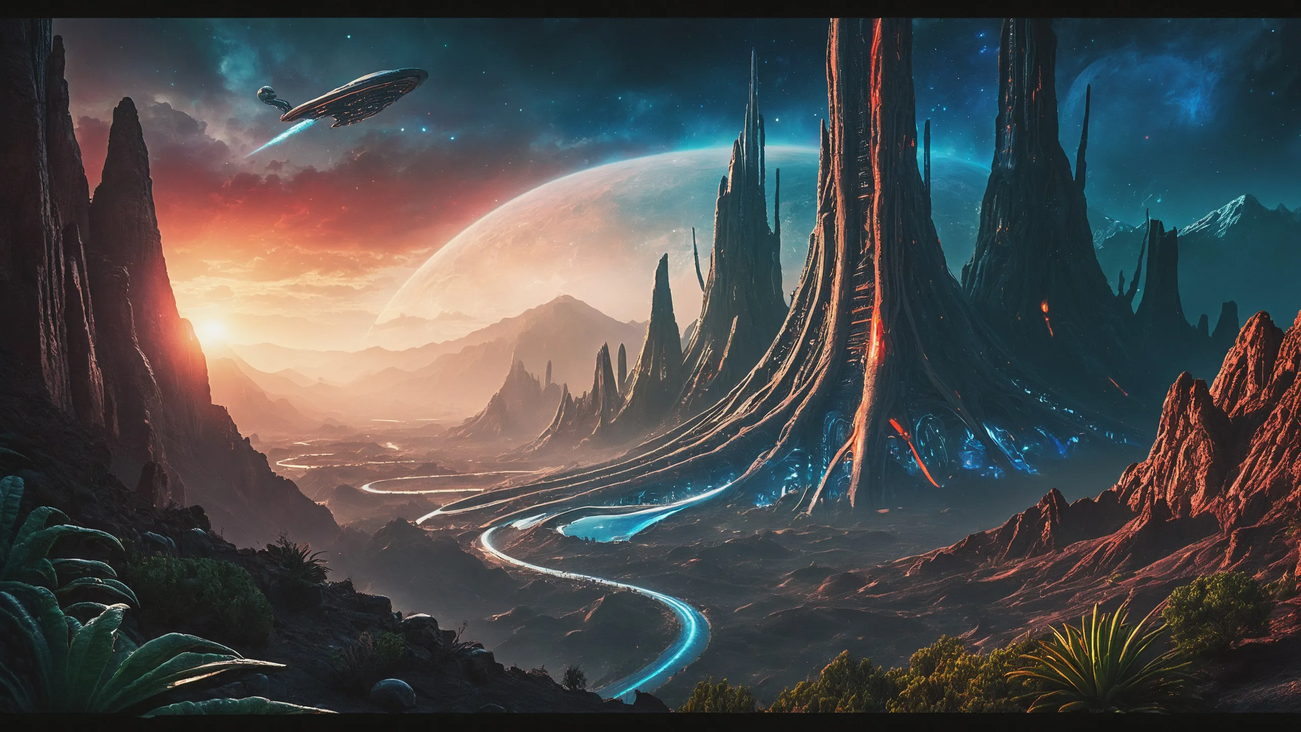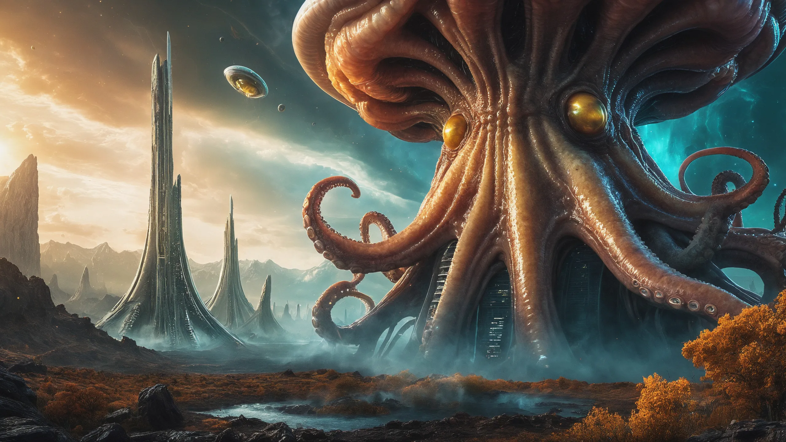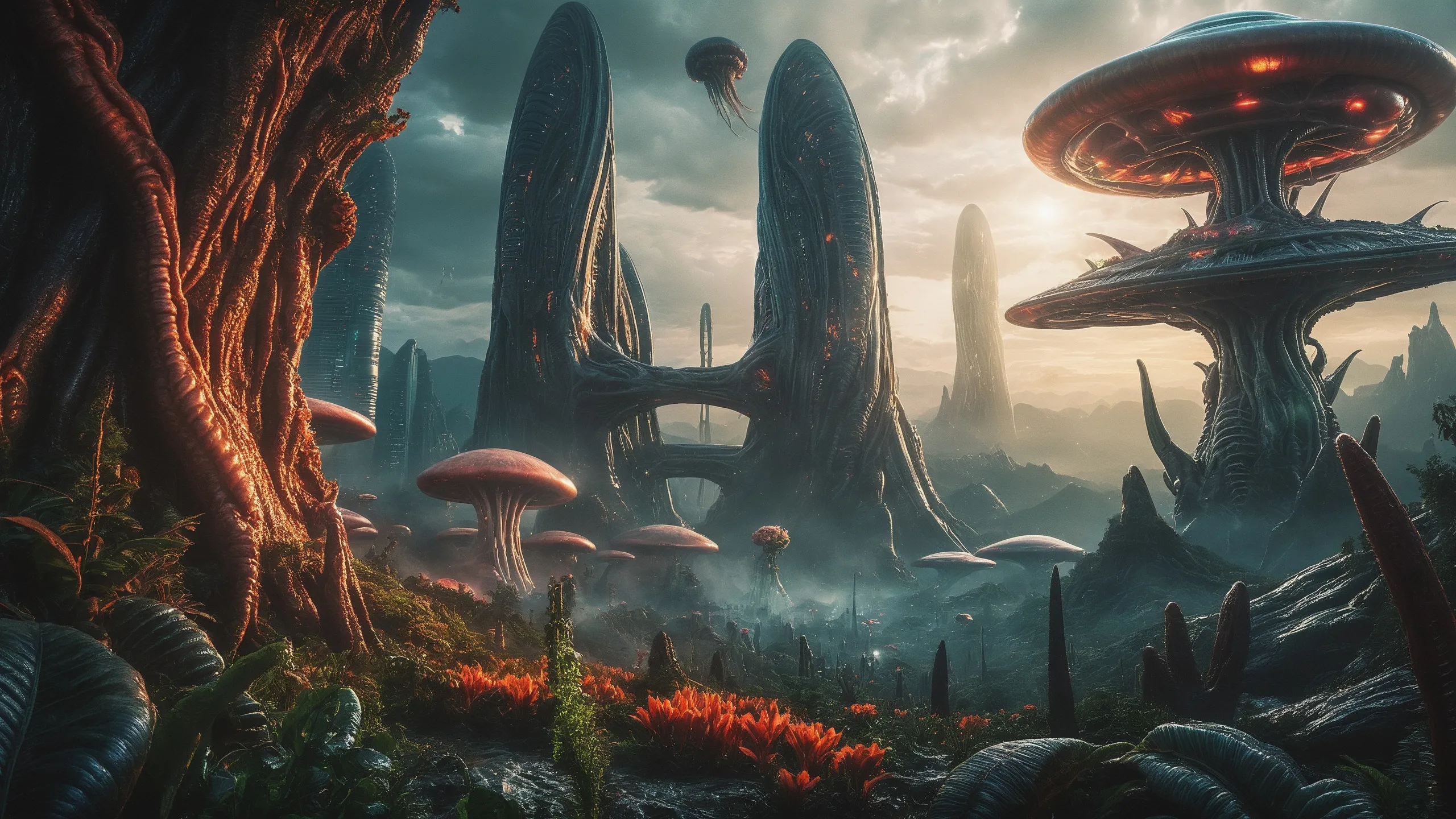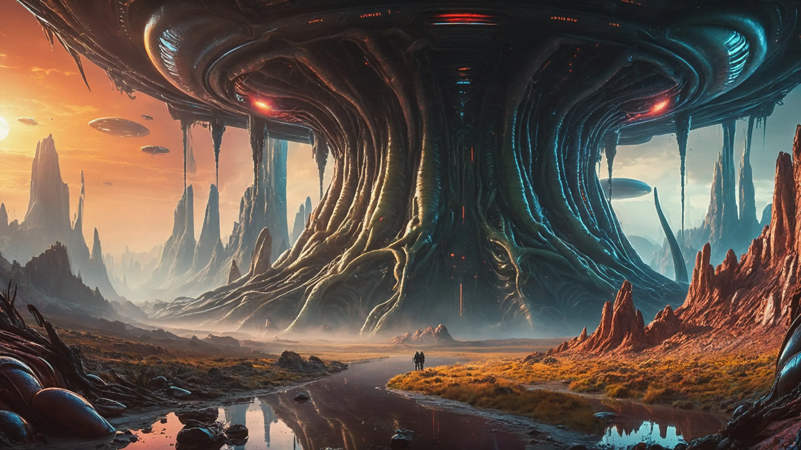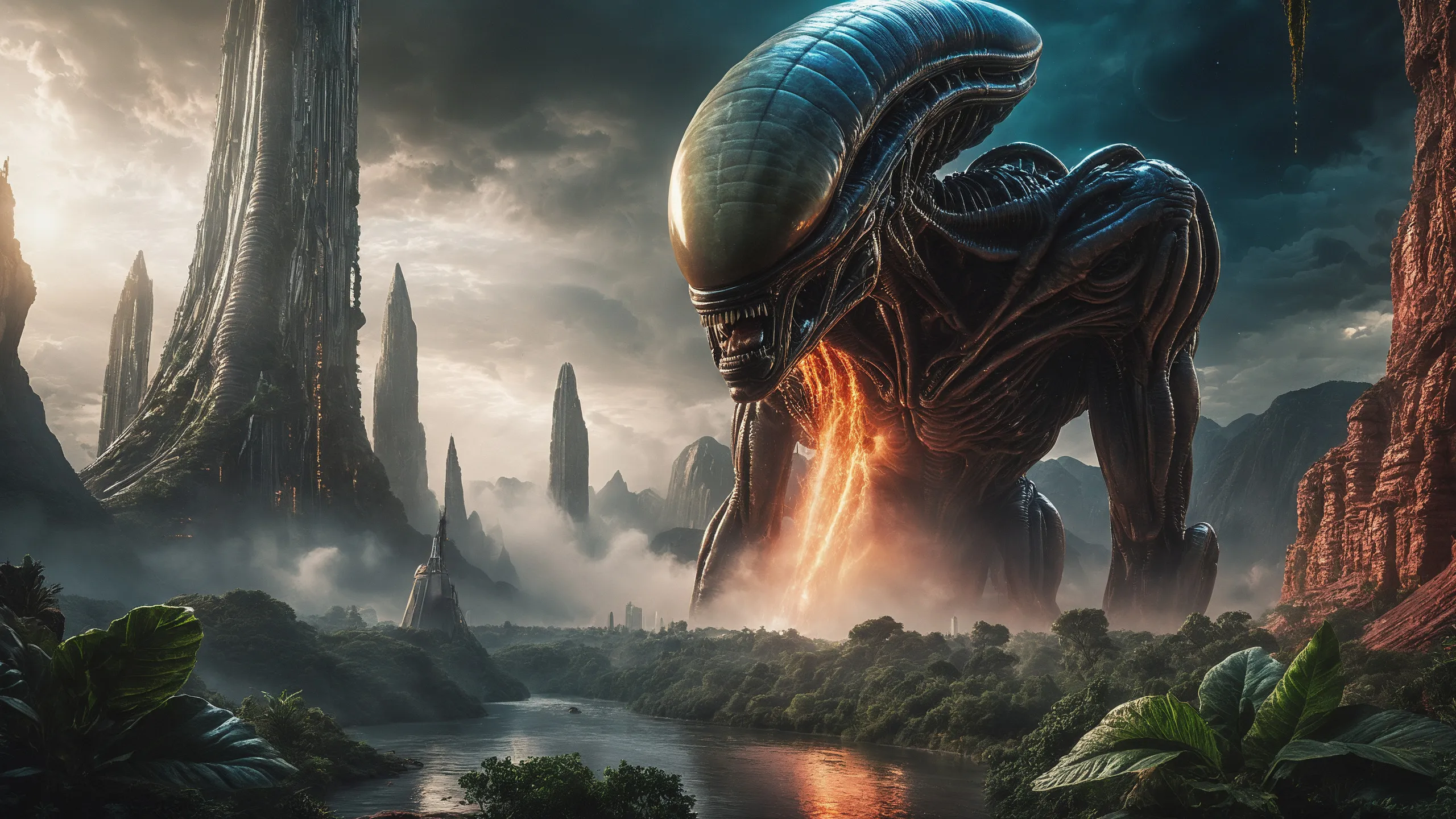 Cinematic epic scene of a (Sience Fiction, alien {mega city|cityscape|landscape|space station|outer space|world}:1.5).