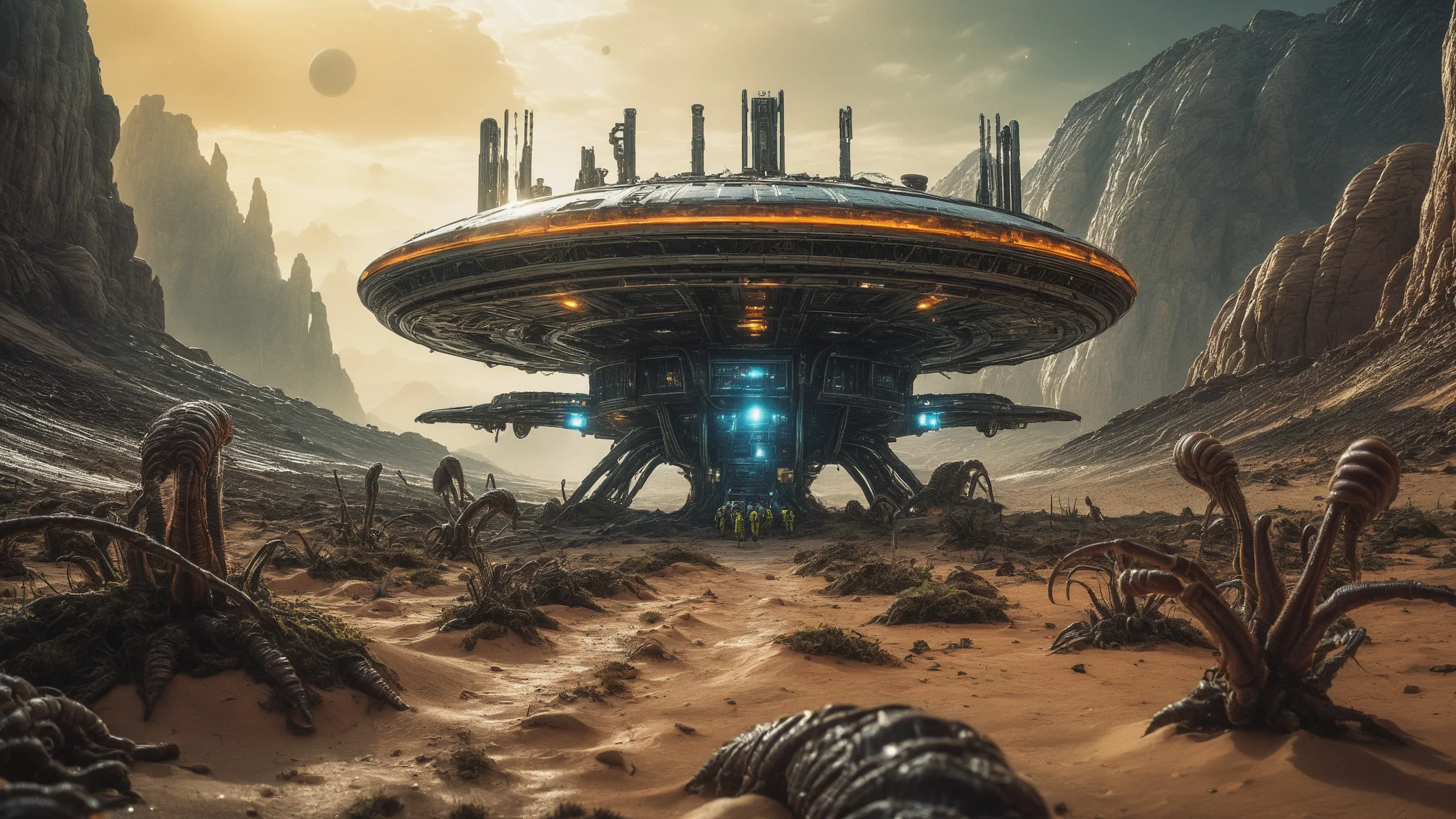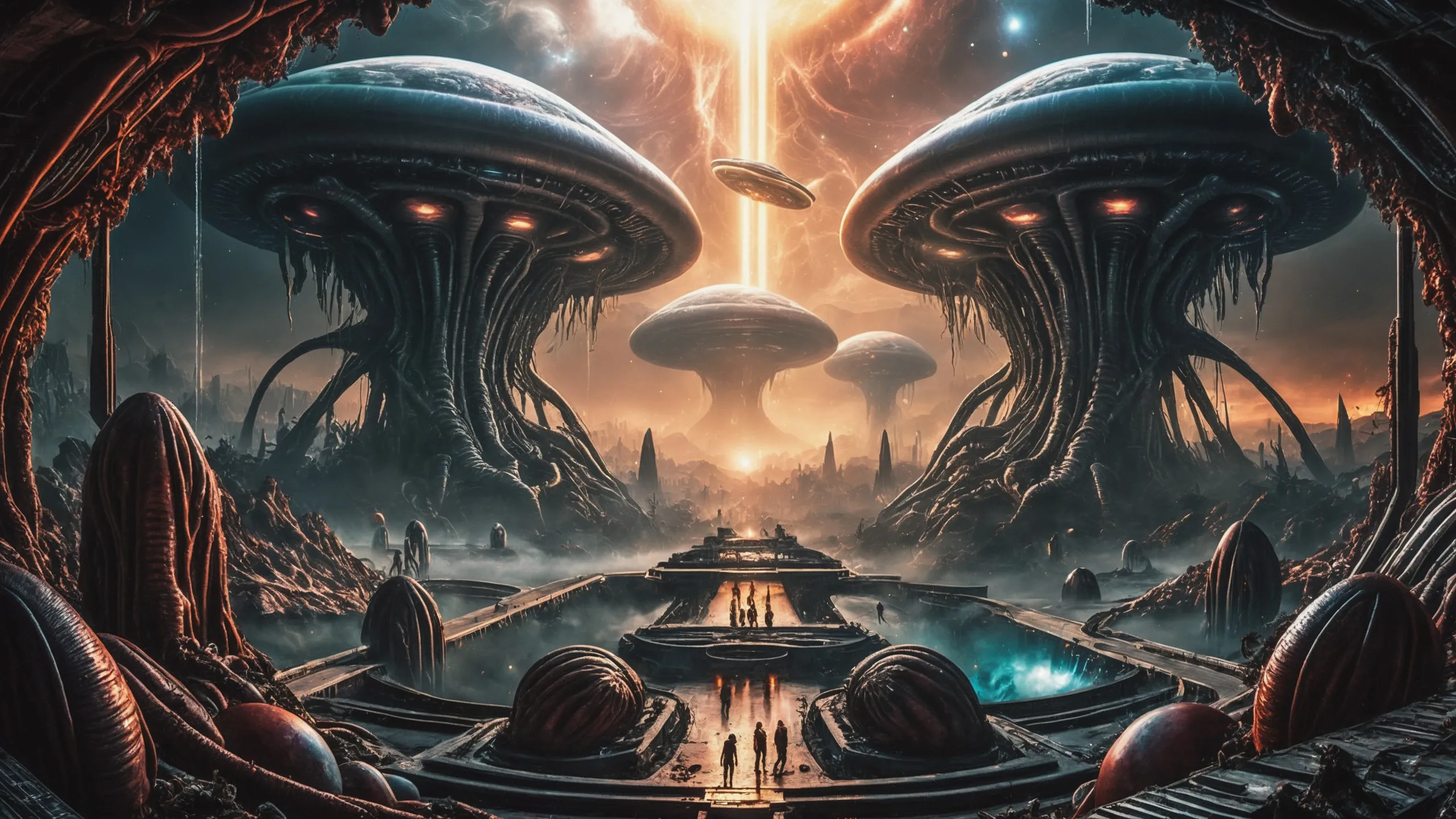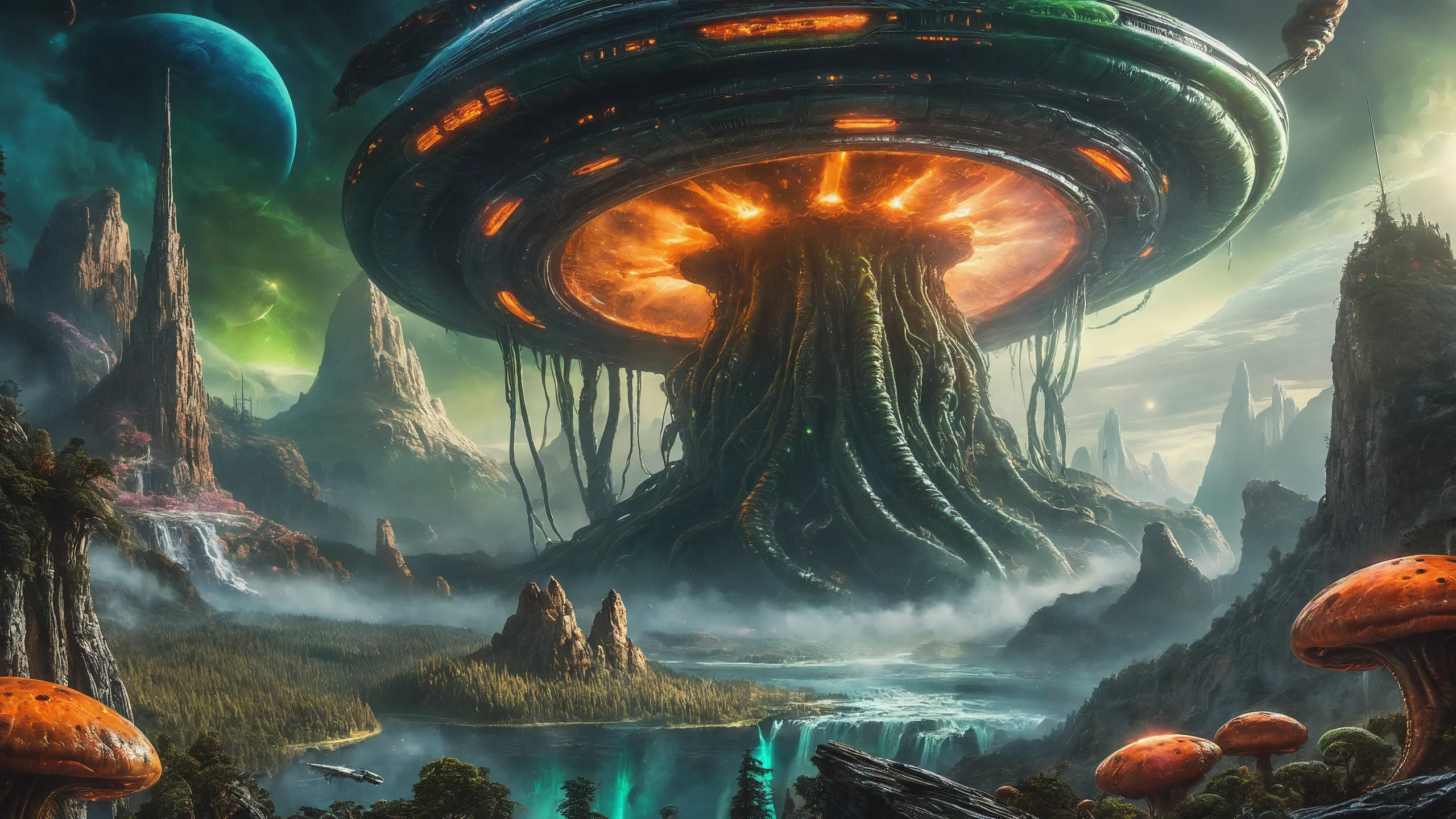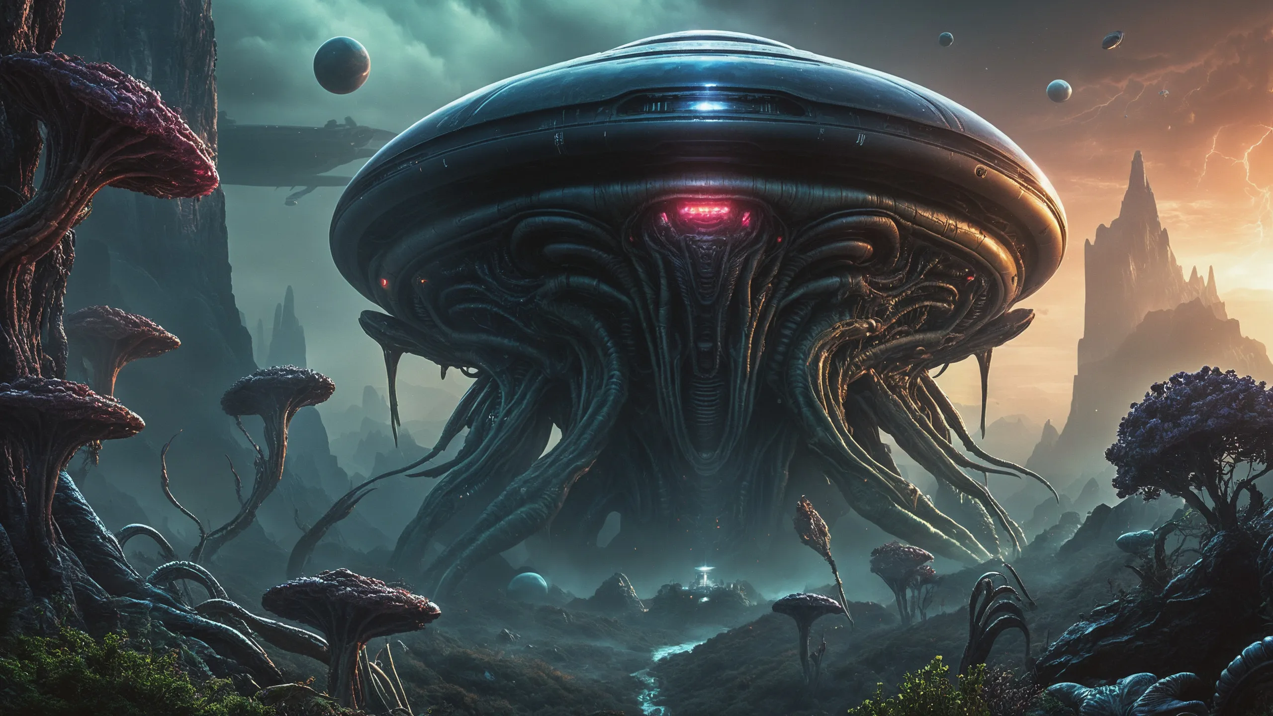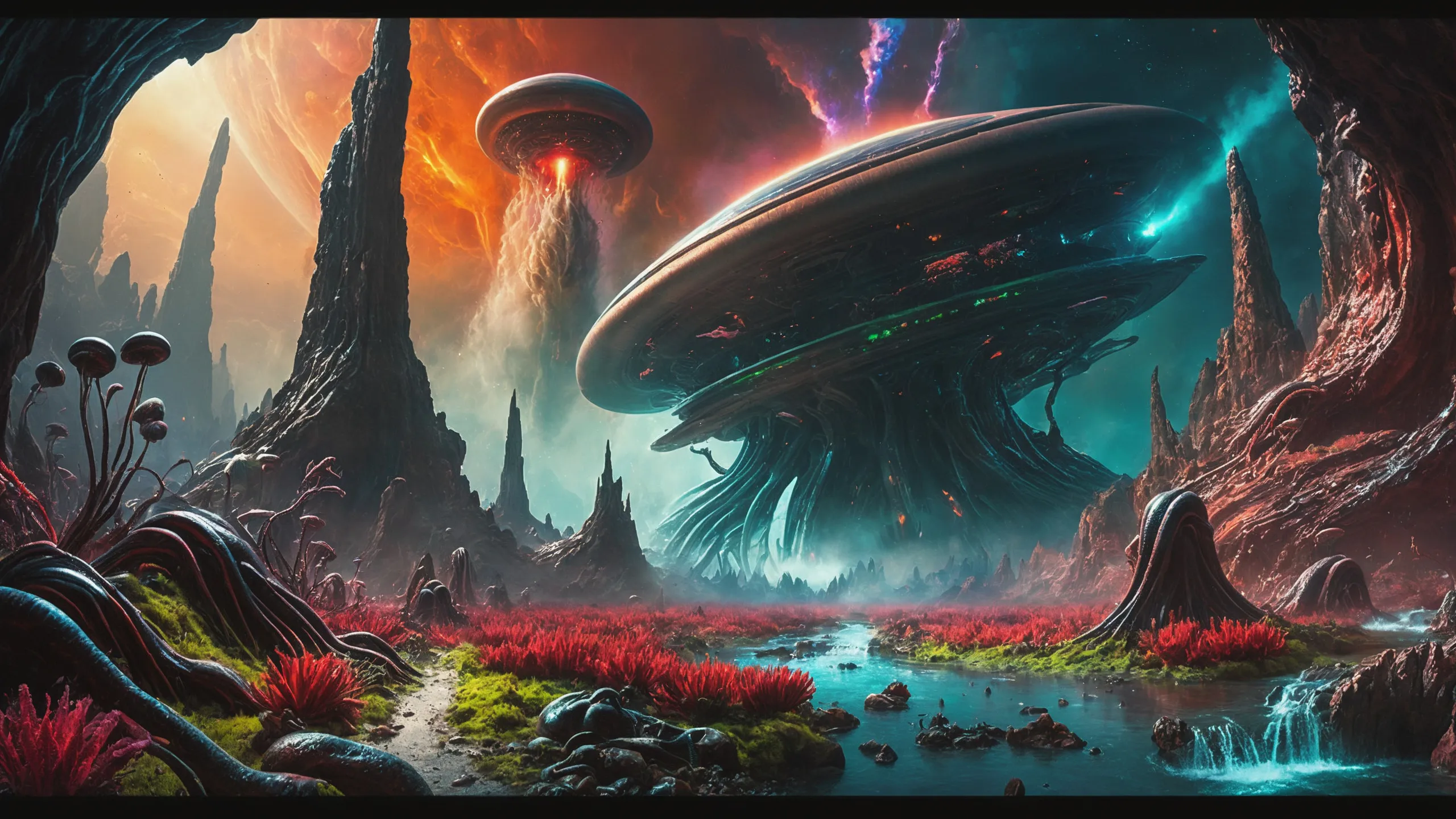 Cinematic epic scene of a (Sience Fiction, alien {mega city|cityscape|landscape|space station|outer space|world}:1.5).