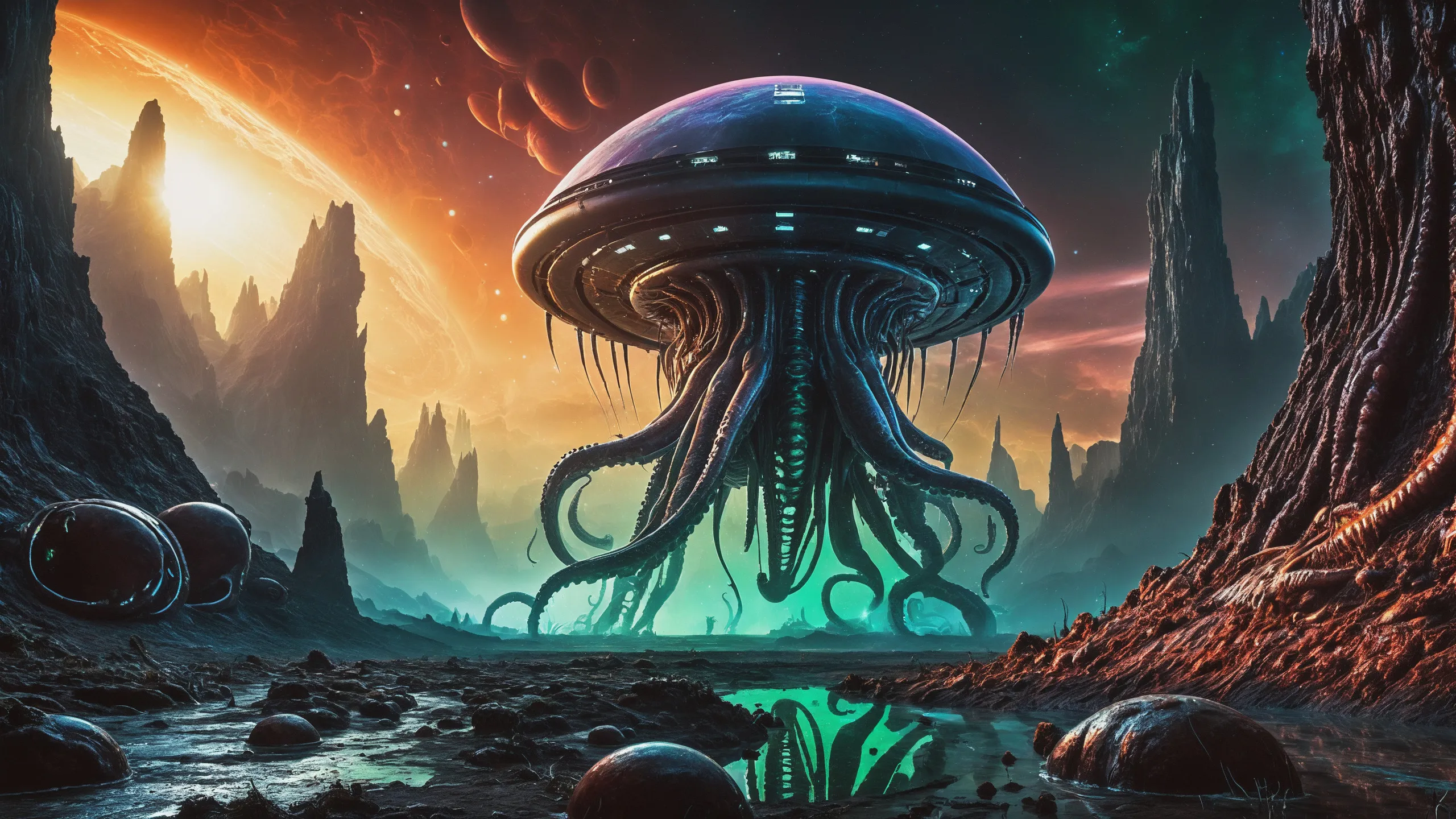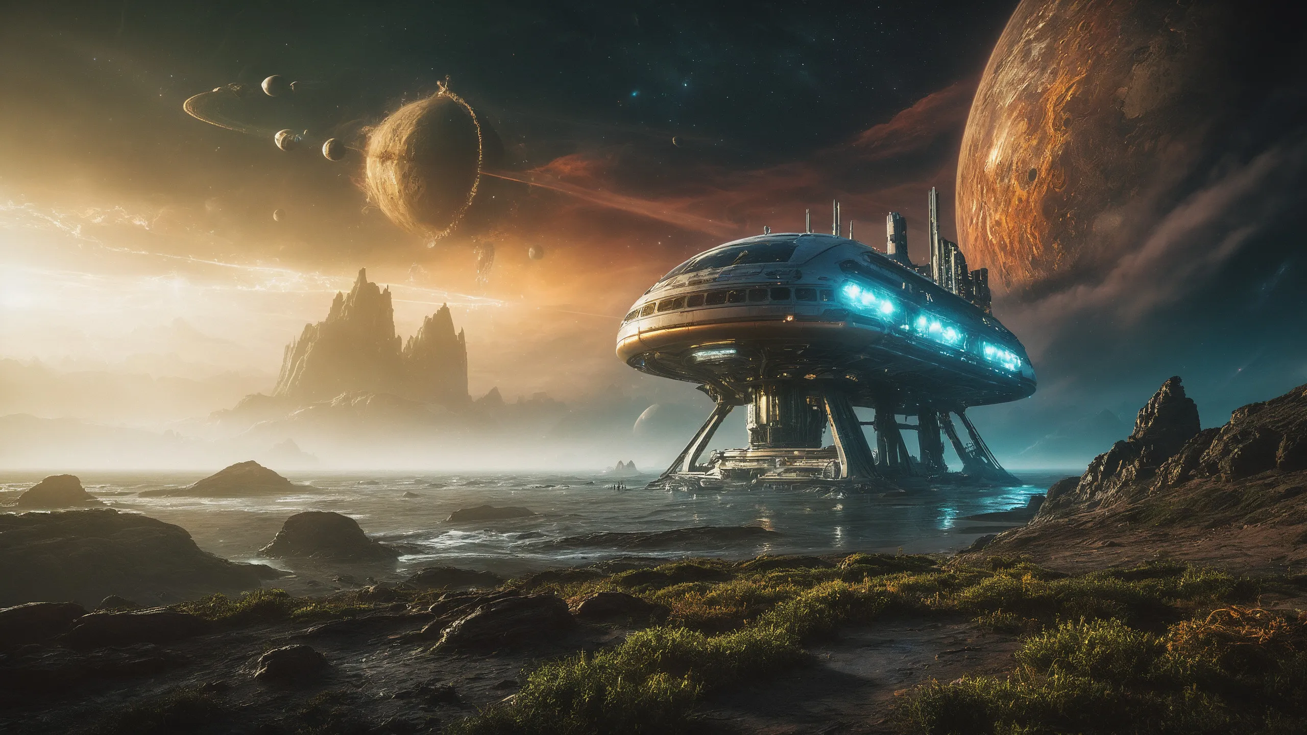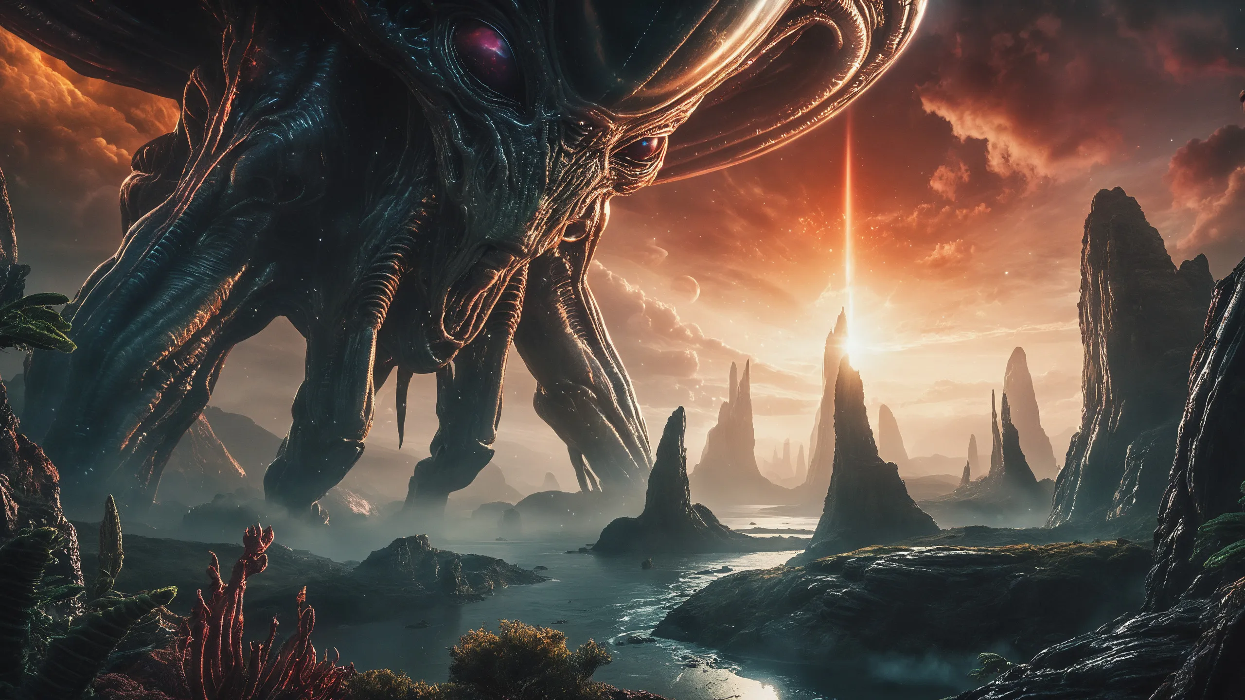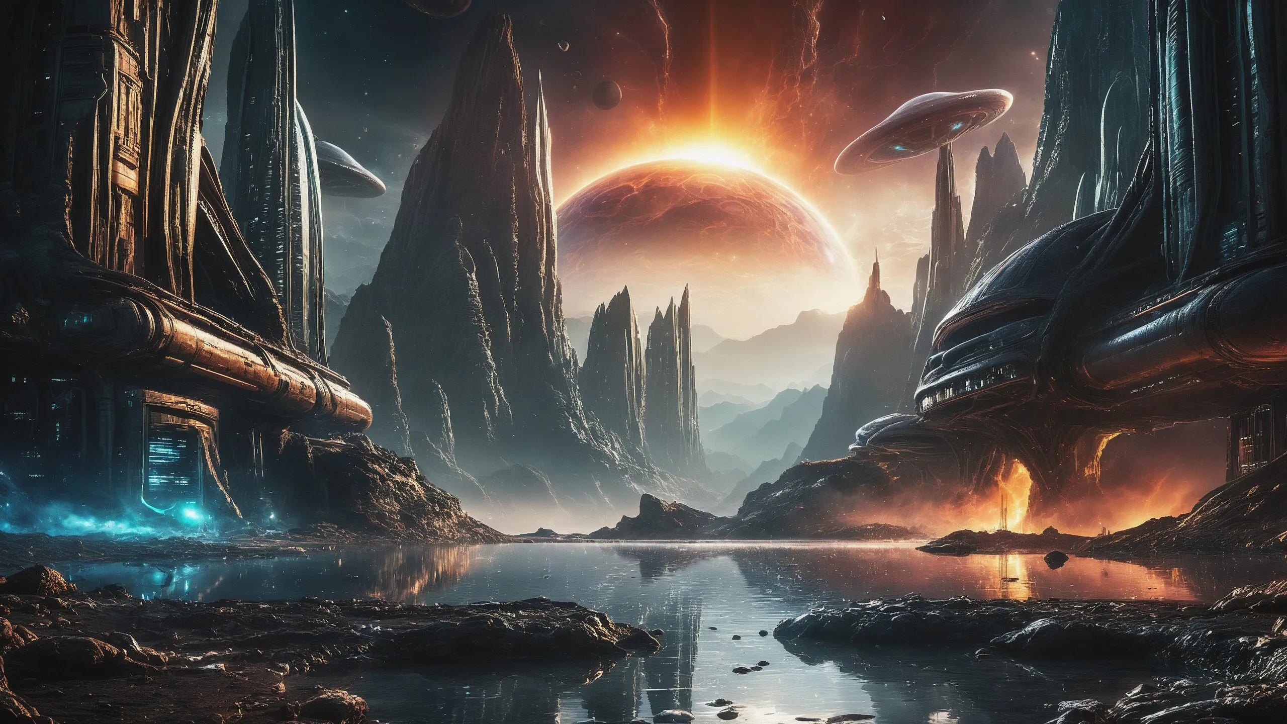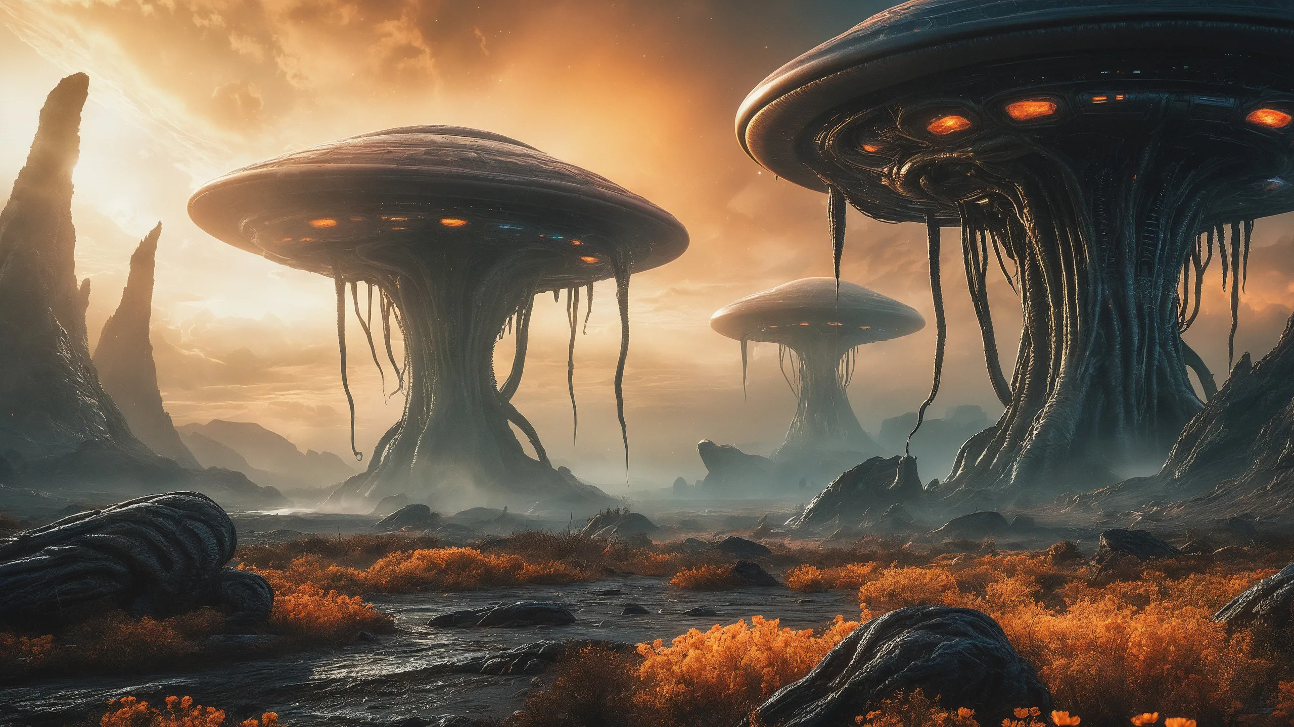 Cinematic epic scene of a (Sience Fiction, alien {mega city|cityscape|landscape|space station|outer space|world}:1.5).