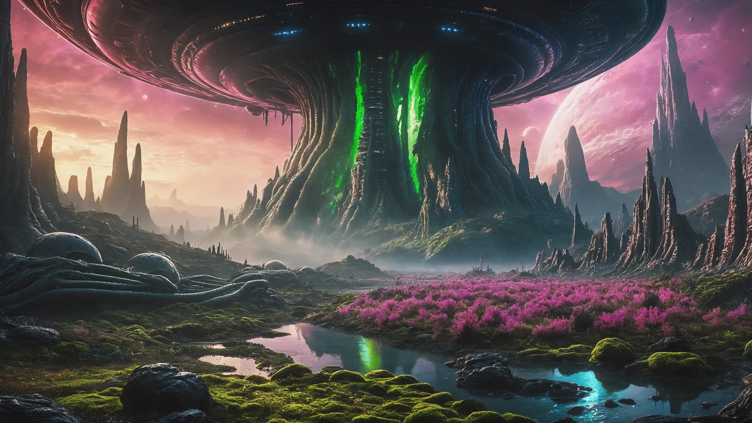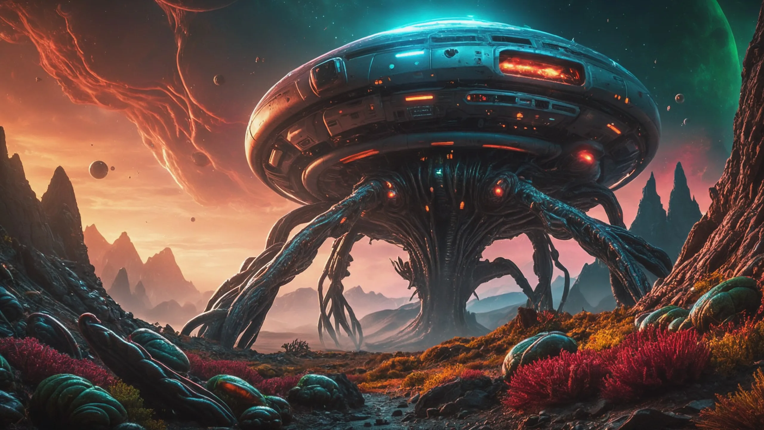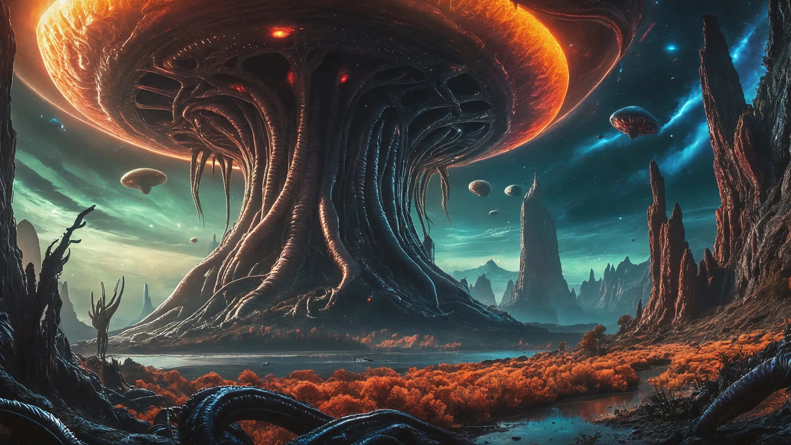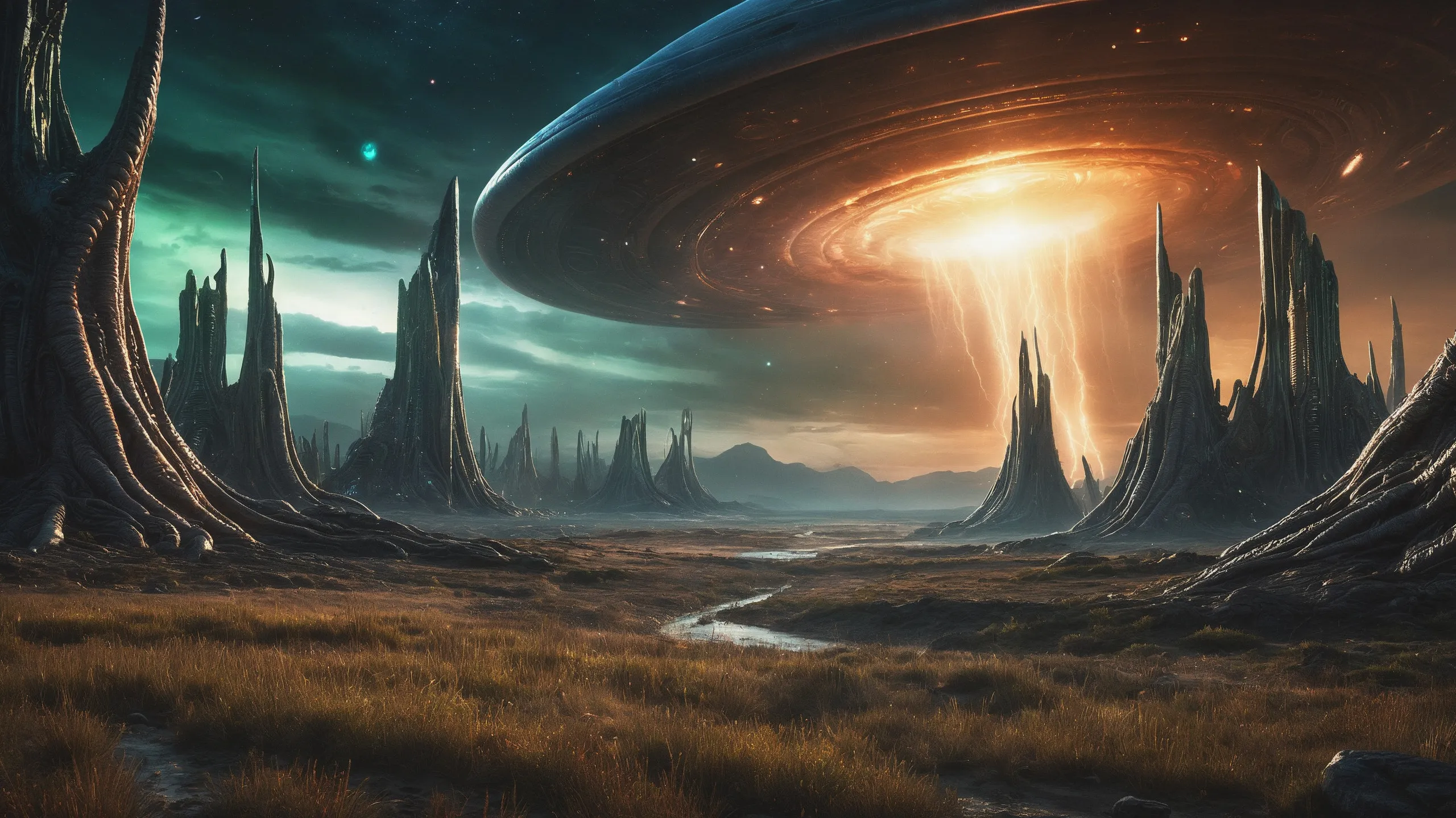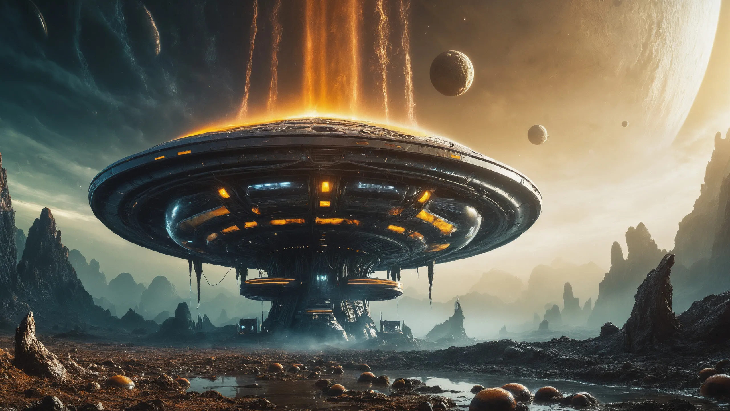 Cinematic epic scene of a (Sience Fiction, alien {mega city|cityscape|landscape|space station|outer space|world}:1.5).