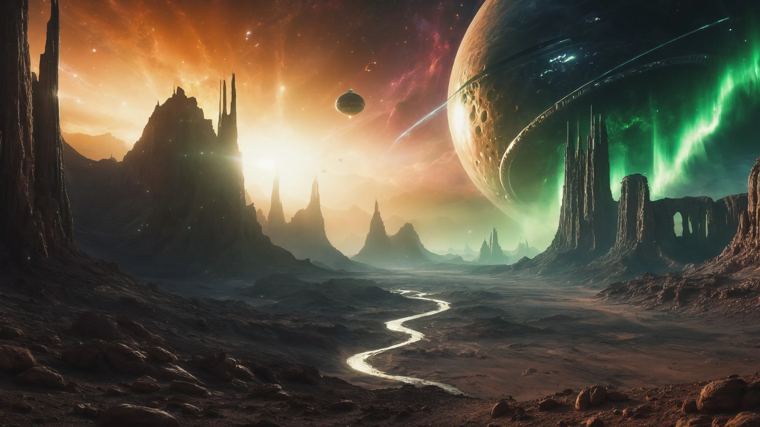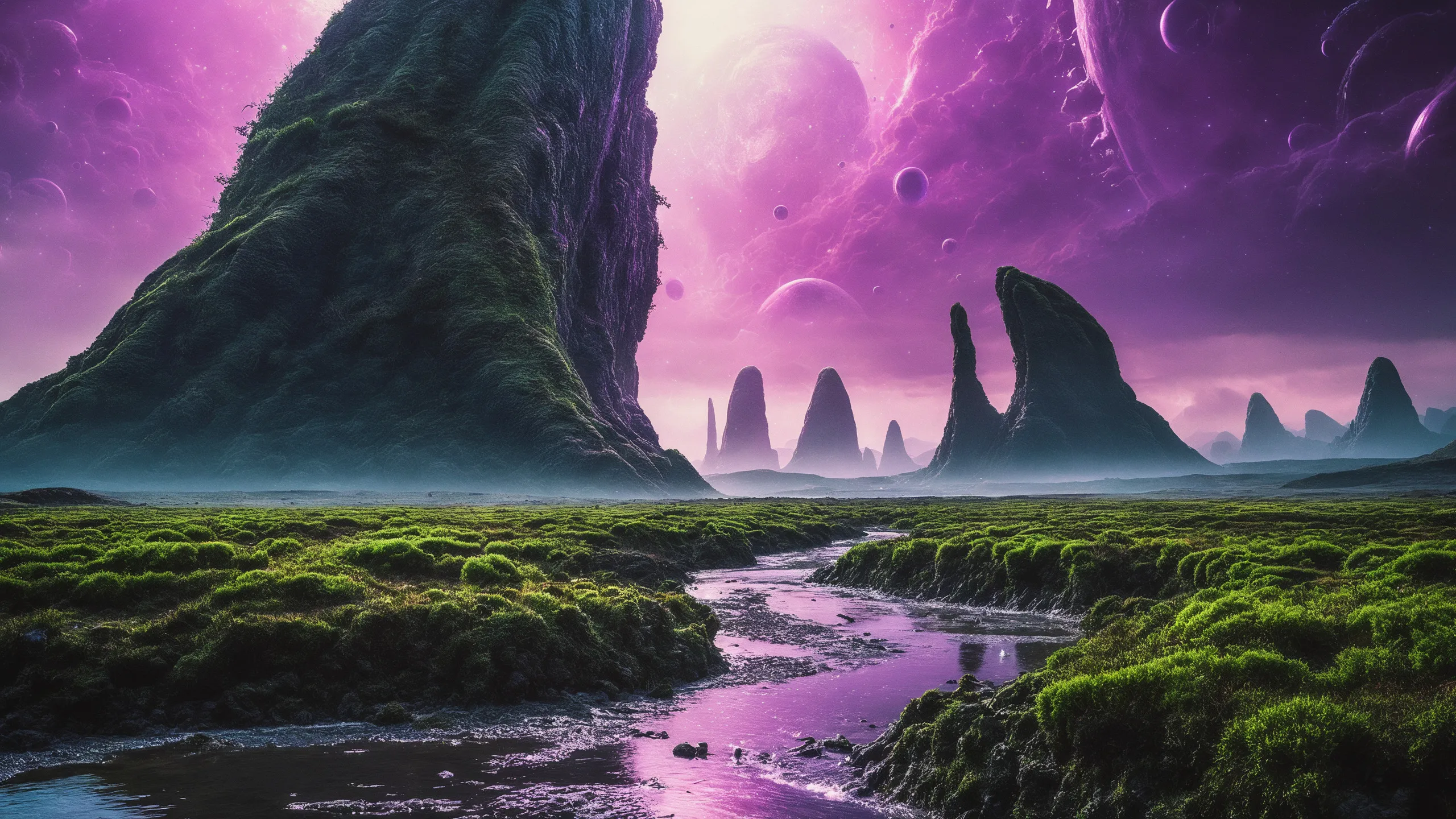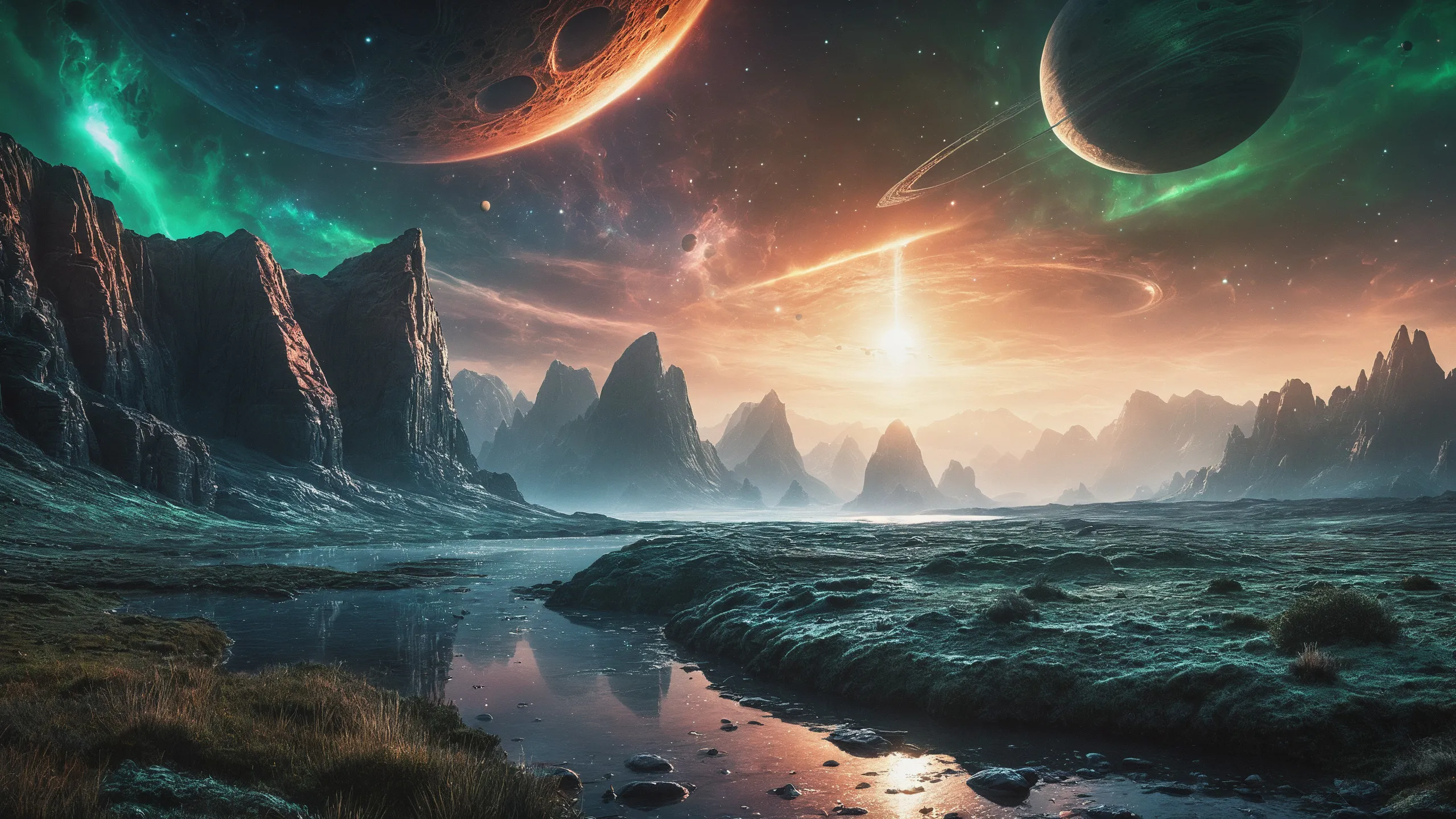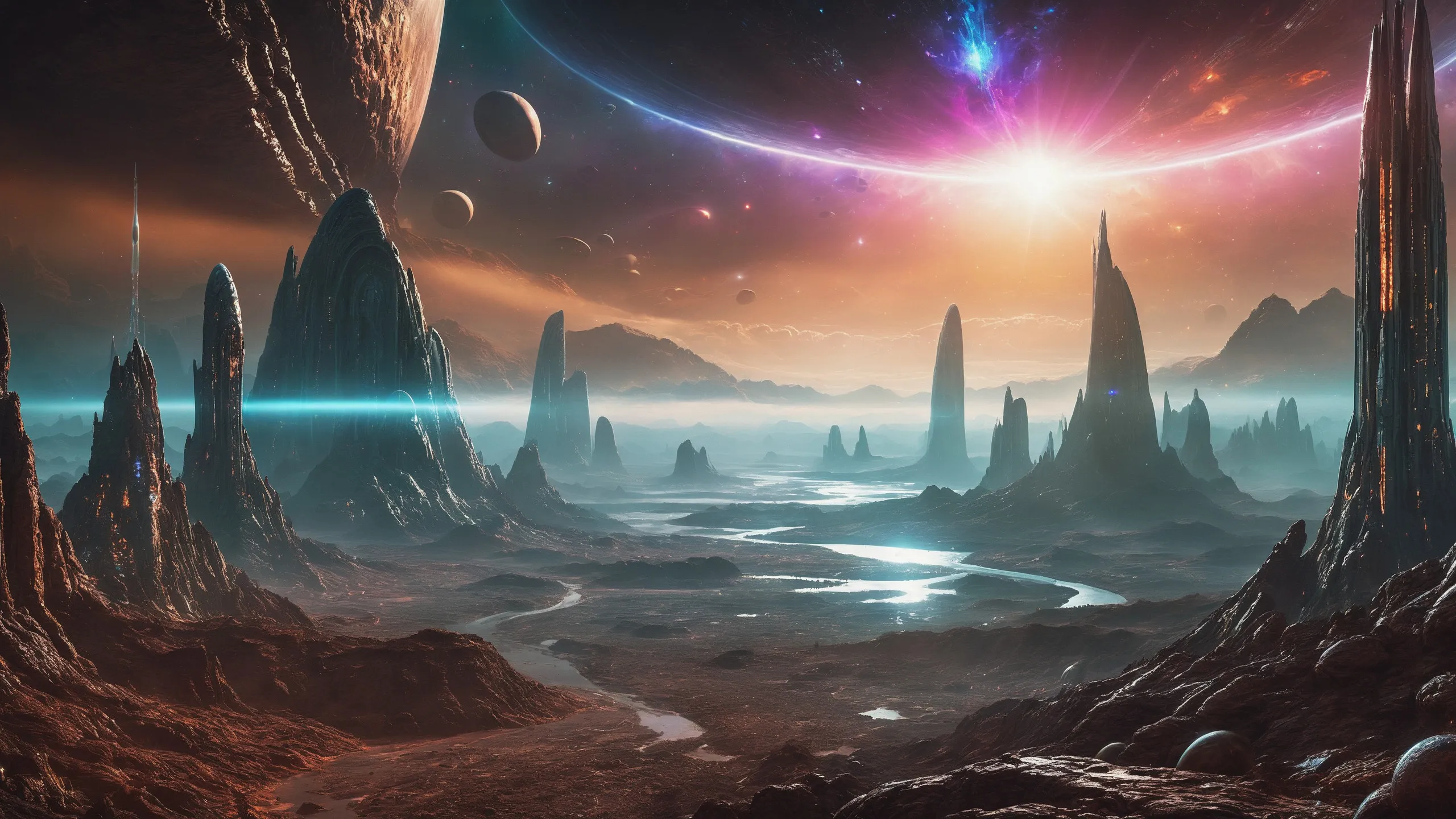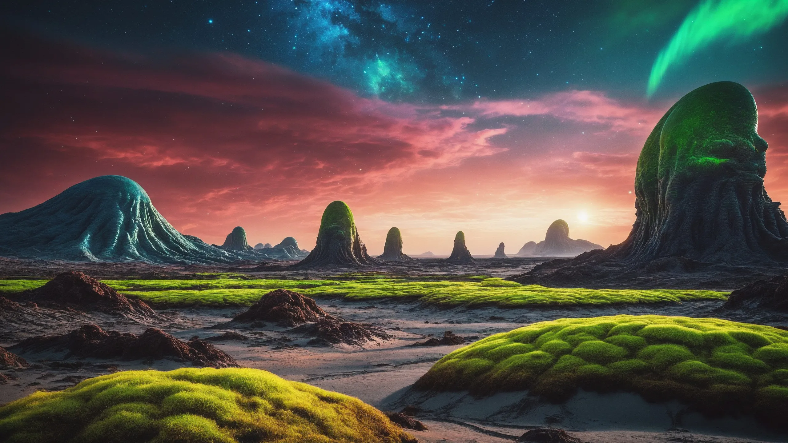{Ice World|Diamond Plains|Bio-Luminescent Landscape|Mossy Meadows|Shifting Sands|Crystal Forests|Floating Islands|Acid Pools|Volcanic Plains|Perpetual Storms|Megastructures|Terraforming Projects|Methane Sea|Metallic Plains|tidelands|Seashore|beach|coast|cliff|lake|river|creek|djungle|grassland|flower|taiga|tundra|savannah|wetlands|desert|dunes|mangroves|salt flats|salt marshes|ice|majestic mountain|mountain|Swamp|marsh area|rain forests|badlands|wastelands} landsscape.