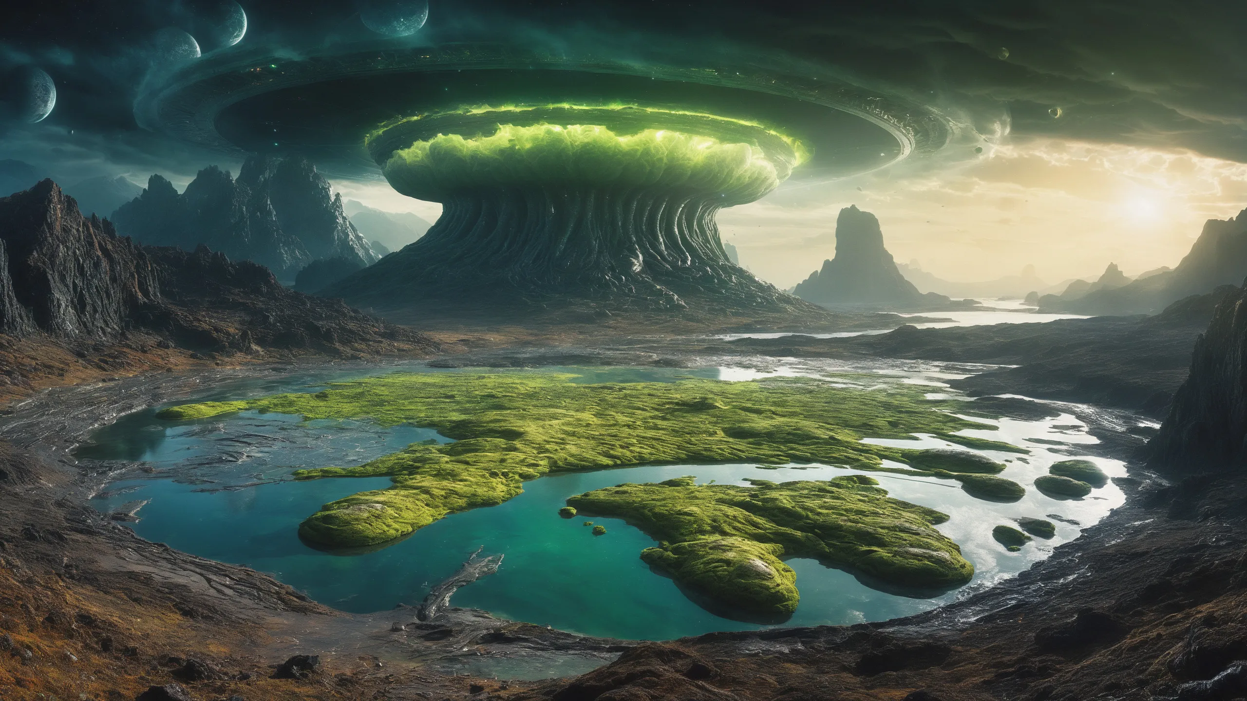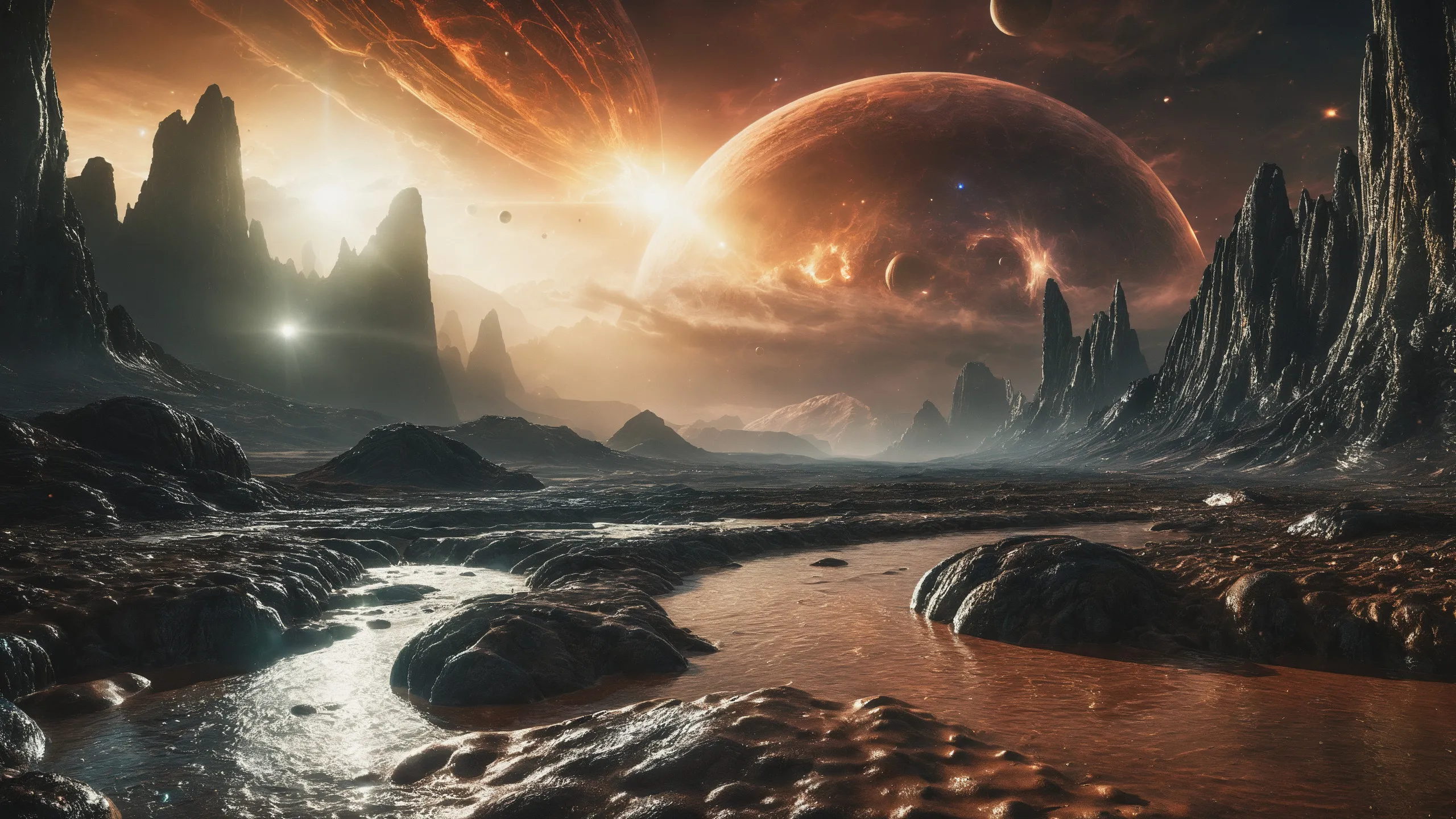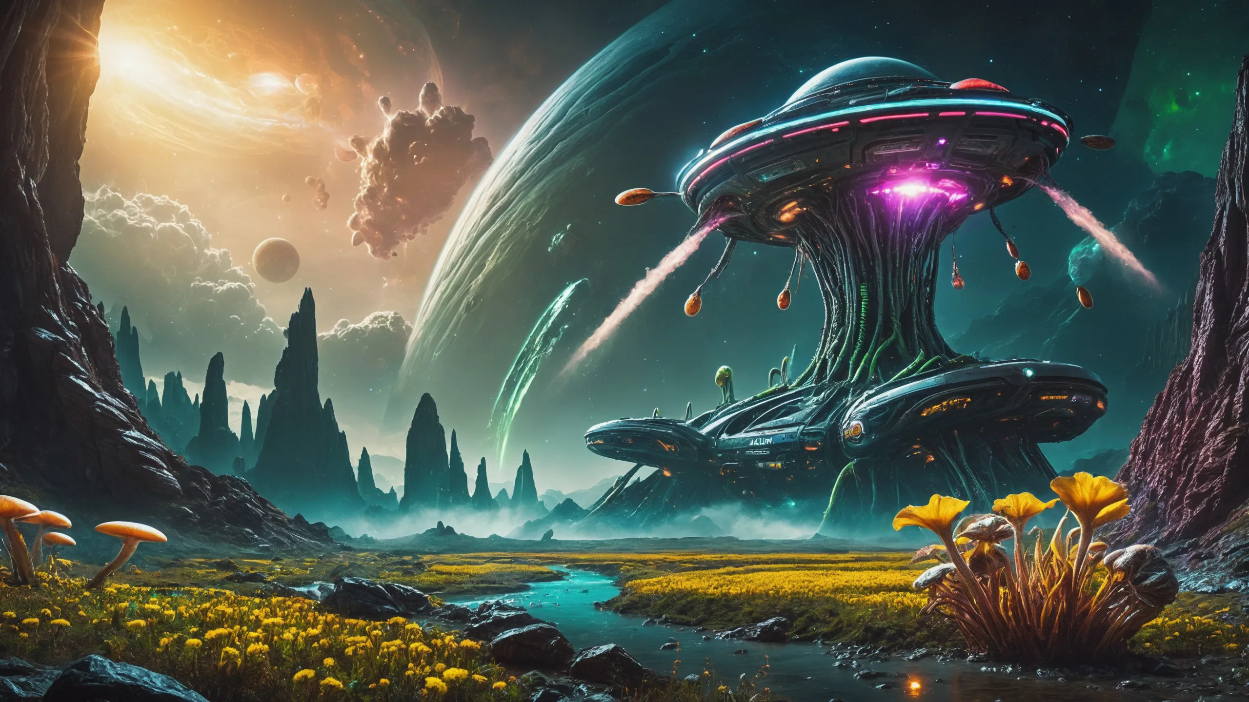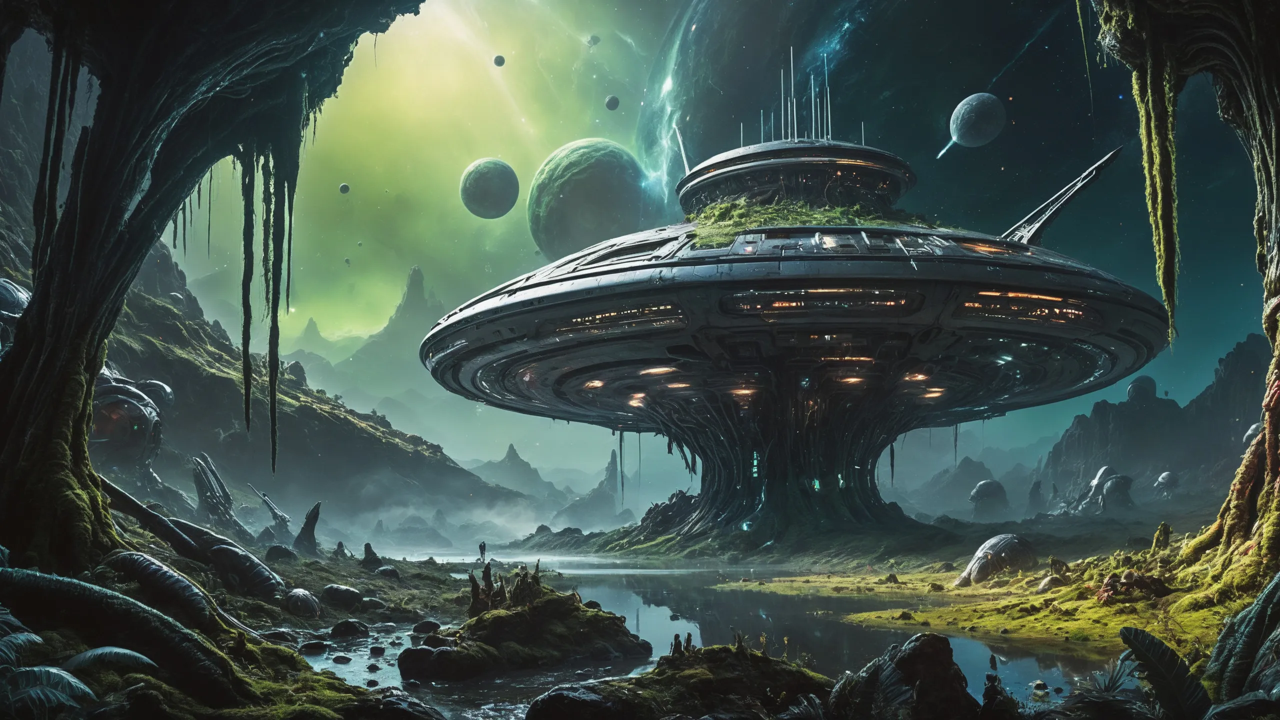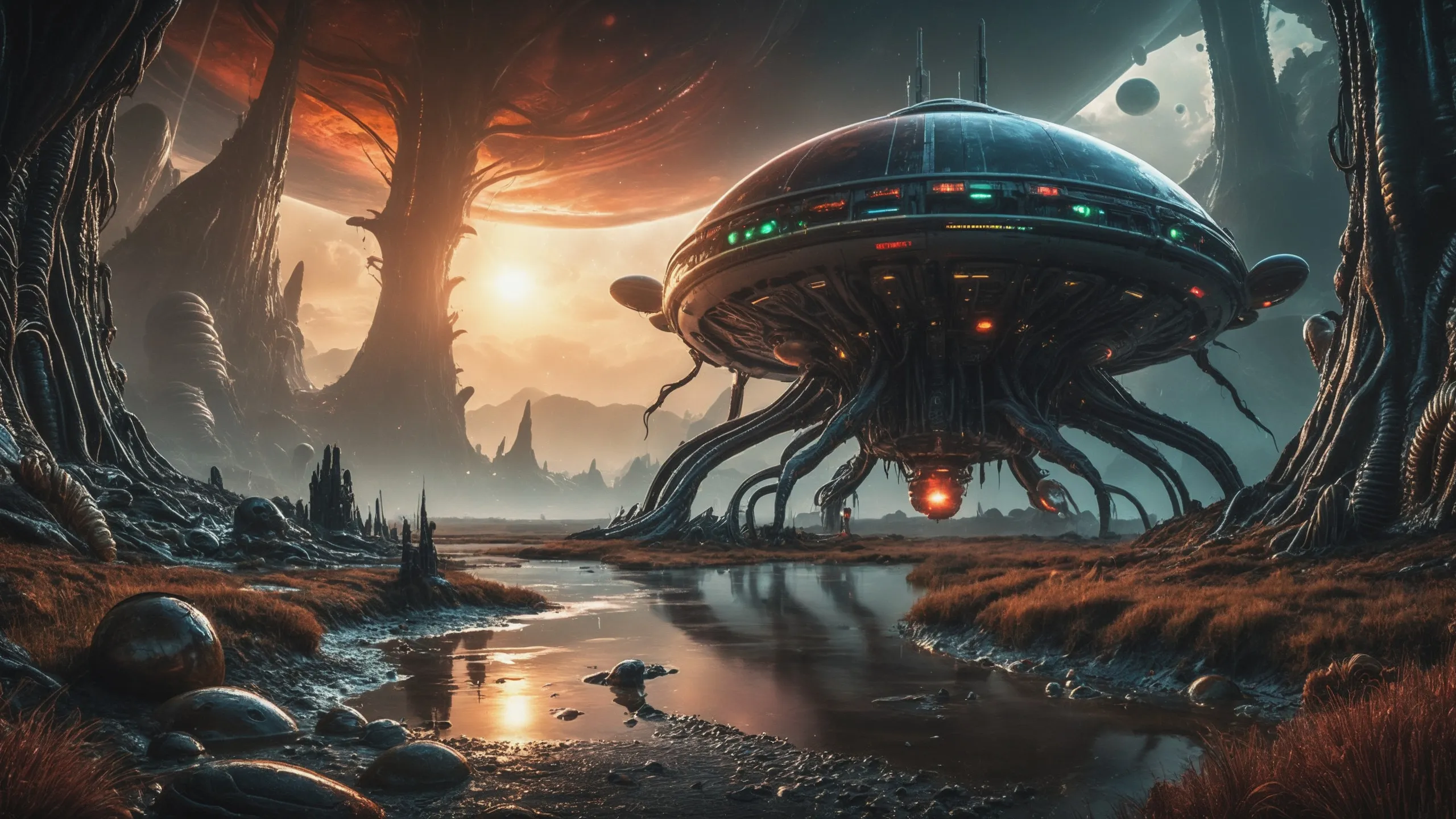 {Ice World|Diamond Plains|Bio-Luminescent Landscape|Mossy Meadows|Shifting Sands|Crystal Forests|Floating Islands|Acid Pools|Volcanic Plains|Perpetual Storms|Megastructures|Terraforming Projects|Methane Sea|Metallic Plains|tidelands|Seashore|beach|coast|cliff|lake|river|creek|djungle|grassland|flower|taiga|tundra|savannah|wetlands|desert|dunes|mangroves|salt flats|salt marshes|ice|majestic mountain|mountain|Swamp|marsh area|rain forests|badlands|wastelands} landsscape.