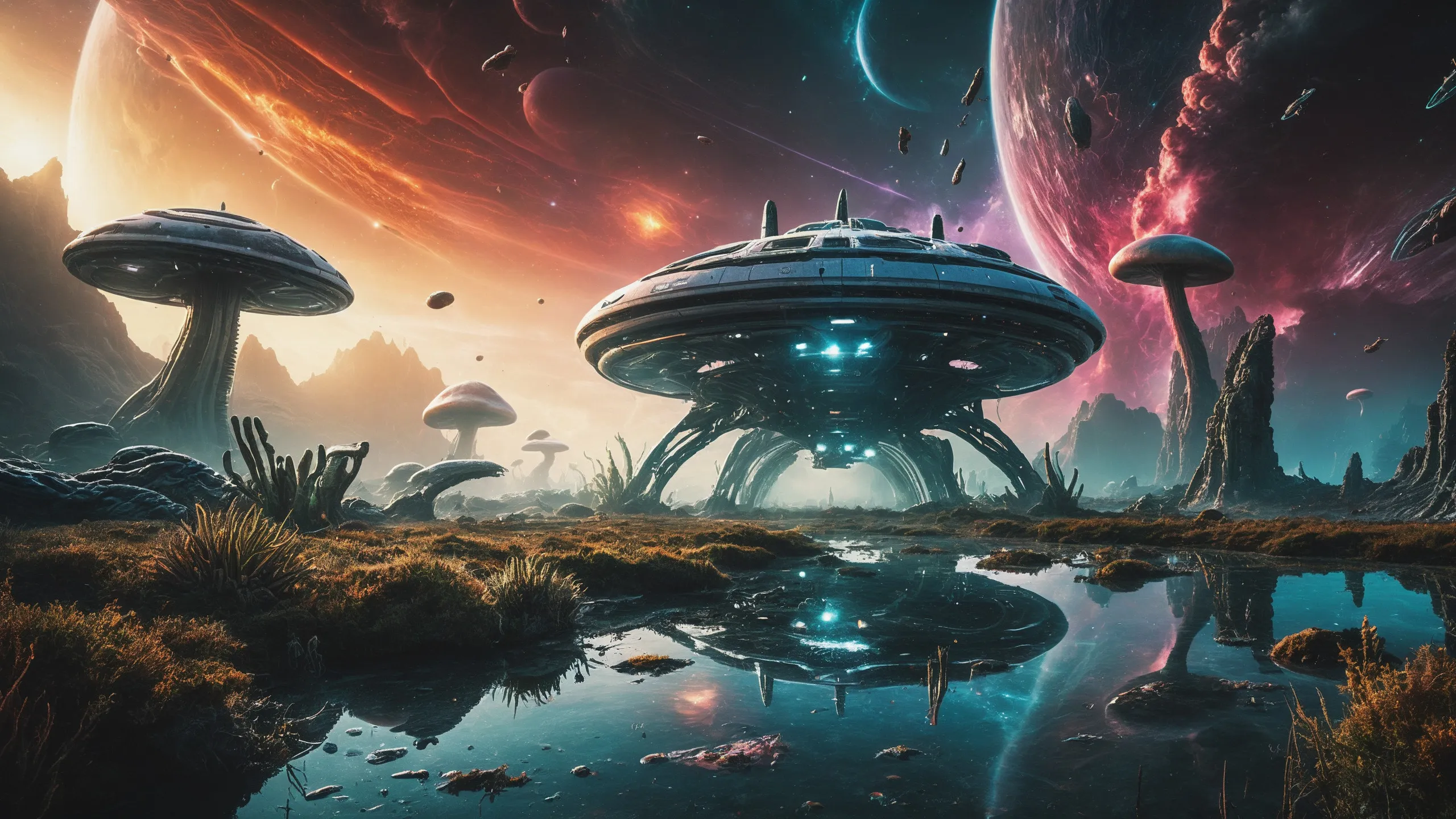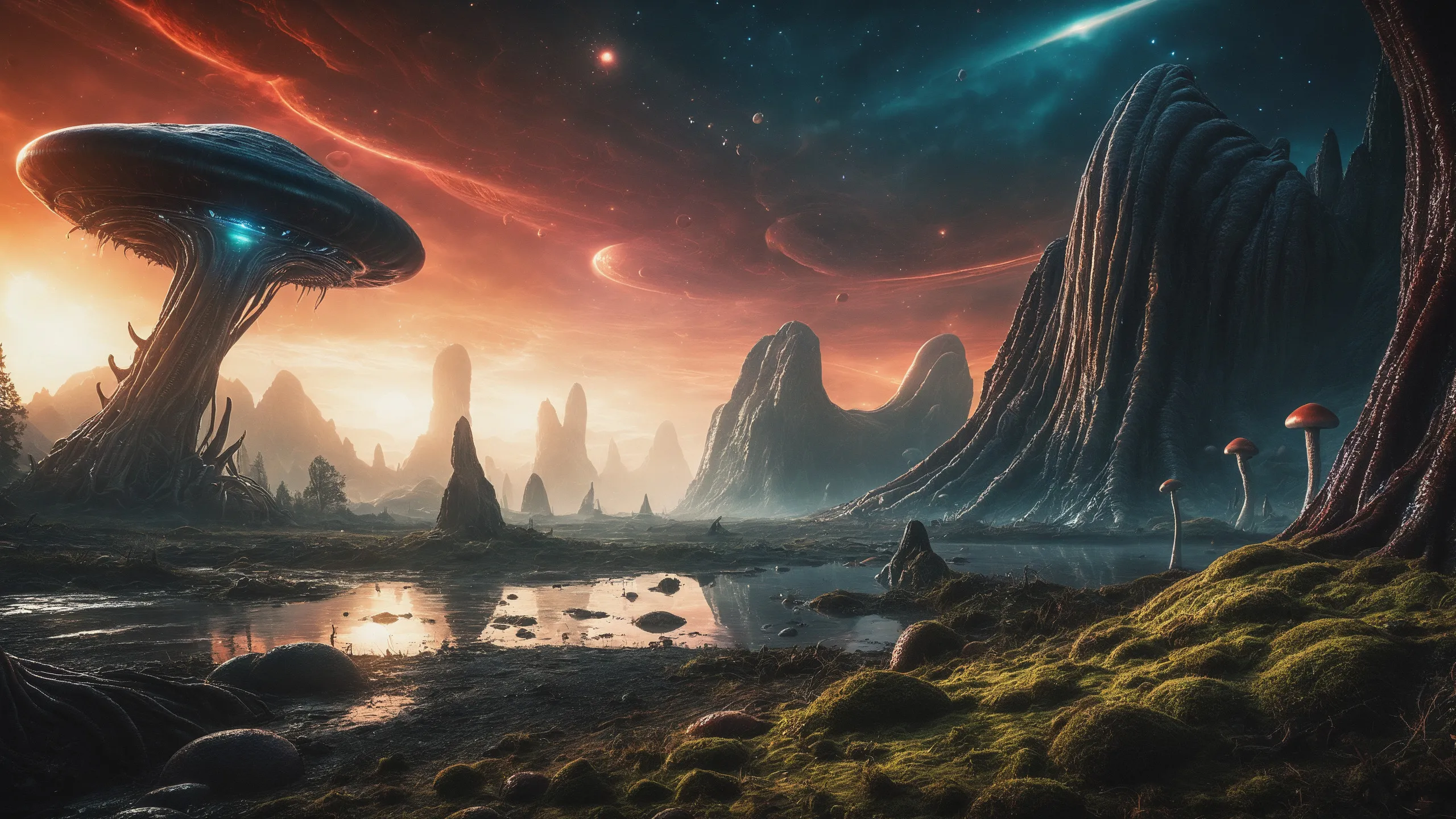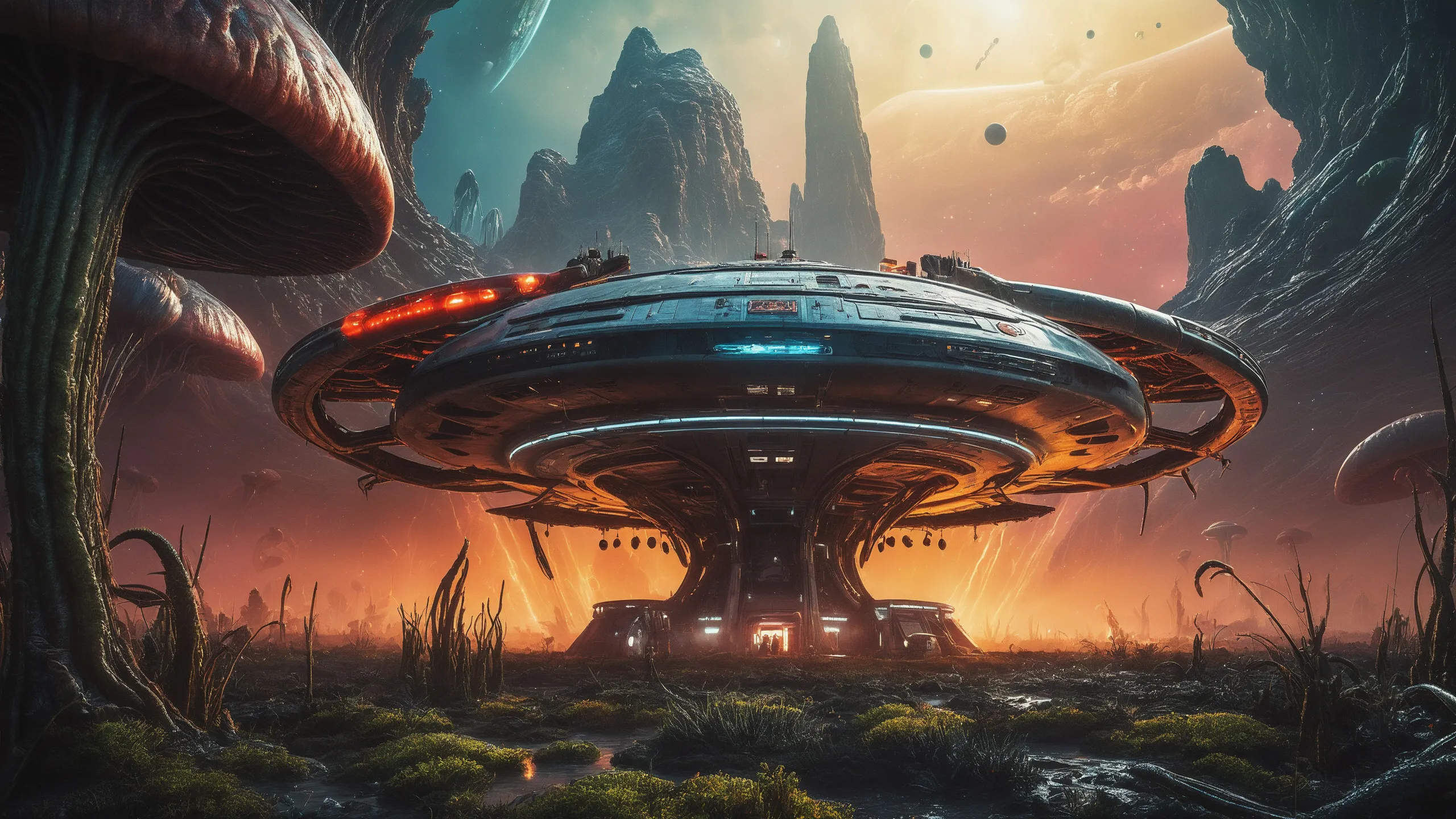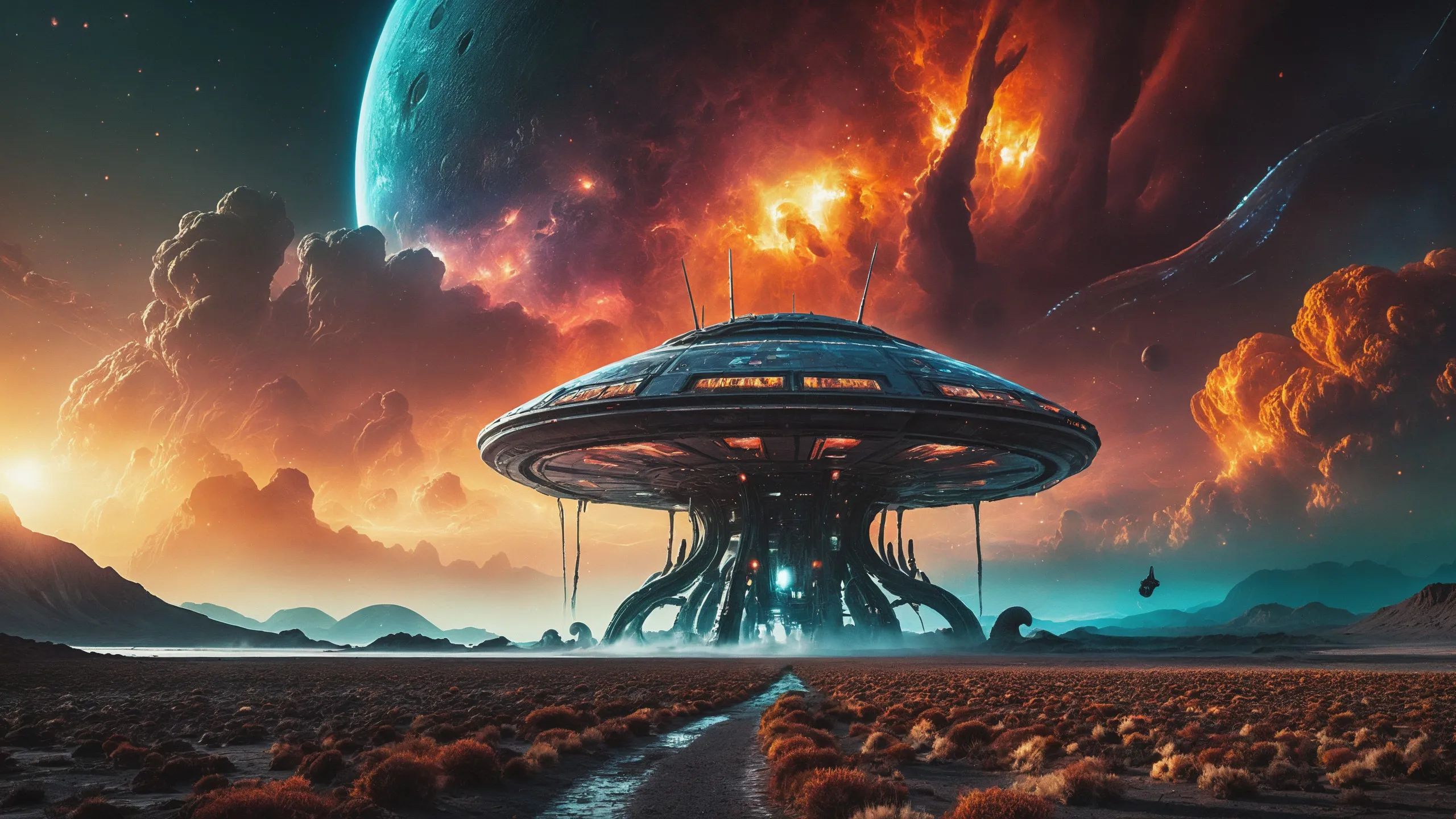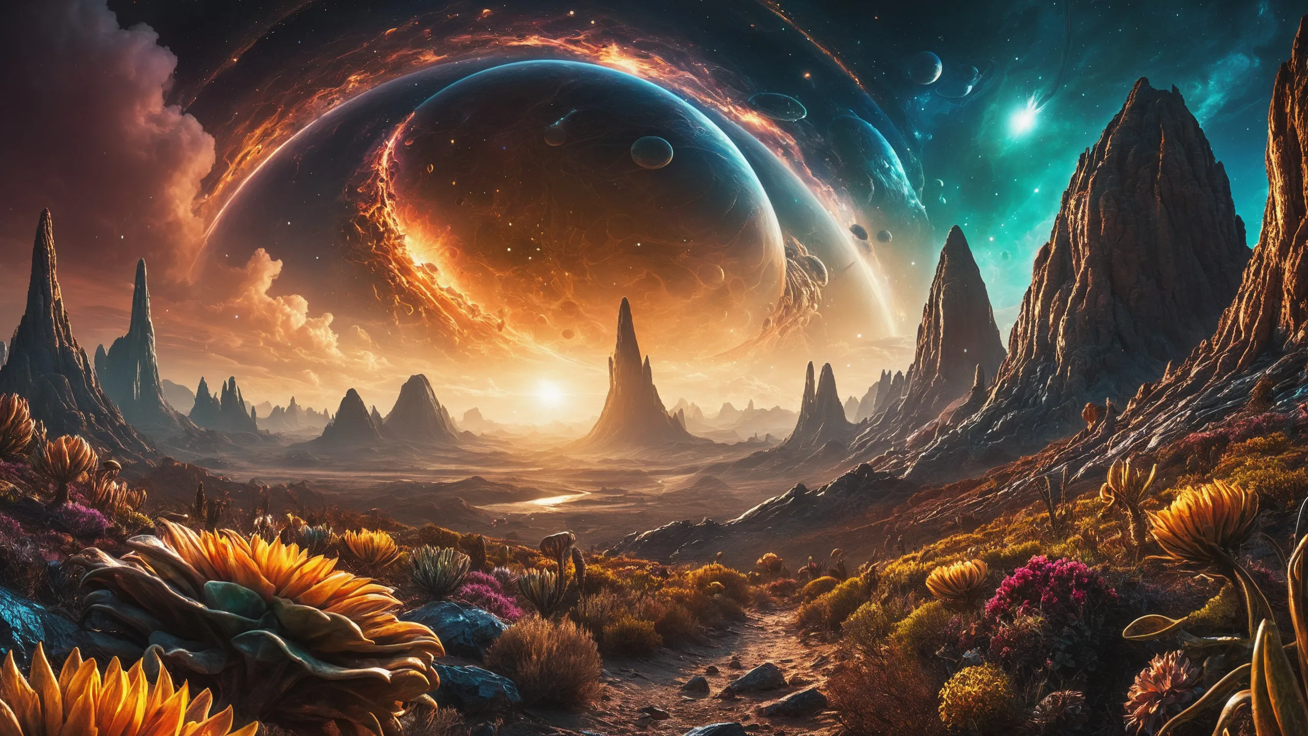 {Ice World|Diamond Plains|Bio-Luminescent Landscape|Mossy Meadows|Shifting Sands|Crystal Forests|Floating Islands|Acid Pools|Volcanic Plains|Perpetual Storms|Megastructures|Terraforming Projects|Methane Sea|Metallic Plains|tidelands|Seashore|beach|coast|cliff|lake|river|creek|djungle|grassland|flower|taiga|tundra|savannah|wetlands|desert|dunes|mangroves|salt flats|salt marshes|ice|majestic mountain|mountain|Swamp|marsh area|rain forests|badlands|wastelands} landsscape.