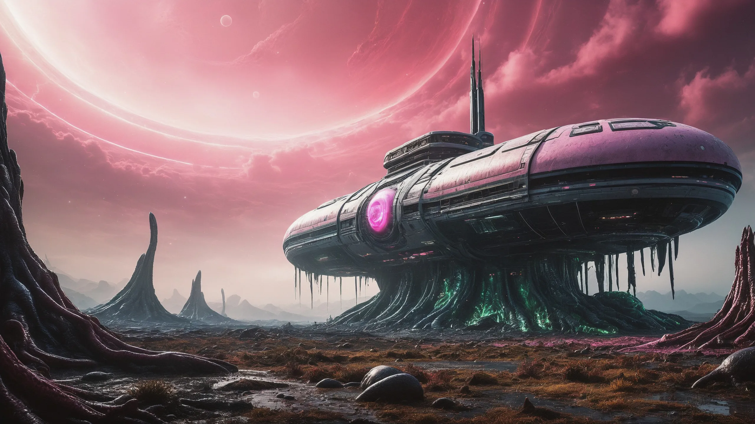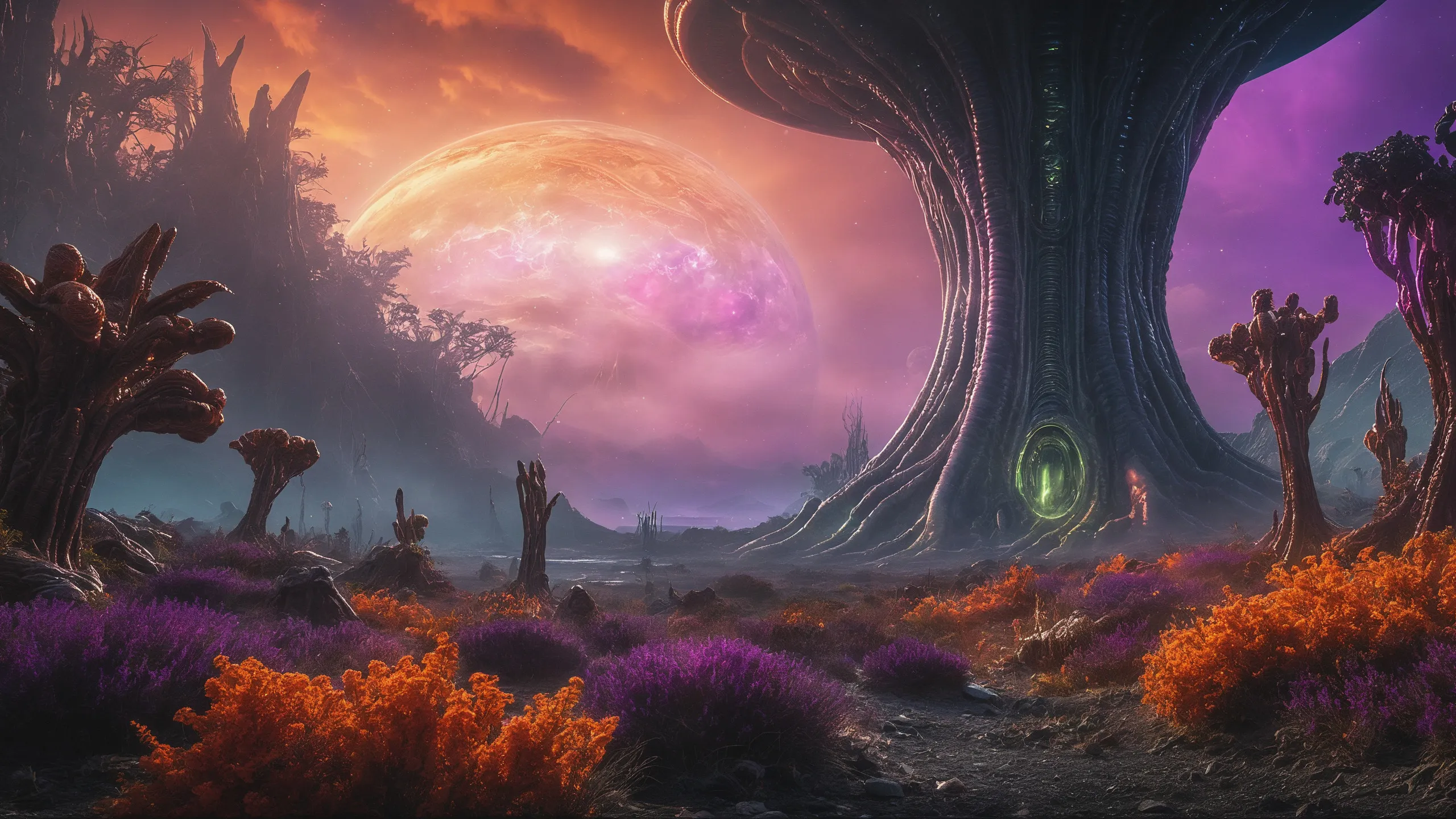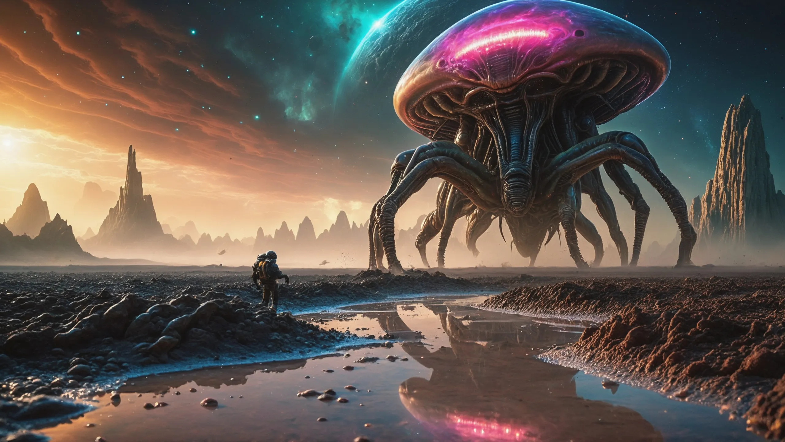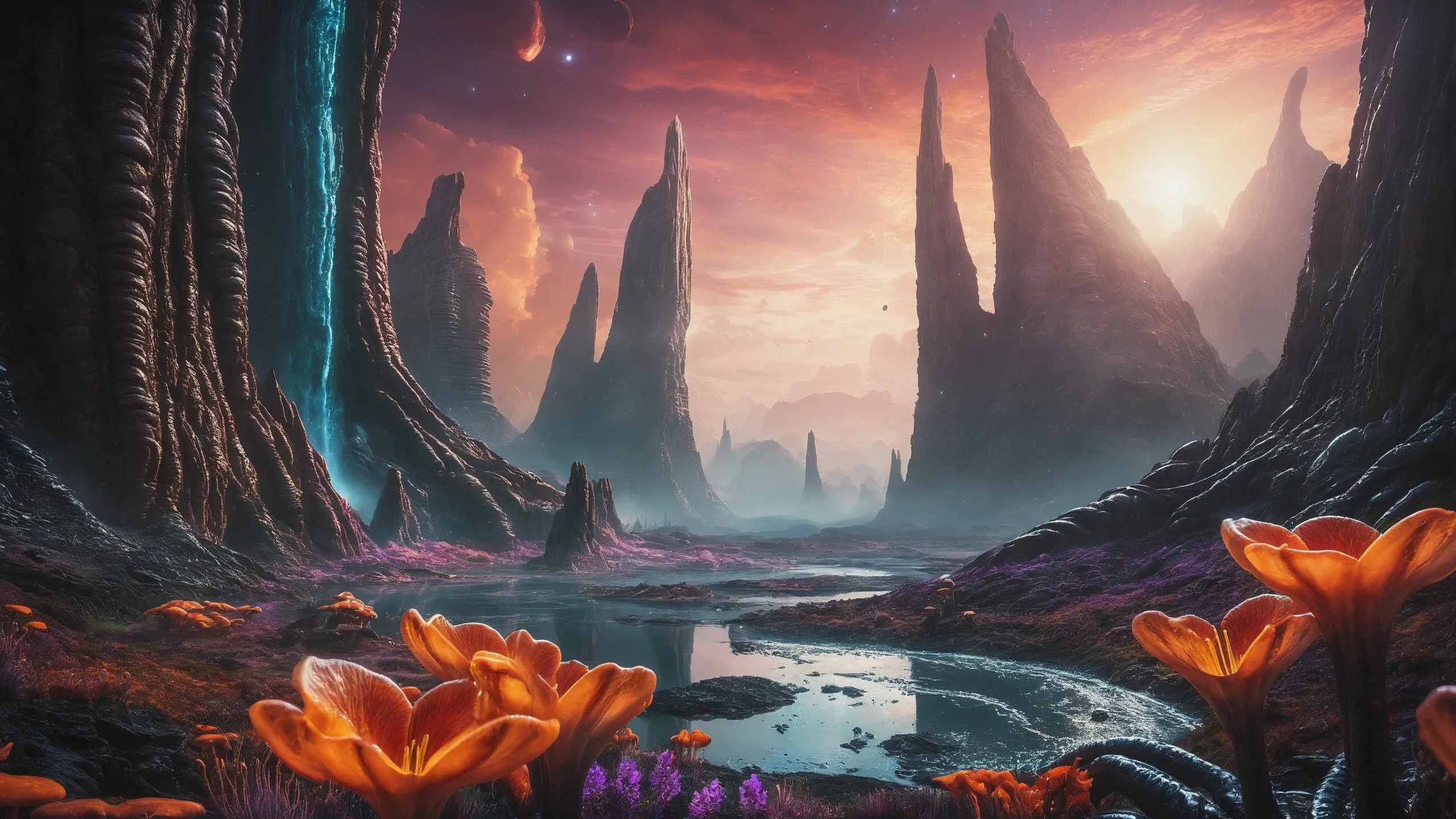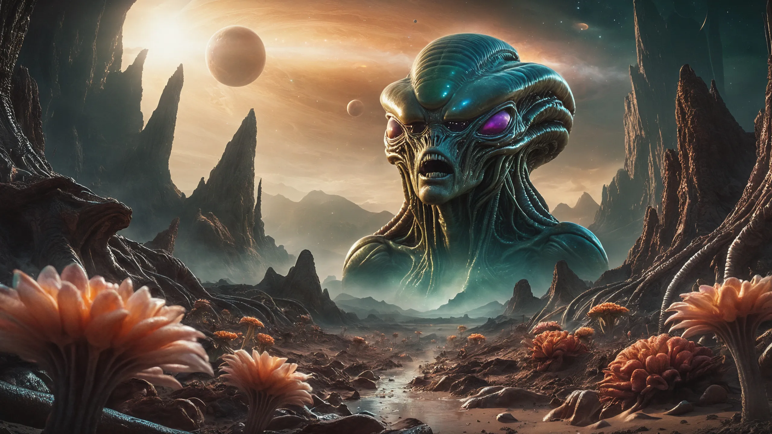 {Ice World|Diamond Plains|Bio-Luminescent Landscape|Mossy Meadows|Shifting Sands|Crystal Forests|Floating Islands|Acid Pools|Volcanic Plains|Perpetual Storms|Megastructures|Terraforming Projects|Methane Sea|Metallic Plains|tidelands|Seashore|beach|coast|cliff|lake|river|creek|djungle|grassland|flower|taiga|tundra|savannah|wetlands|desert|dunes|mangroves|salt flats|salt marshes|ice|majestic mountain|mountain|Swamp|marsh area|rain forests|badlands|wastelands} landsscape.