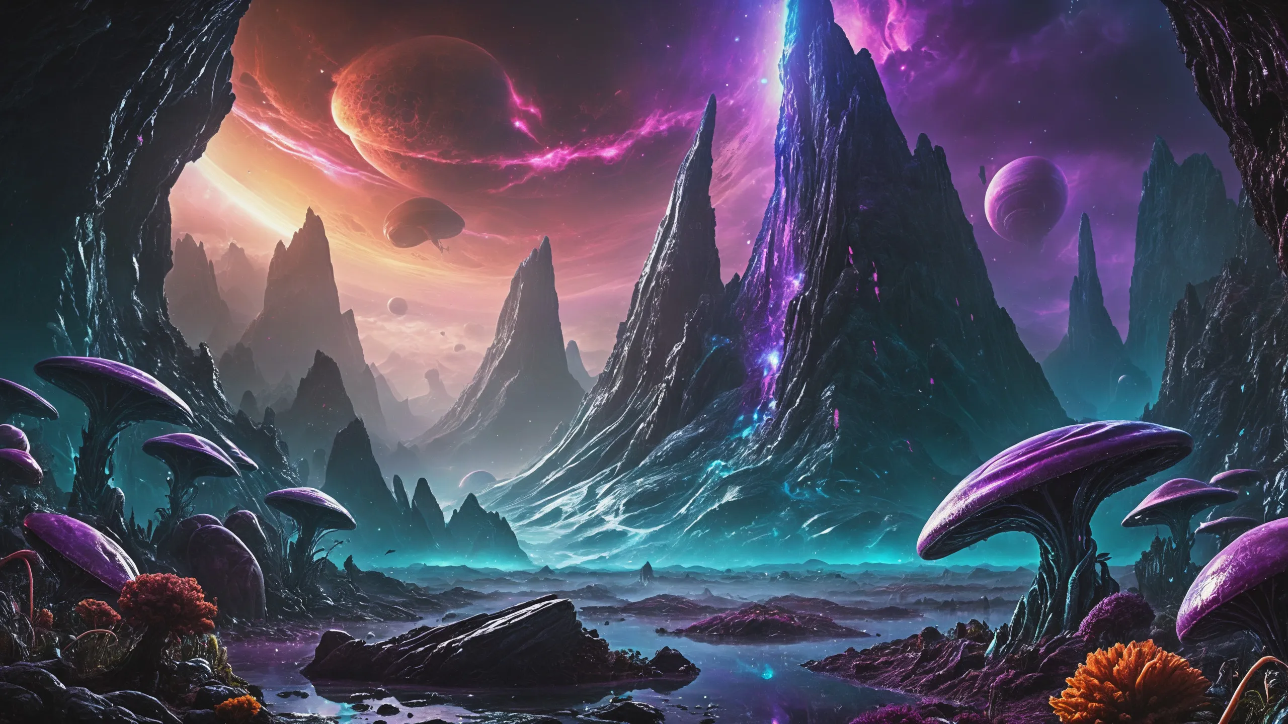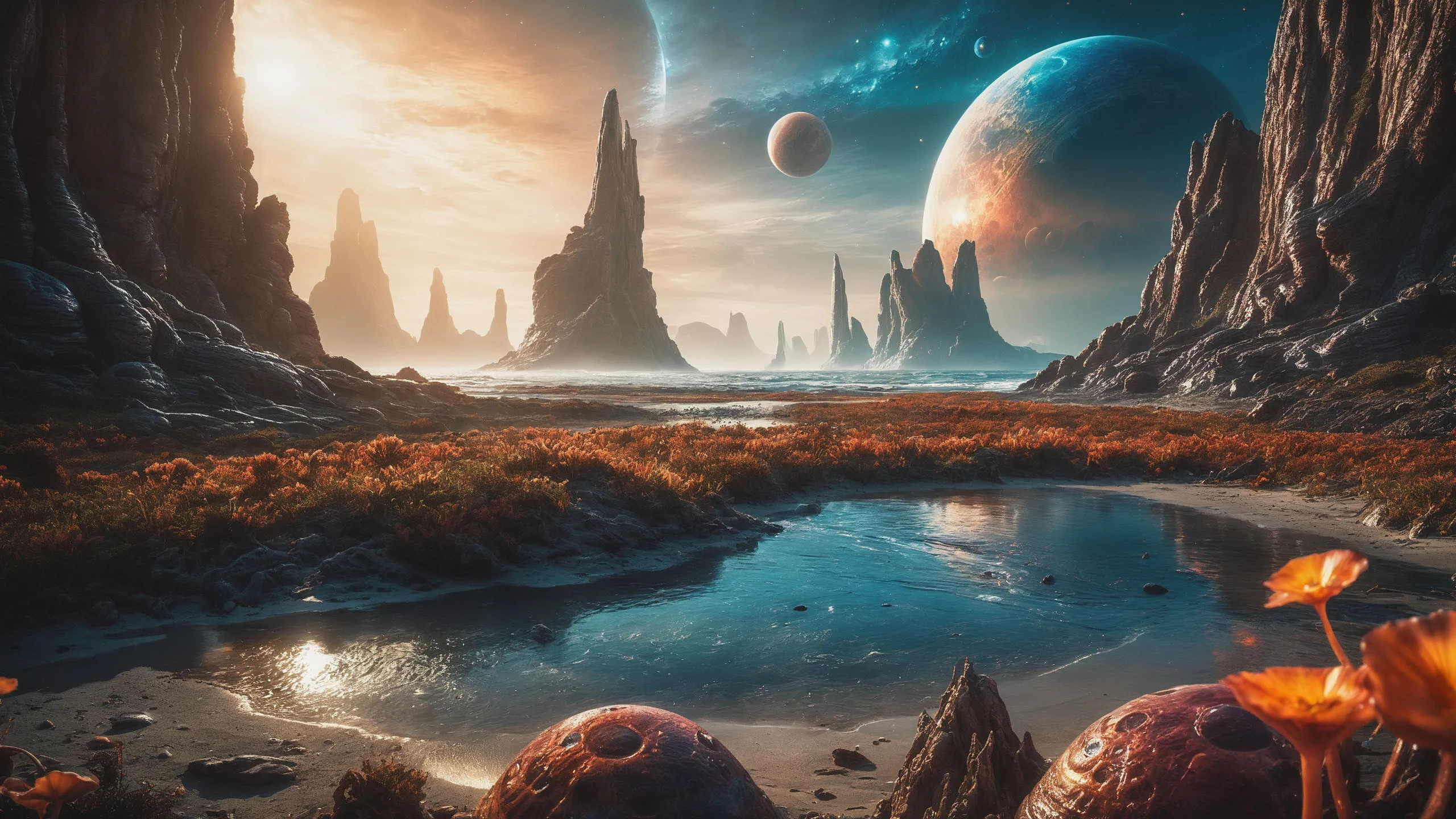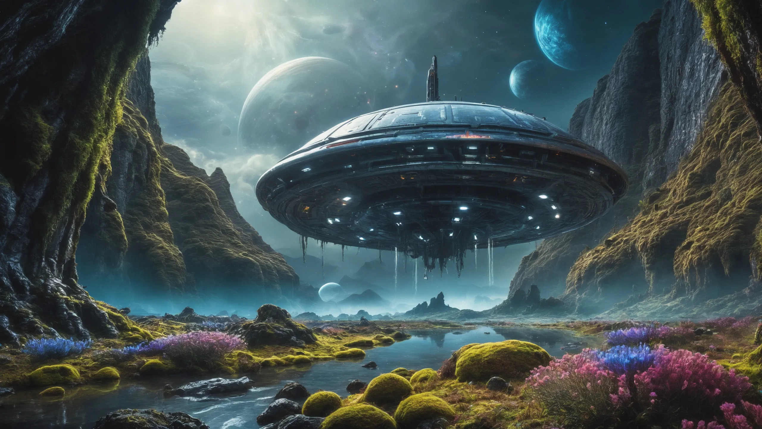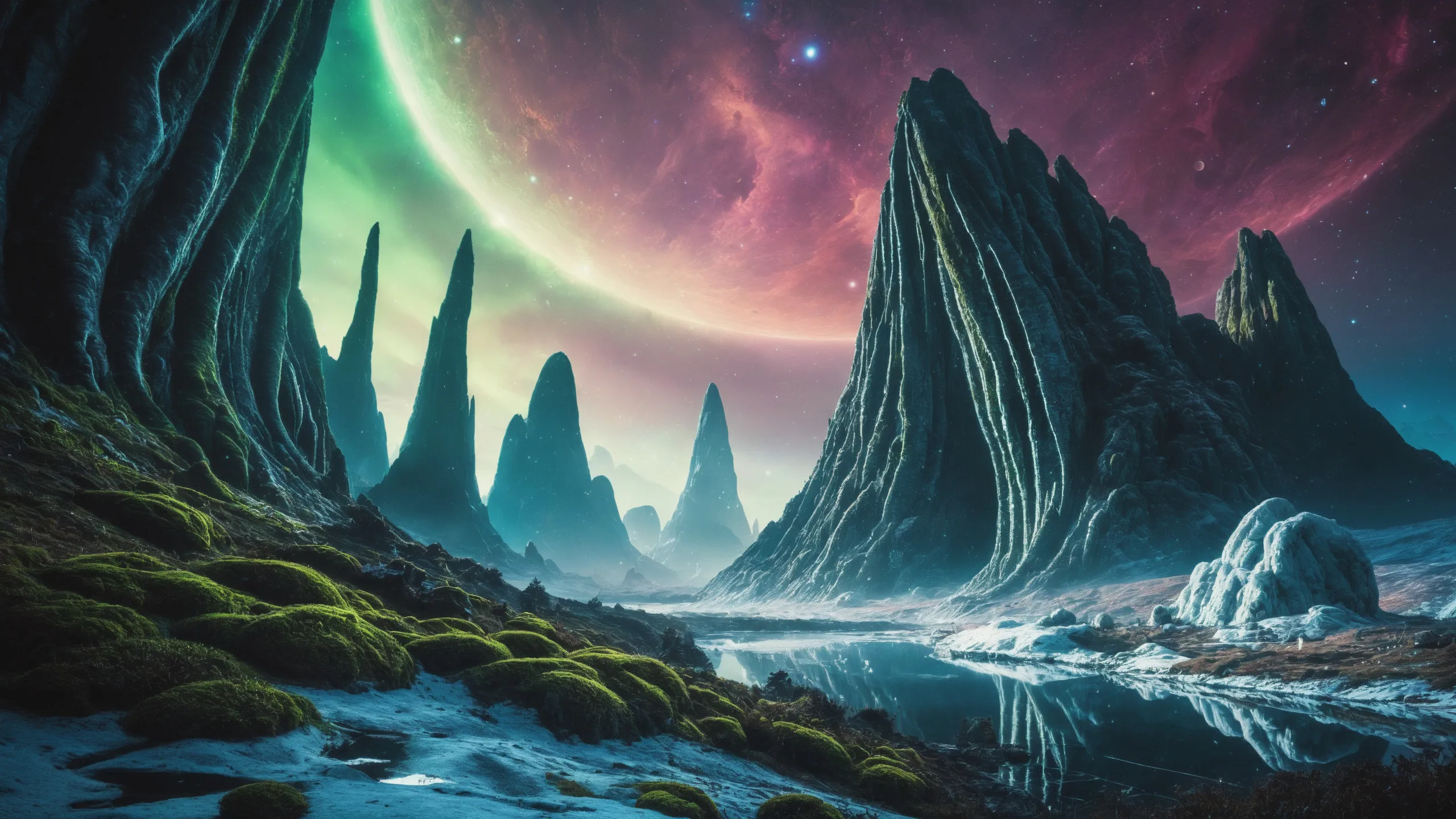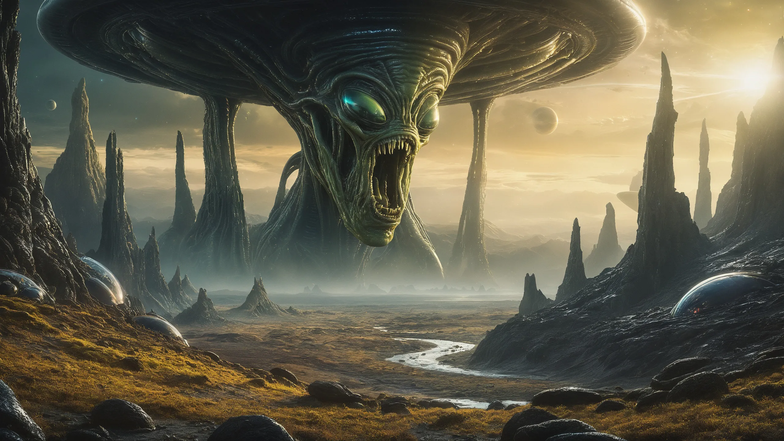 {Ice World|Diamond Plains|Bio-Luminescent Landscape|Mossy Meadows|Shifting Sands|Crystal Forests|Floating Islands|Acid Pools|Volcanic Plains|Perpetual Storms|Megastructures|Terraforming Projects|Methane Sea|Metallic Plains|tidelands|Seashore|beach|coast|cliff|lake|river|creek|djungle|grassland|flower|taiga|tundra|savannah|wetlands|desert|dunes|mangroves|salt flats|salt marshes|ice|majestic mountain|mountain|Swamp|marsh area|rain forests|badlands|wastelands} landsscape.