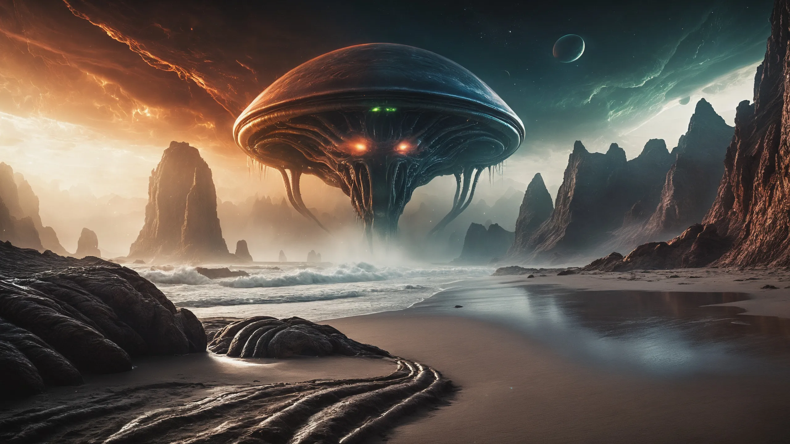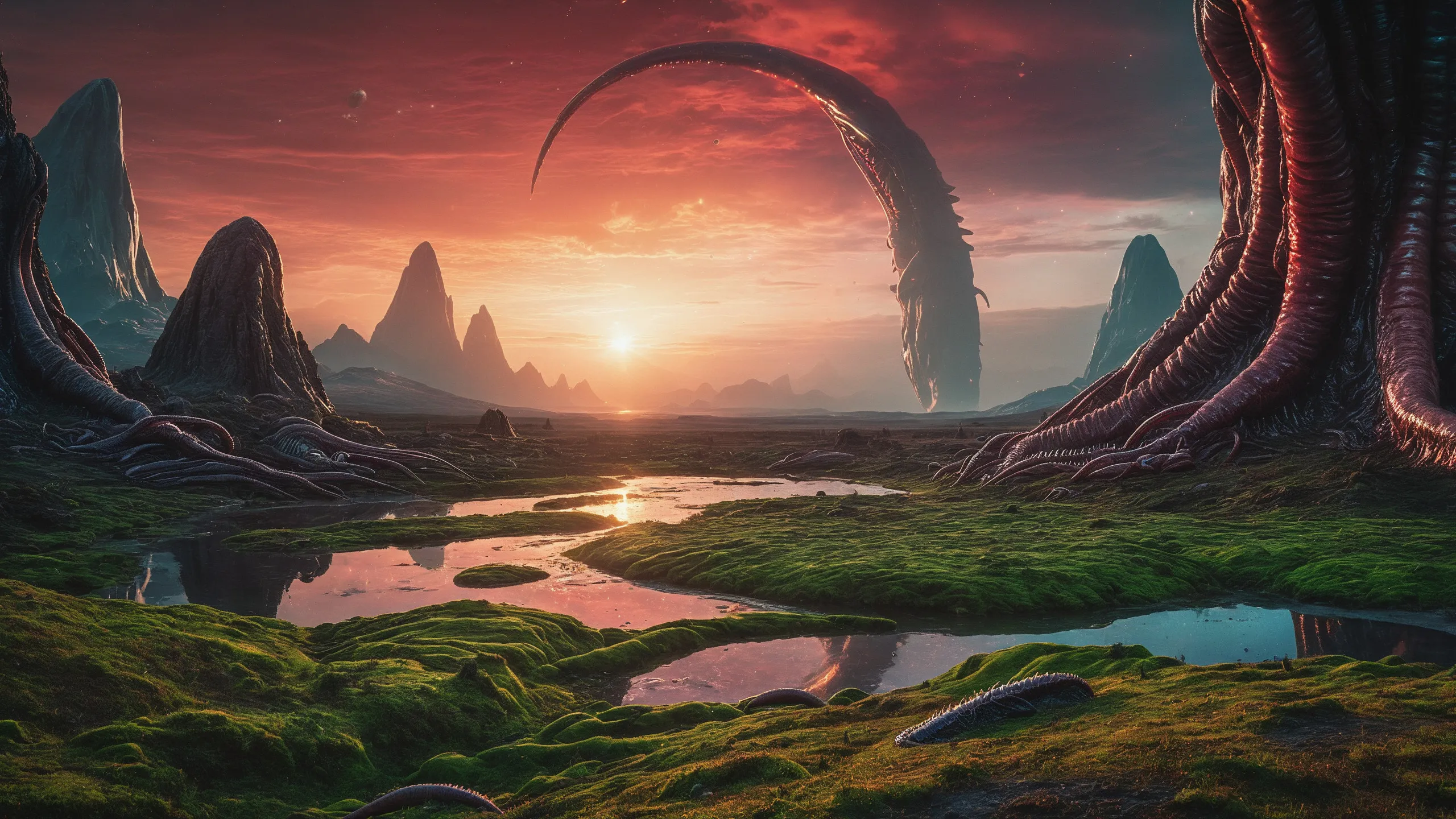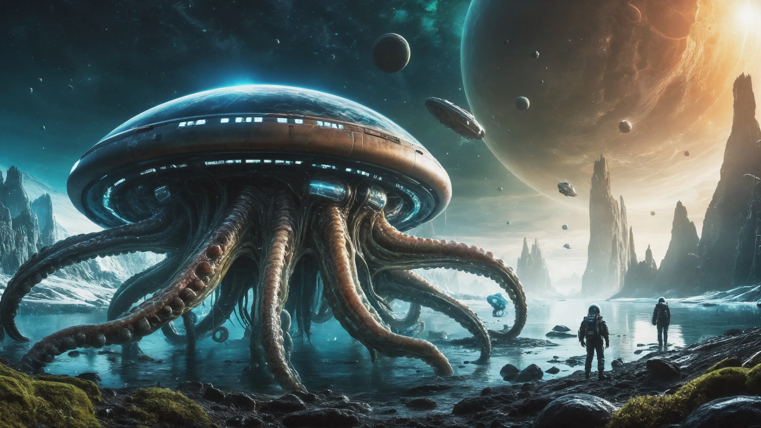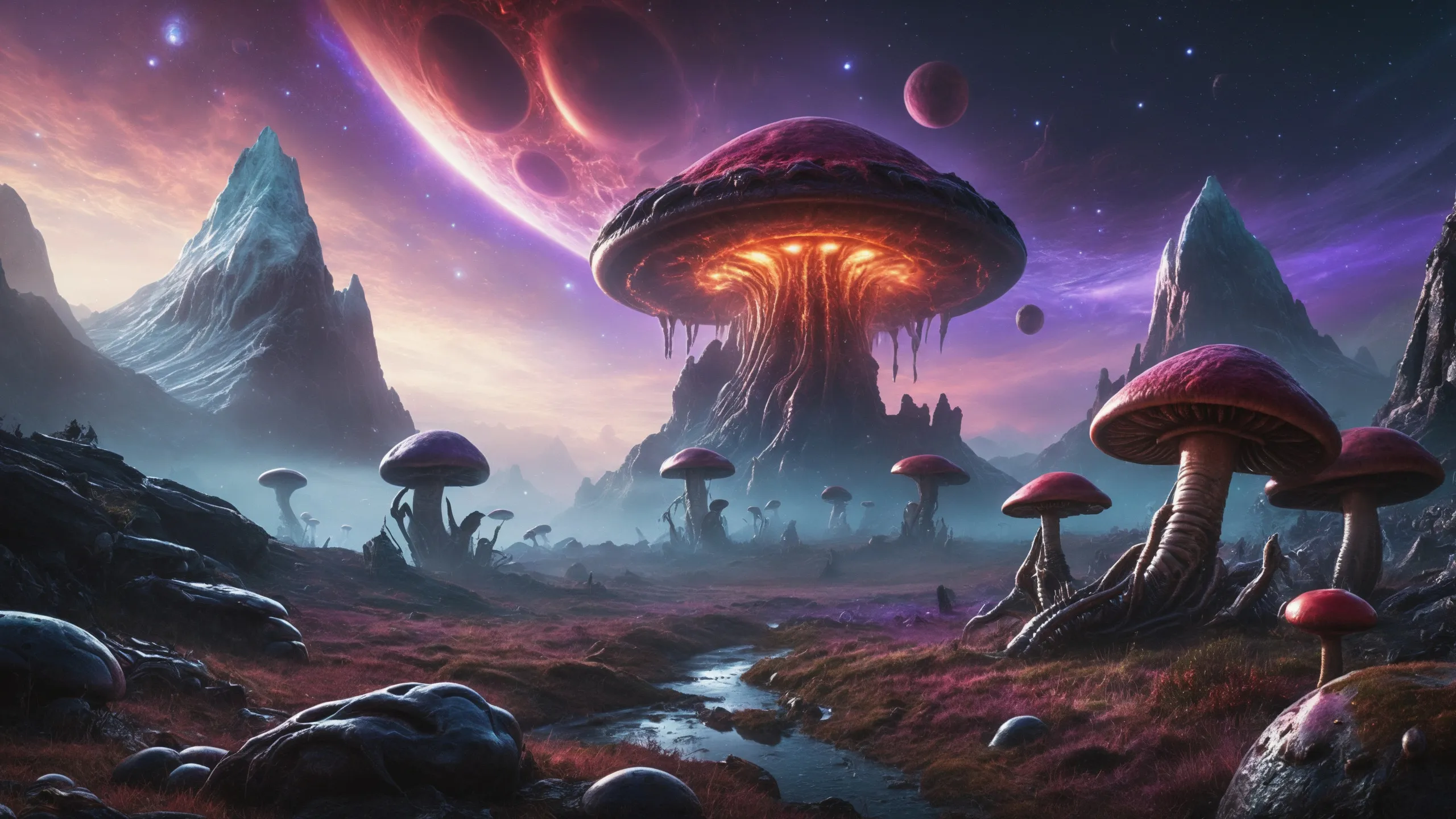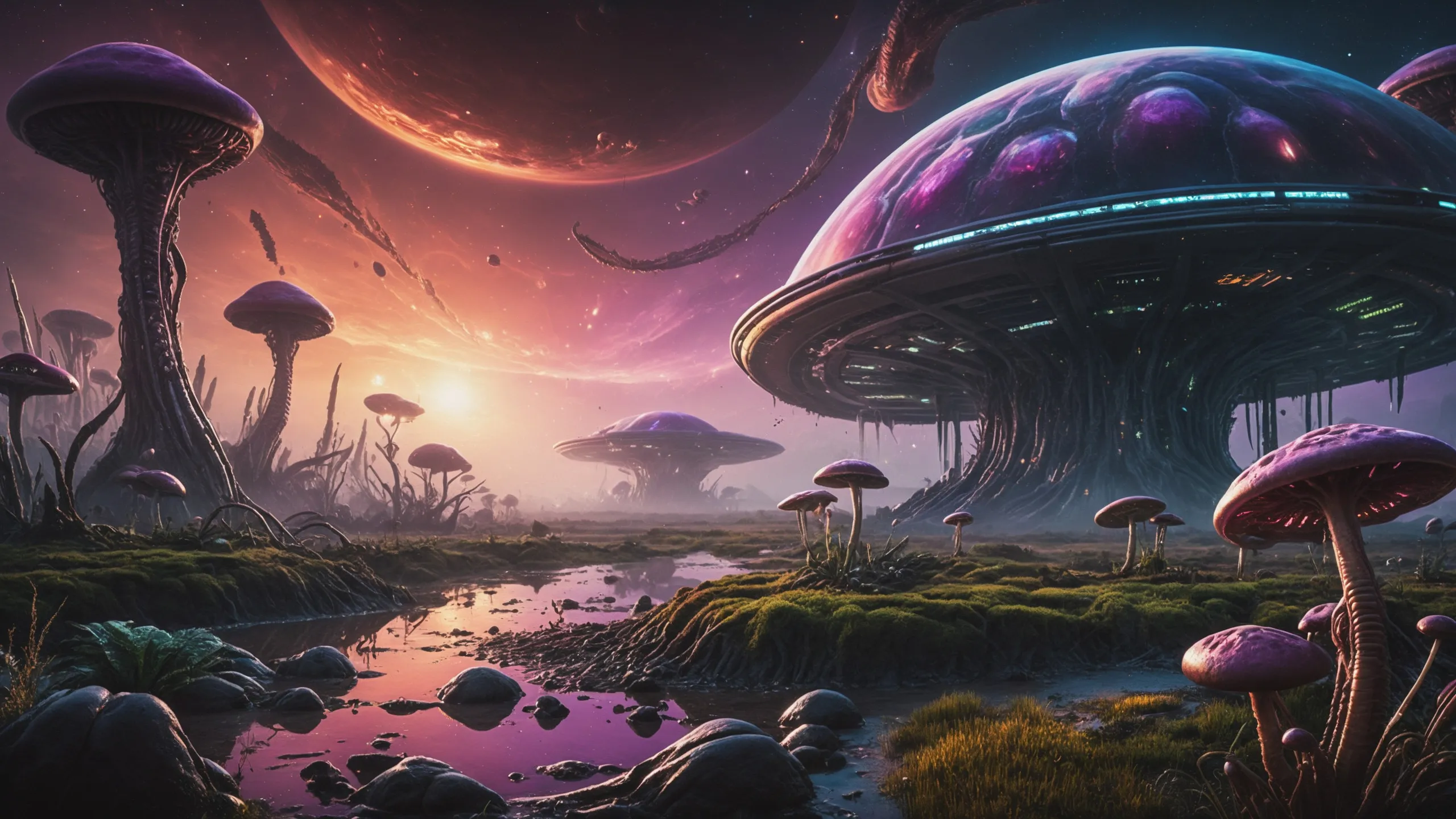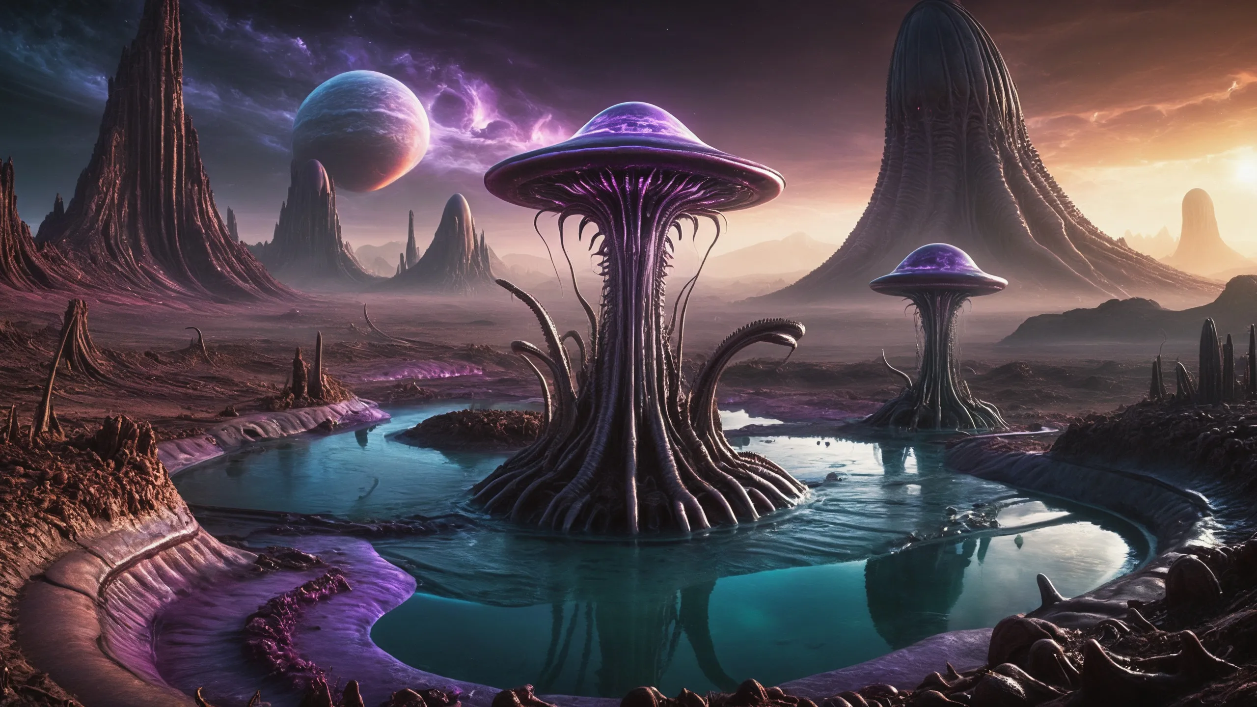 {Ice World|Diamond Plains|Bio-Luminescent Landscape|Mossy Meadows|Shifting Sands|Crystal Forests|Floating Islands|Acid Pools|Volcanic Plains|Perpetual Storms|Megastructures|Terraforming Projects|Methane Sea|Metallic Plains|tidelands|Seashore|beach|coast|cliff|lake|river|creek|djungle|grassland|flower|taiga|tundra|savannah|wetlands|desert|dunes|mangroves|salt flats|salt marshes|ice|majestic mountain|mountain|Swamp|marsh area|rain forests|badlands|wastelands} landsscape.