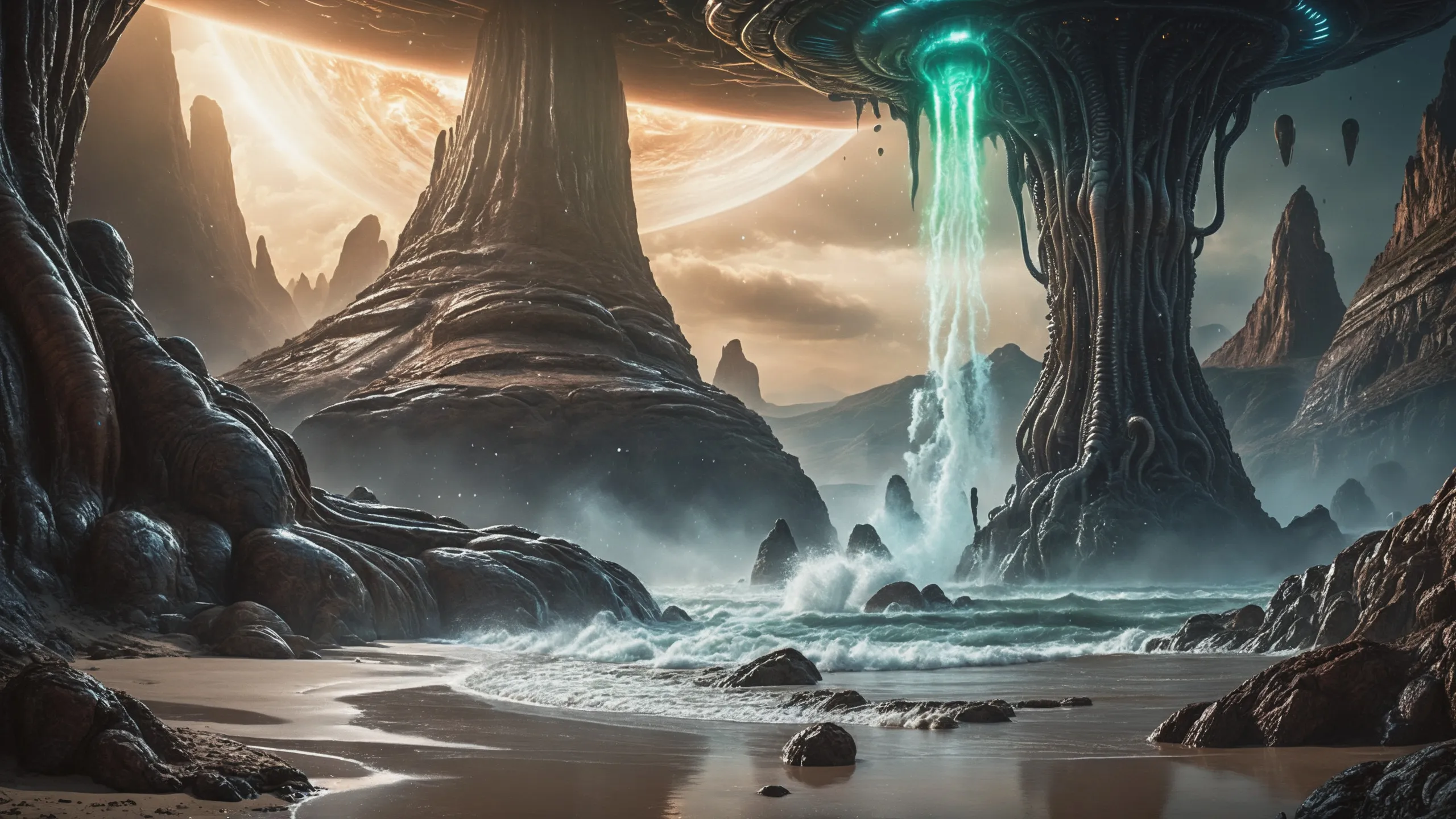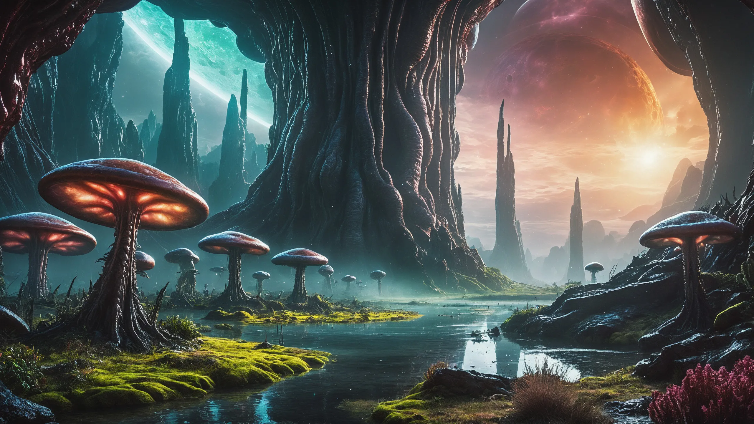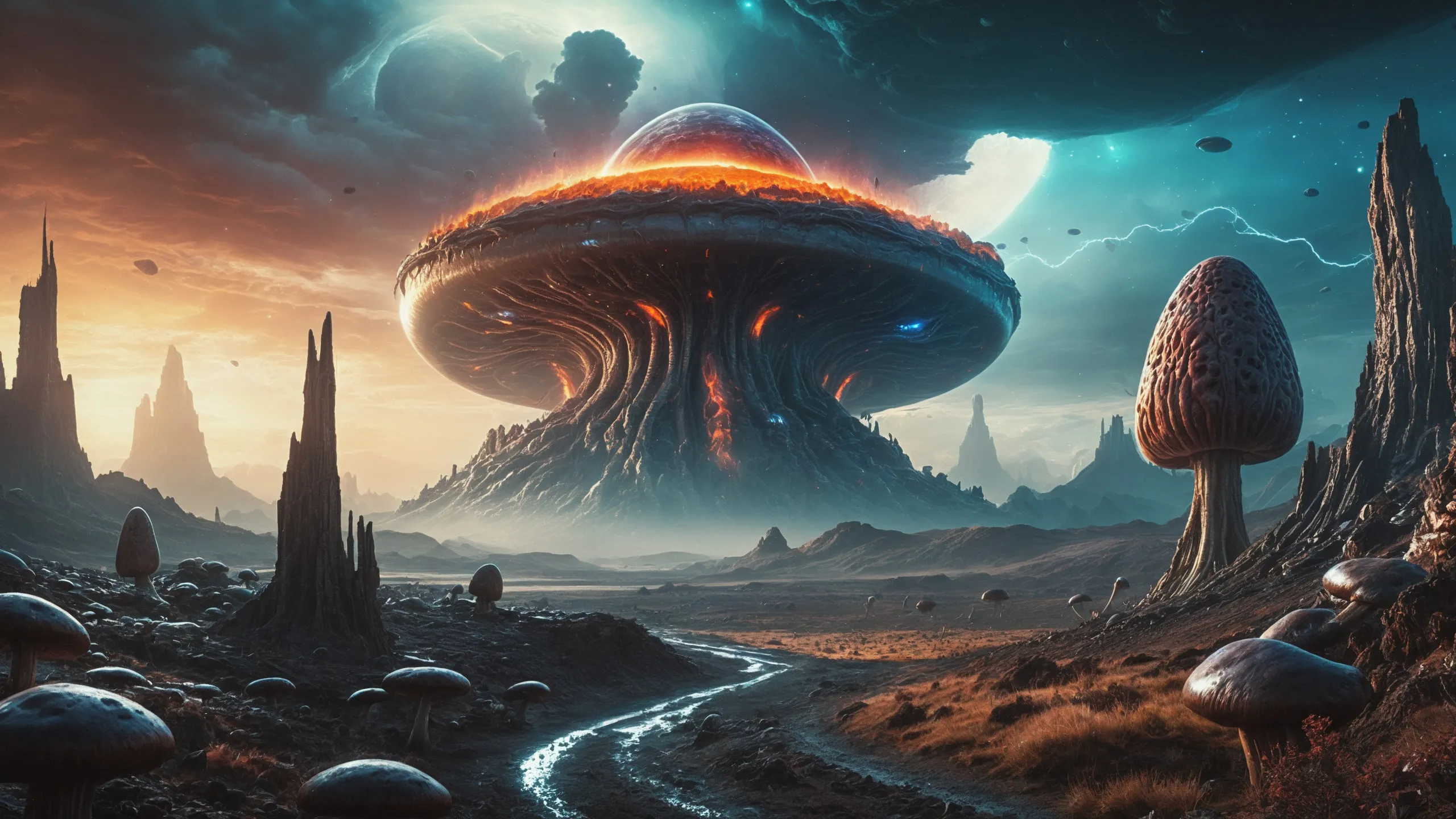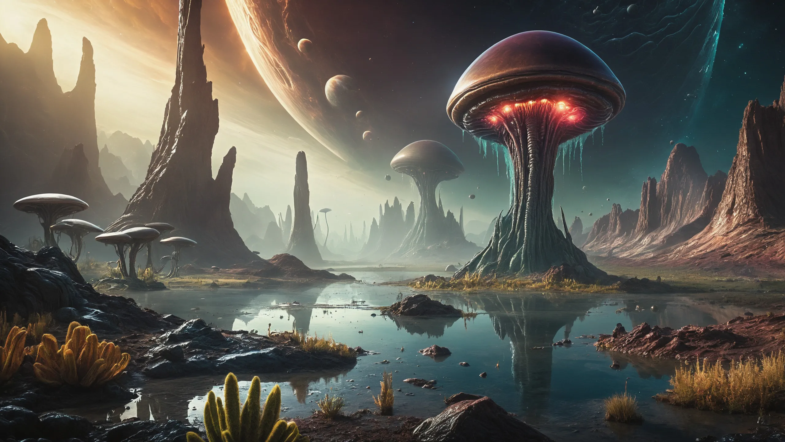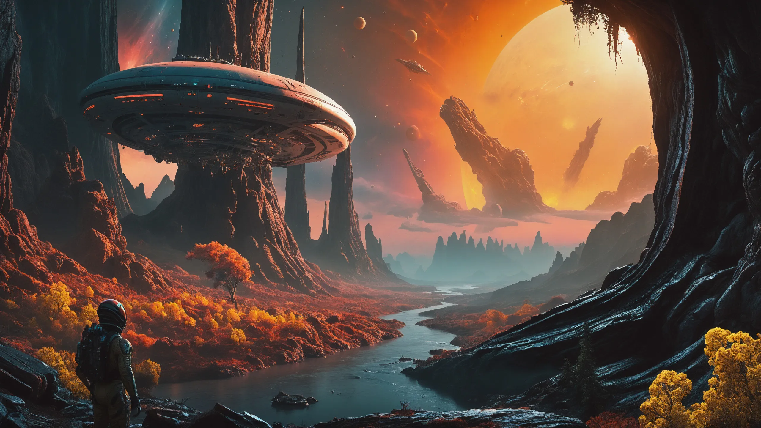 {Ice World|Diamond Plains|Bio-Luminescent Landscape|Mossy Meadows|Shifting Sands|Crystal Forests|Floating Islands|Acid Pools|Volcanic Plains|Perpetual Storms|Megastructures|Terraforming Projects|Methane Sea|Metallic Plains|tidelands|Seashore|beach|coast|cliff|lake|river|creek|djungle|grassland|flower|taiga|tundra|savannah|wetlands|desert|dunes|mangroves|salt flats|salt marshes|ice|majestic mountain|mountain|Swamp|marsh area|rain forests|badlands|wastelands} landsscape.