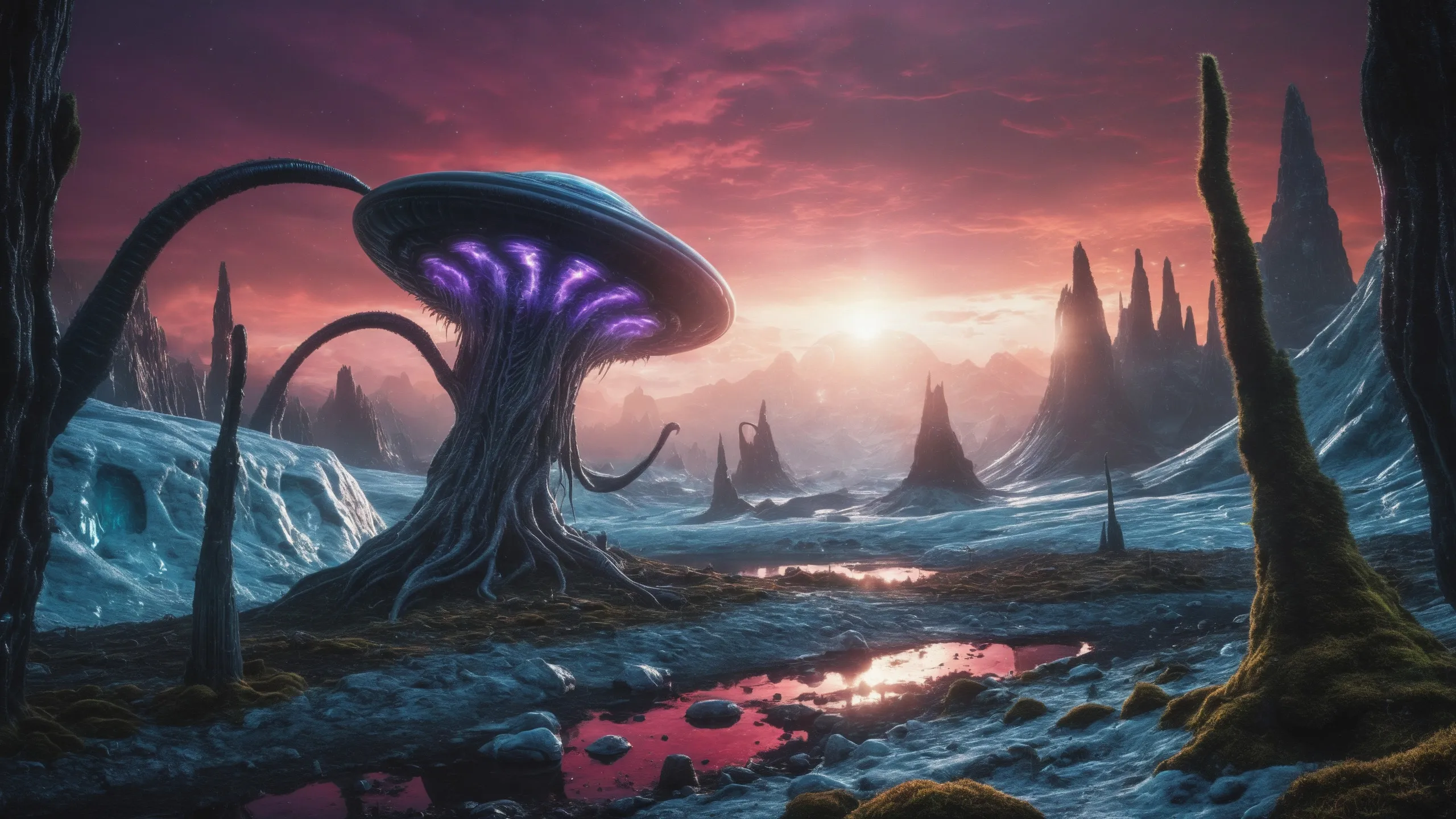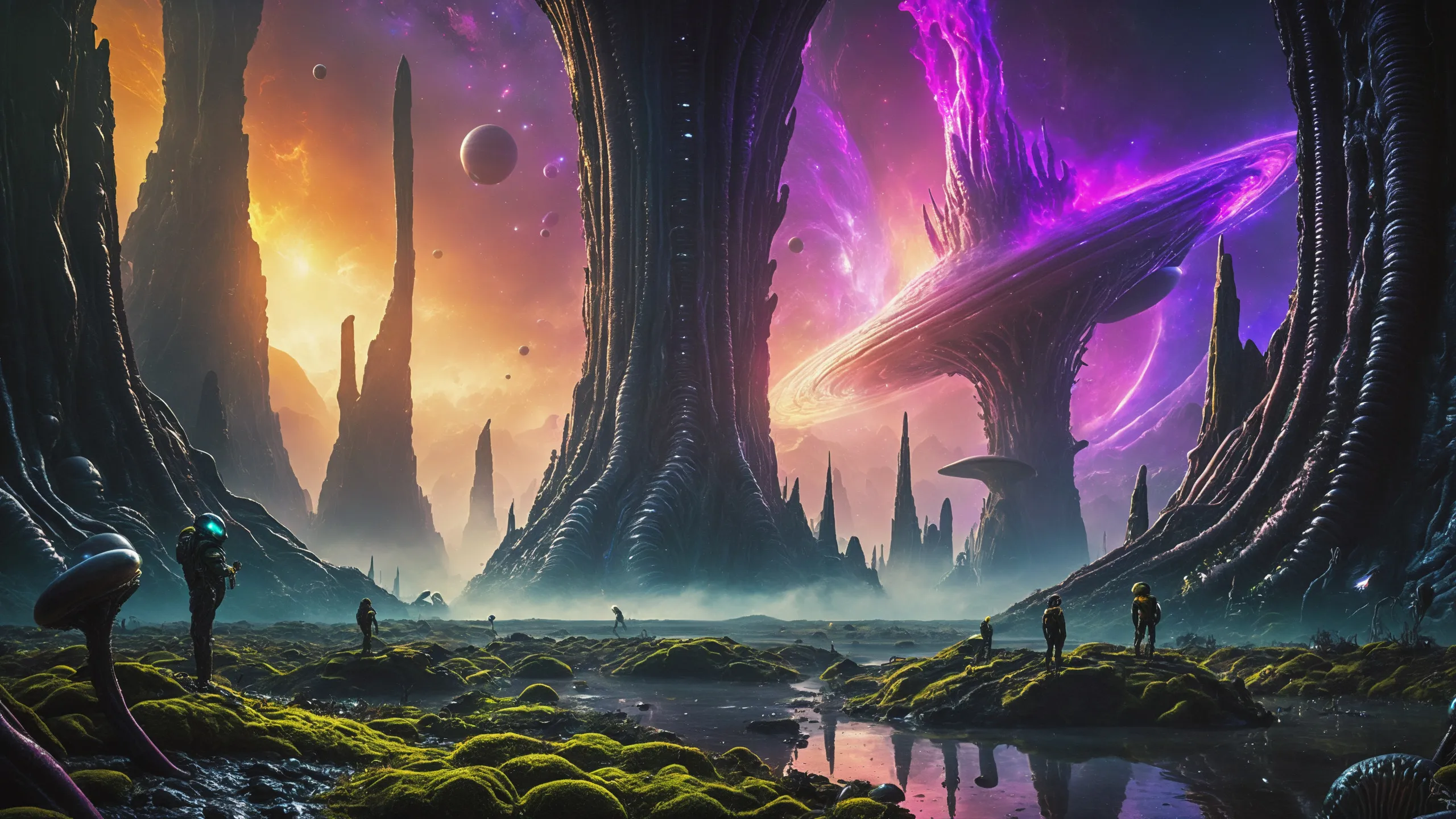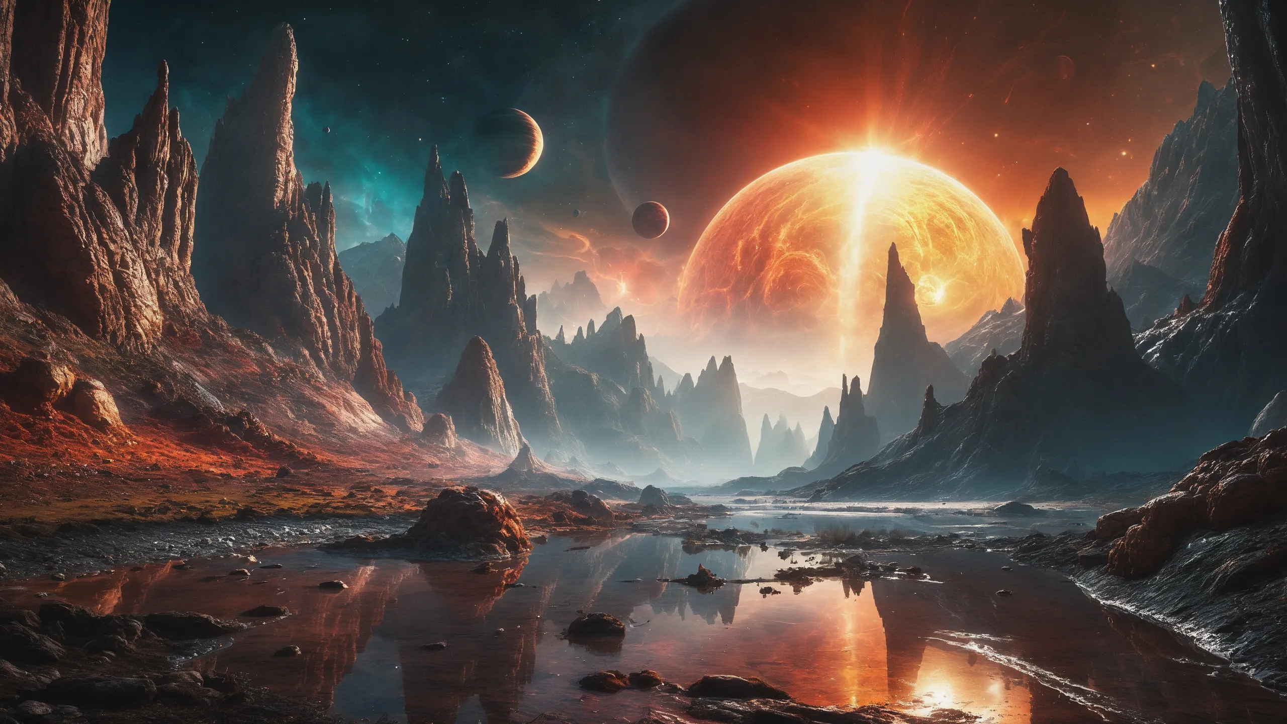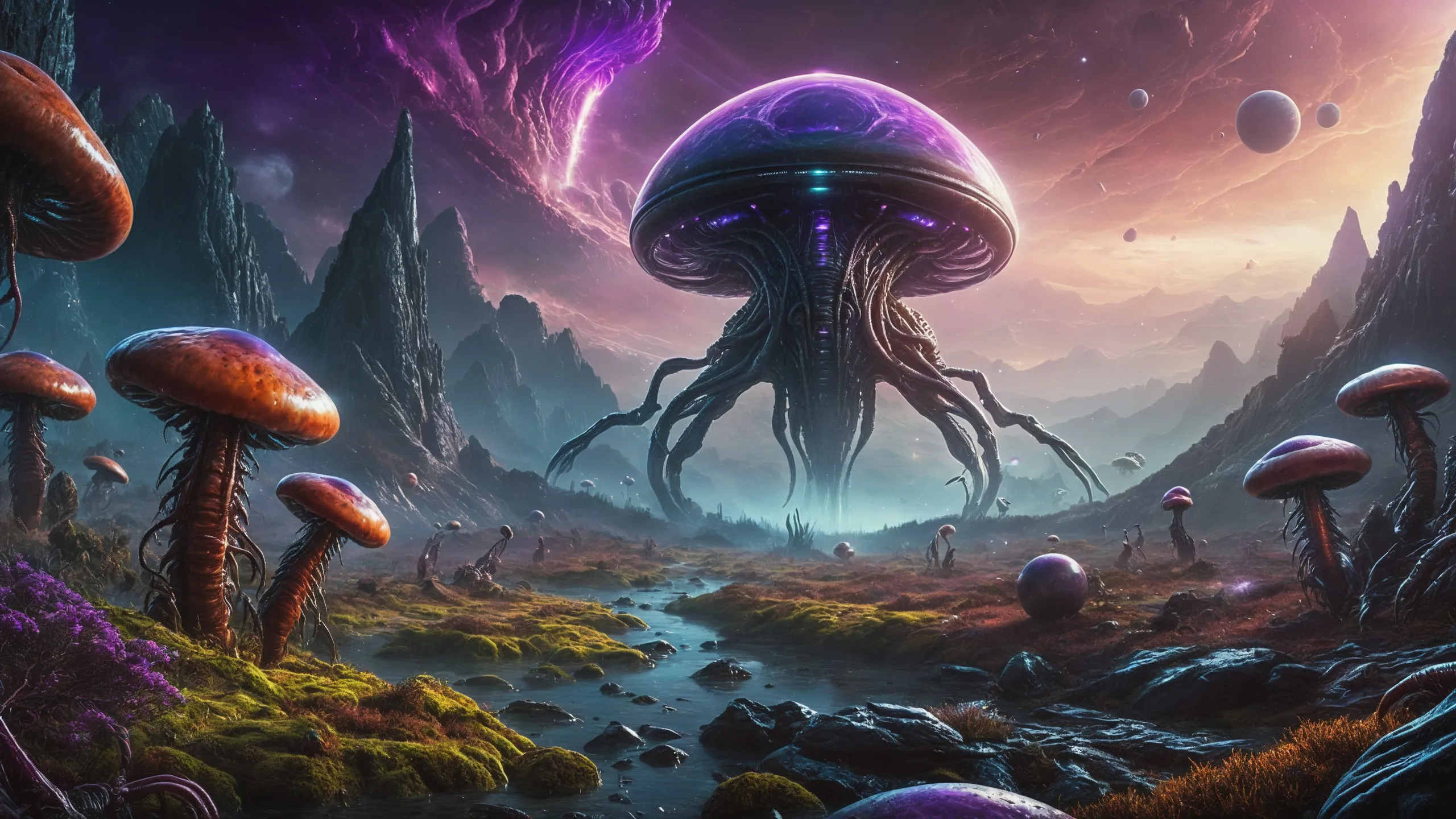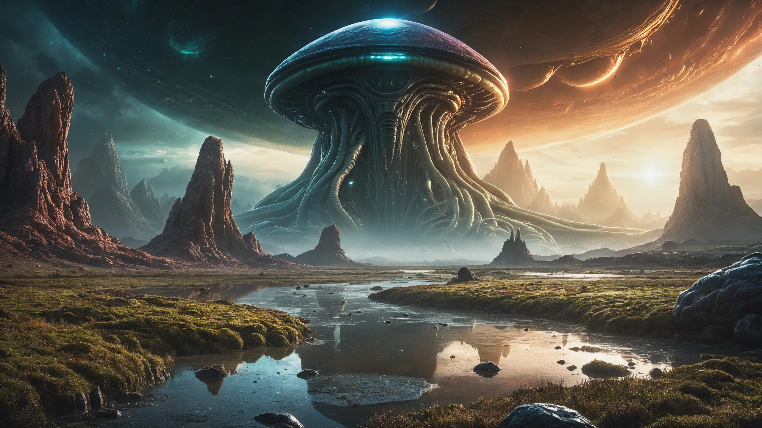 {Ice World|Diamond Plains|Bio-Luminescent Landscape|Mossy Meadows|Shifting Sands|Crystal Forests|Floating Islands|Acid Pools|Volcanic Plains|Perpetual Storms|Megastructures|Terraforming Projects|Methane Sea|Metallic Plains|tidelands|Seashore|beach|coast|cliff|lake|river|creek|djungle|grassland|flower|taiga|tundra|savannah|wetlands|desert|dunes|mangroves|salt flats|salt marshes|ice|majestic mountain|mountain|Swamp|marsh area|rain forests|badlands|wastelands} landsscape.