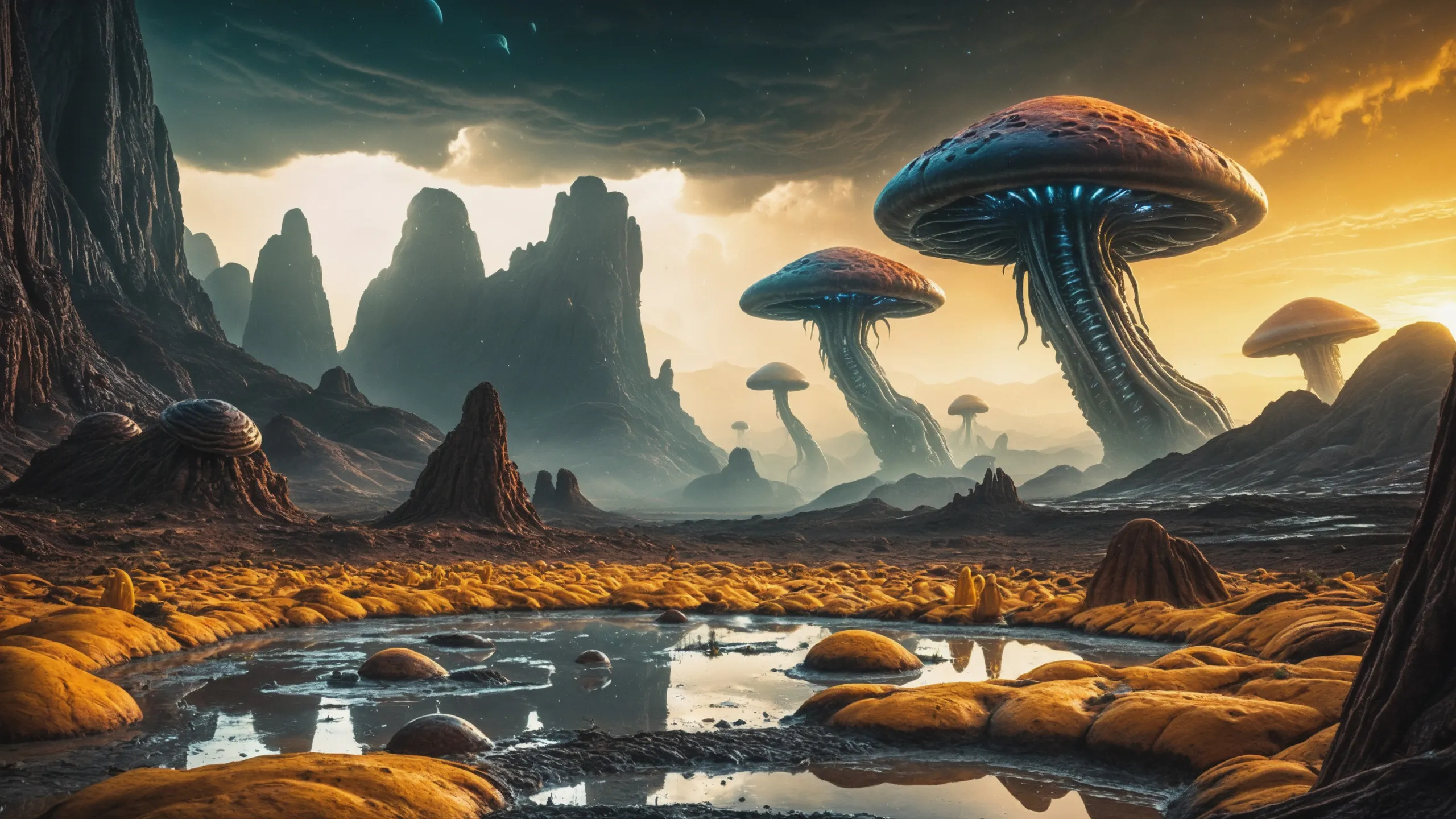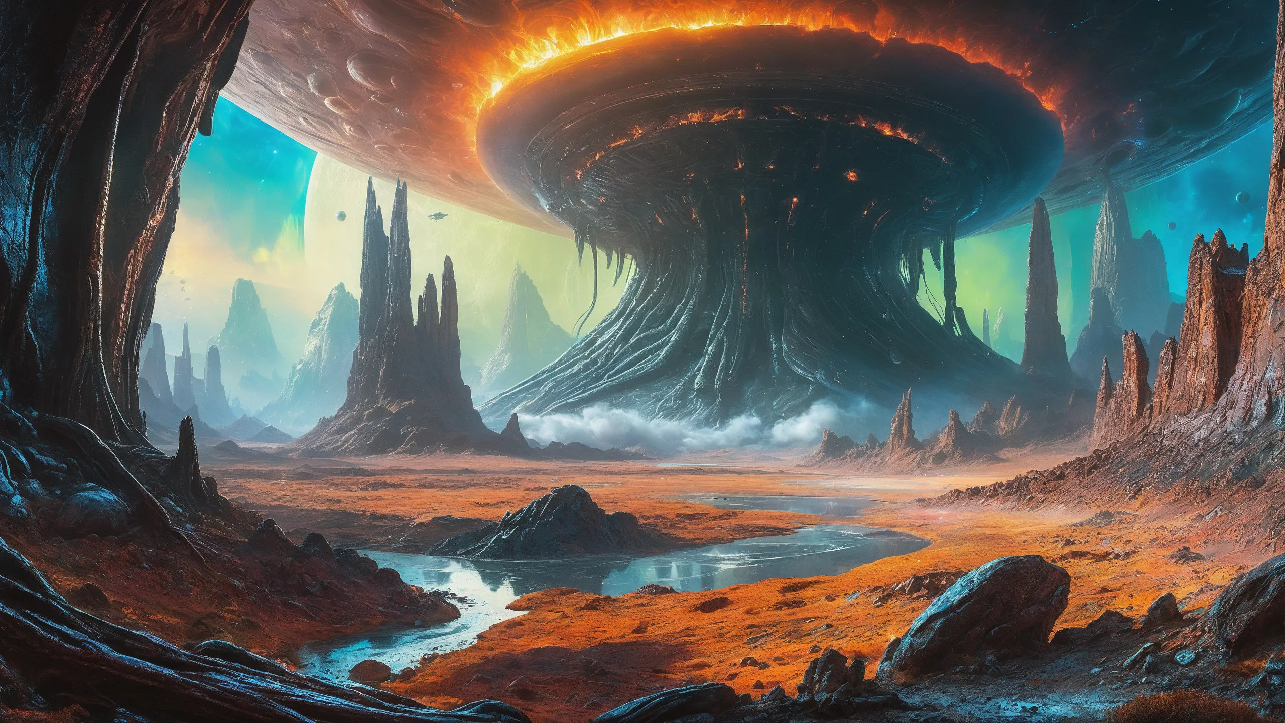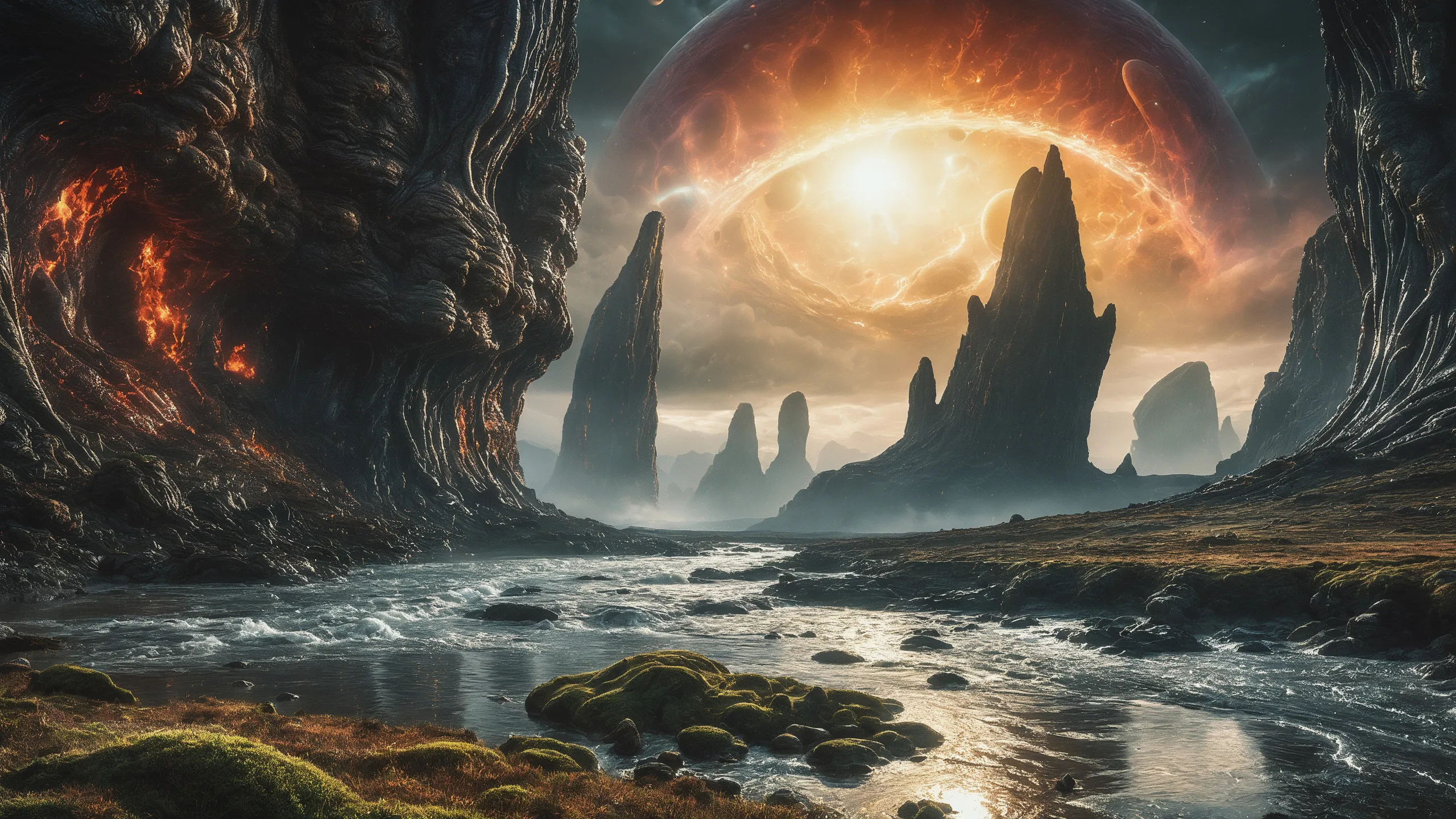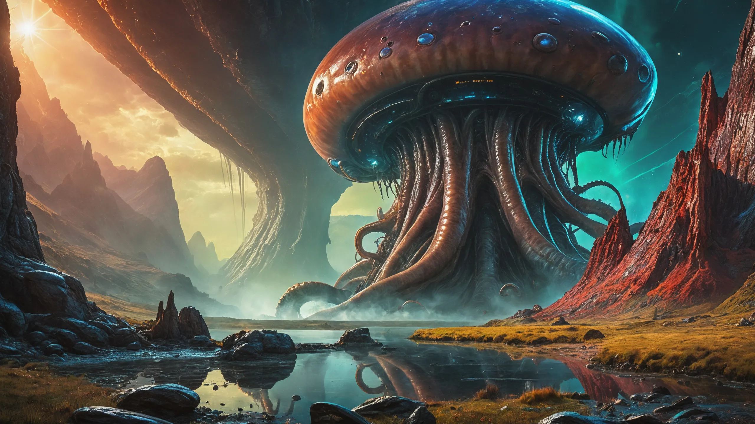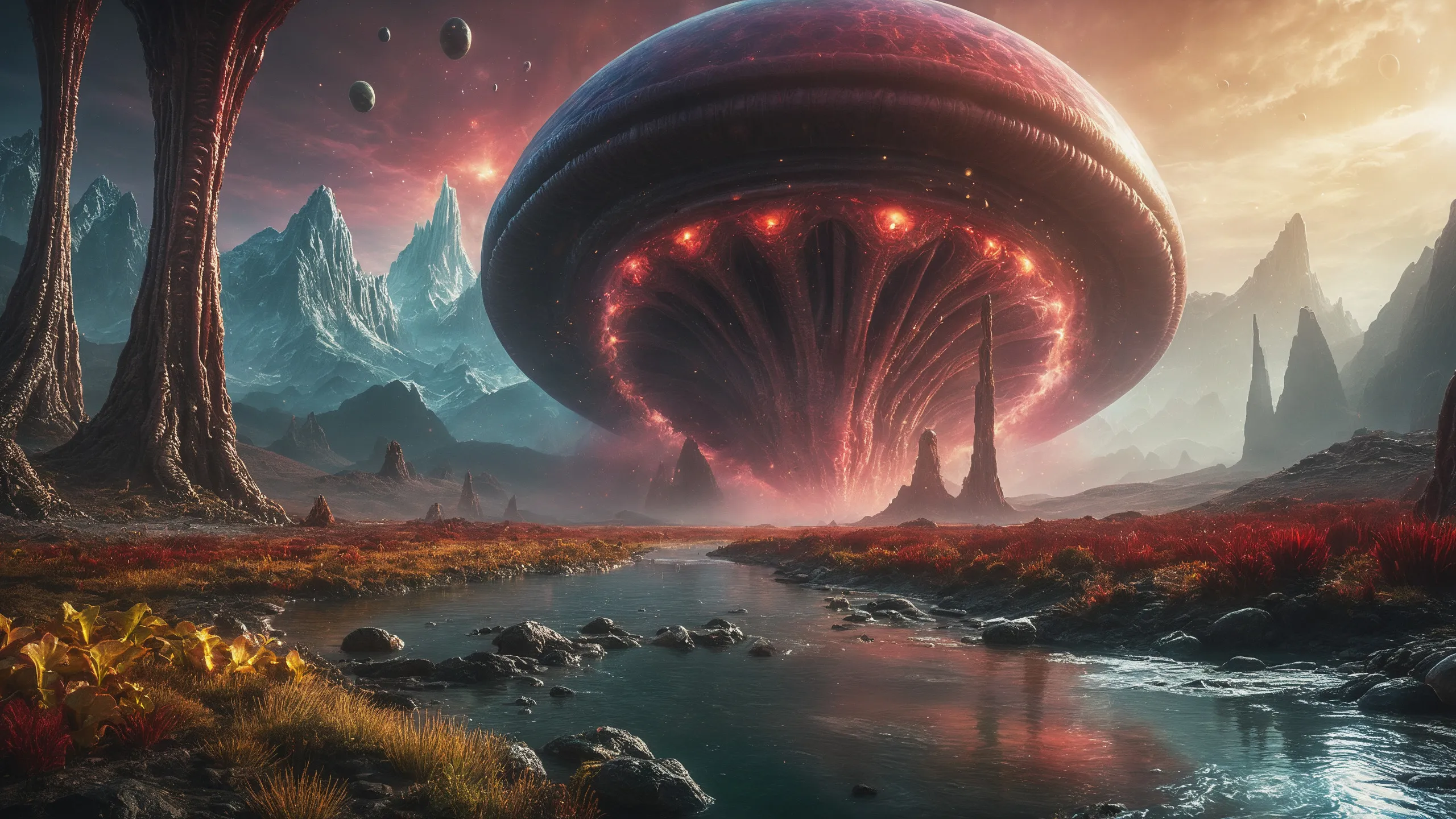 {Ice World|Diamond Plains|Bio-Luminescent Landscape|Mossy Meadows|Shifting Sands|Crystal Forests|Floating Islands|Acid Pools|Volcanic Plains|Perpetual Storms|Megastructures|Terraforming Projects|Methane Sea|Metallic Plains|tidelands|Seashore|beach|coast|cliff|lake|river|creek|djungle|grassland|flower|taiga|tundra|savannah|wetlands|desert|dunes|mangroves|salt flats|salt marshes|ice|majestic mountain|mountain|Swamp|marsh area|rain forests|badlands|wastelands} landsscape.