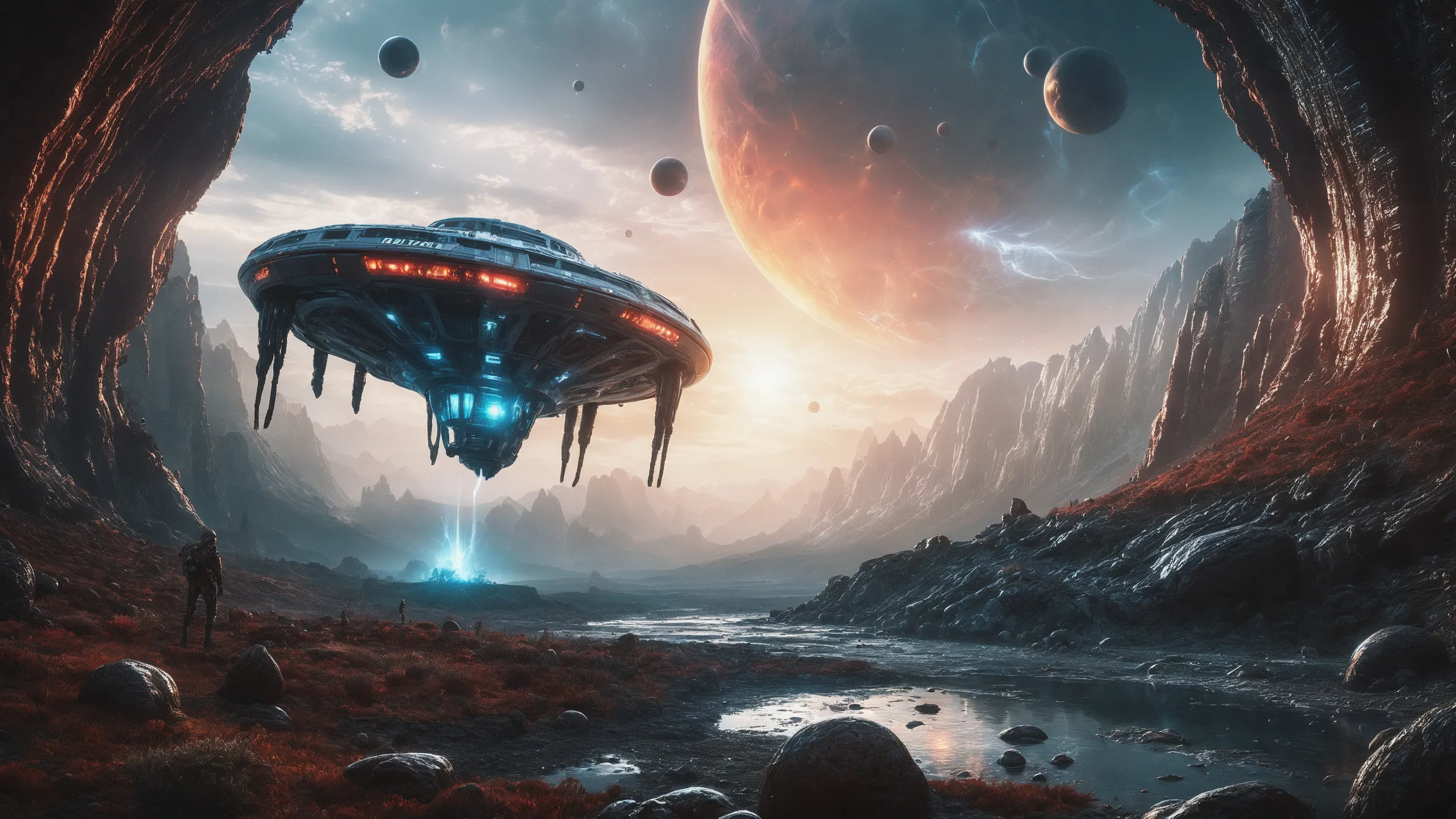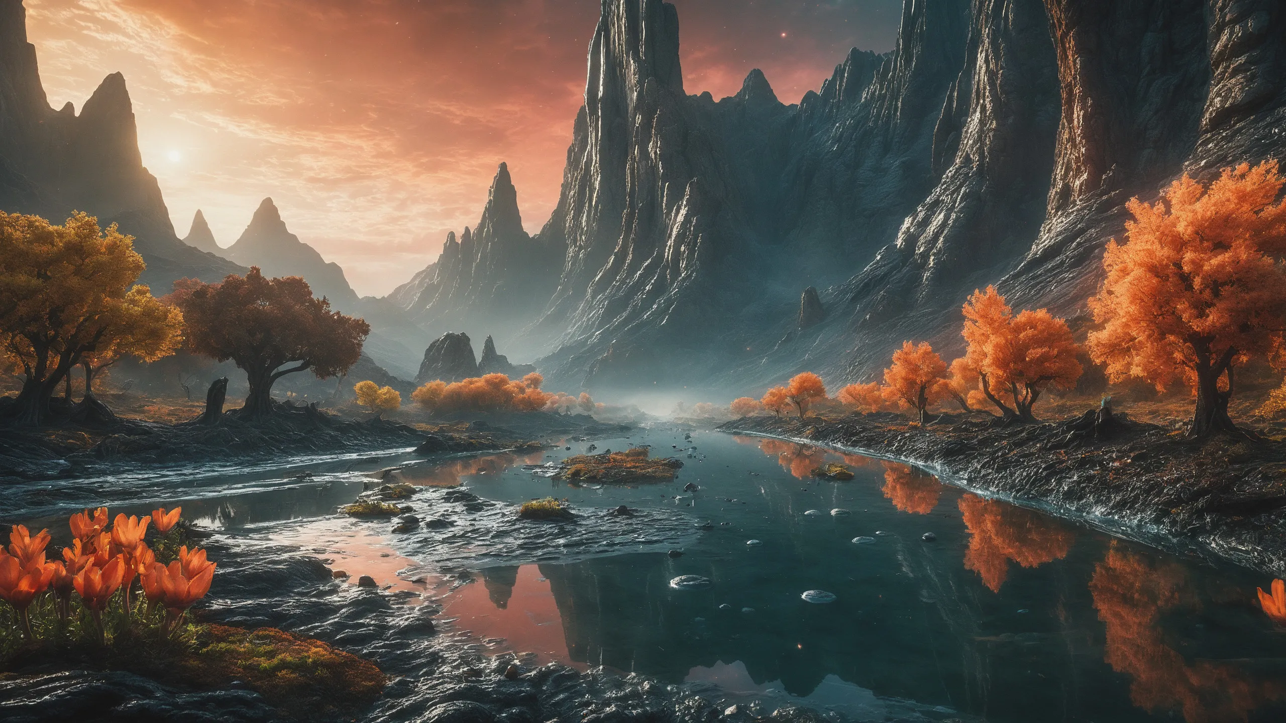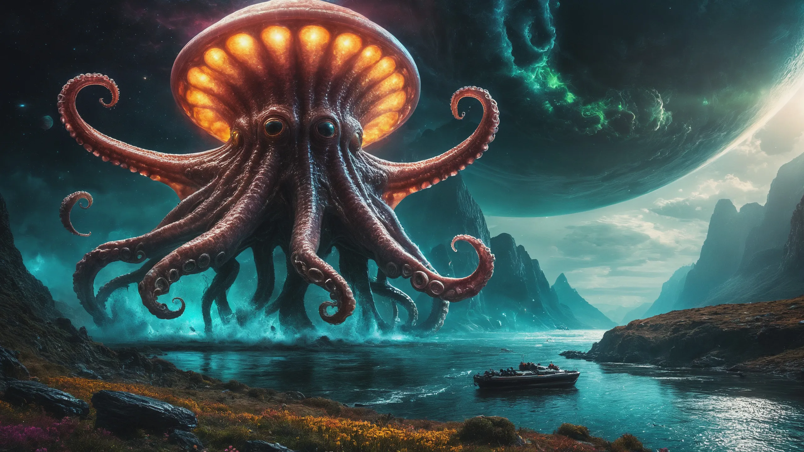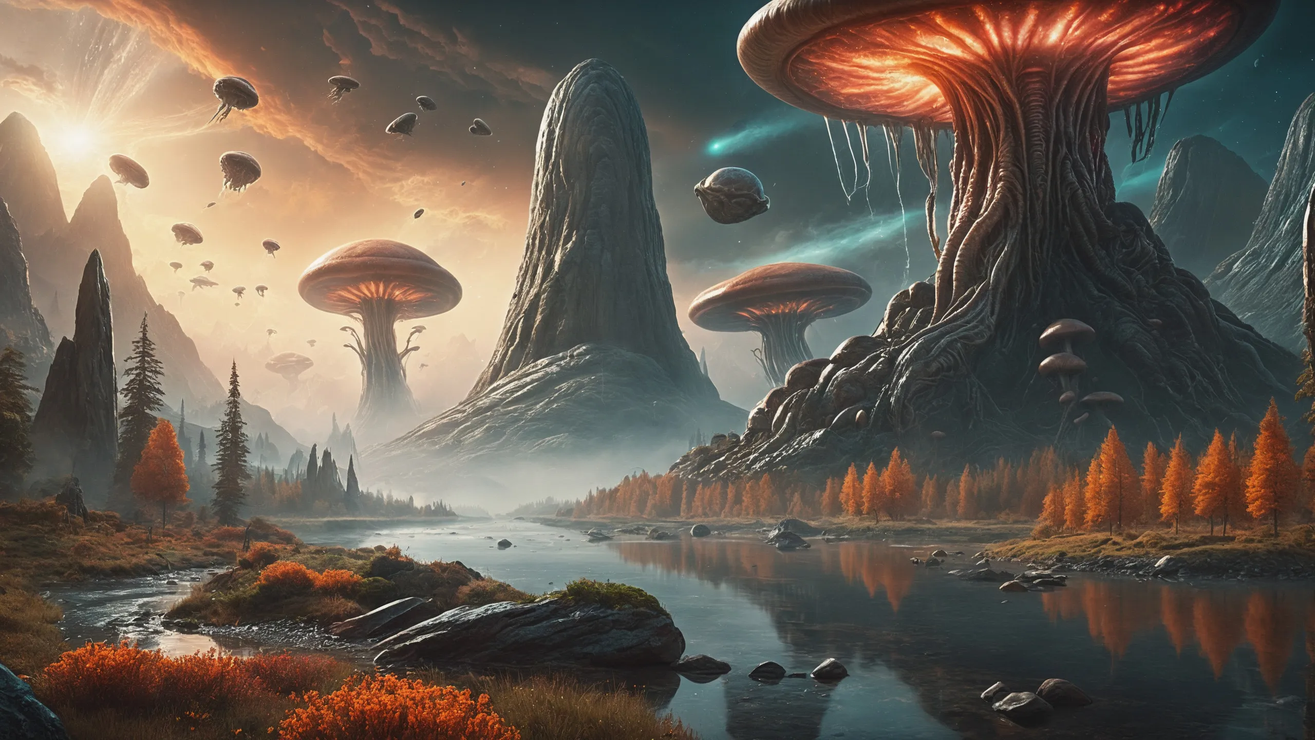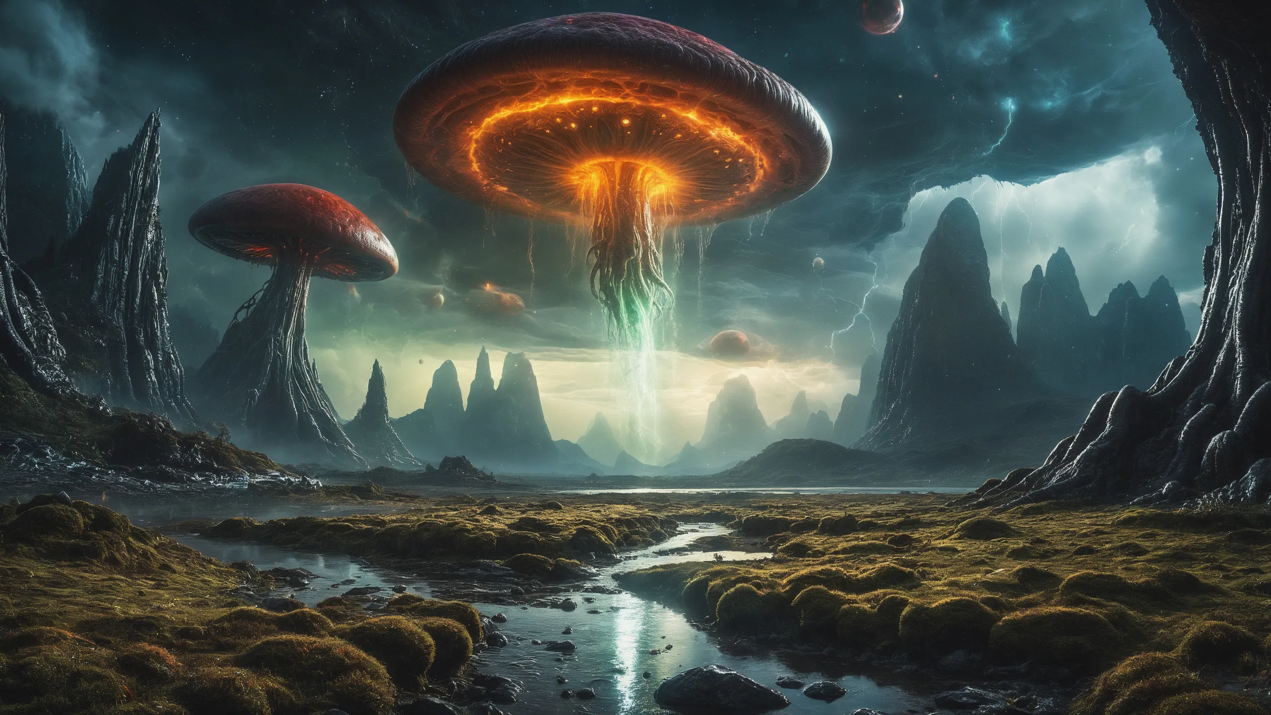 {Ice World|Diamond Plains|Bio-Luminescent Landscape|Mossy Meadows|Shifting Sands|Crystal Forests|Floating Islands|Acid Pools|Volcanic Plains|Perpetual Storms|Megastructures|Terraforming Projects|Methane Sea|Metallic Plains|tidelands|Seashore|beach|coast|cliff|lake|river|creek|djungle|grassland|flower|taiga|tundra|savannah|wetlands|desert|dunes|mangroves|salt flats|salt marshes|ice|majestic mountain|mountain|Swamp|marsh area|rain forests|badlands|wastelands} landsscape.