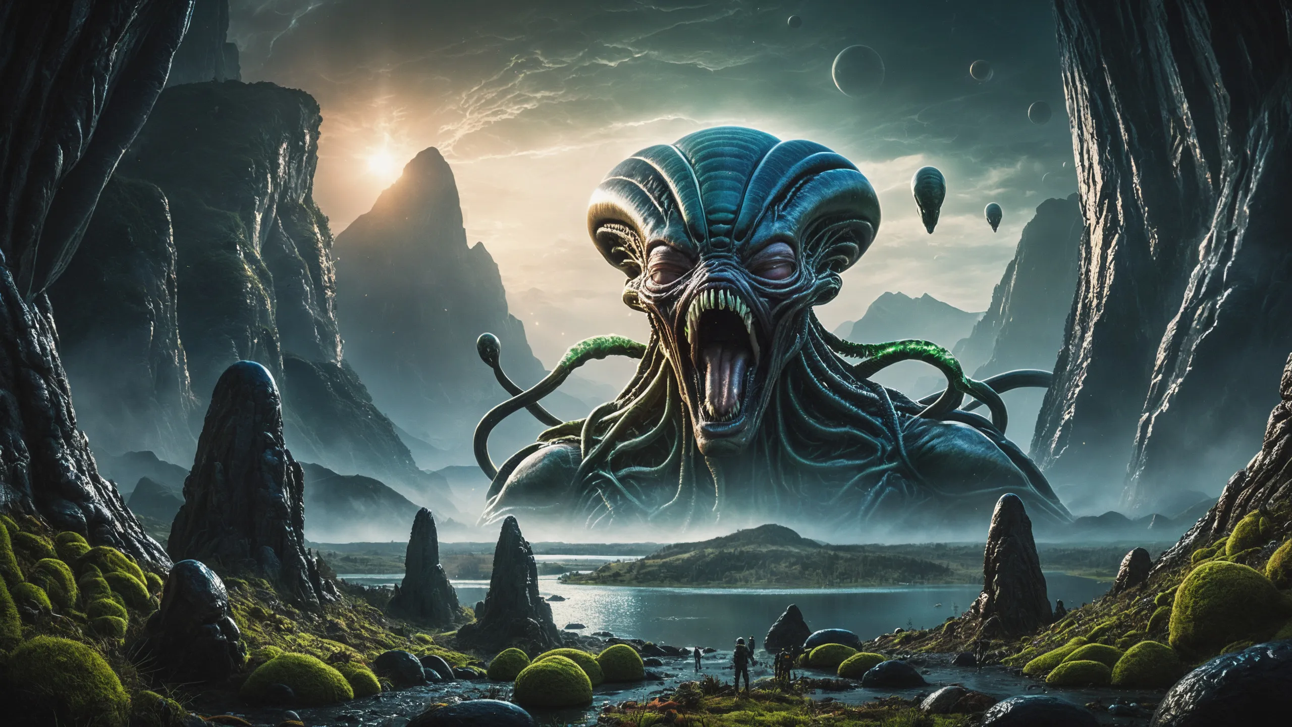 # {0.1::(large alien city:1.5), |0.1::(village with alien creatures:1.5), |0.1::(some alien creatures:1.5), |0.1::(a large alien creature :1.5), |0.6::}