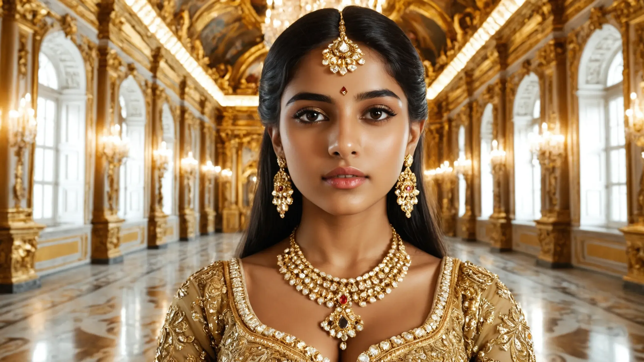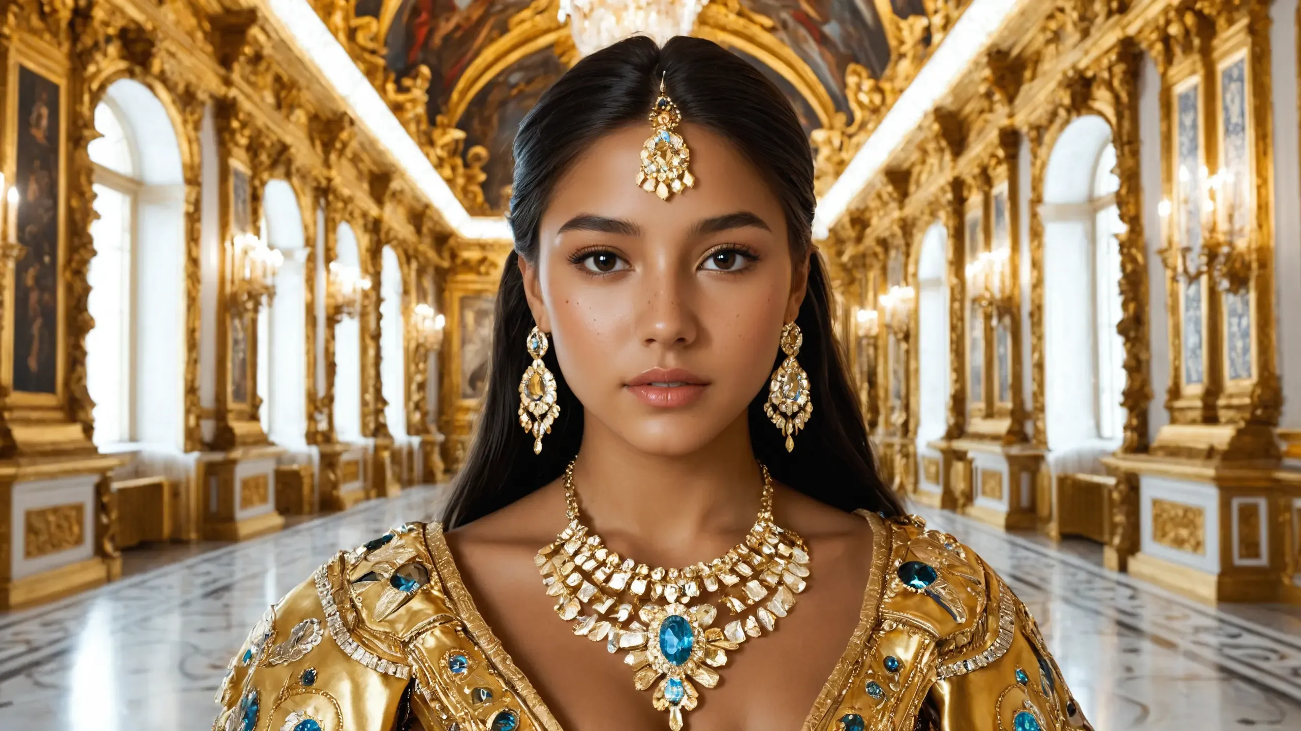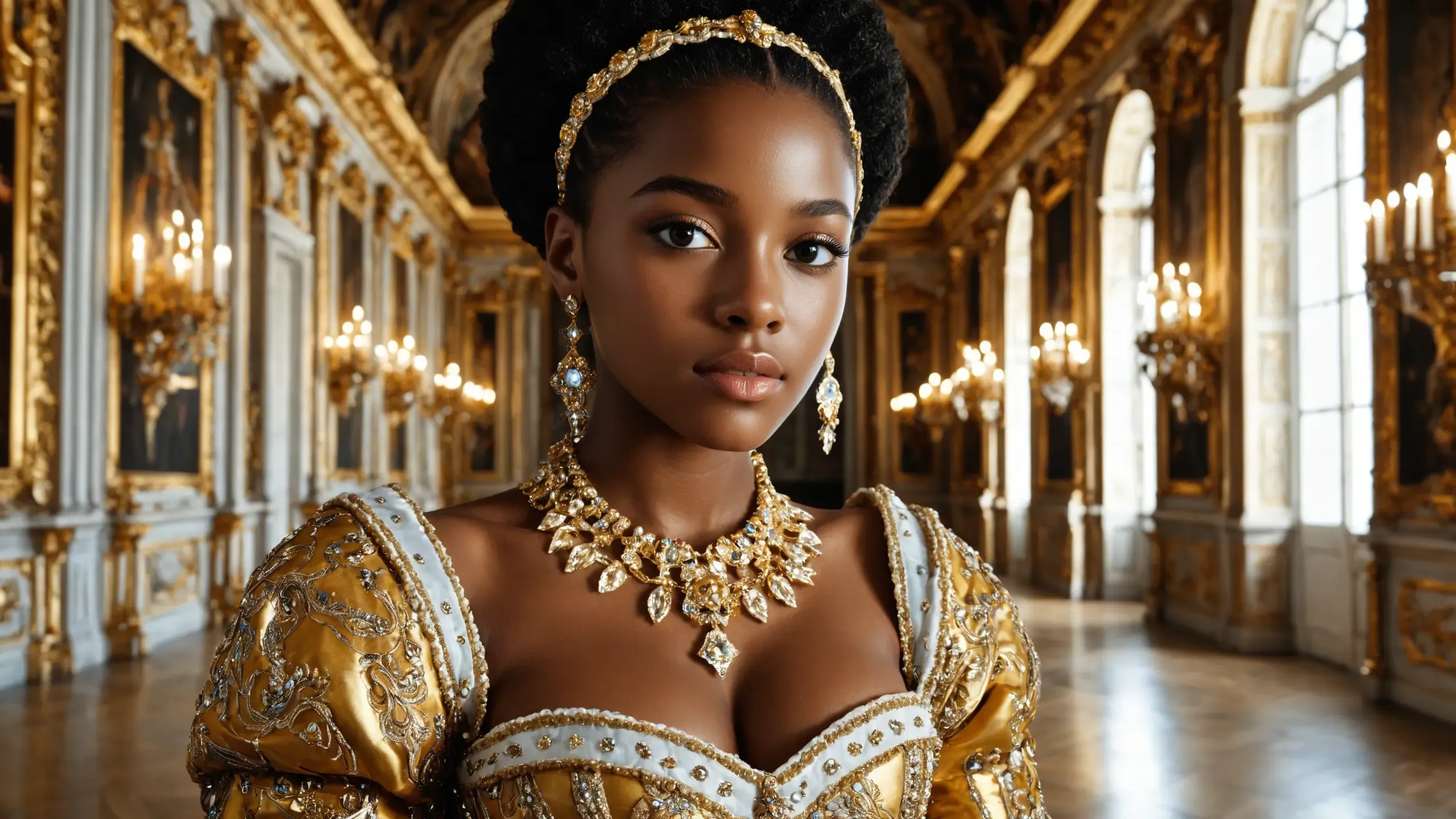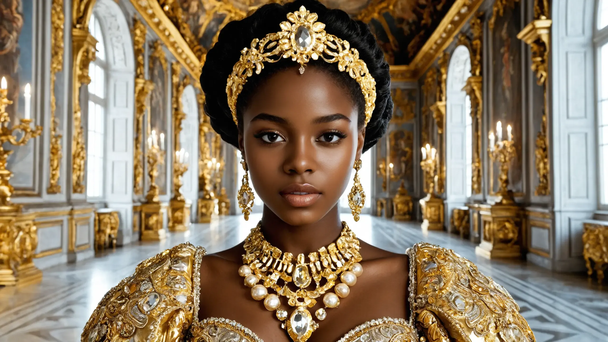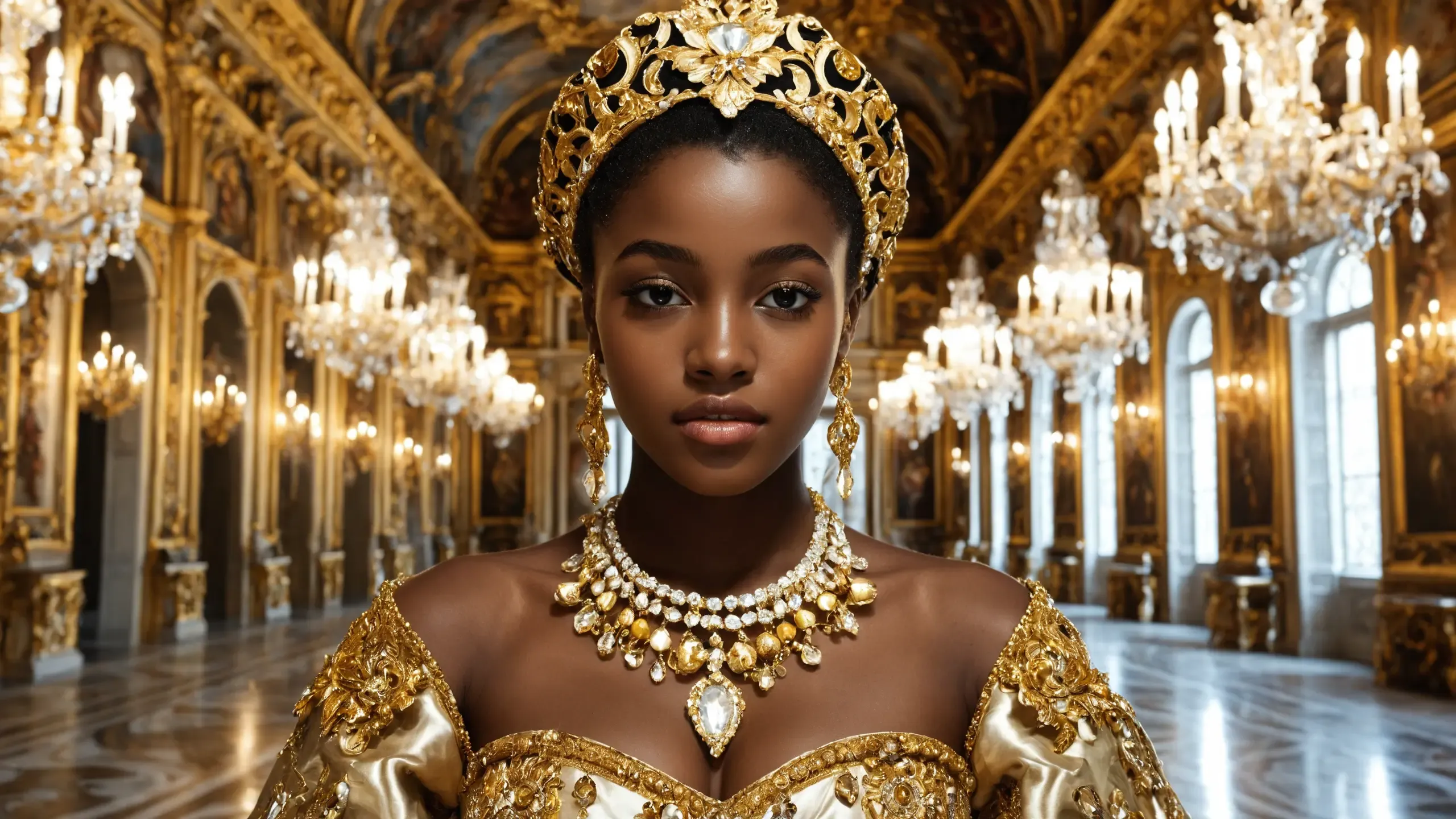 Baroque, Close up photo of a beautiful 18 year old {0.2::black, African|0.1::Indian|0.2::Asian|0.1::Native American|0.4::} girl, alone in in a huge hall, full of gold, silver and mirrors of a baroque palace. Everything is brightly lit.
