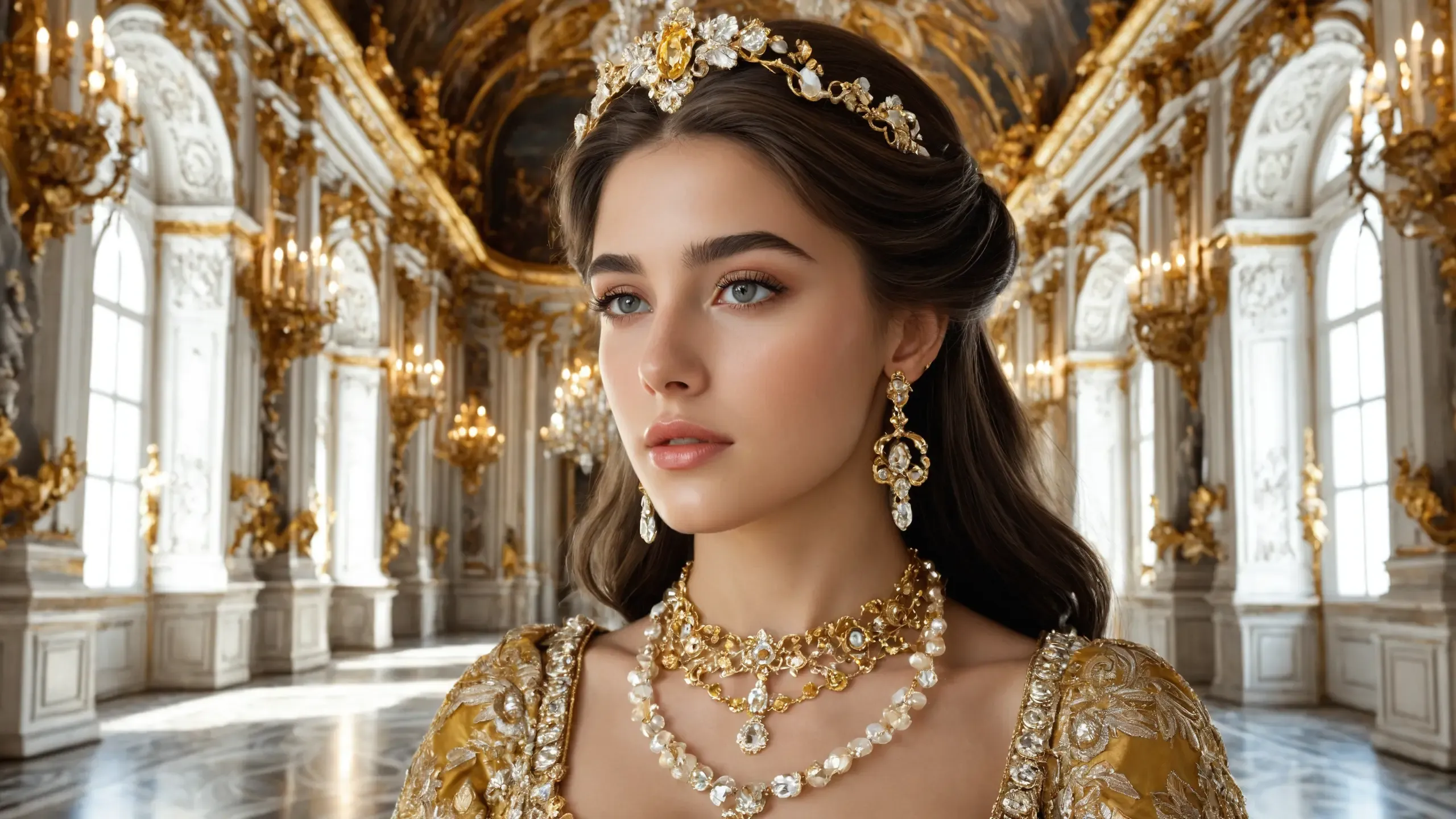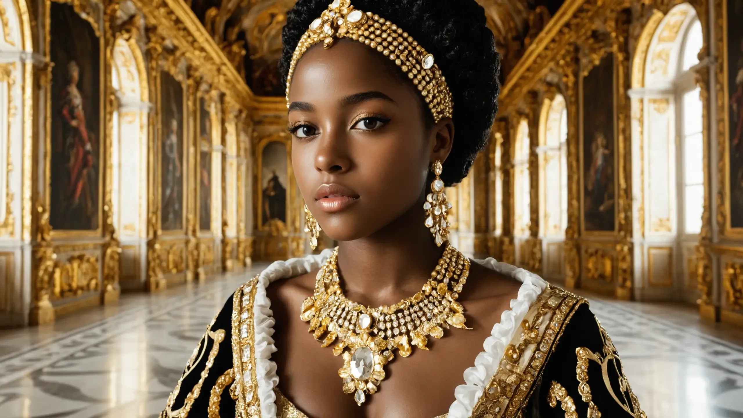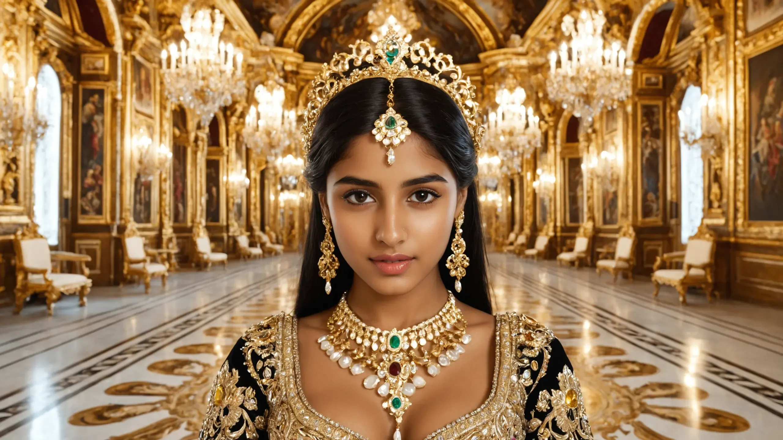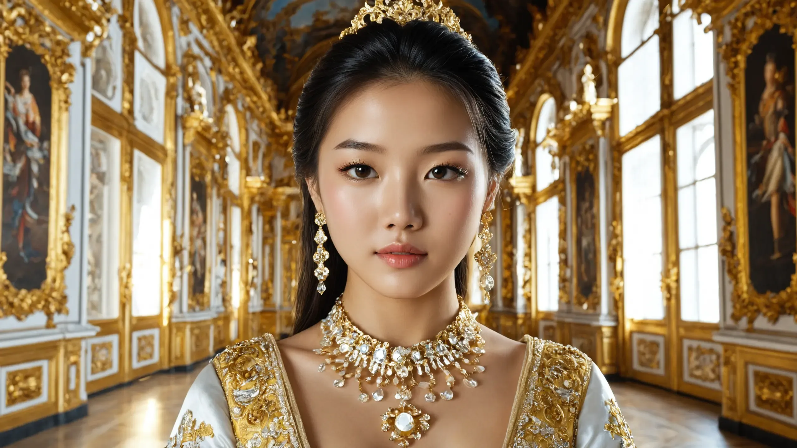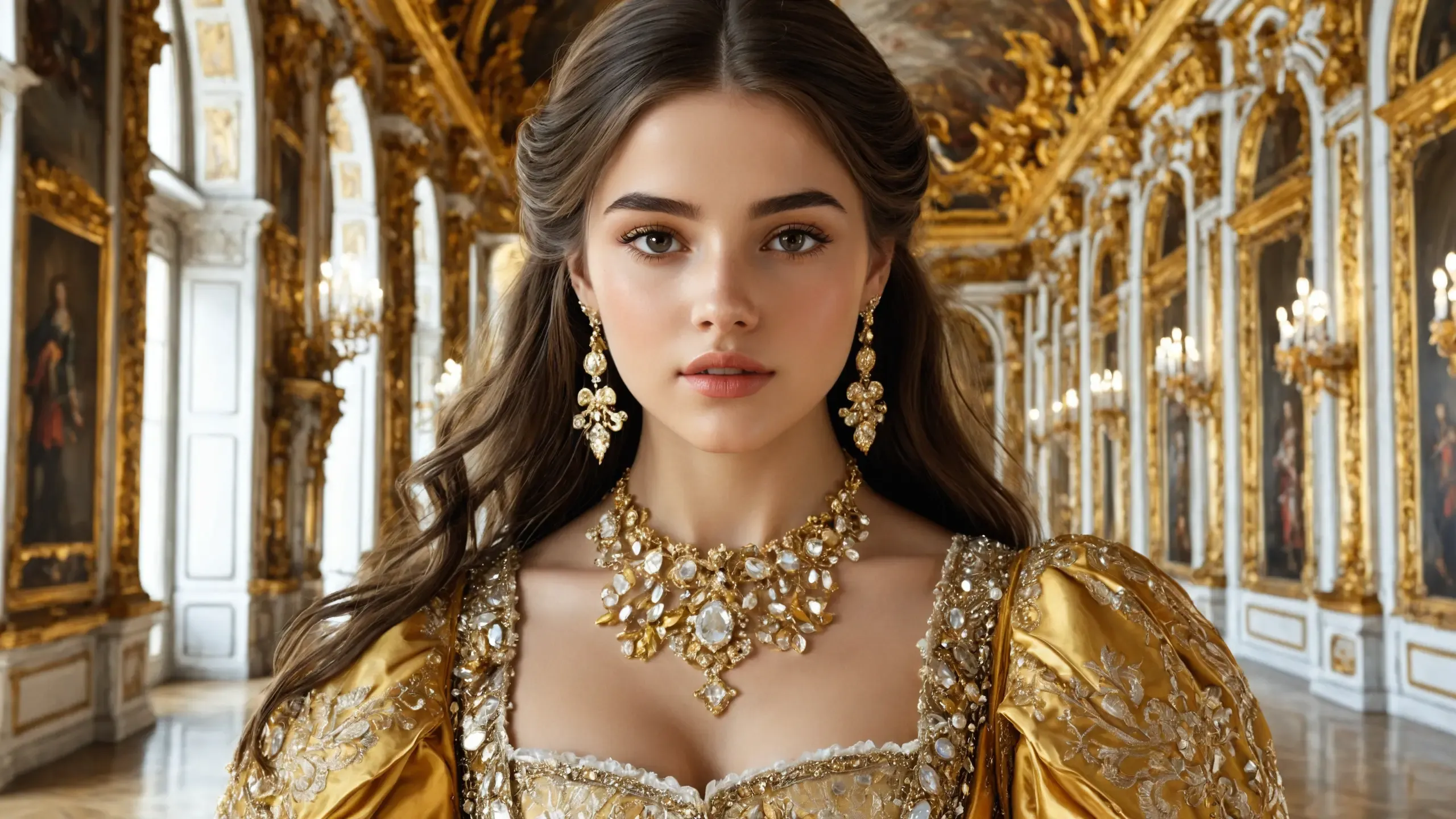 Baroque, Close up photo of a beautiful 18 year old {0.2::black, African|0.1::Indian|0.2::Asian|0.1::Native American|0.4::} girl, alone in in a huge hall, full of gold, silver and mirrors of a baroque palace. Everything is brightly lit.