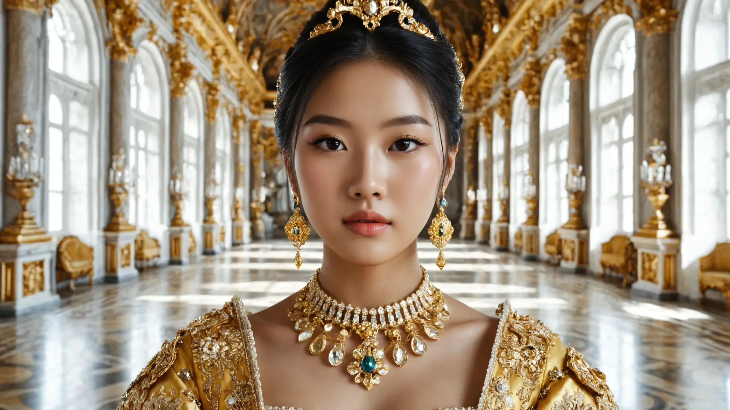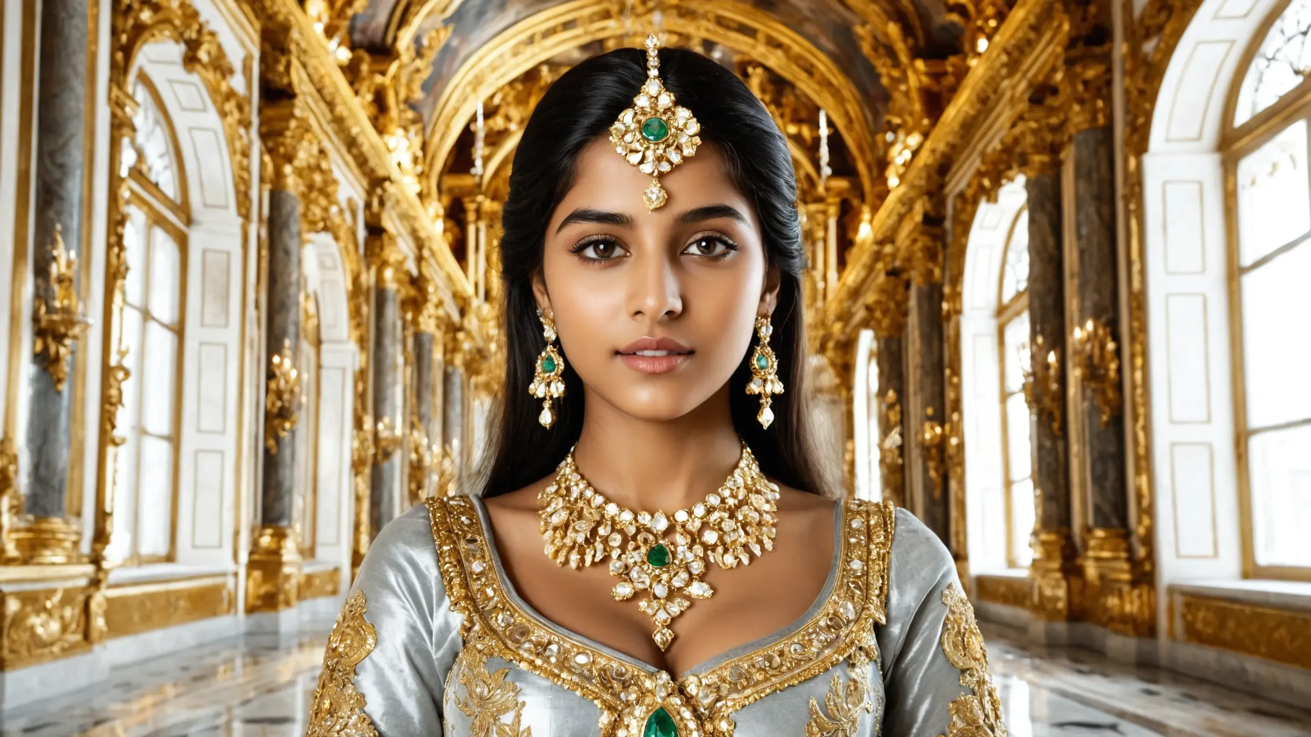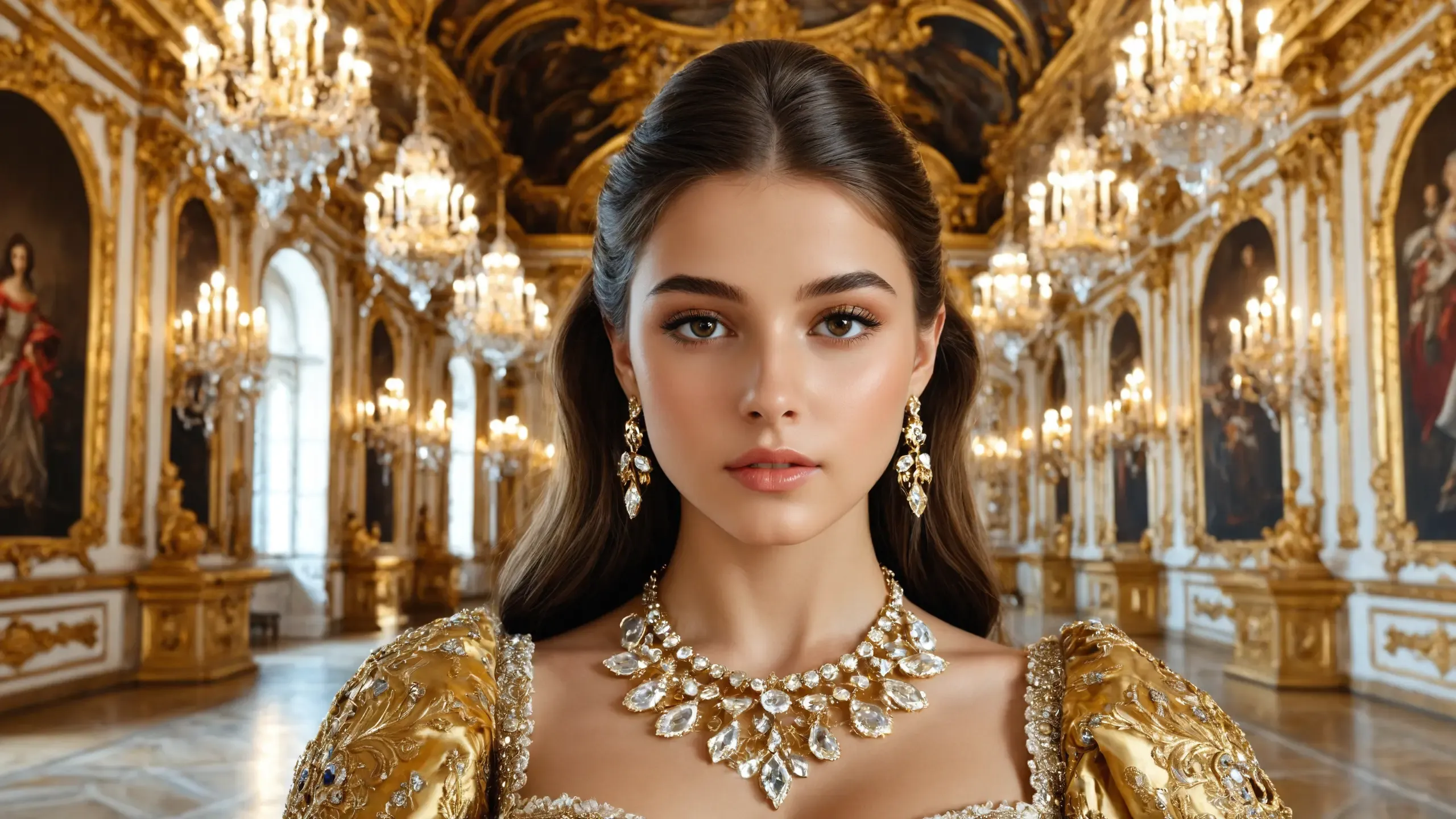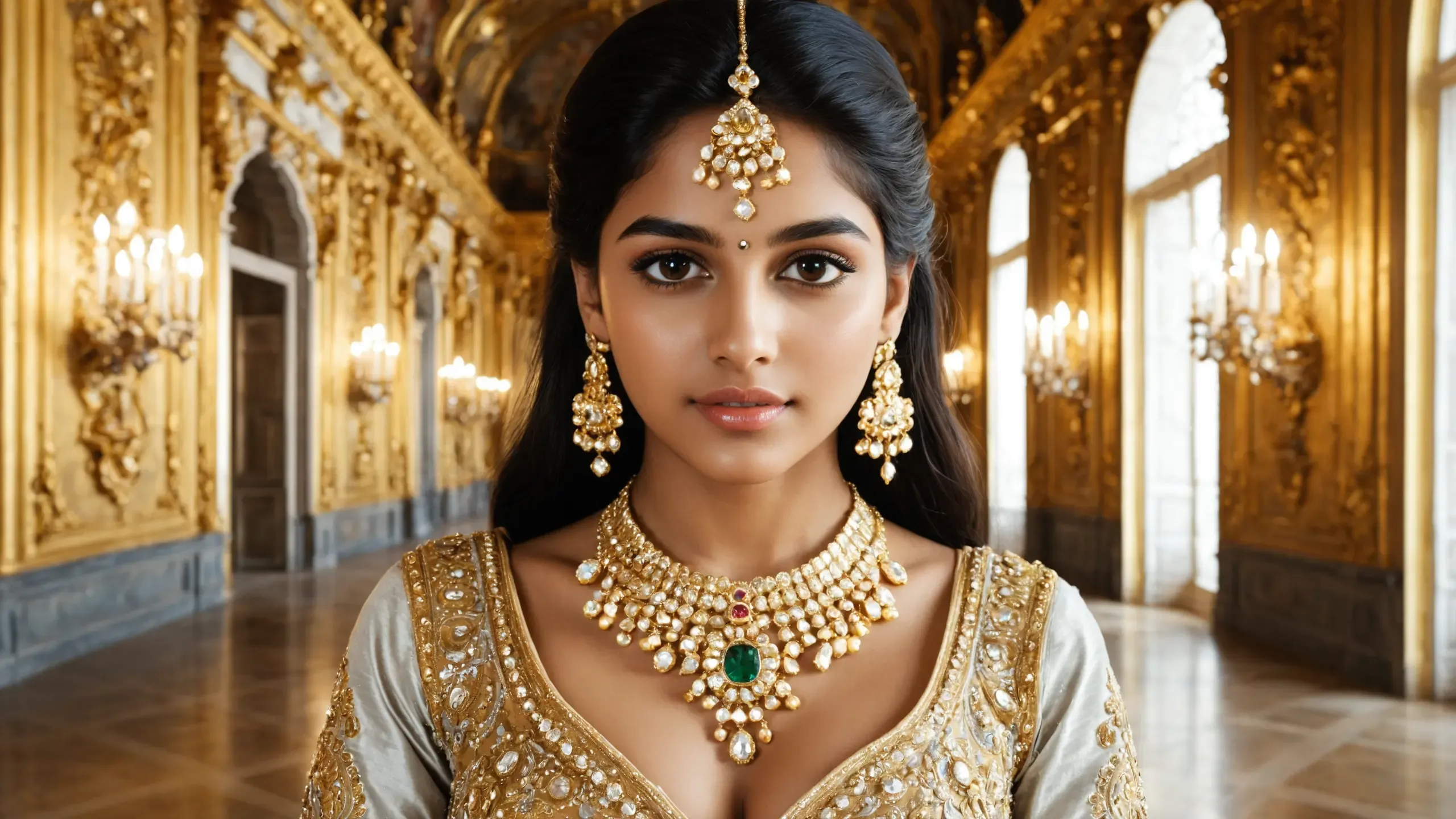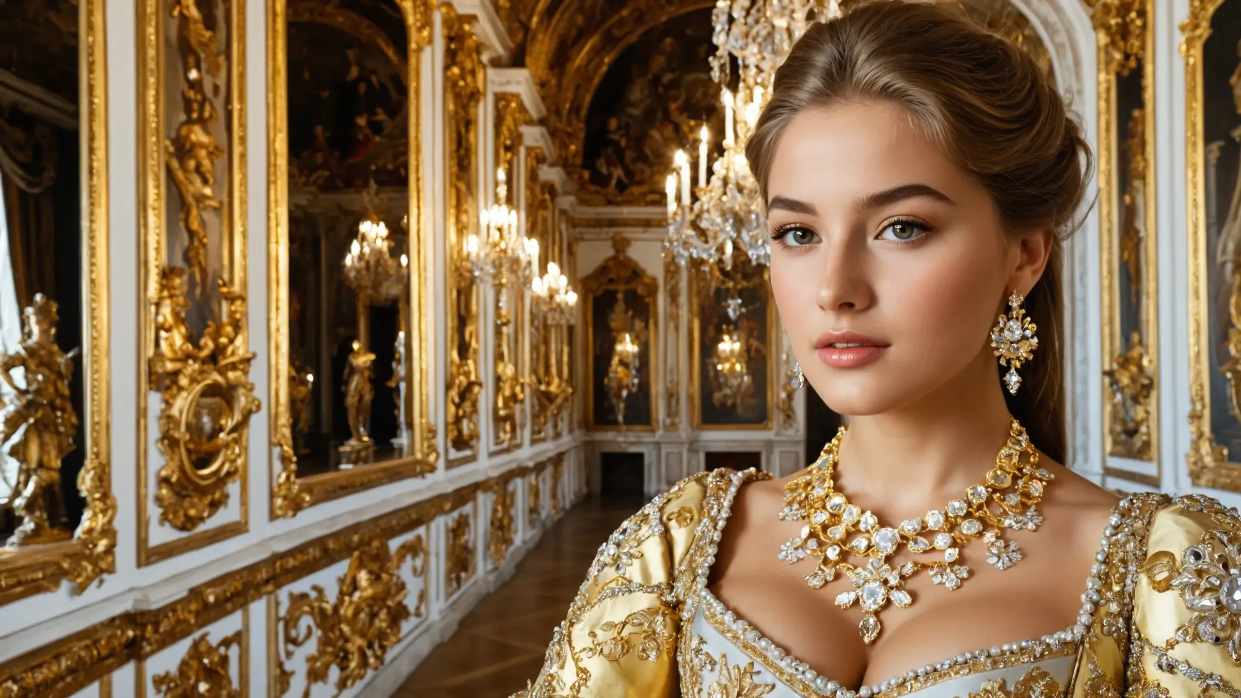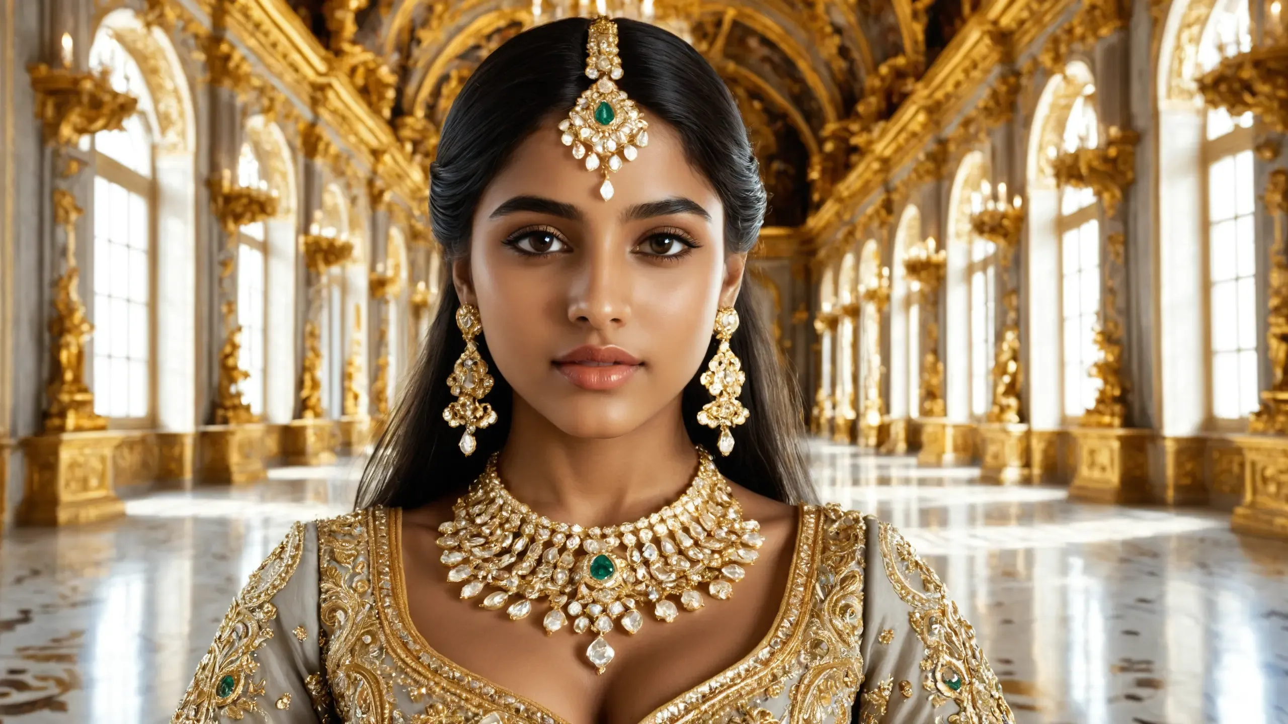 Baroque, Close up photo of a beautiful 18 year old {0.2::black, African|0.1::Indian|0.2::Asian|0.1::Native American|0.4::} girl, alone in in a huge hall, full of gold, silver and mirrors of a baroque palace. Everything is brightly lit.