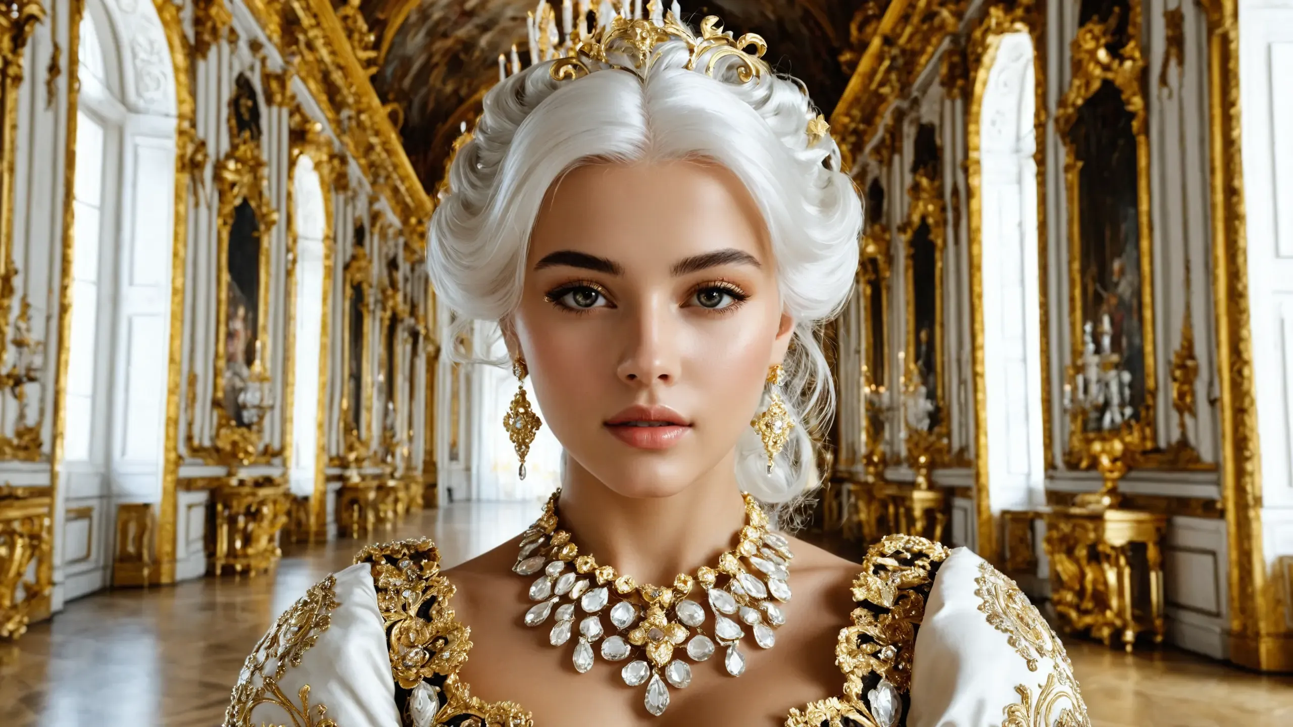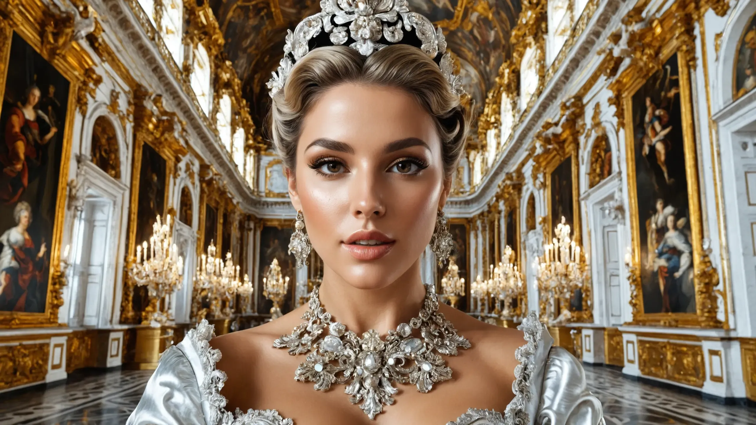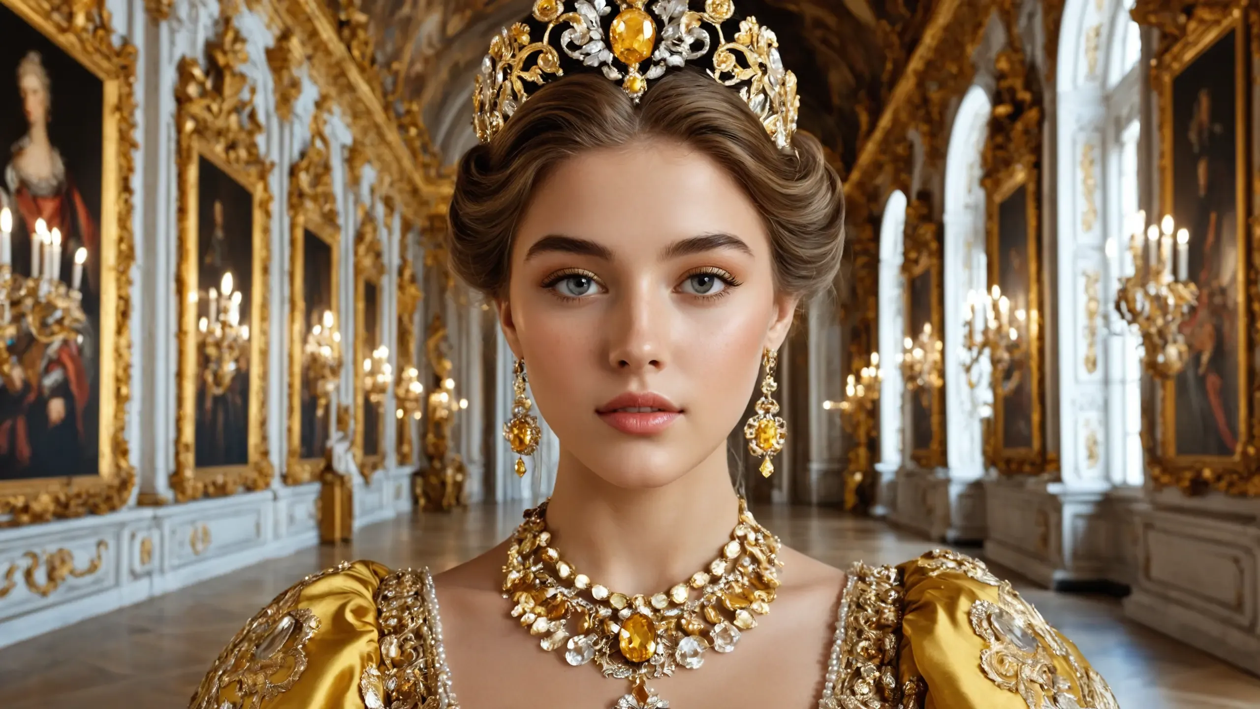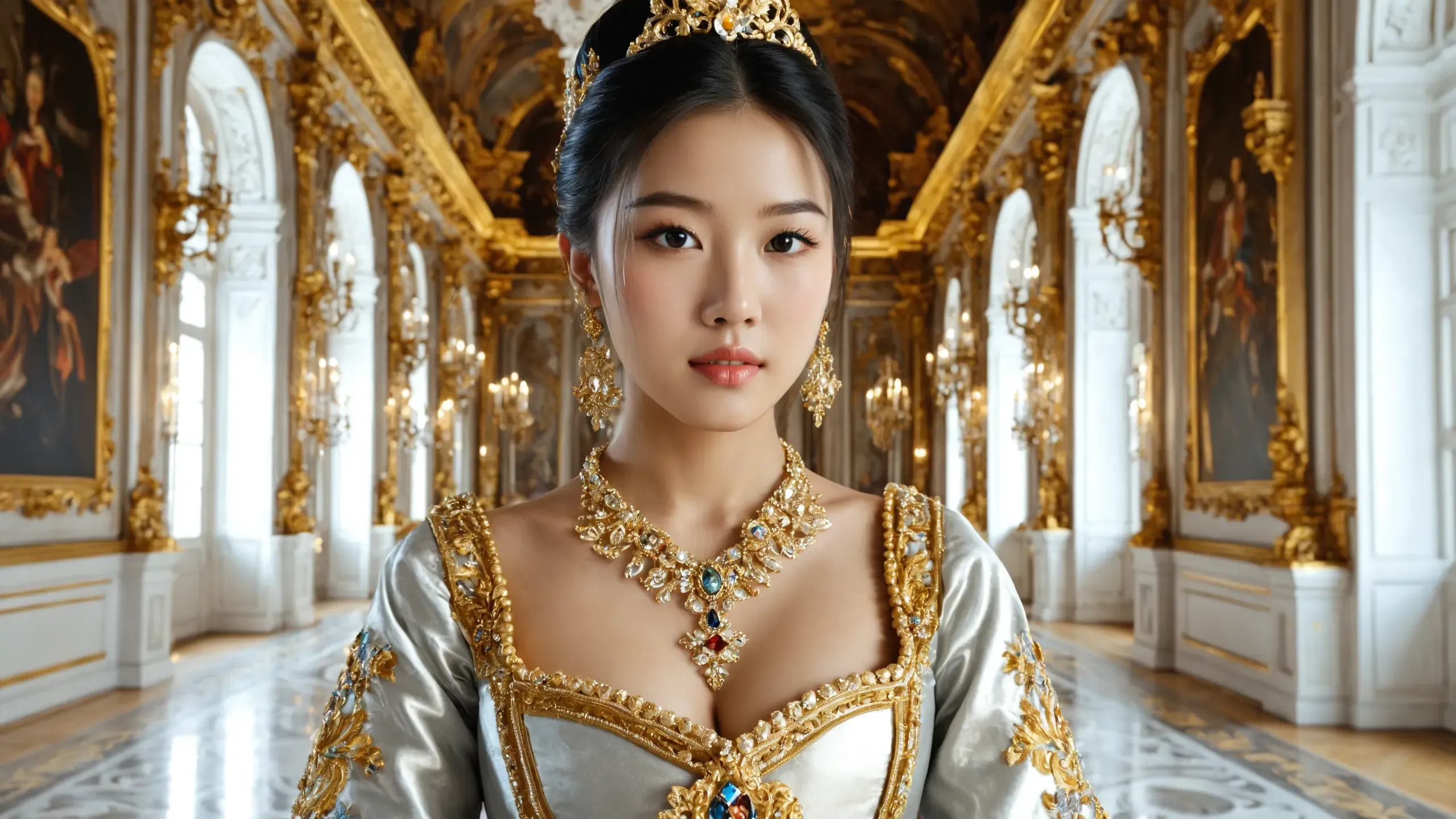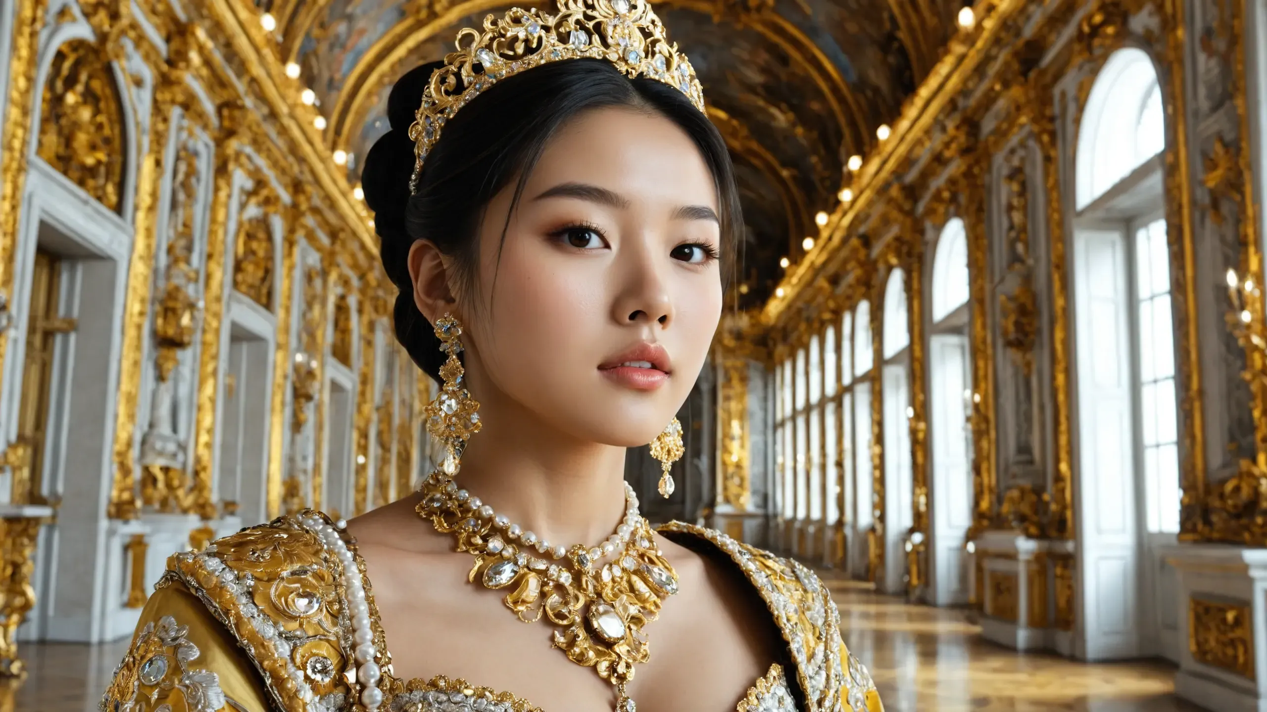 Baroque, Close up photo of a beautiful 18 year old {0.2::black, African|0.1::Indian|0.2::Asian|0.1::Native American|0.4::} girl, alone in in a huge hall, full of gold, silver and mirrors of a baroque palace. Everything is brightly lit.
