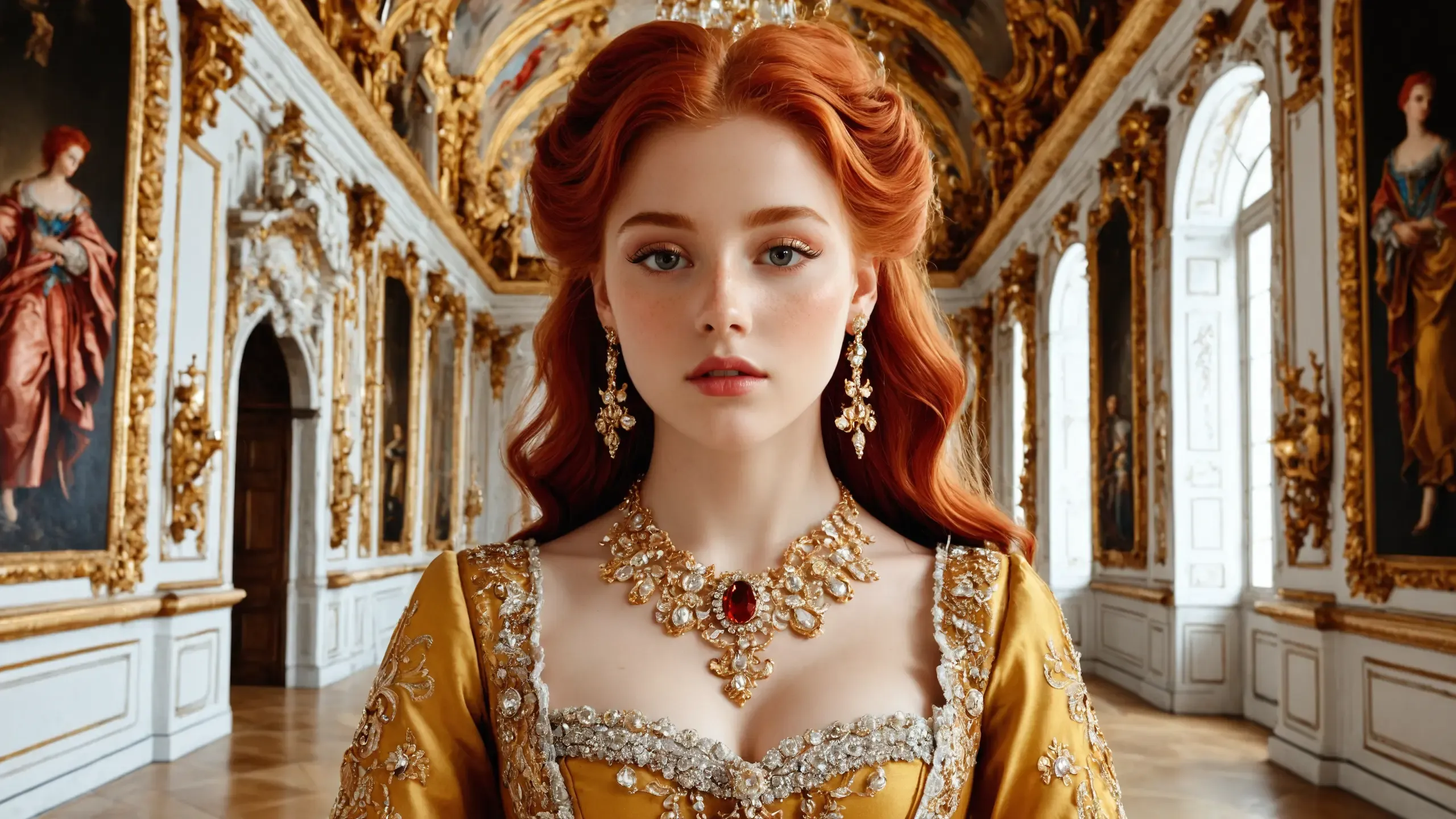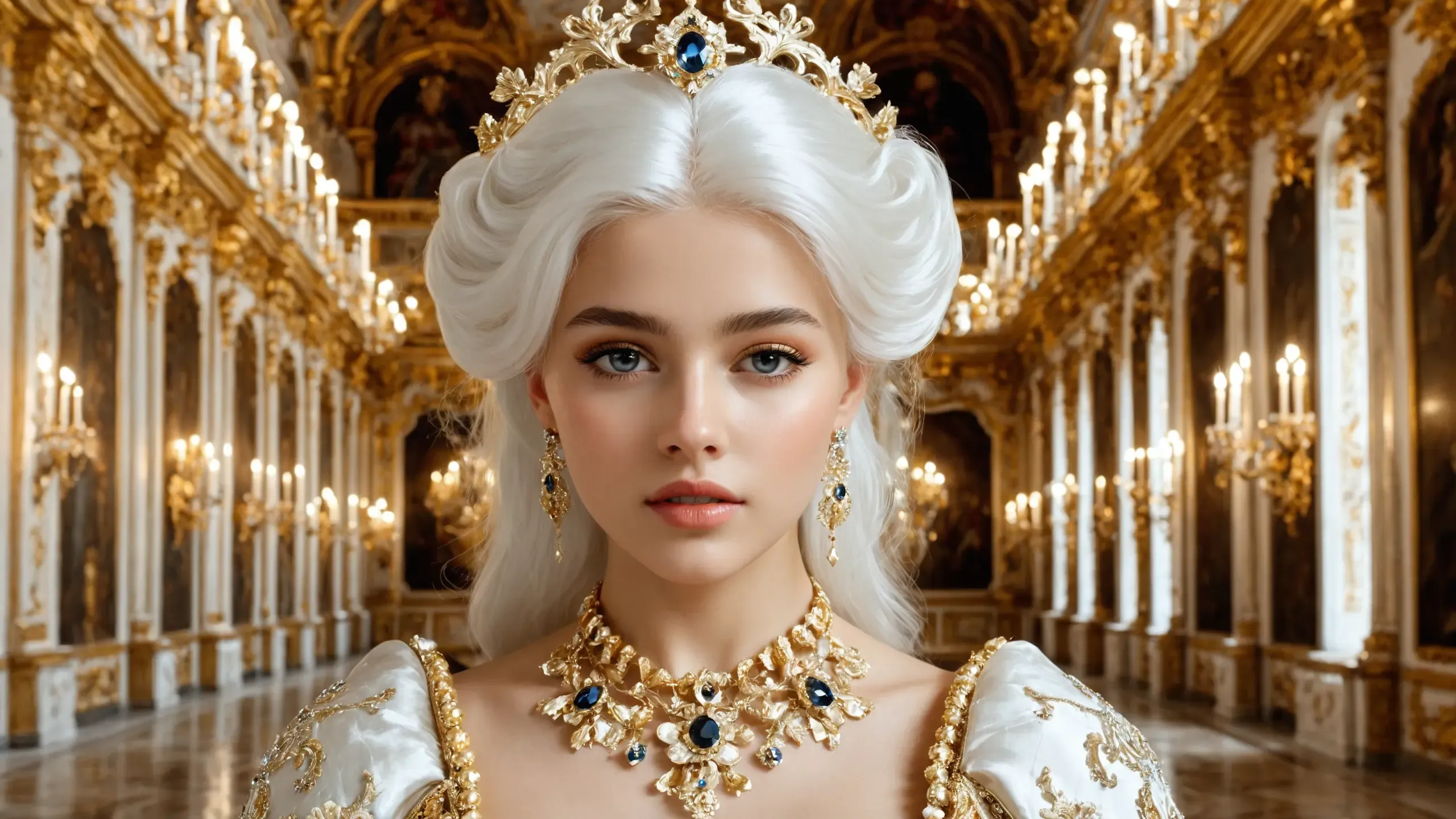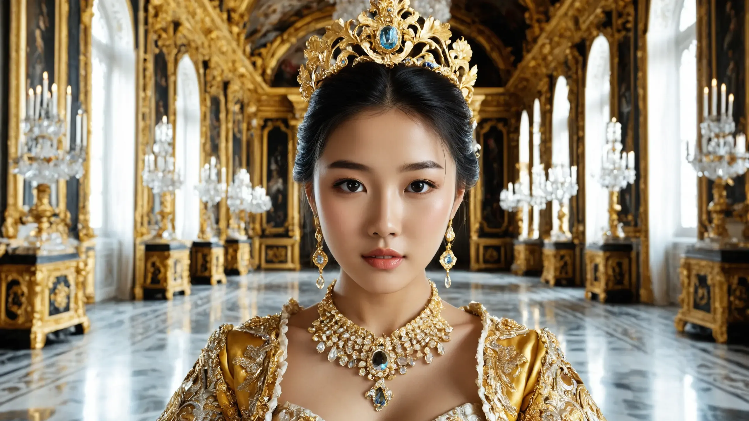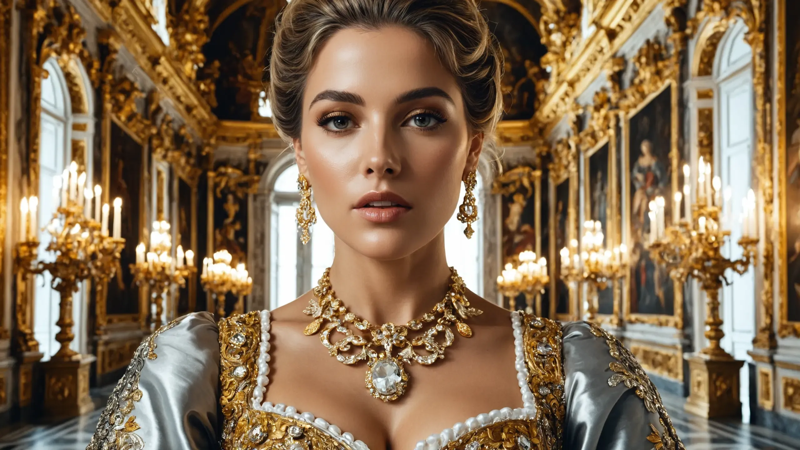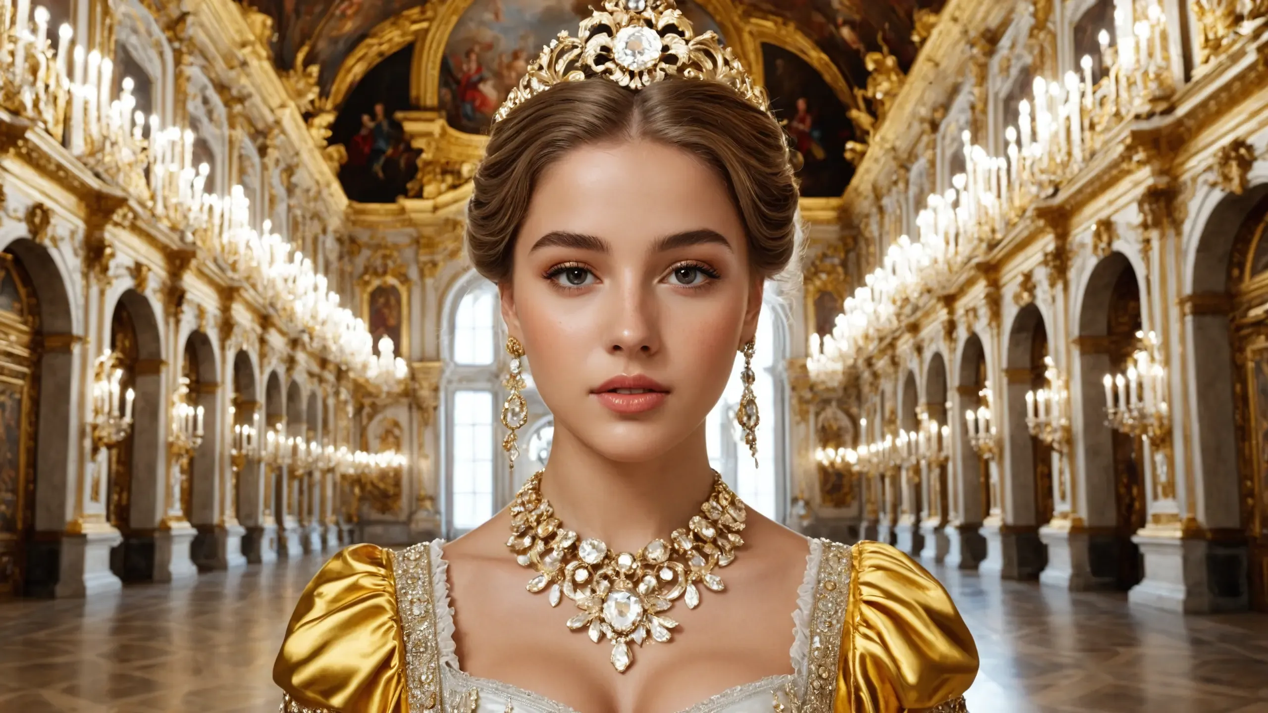 Baroque, Close up photo of a beautiful 18 year old {0.2::black, African|0.1::Indian|0.2::Asian|0.1::Native American|0.4::} girl, alone in in a huge hall, full of gold, silver and mirrors of a baroque palace. Everything is brightly lit.