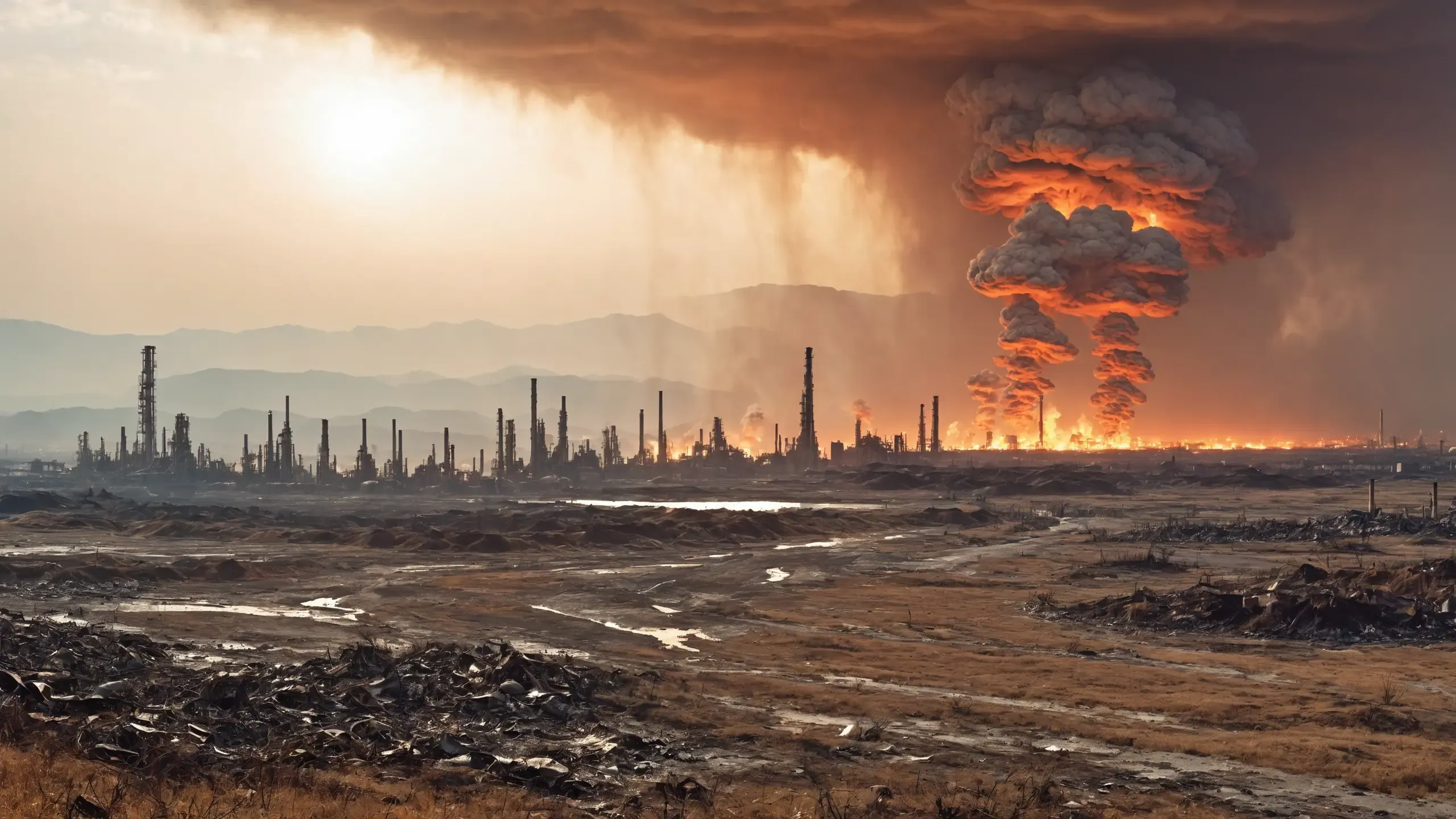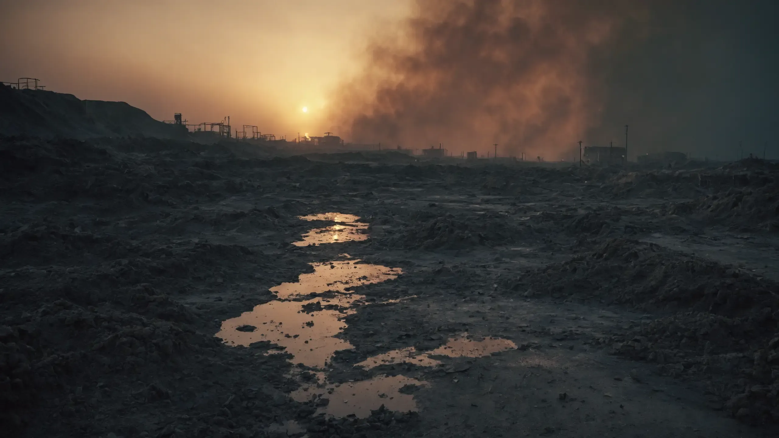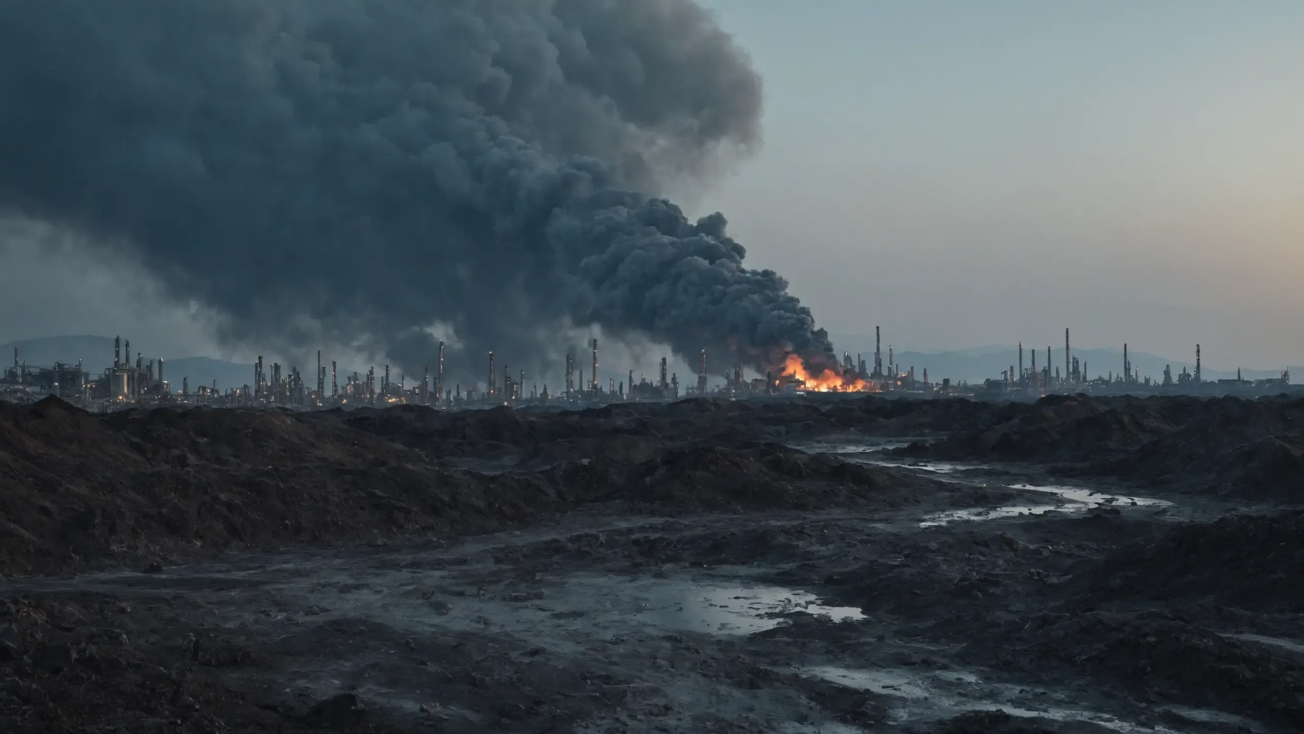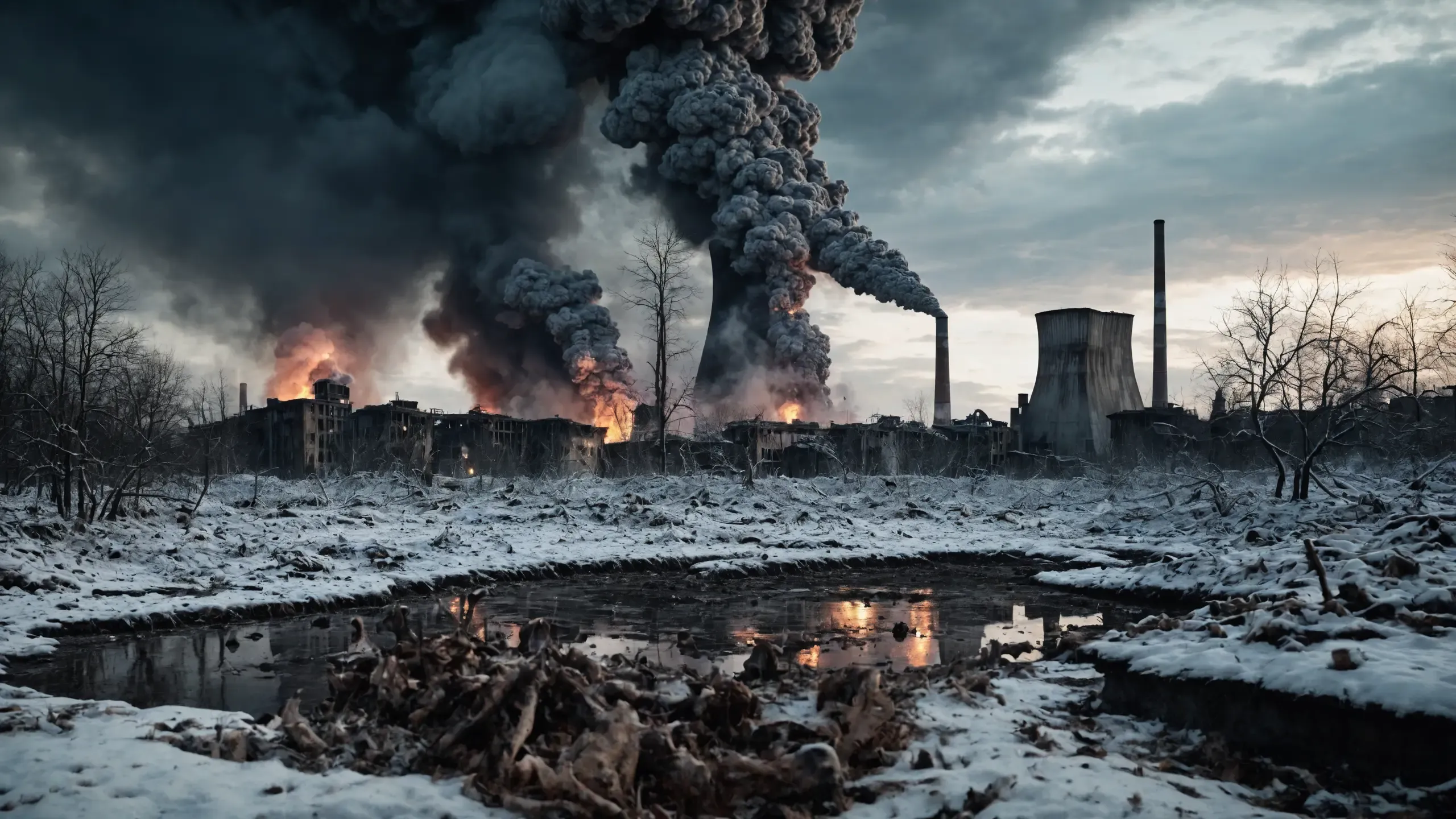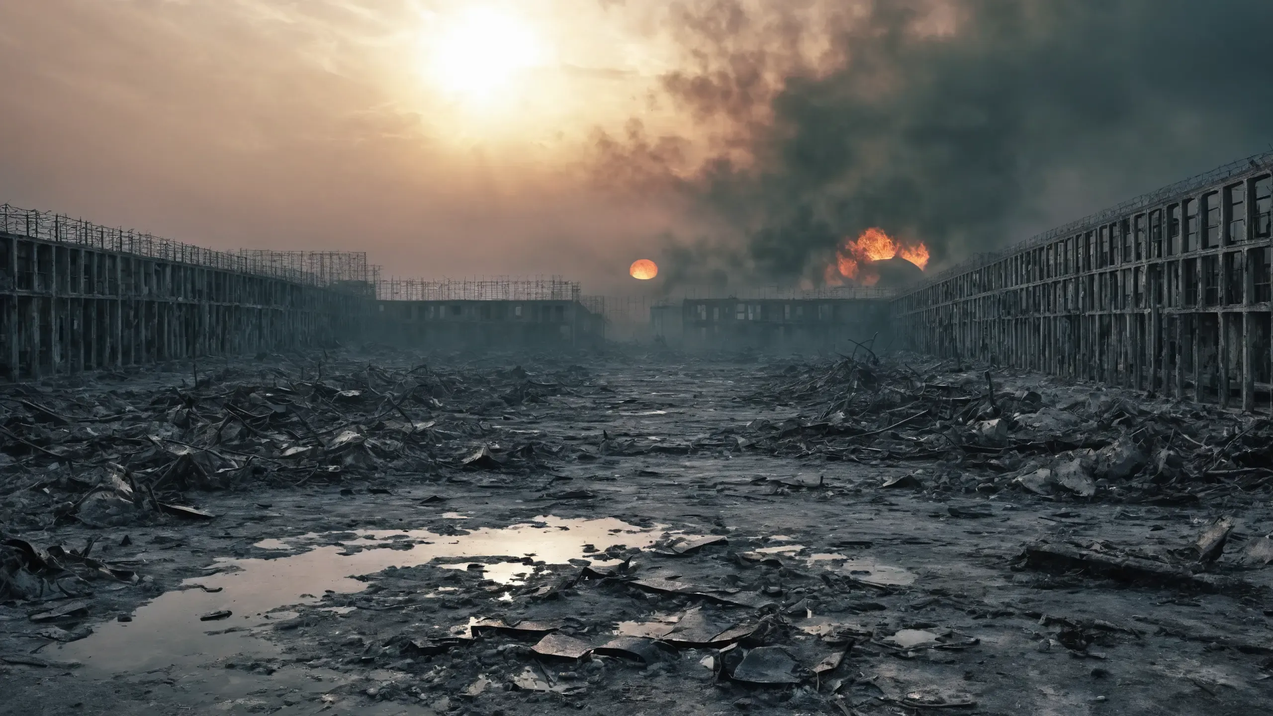 Destroyed and burning ({coal open-cast mine|nuclear power plant|collapsed skyscrapers|port|oil refinery|mega city|factory|Industrial facilities|high-rise housing estate|manhatten|vilage|bridge|prison|town}:1.5).