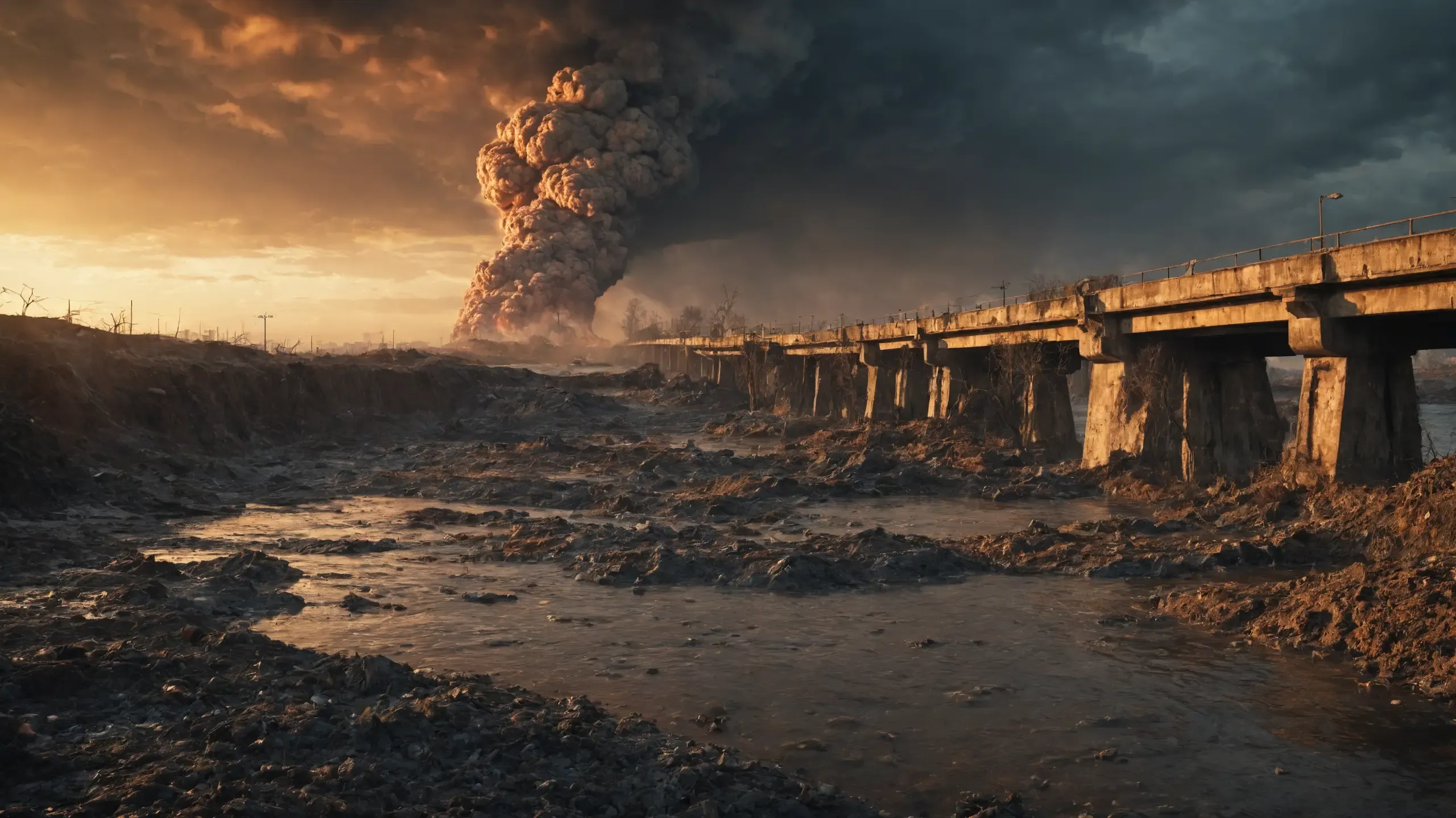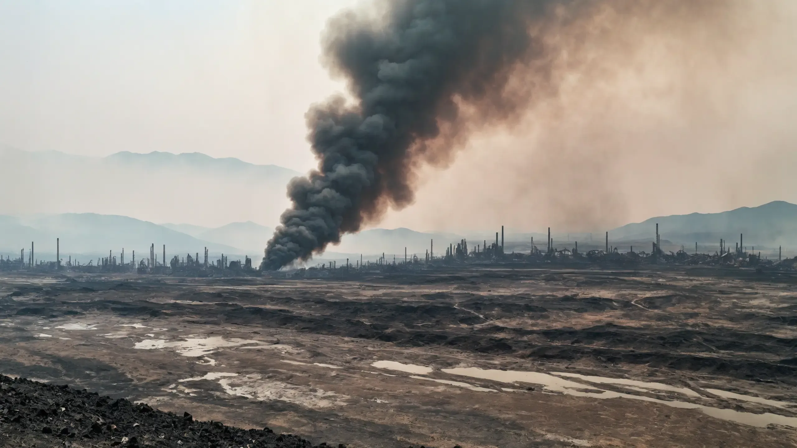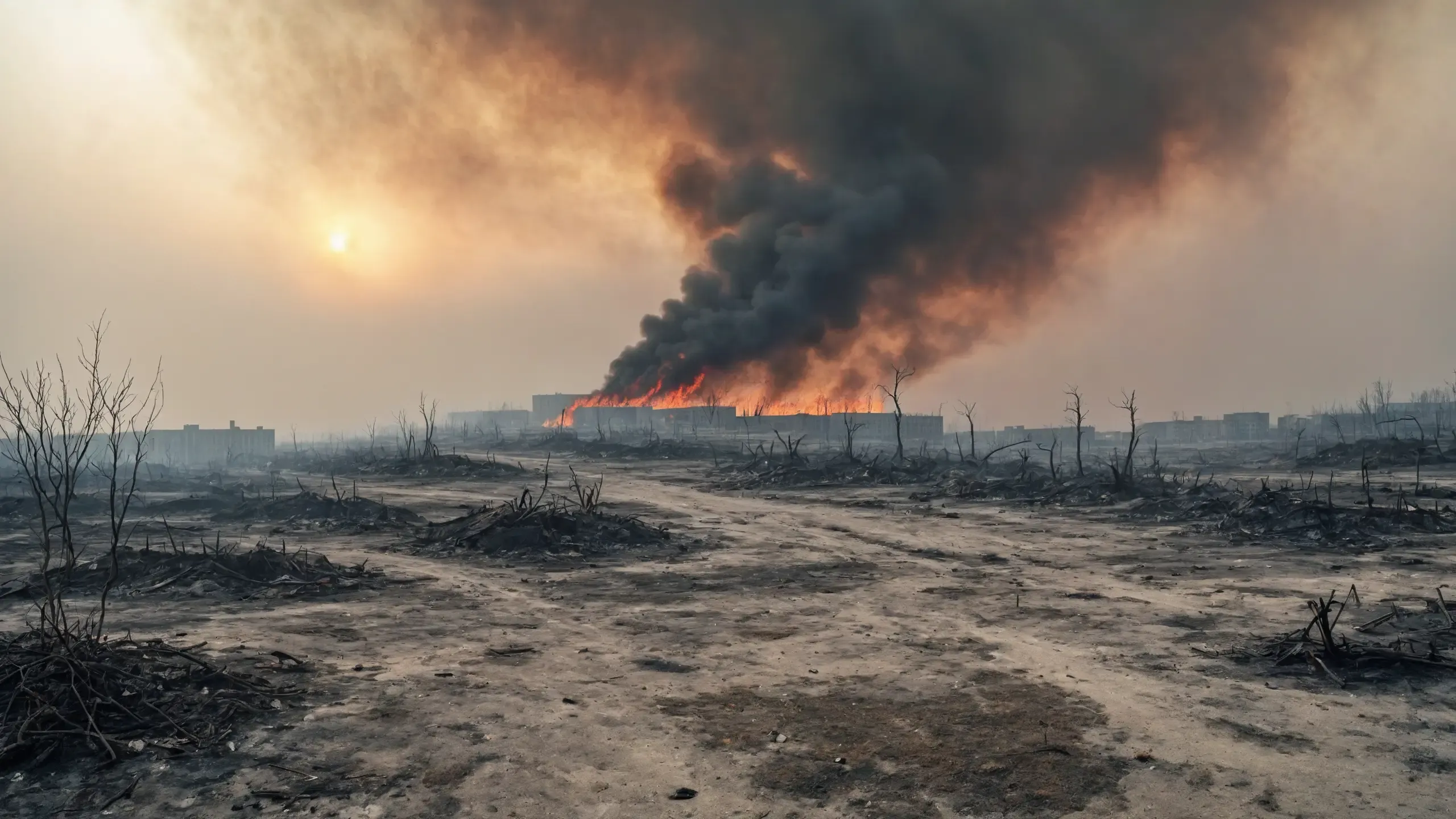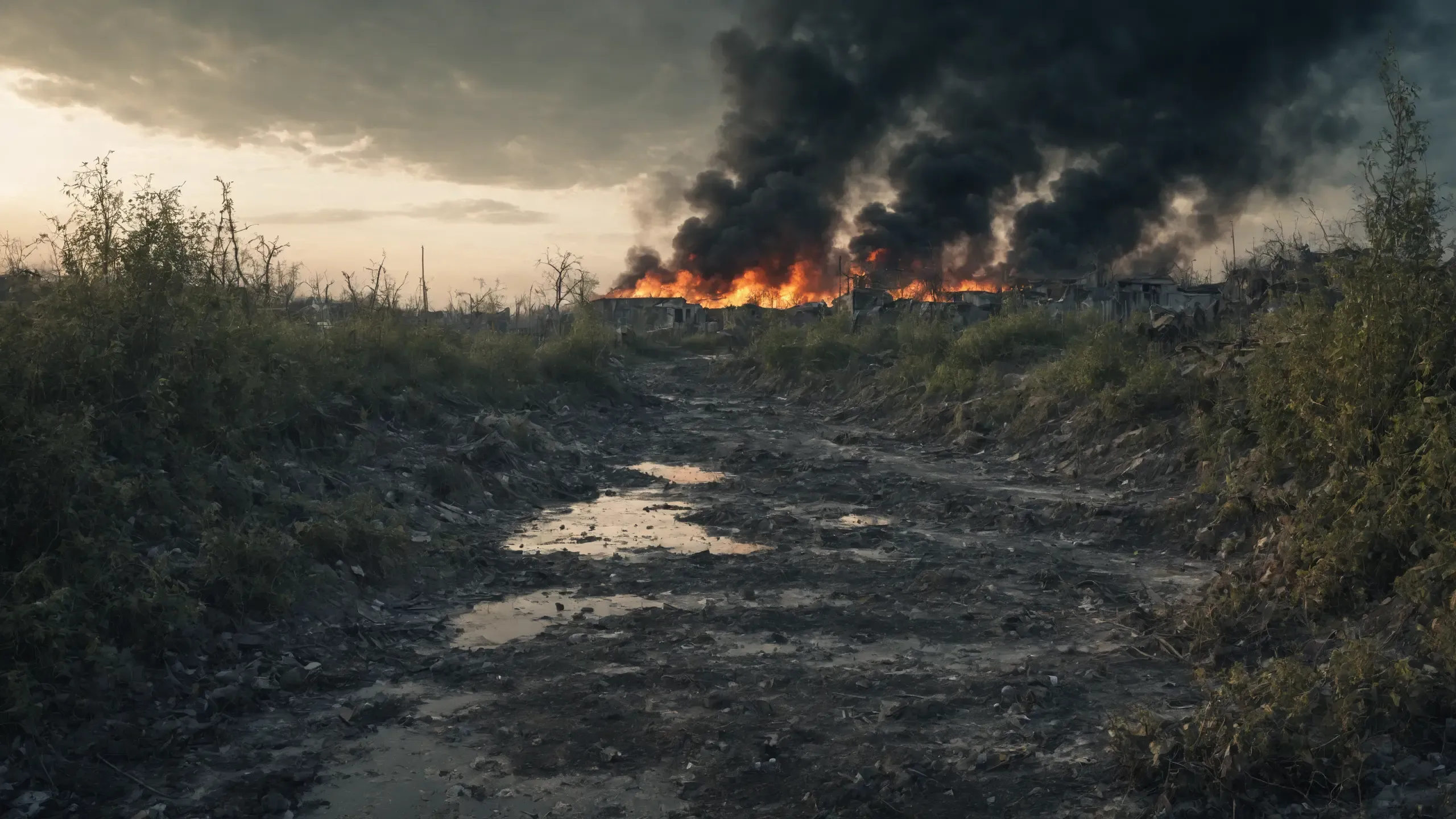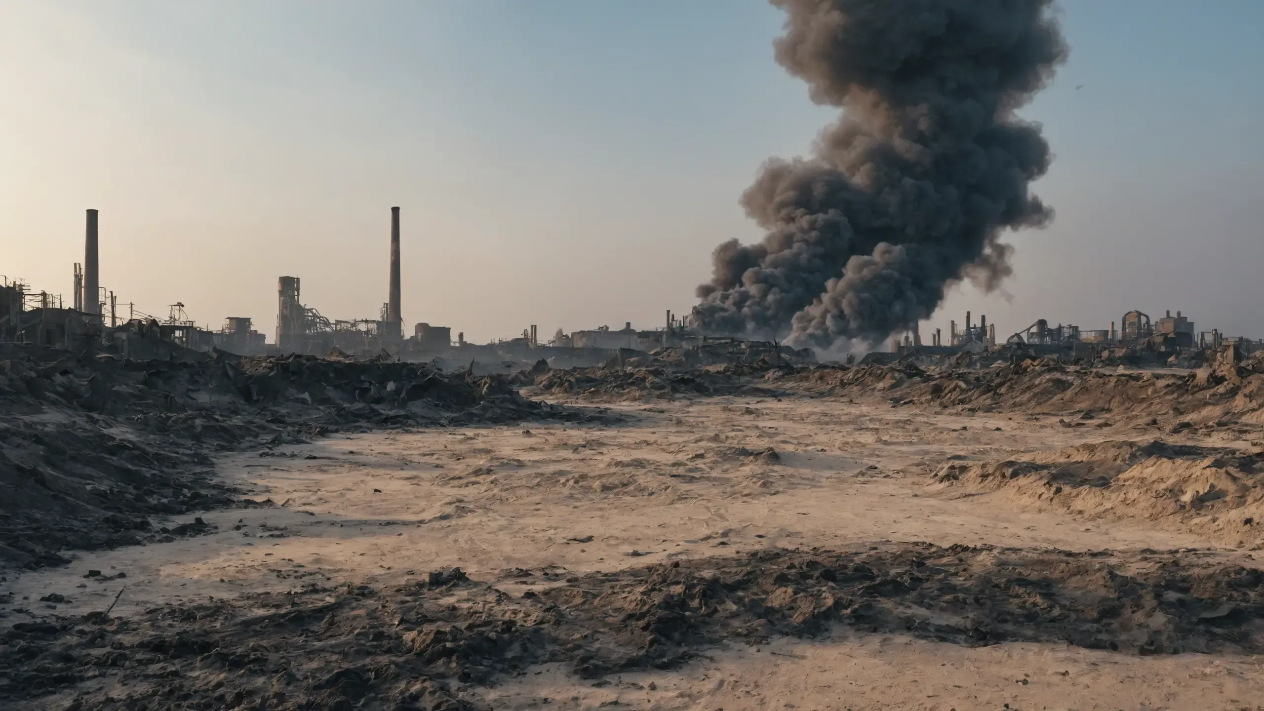 Destroyed and burning ({coal open-cast mine|nuclear power plant|collapsed skyscrapers|port|oil refinery|mega city|factory|Industrial facilities|high-rise housing estate|manhatten|vilage|bridge|prison|town}:1.5).