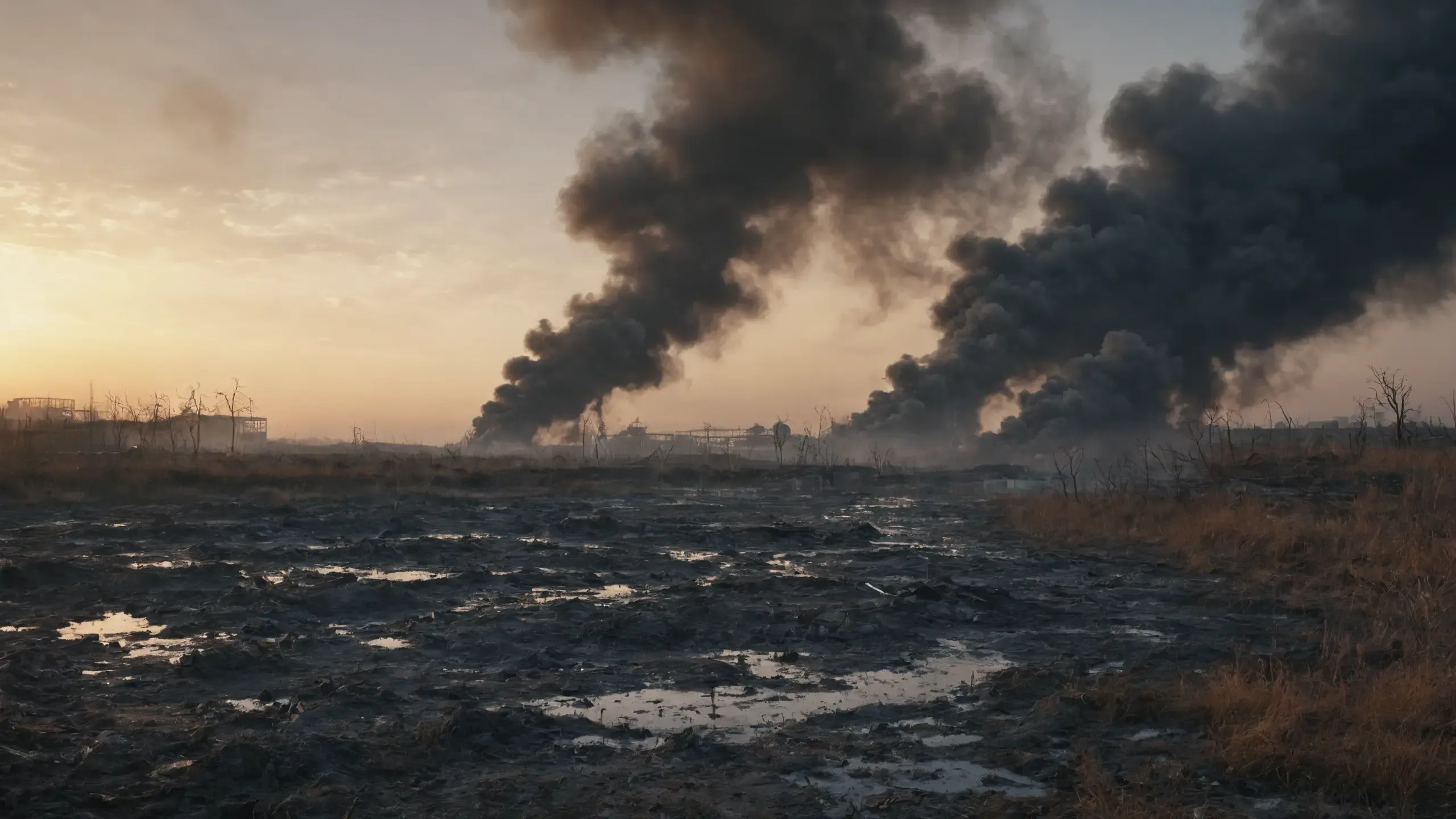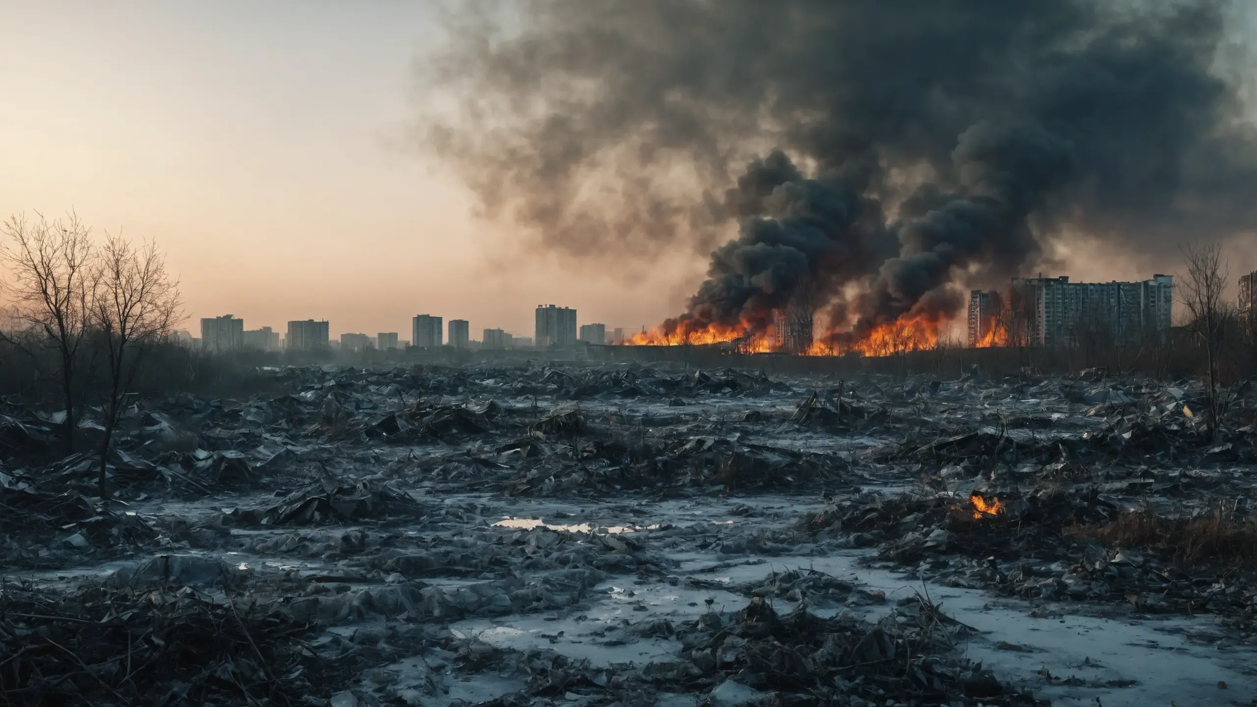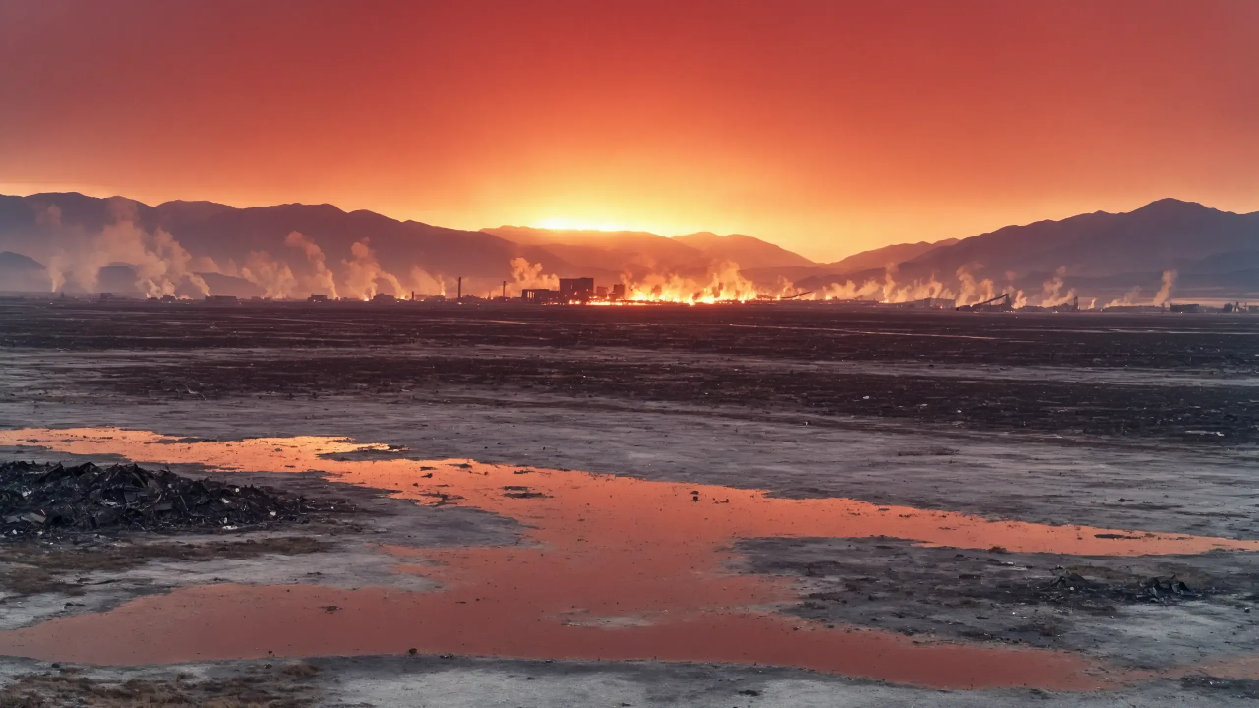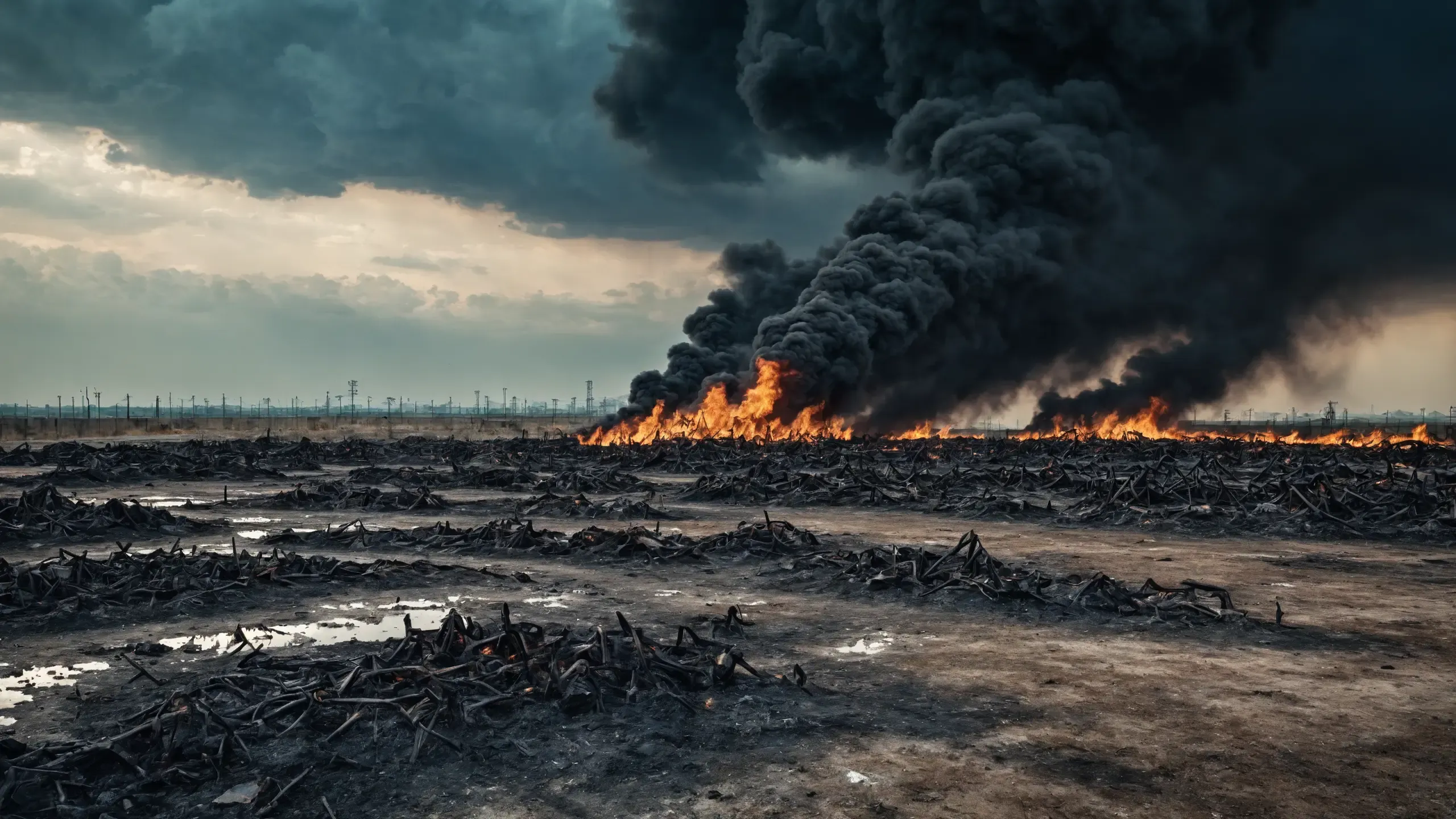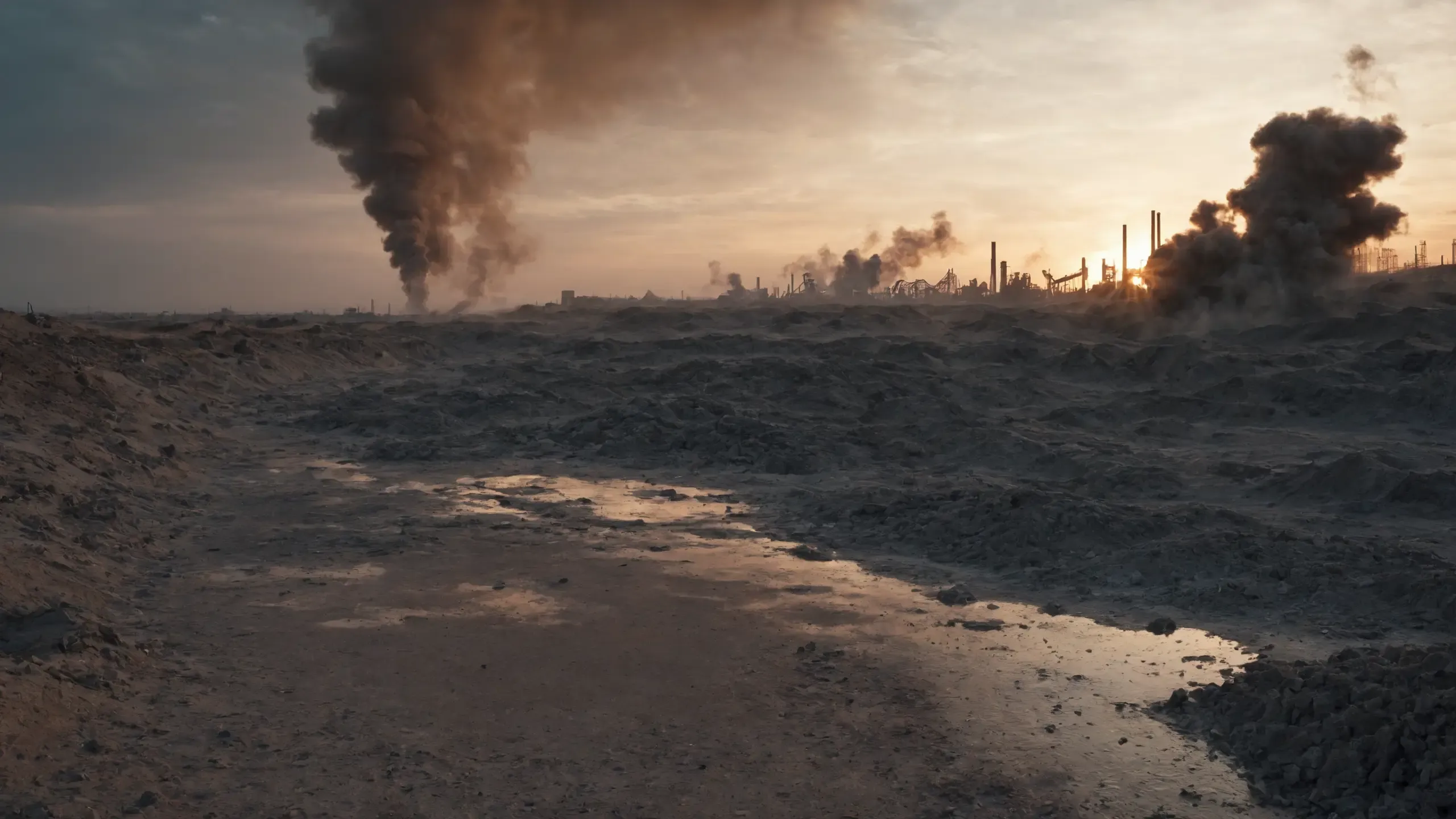 Destroyed and burning ({coal open-cast mine|nuclear power plant|collapsed skyscrapers|port|oil refinery|mega city|factory|Industrial facilities|high-rise housing estate|manhatten|vilage|bridge|prison|town}:1.5).