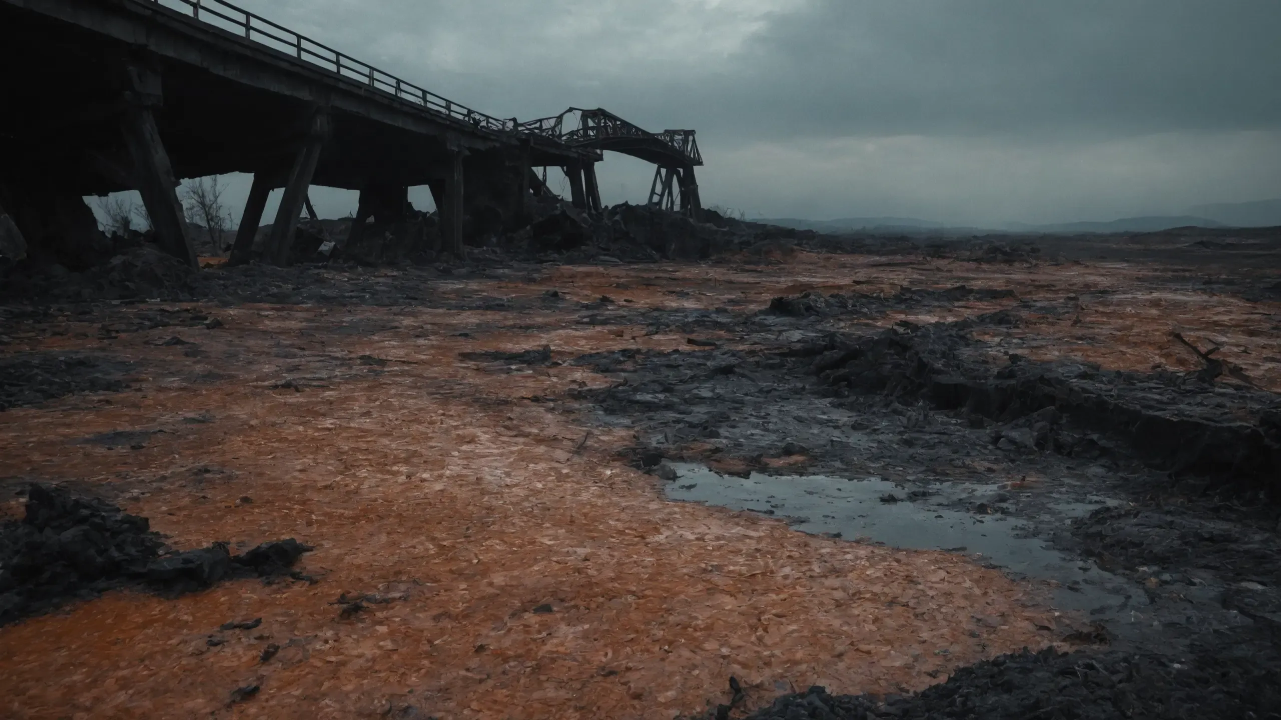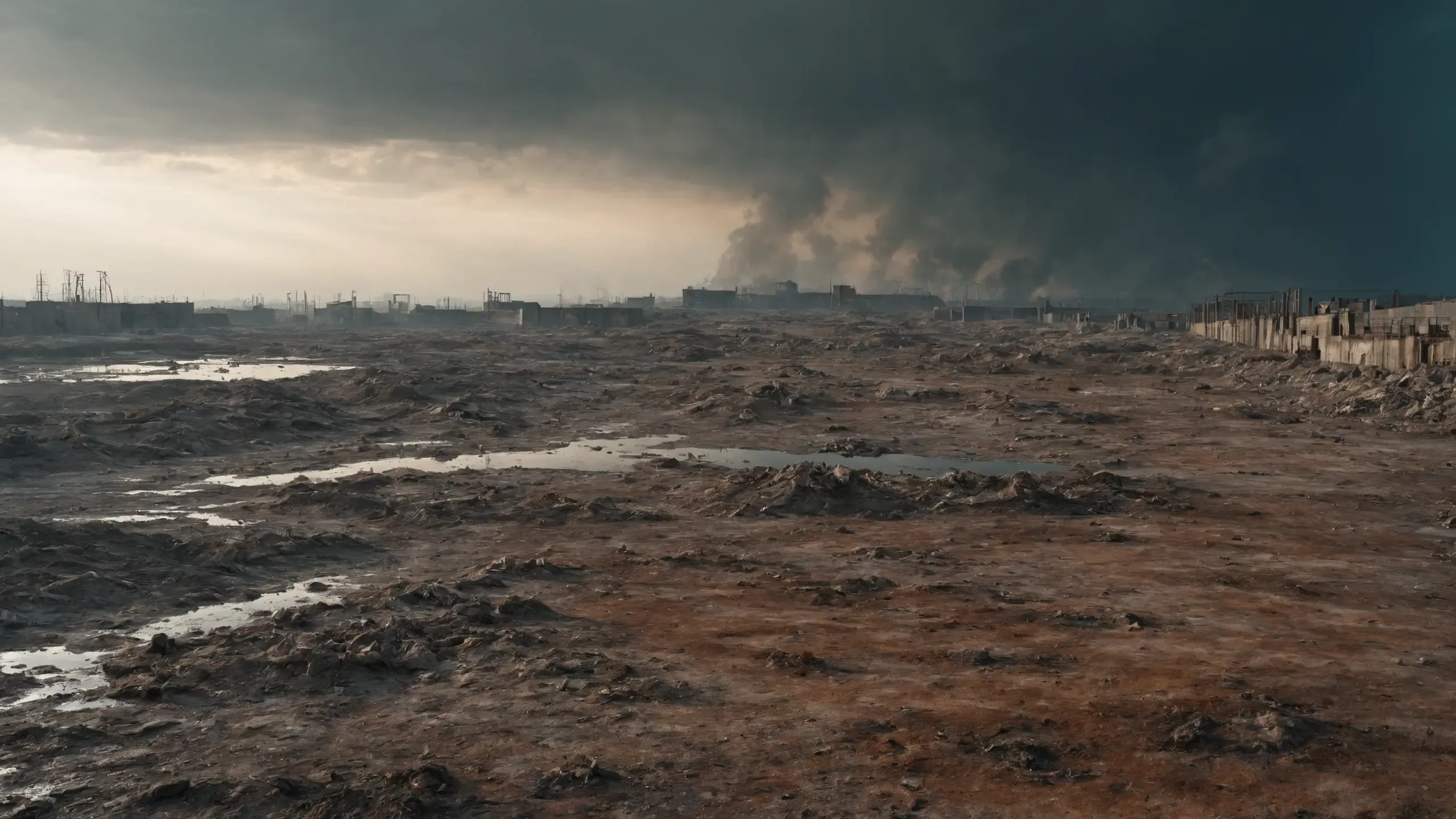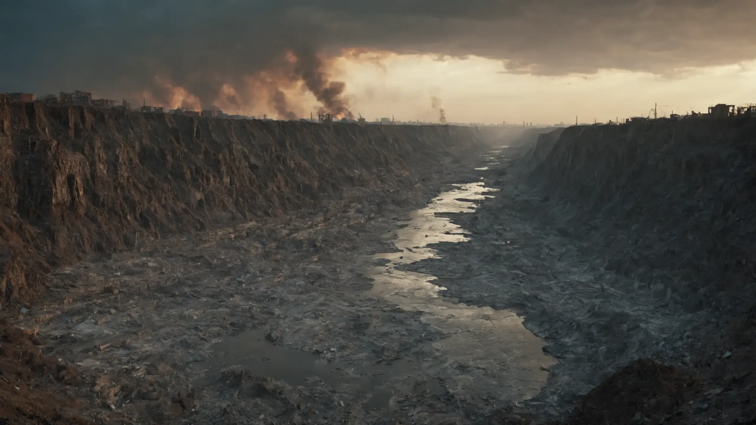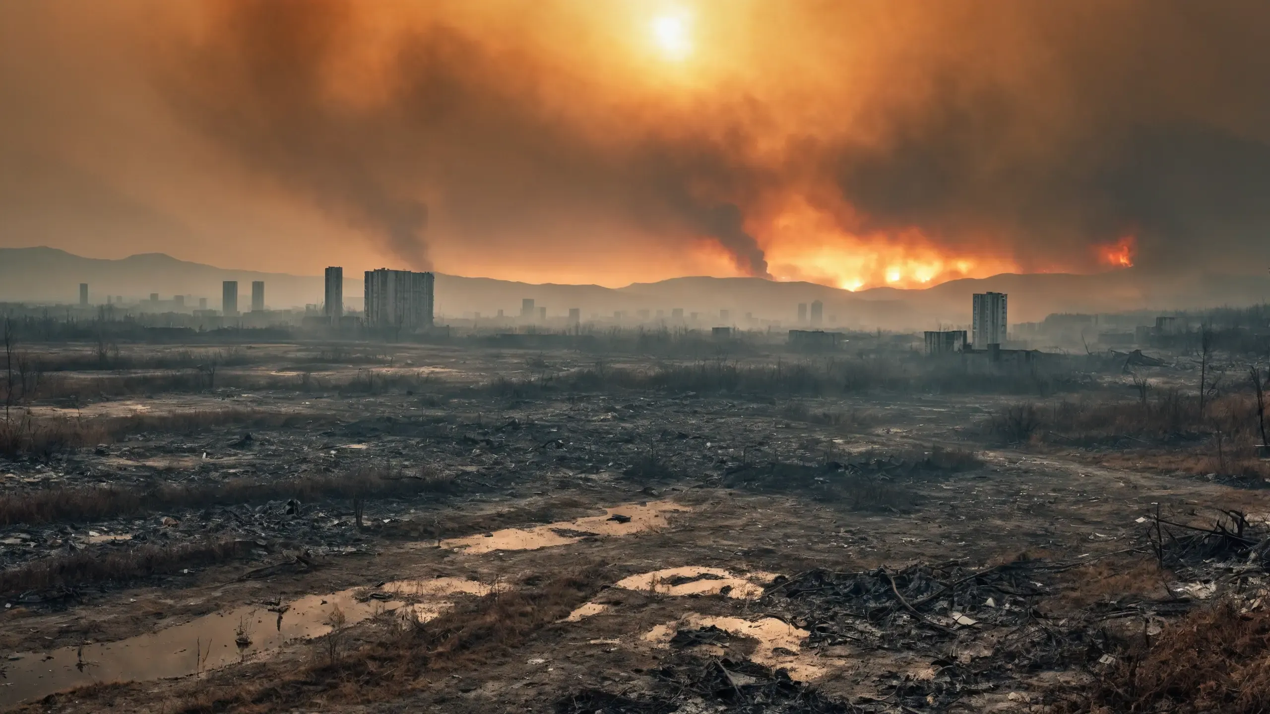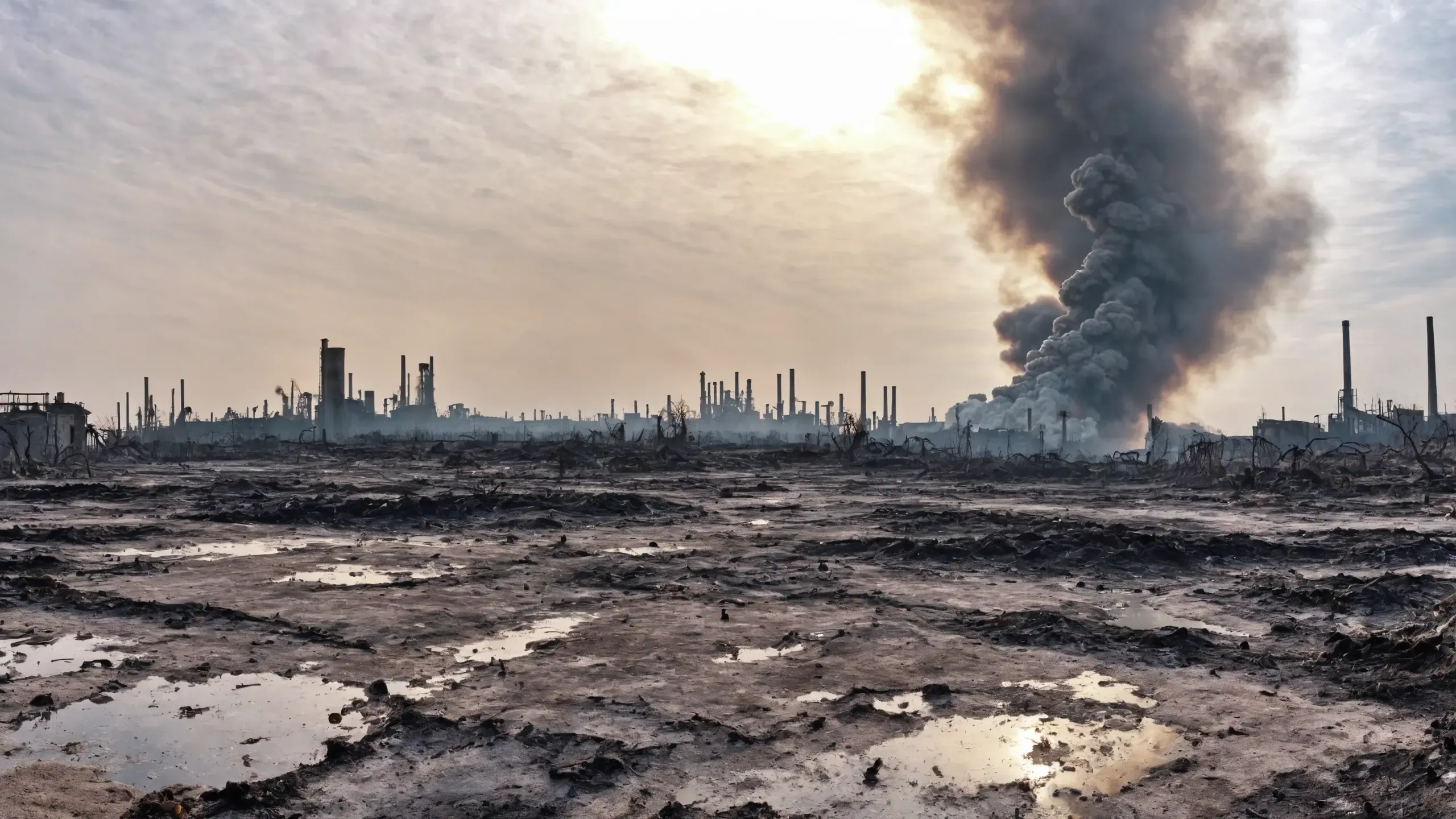 Destroyed and burning ({coal open-cast mine|nuclear power plant|collapsed skyscrapers|port|oil refinery|mega city|factory|Industrial facilities|high-rise housing estate|manhatten|vilage|bridge|prison|town}:1.5).