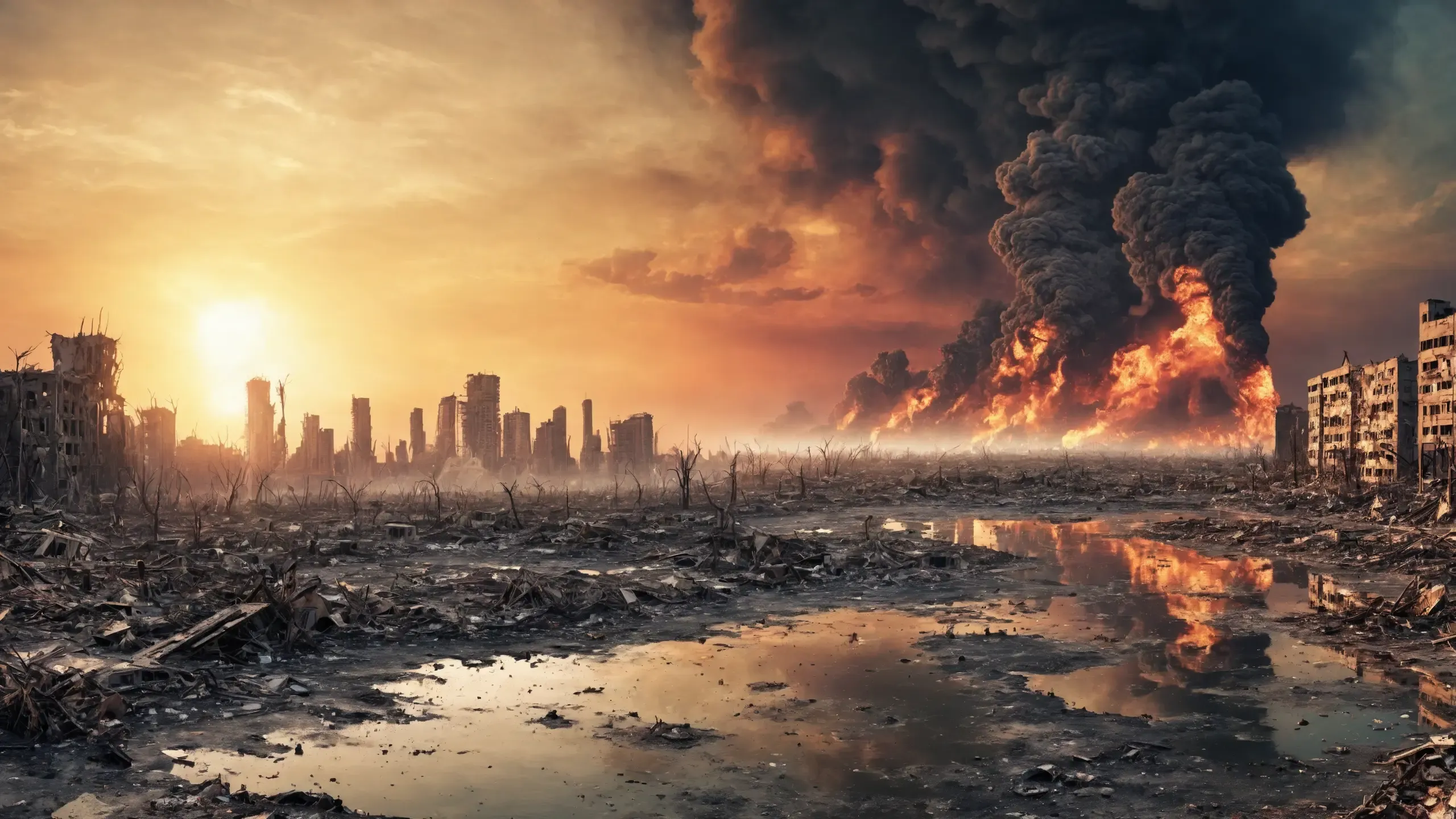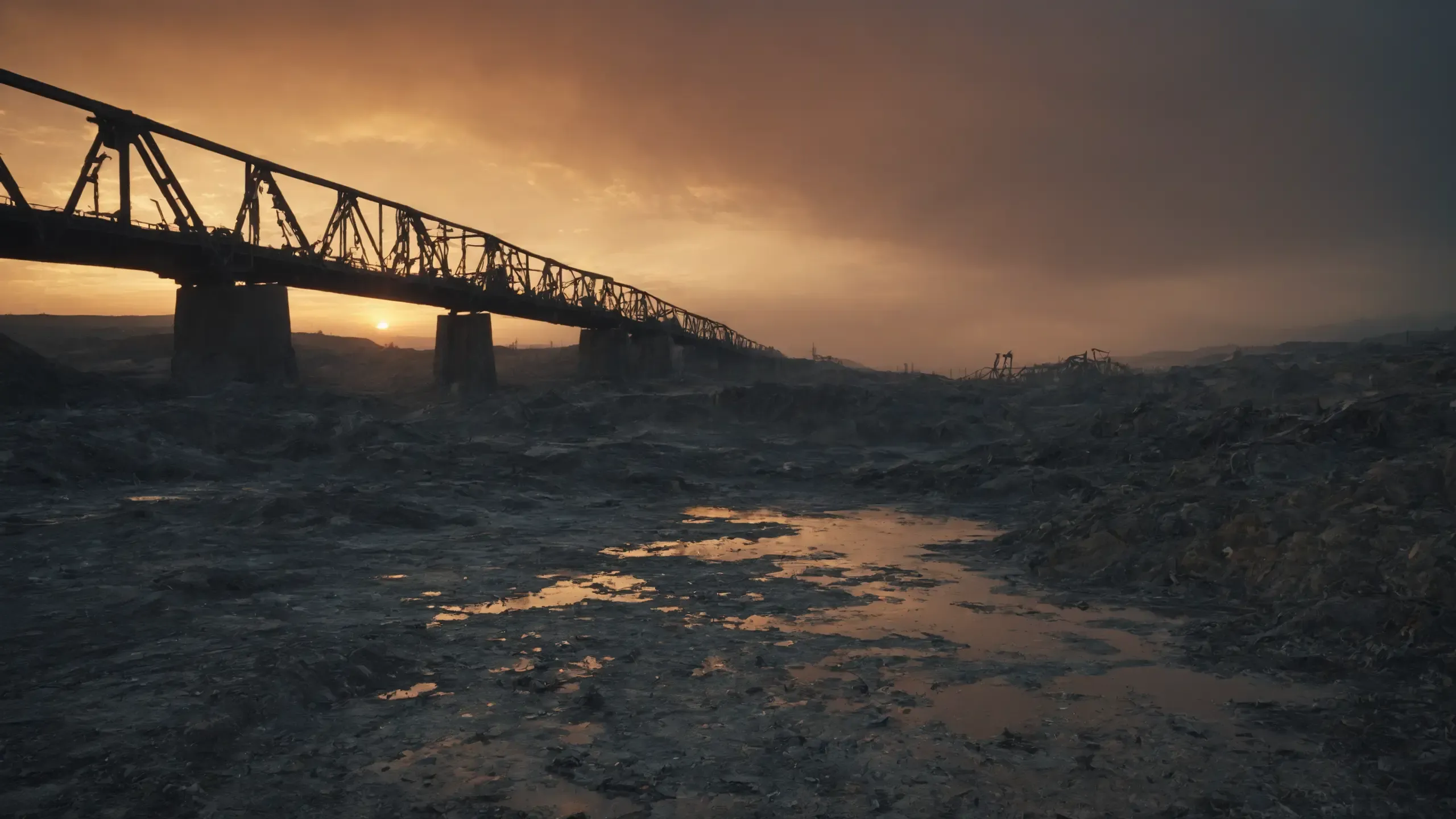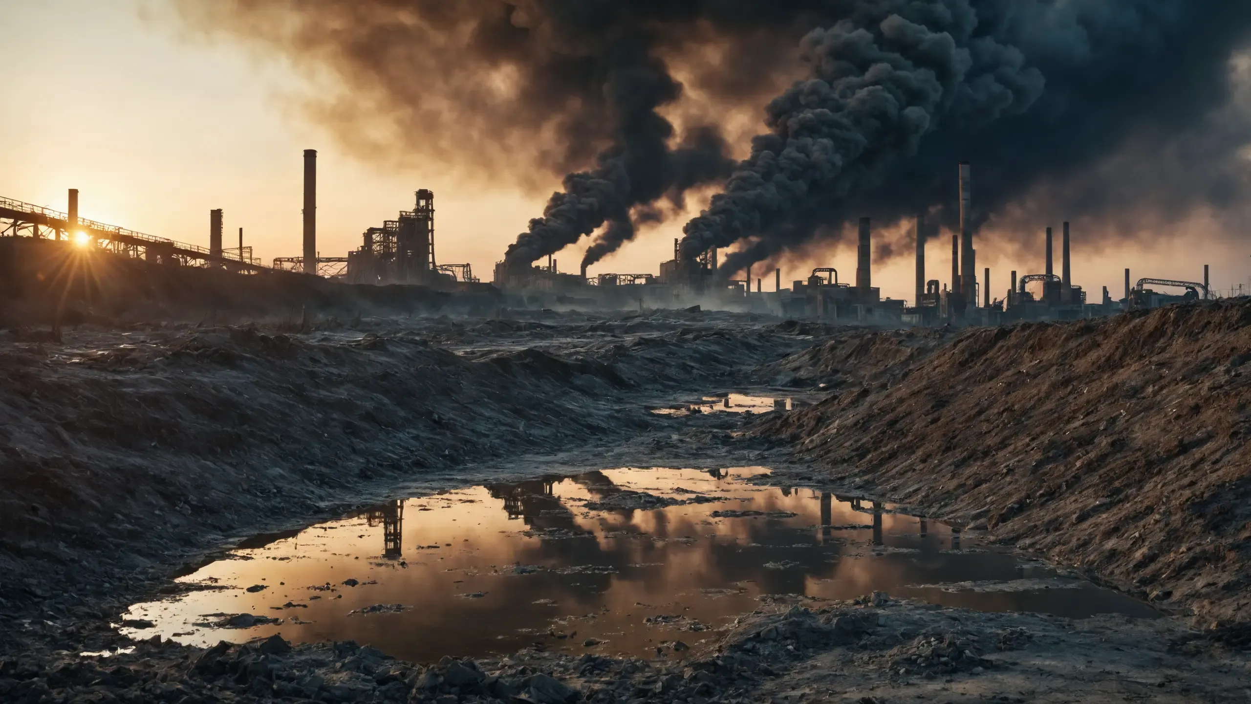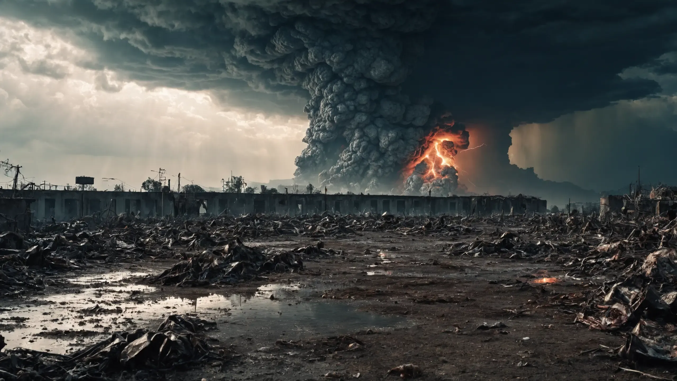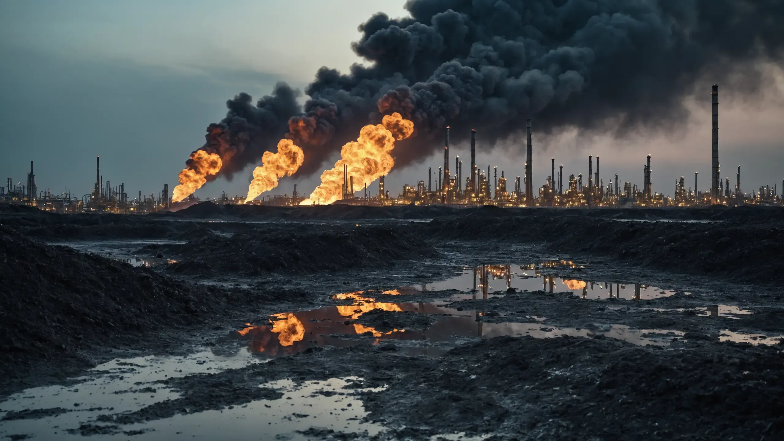 Destroyed and burning ({coal open-cast mine|nuclear power plant|collapsed skyscrapers|port|oil refinery|mega city|factory|Industrial facilities|high-rise housing estate|manhatten|vilage|bridge|prison|town}:1.5).