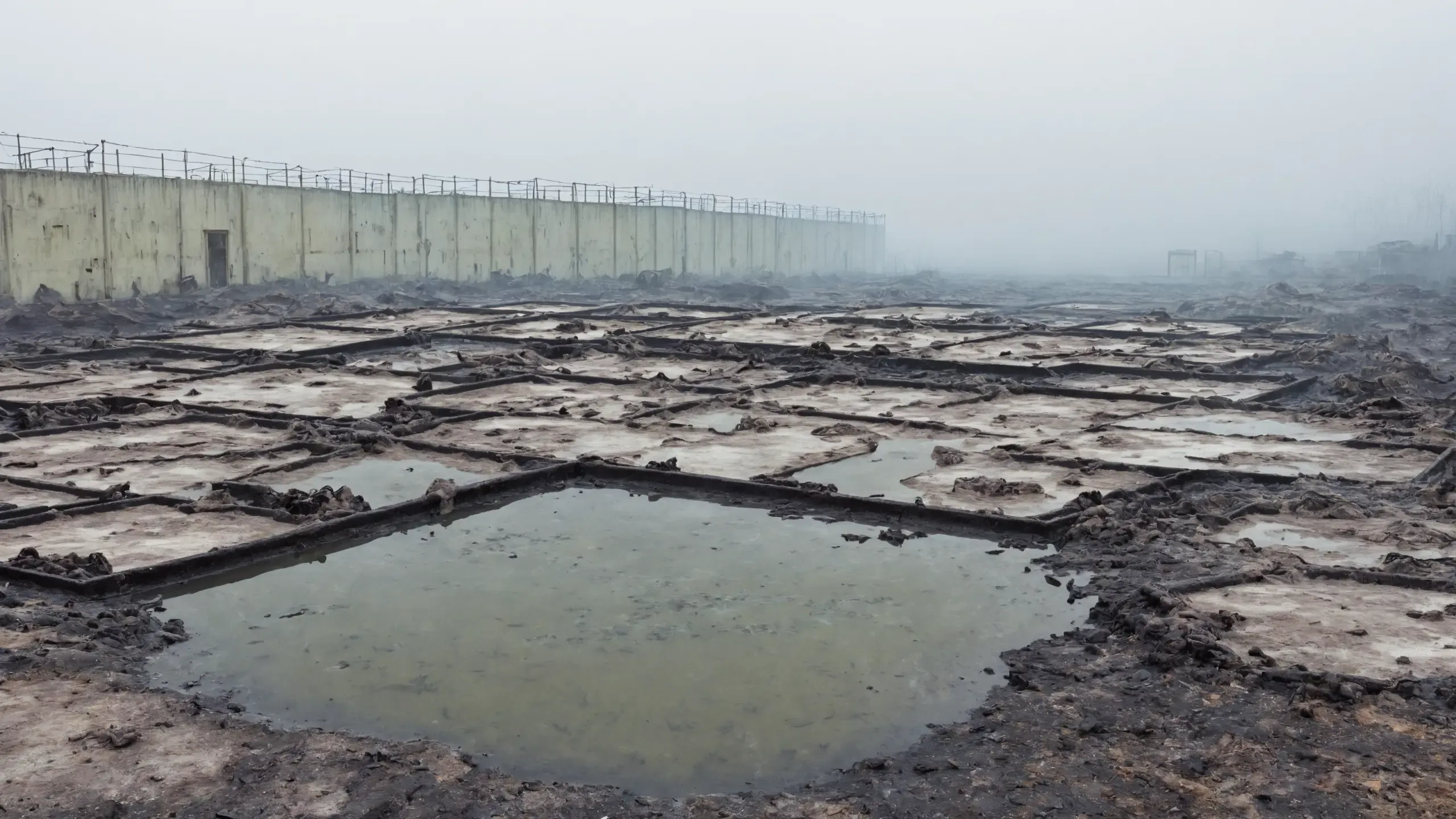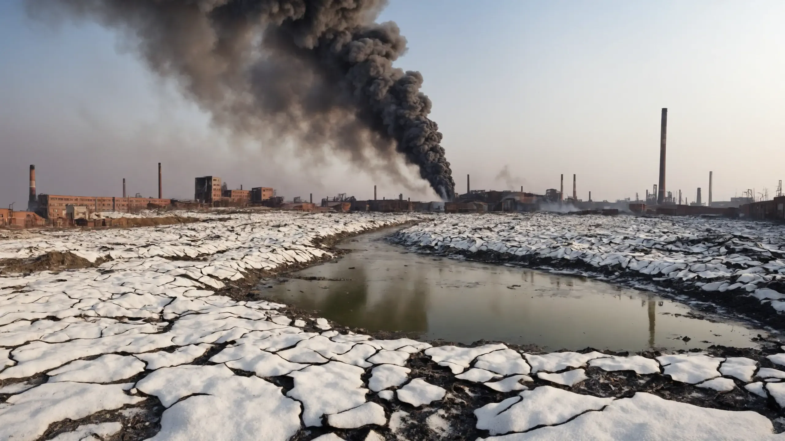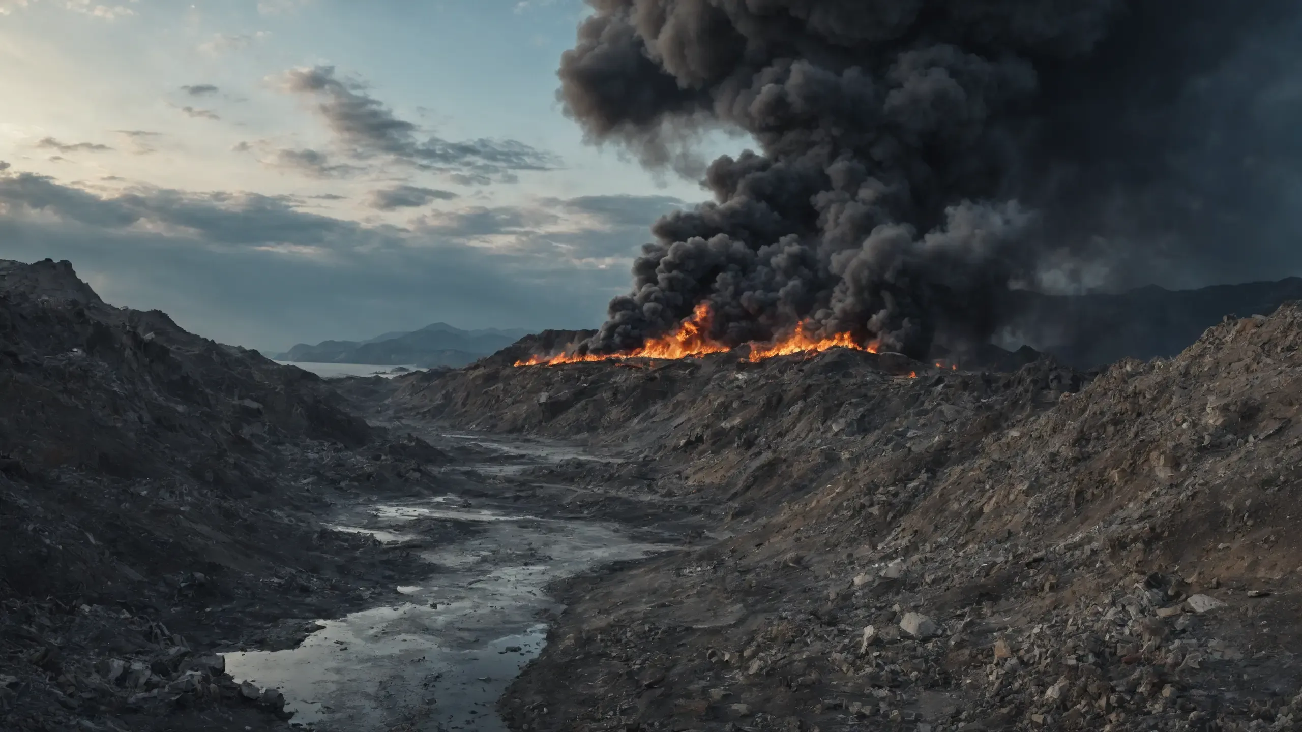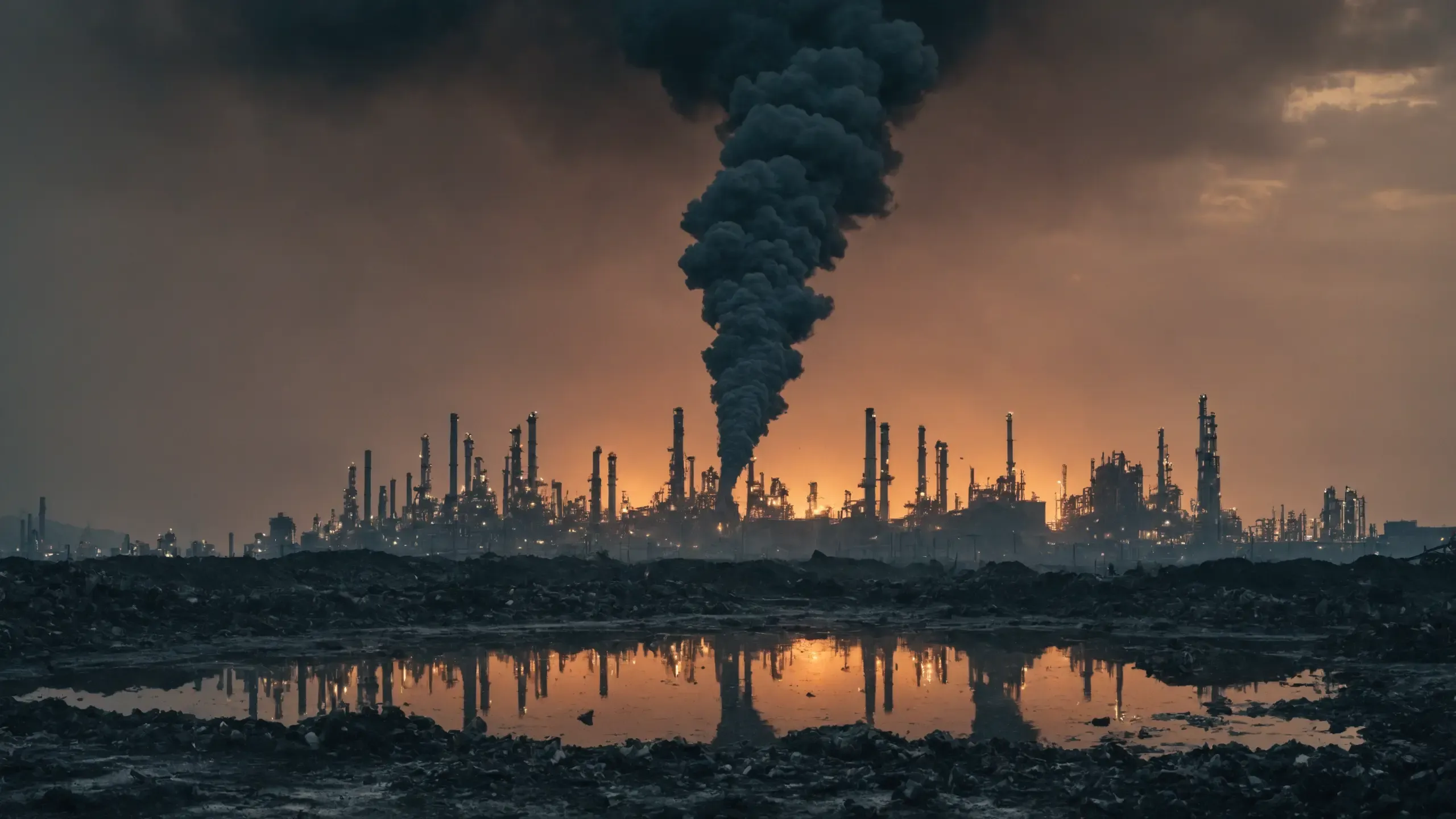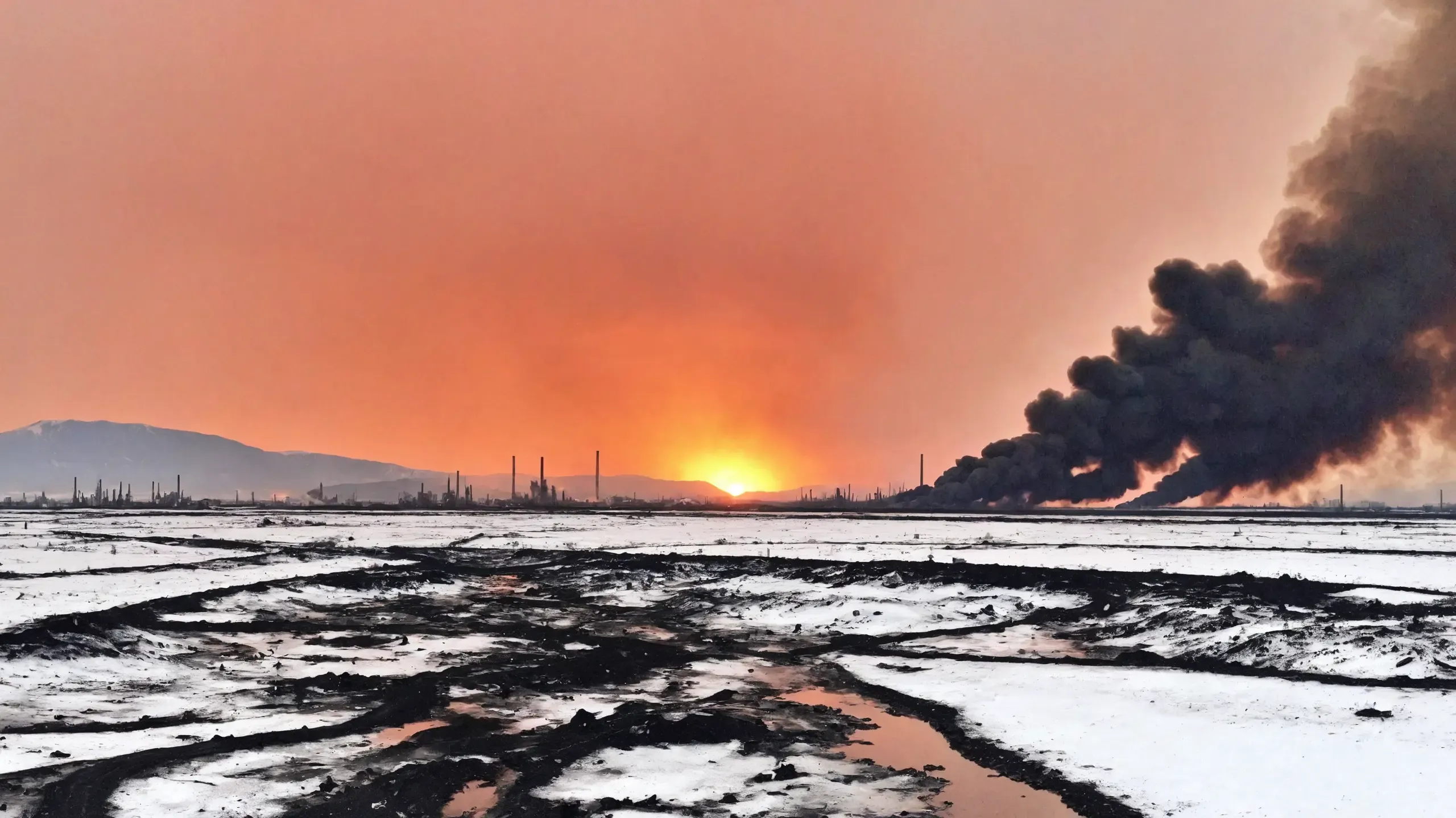 Destroyed and burning ({coal open-cast mine|nuclear power plant|collapsed skyscrapers|port|oil refinery|mega city|factory|Industrial facilities|high-rise housing estate|manhatten|vilage|bridge|prison|town}:1.5).