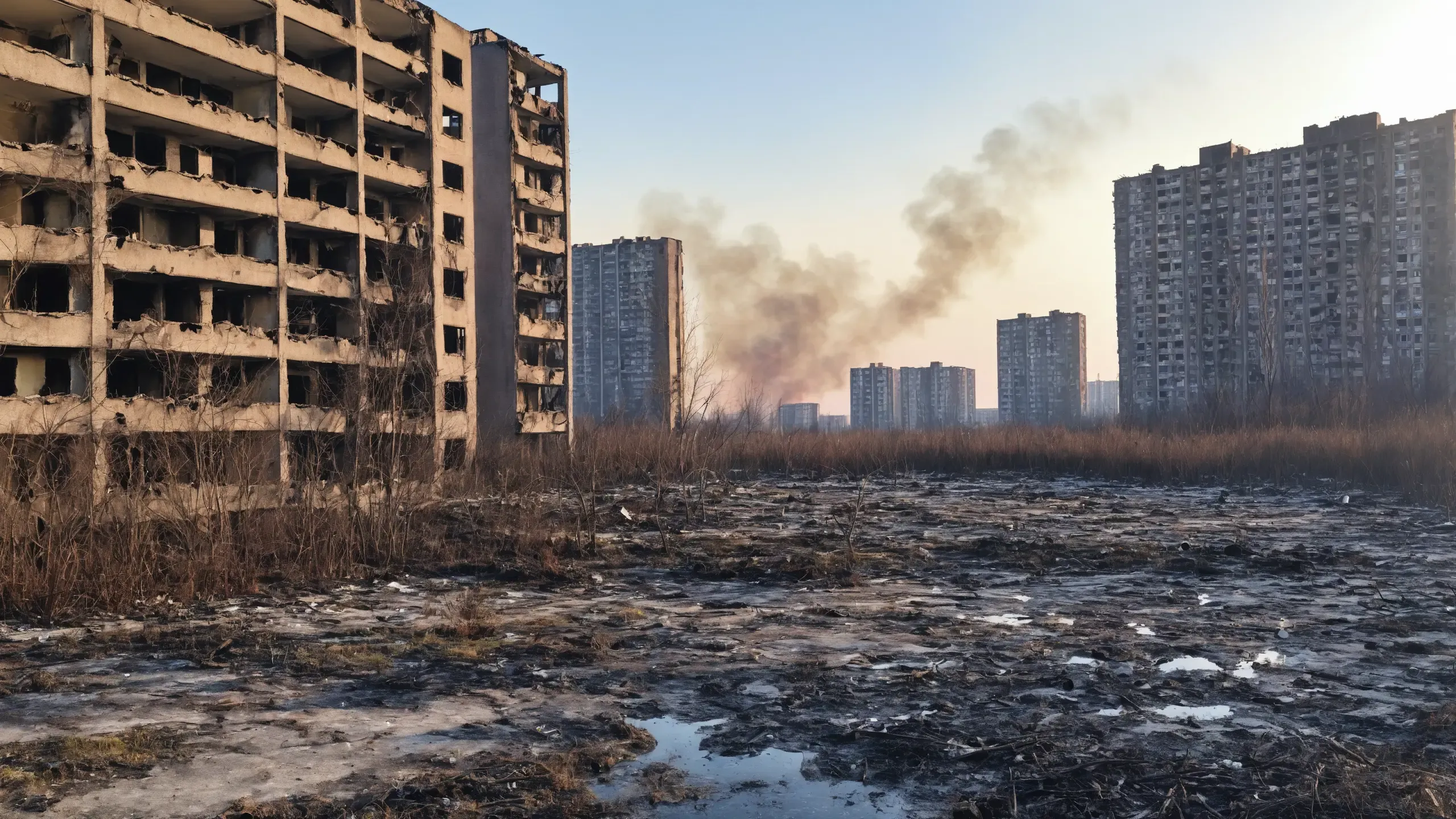 Abandoned, destroyed and burning ({nuclear power plant|collapsed skyscrapers|port|oil refinery|mega city|factory|Industrial facilities|high-rise housing estate|manhatten|vilage|bridge|prison|town}:1.5).