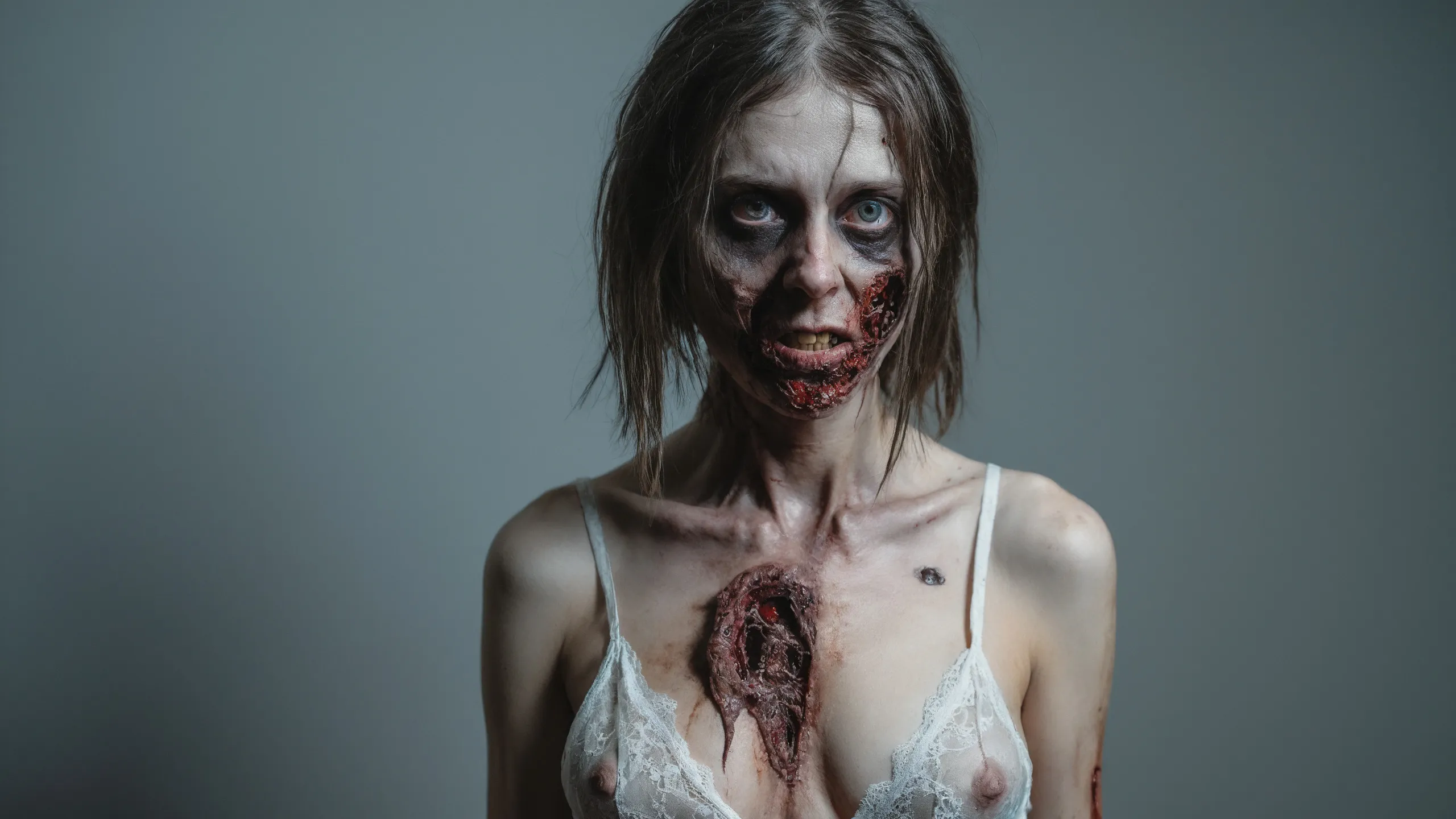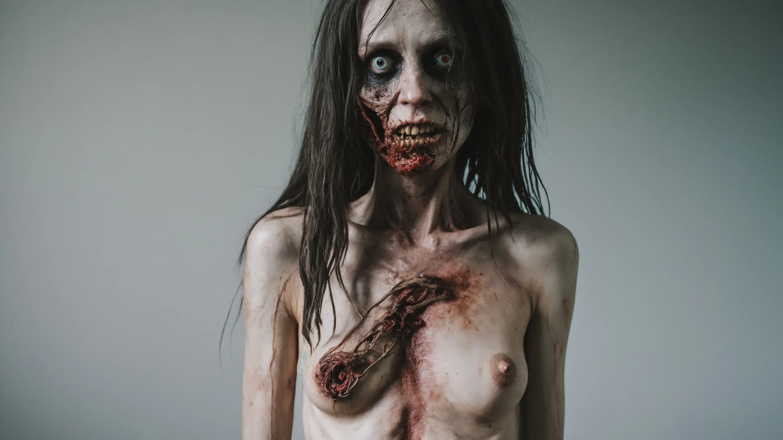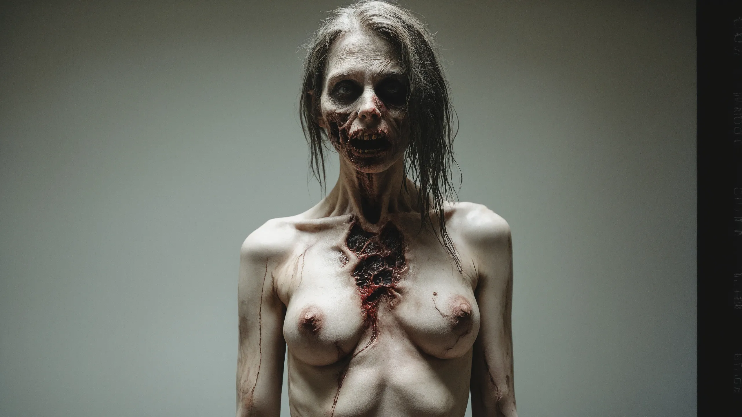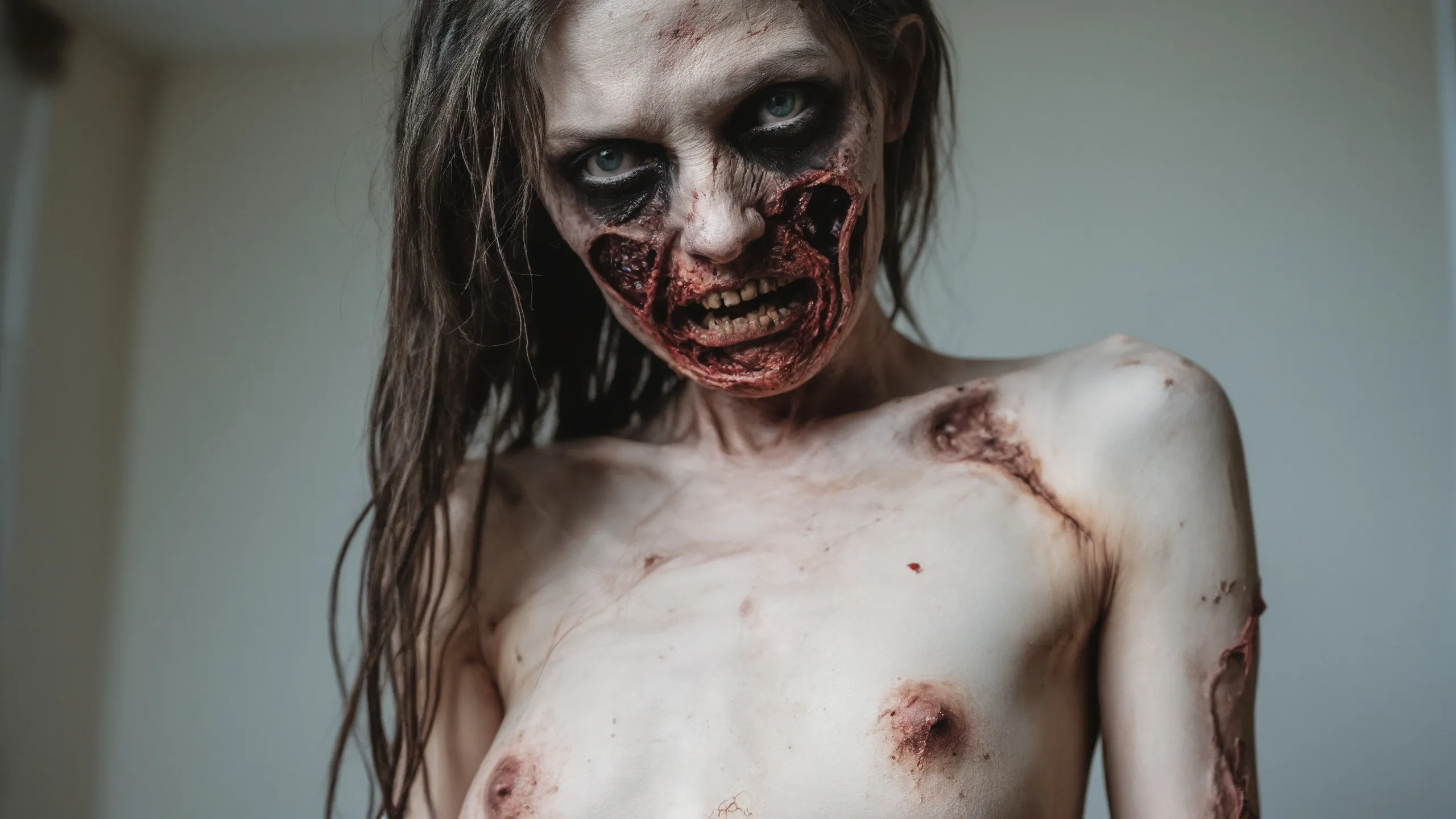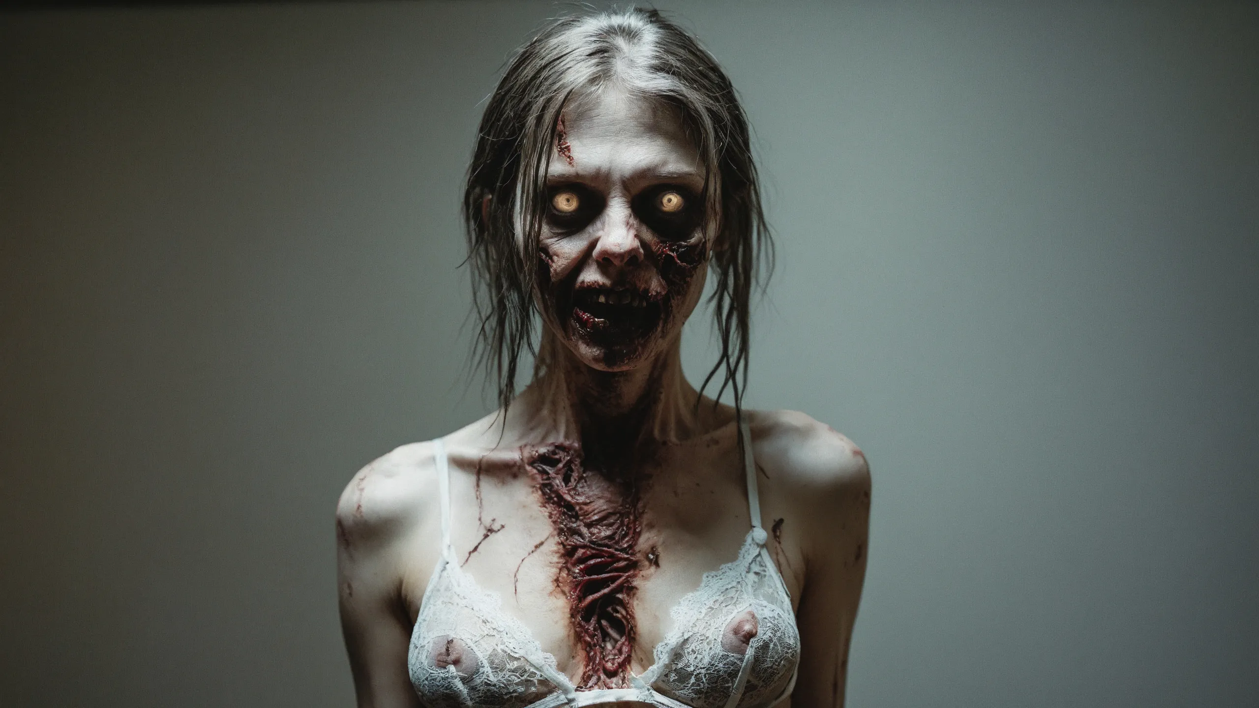 Cinematic {Portrait|Medium Range|Full body} photo of a ugly and scary zombie girl.