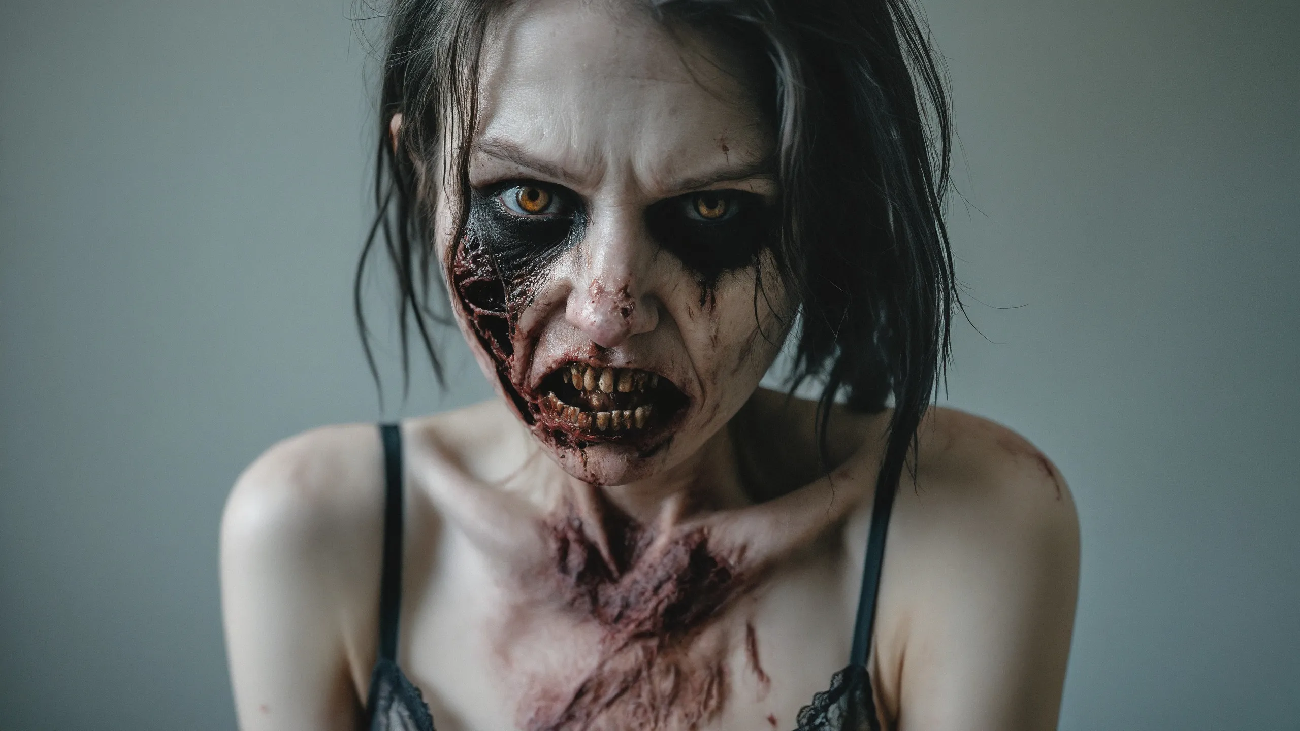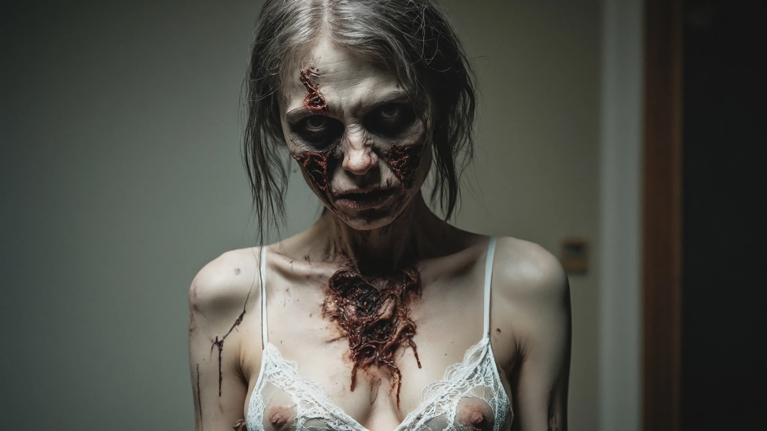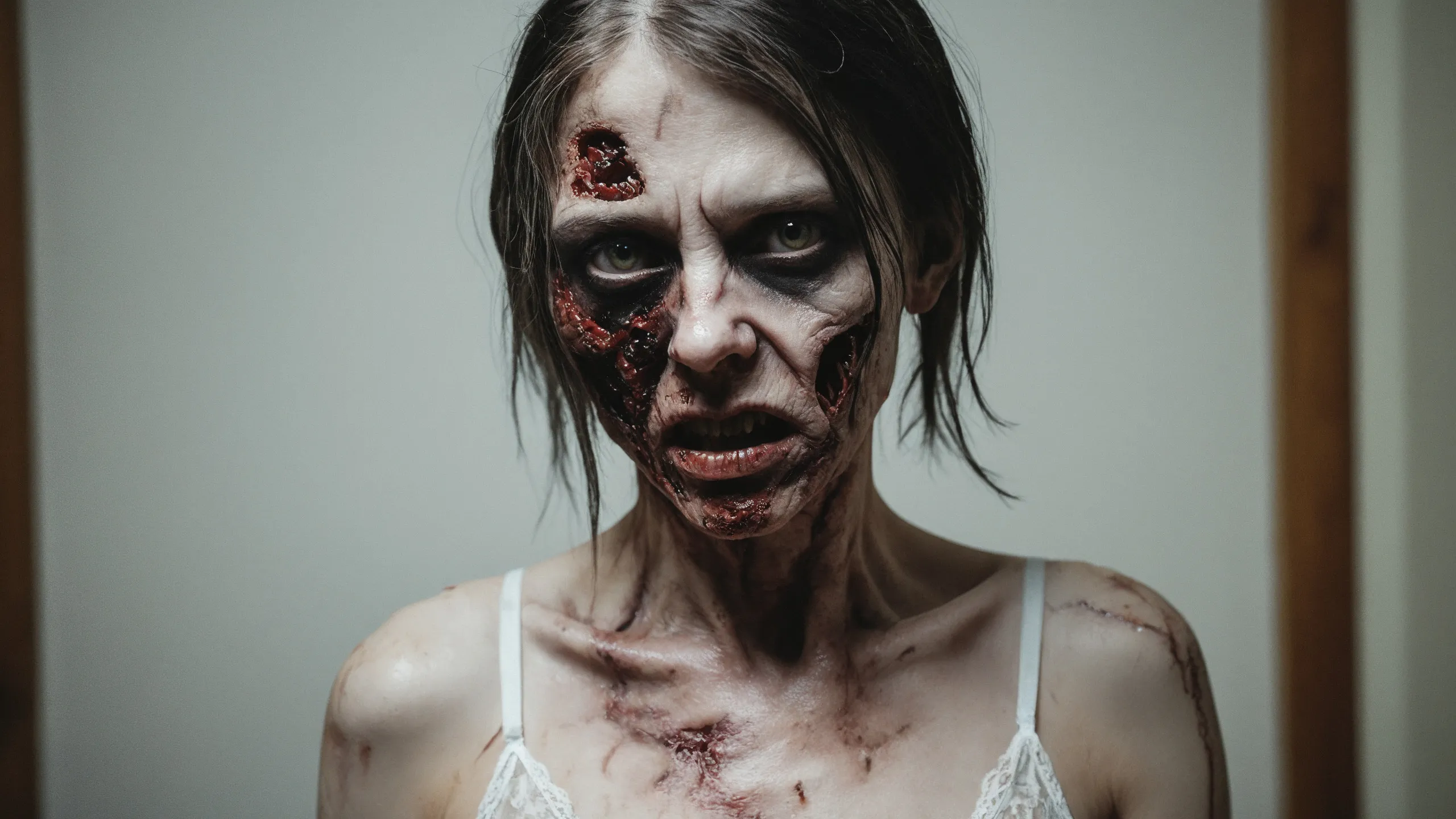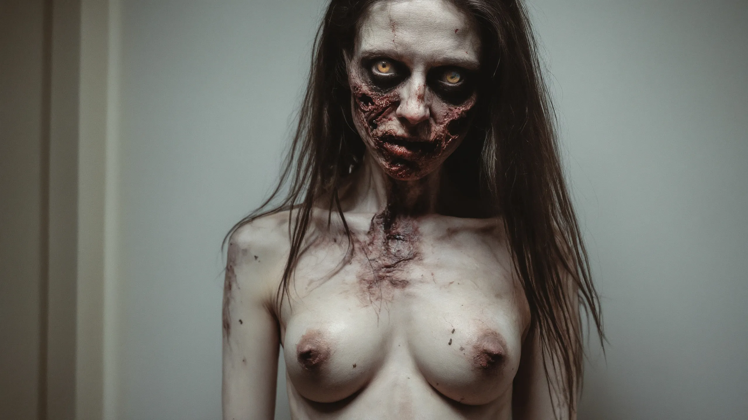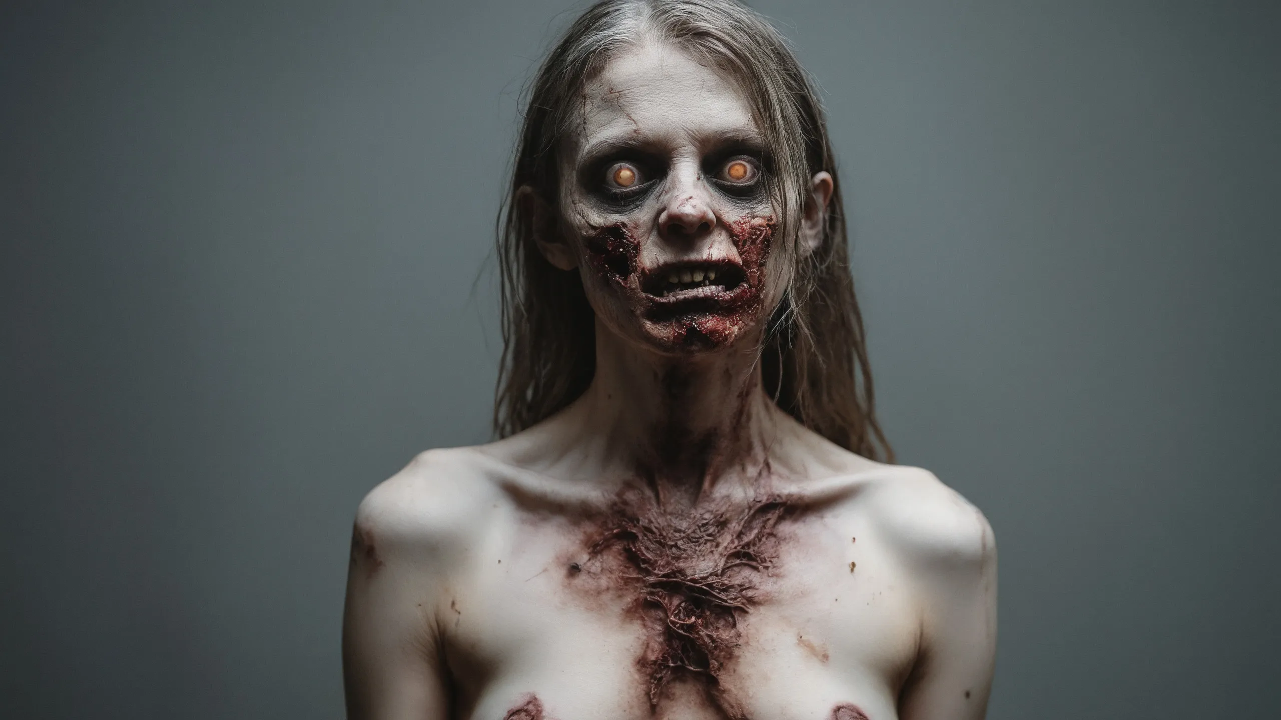 Cinematic {Portrait|Medium Range|Full body} photo of a ugly and scary zombie girl.