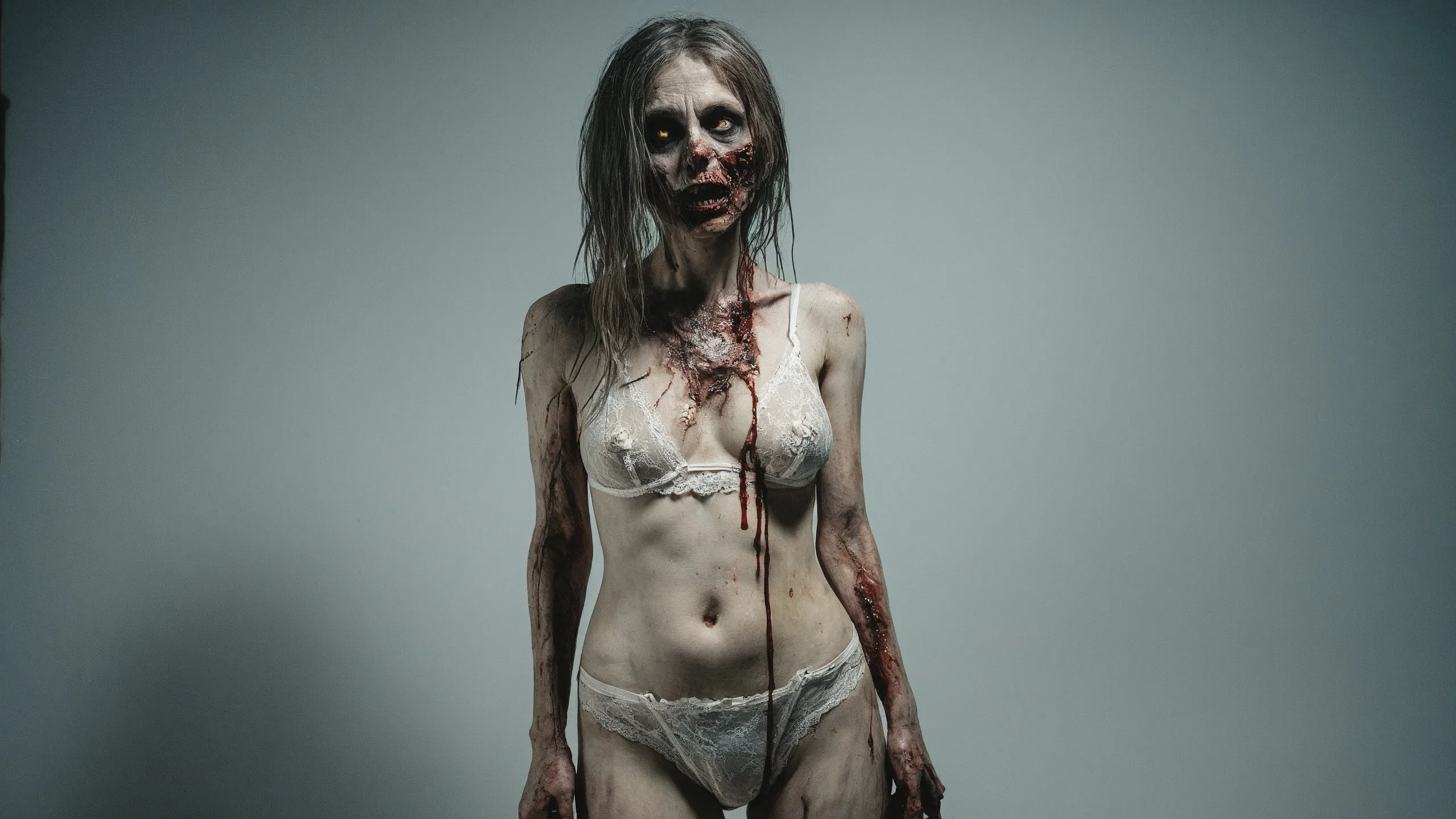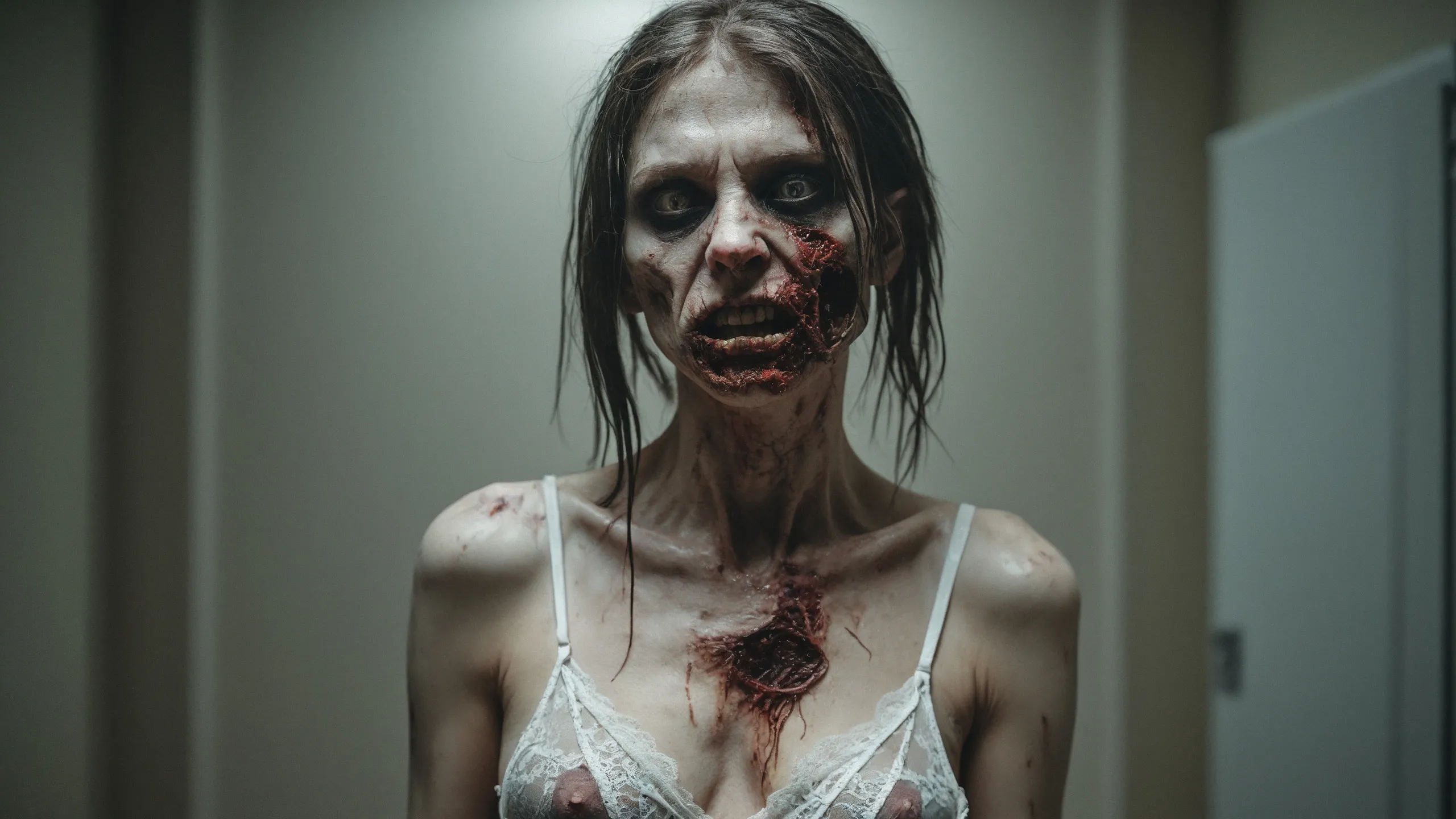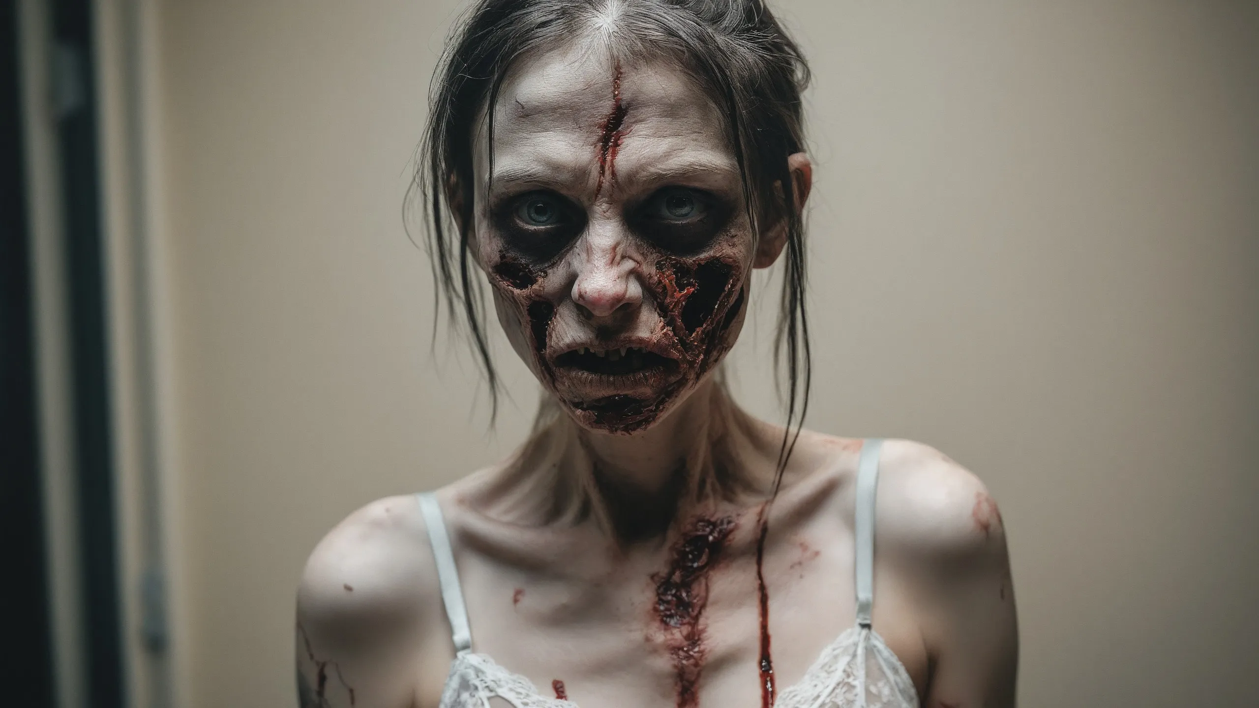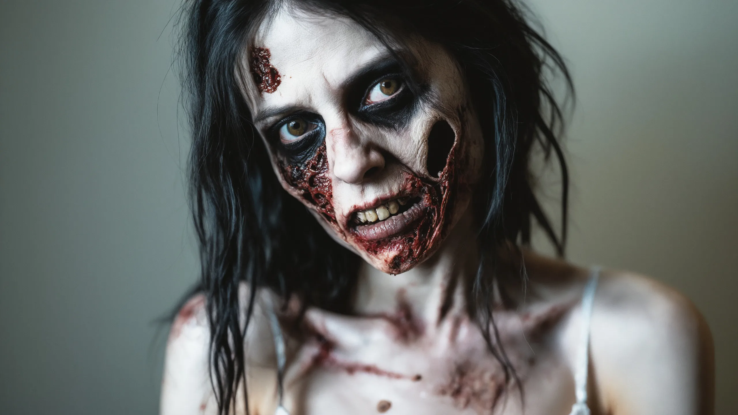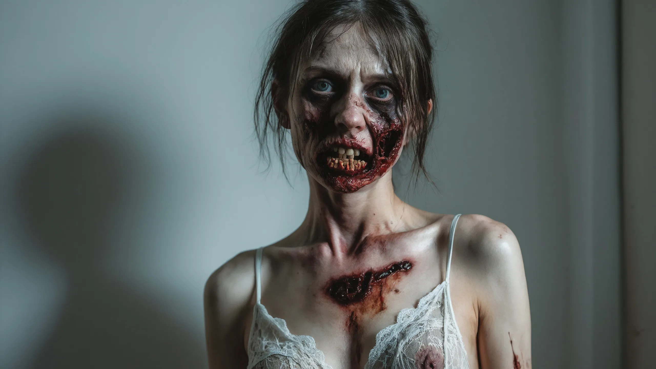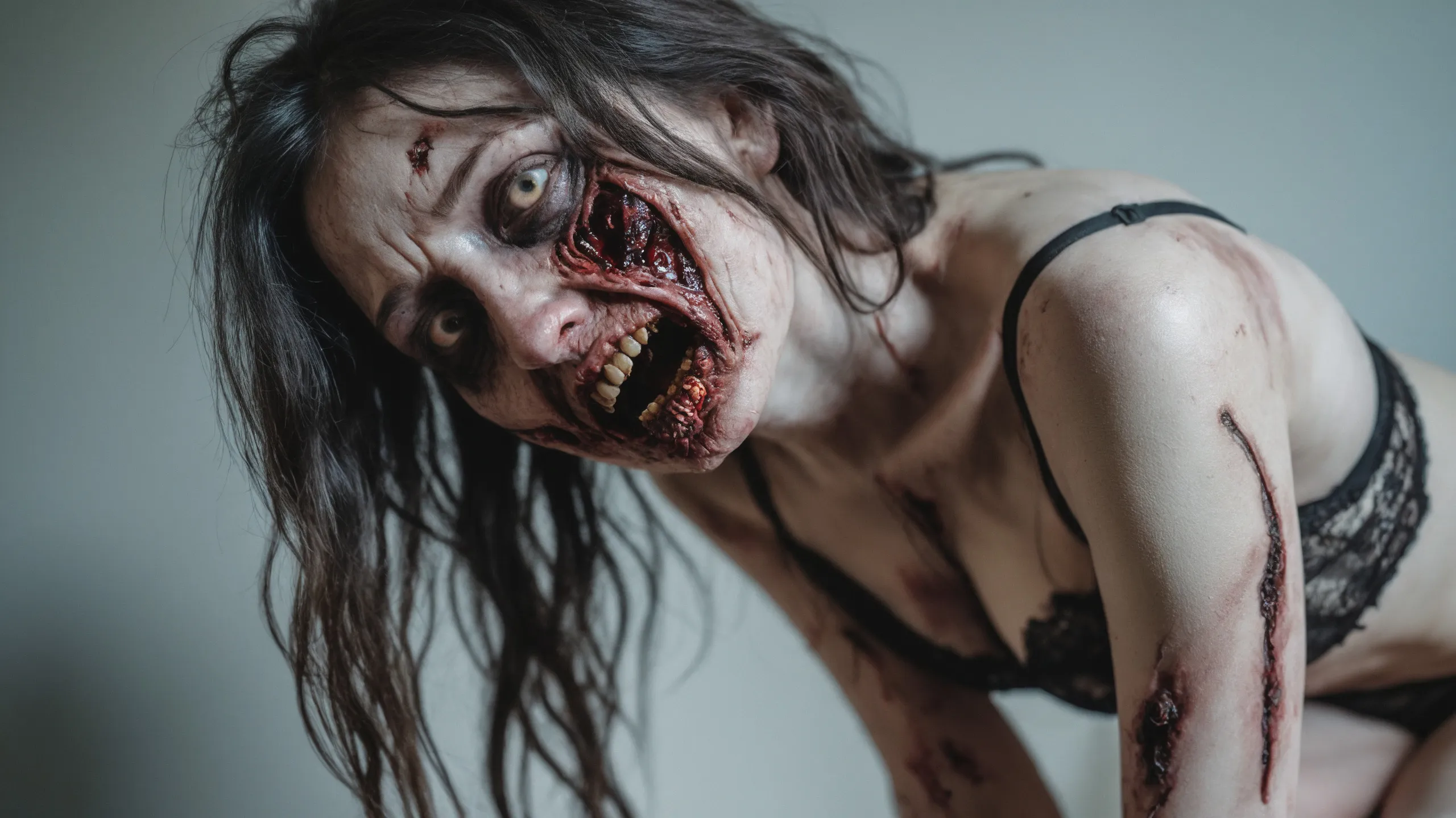 Cinematic {Portrait|Medium Range|Full body} photo of a ugly and scary zombie girl.