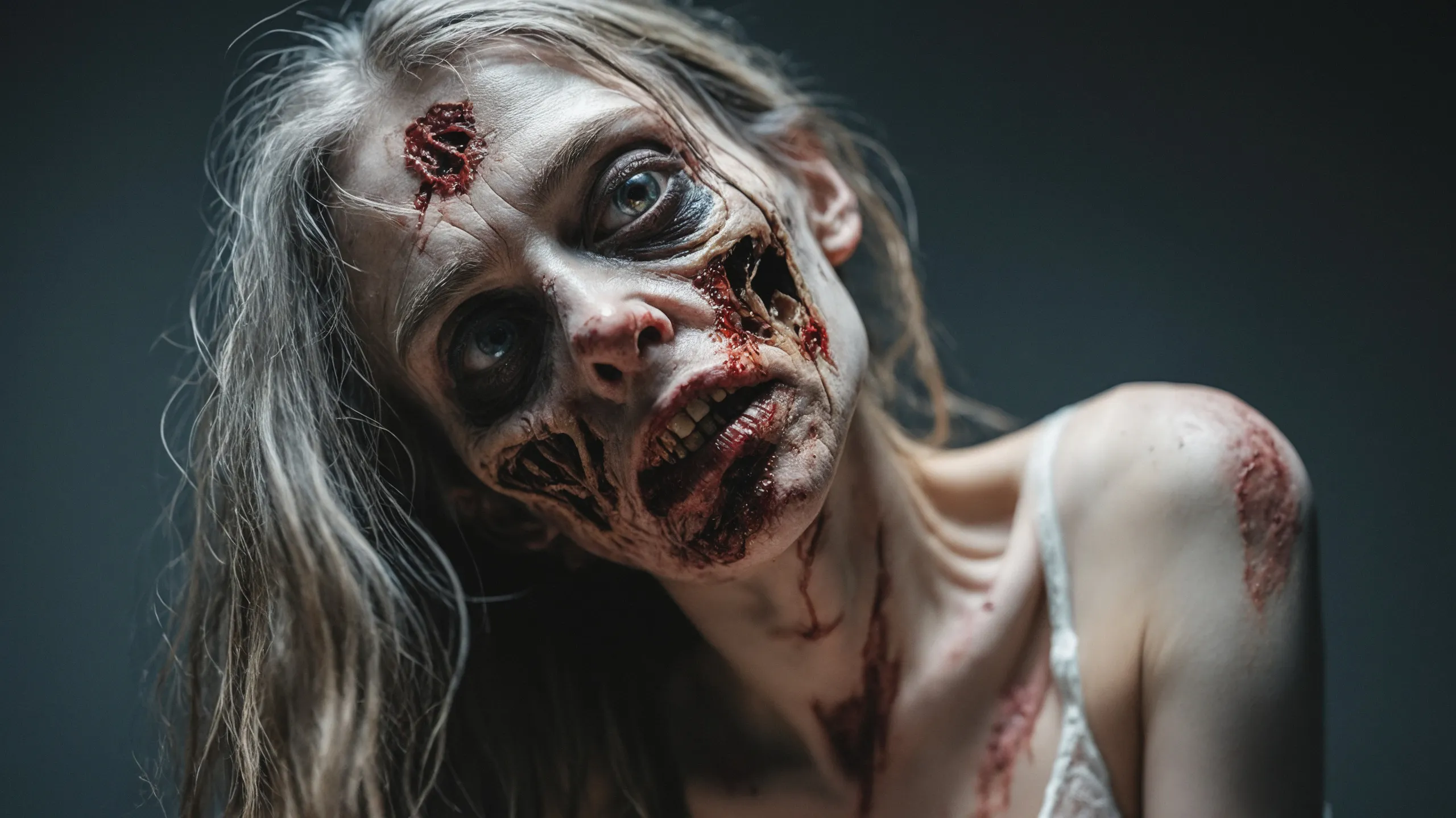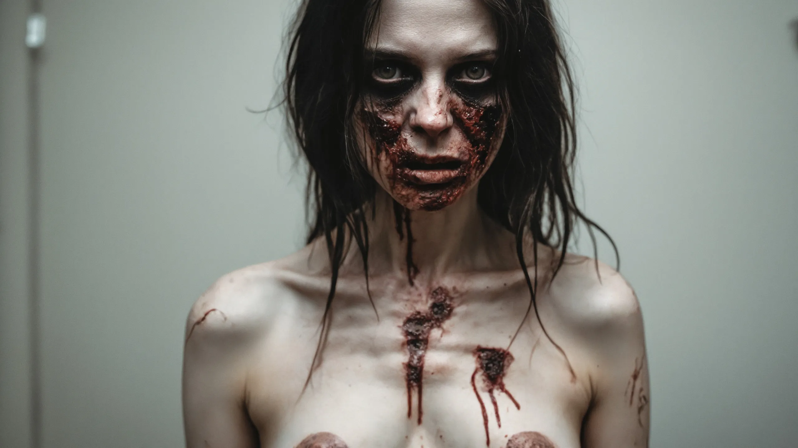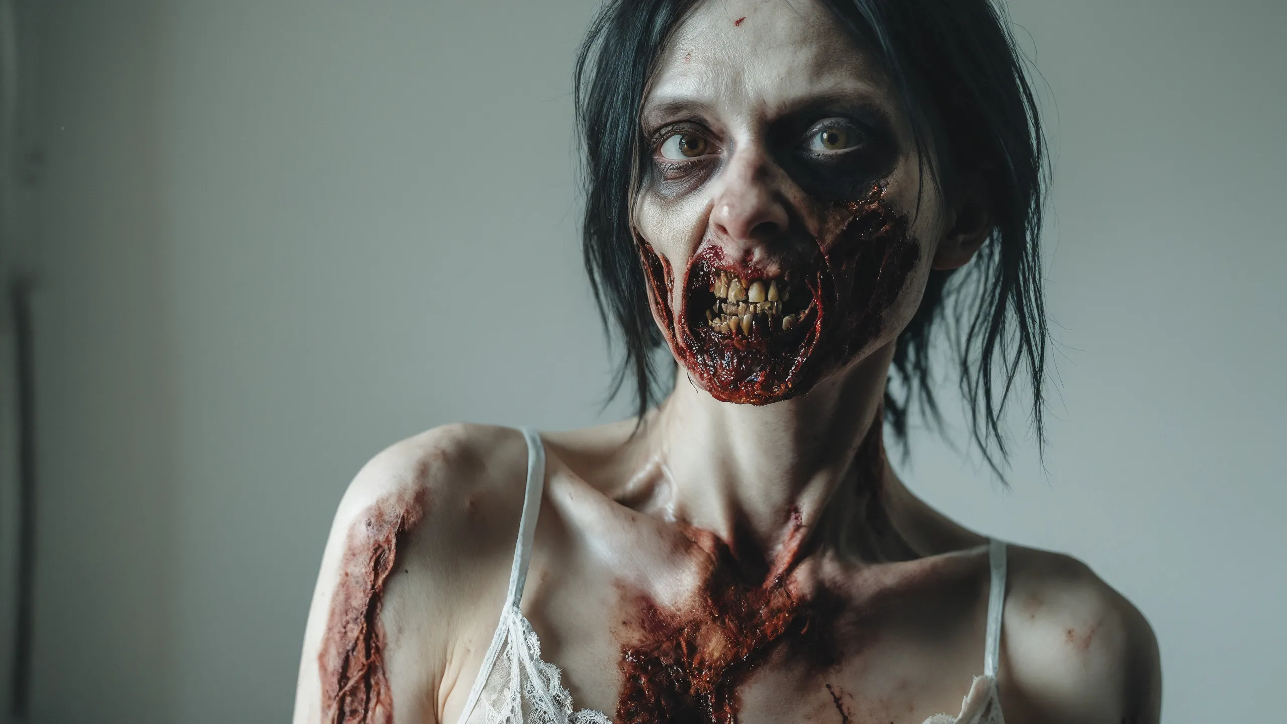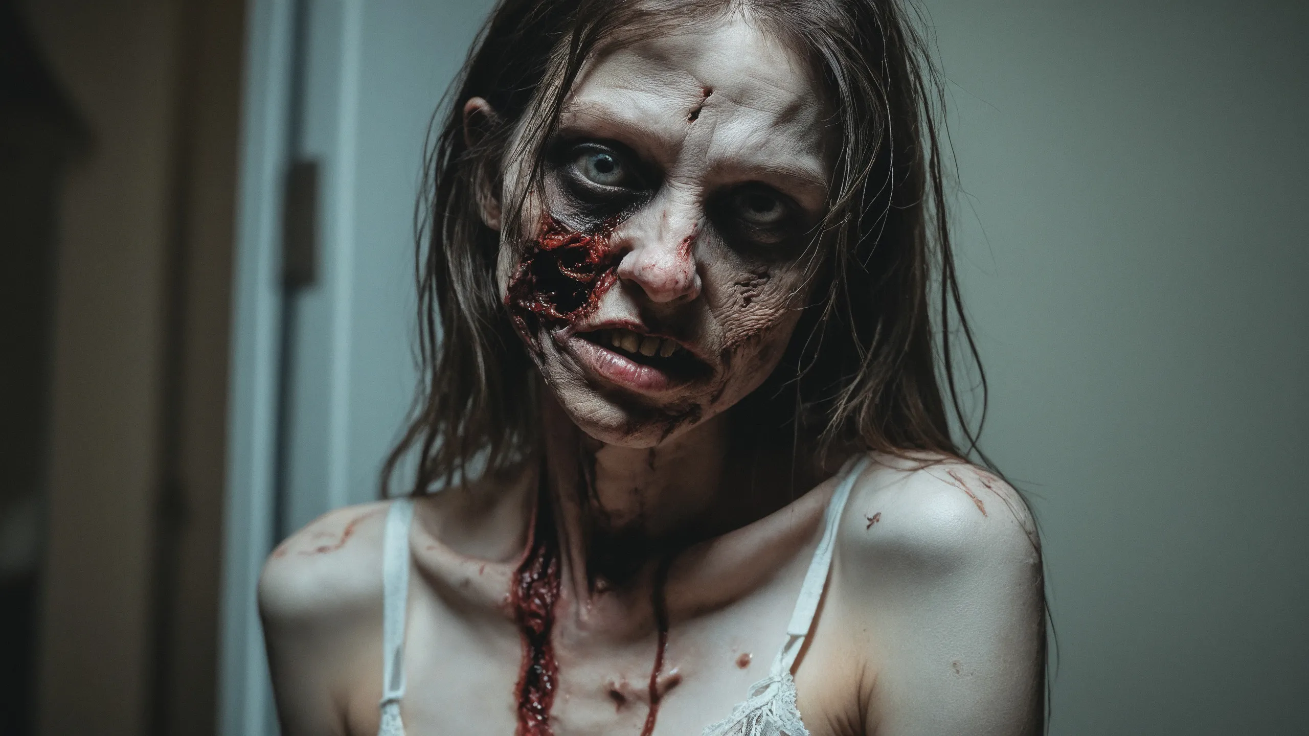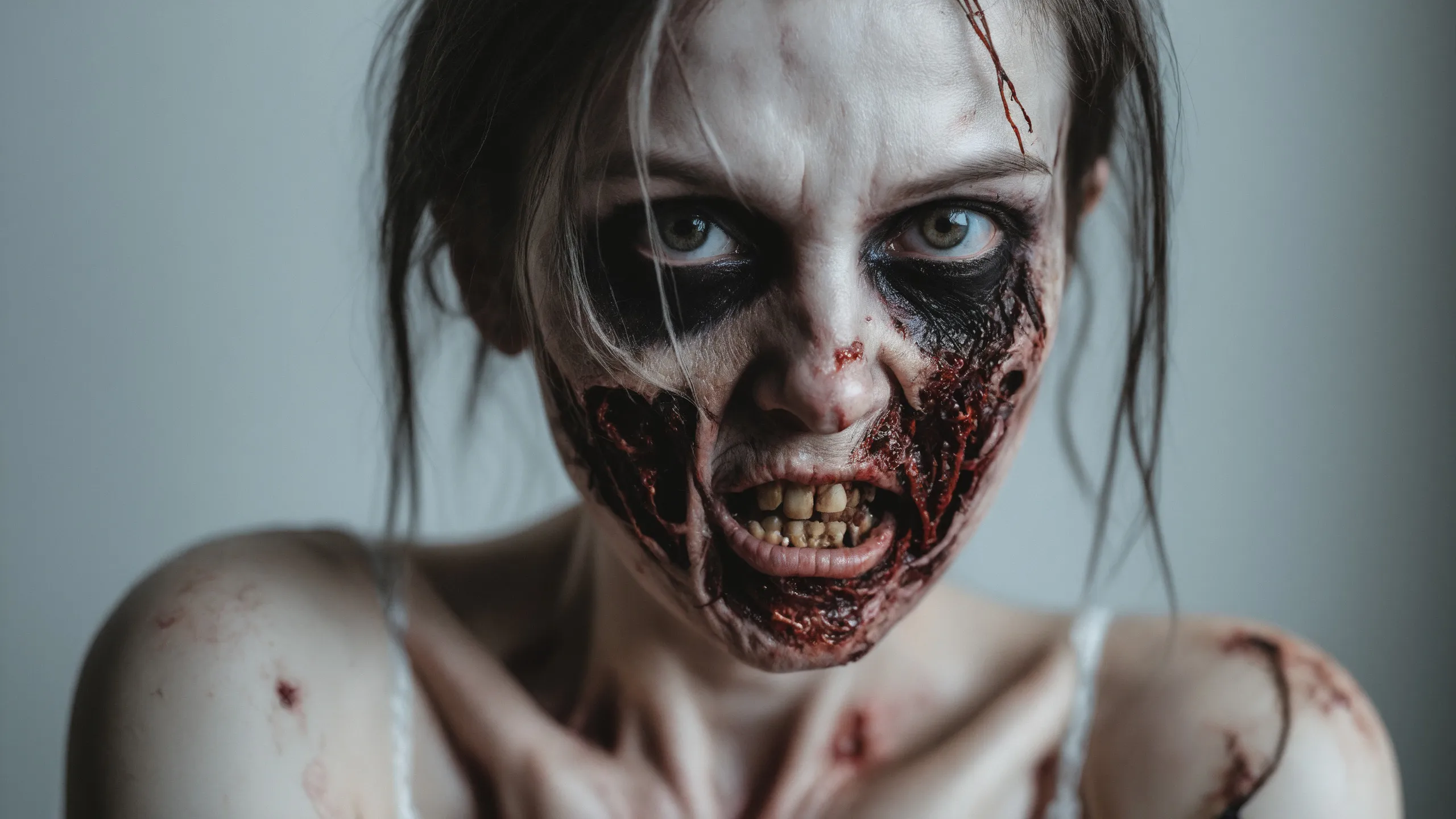 Cinematic {Portrait|Medium Range|Full body} photo of a ugly and scary zombie girl.