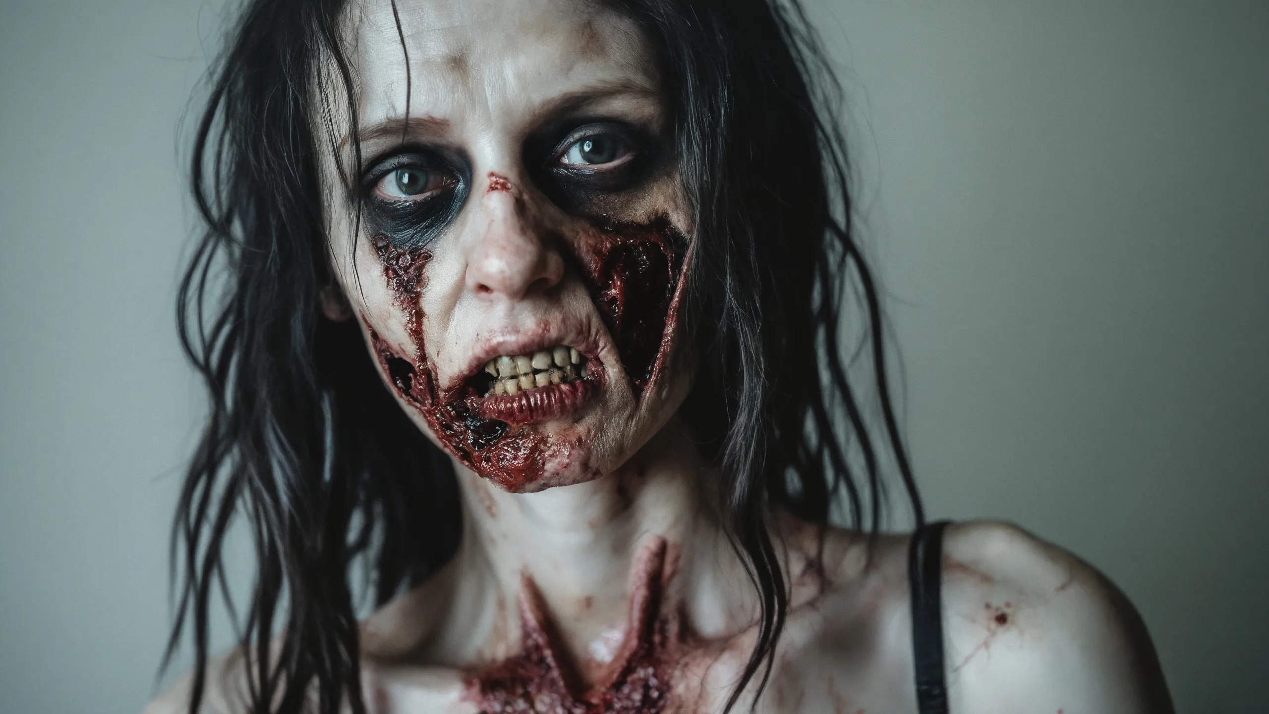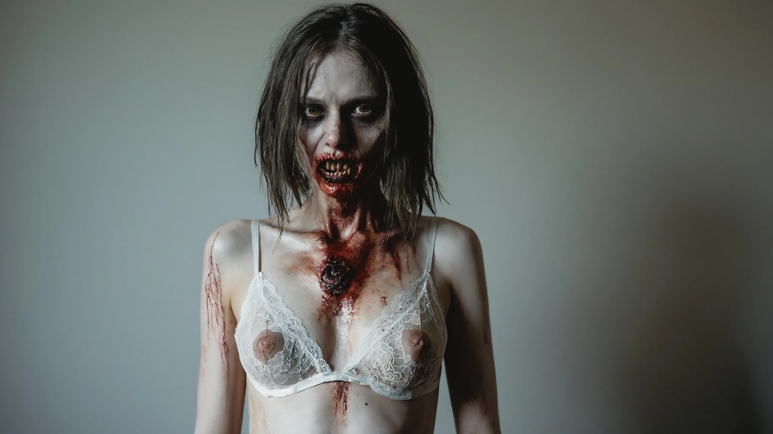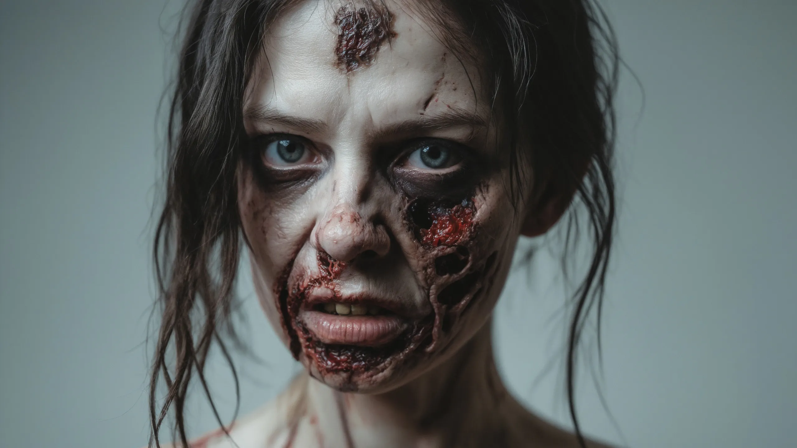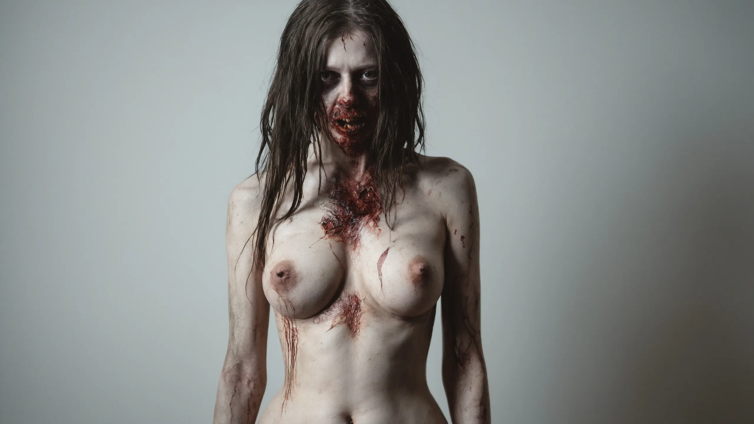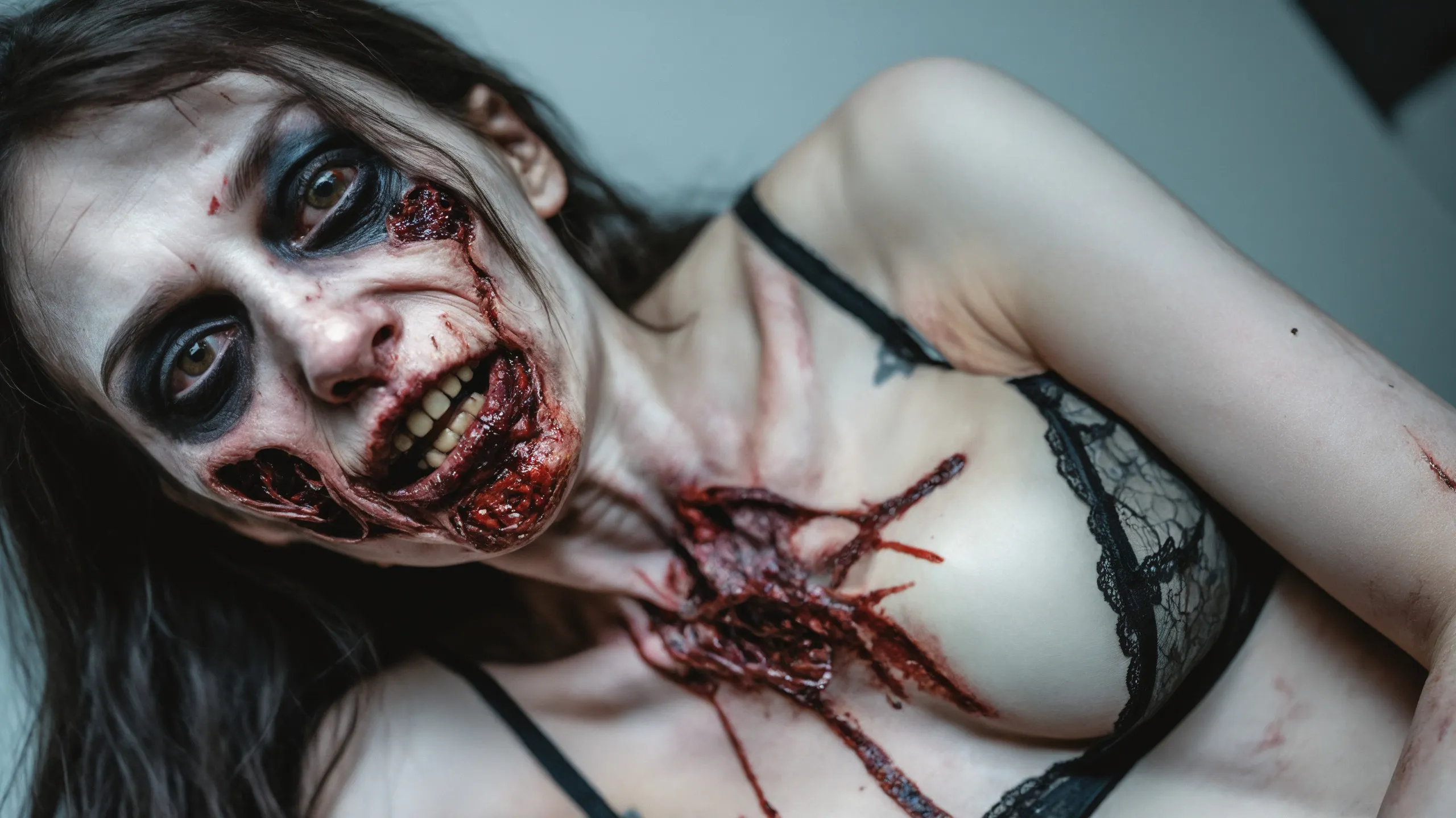 Cinematic {Portrait|Medium Range|Full body} photo of a ugly and scary zombie girl.