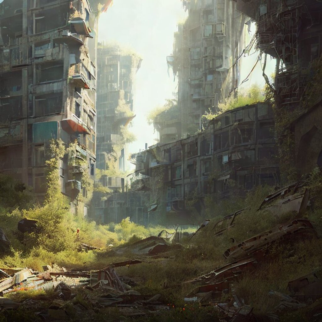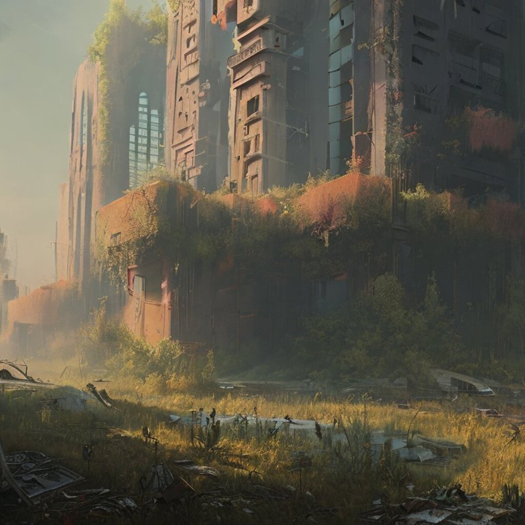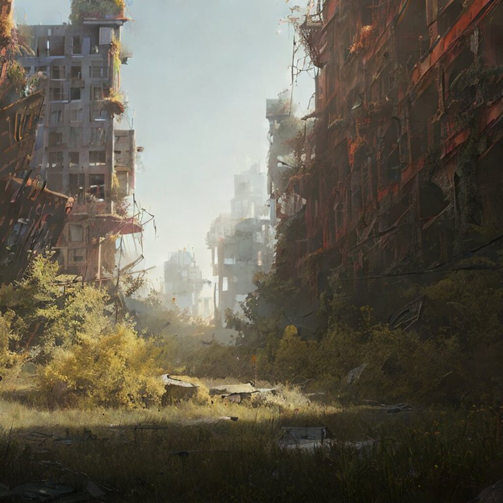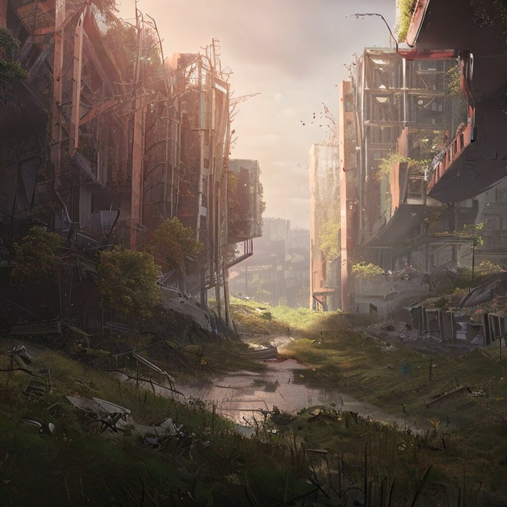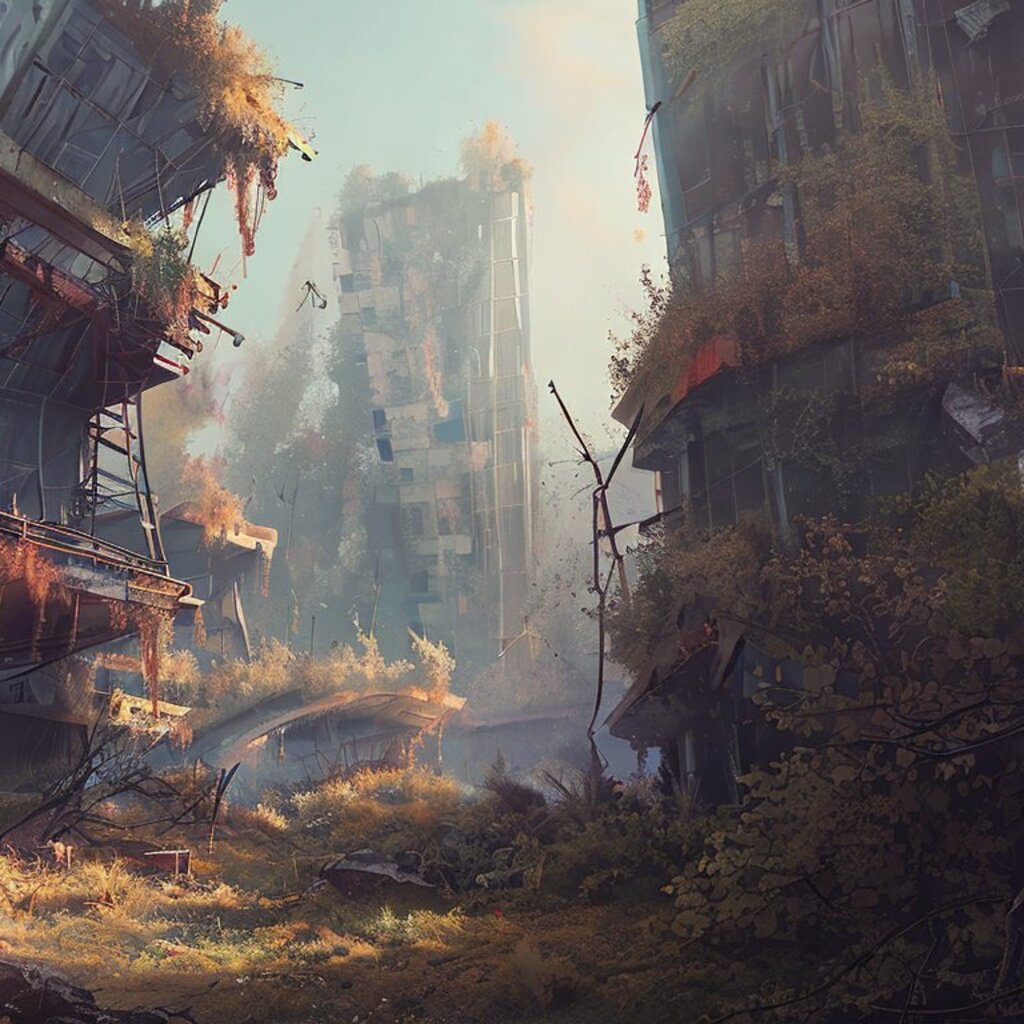 concept art of an abandoned ruined big city overgrown with nature by filip hodas and ismail inceoglu, hyper realistic, unreal engine, atmospheric, detailed, matte, godrays
