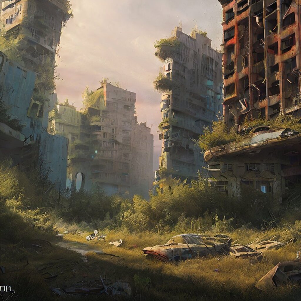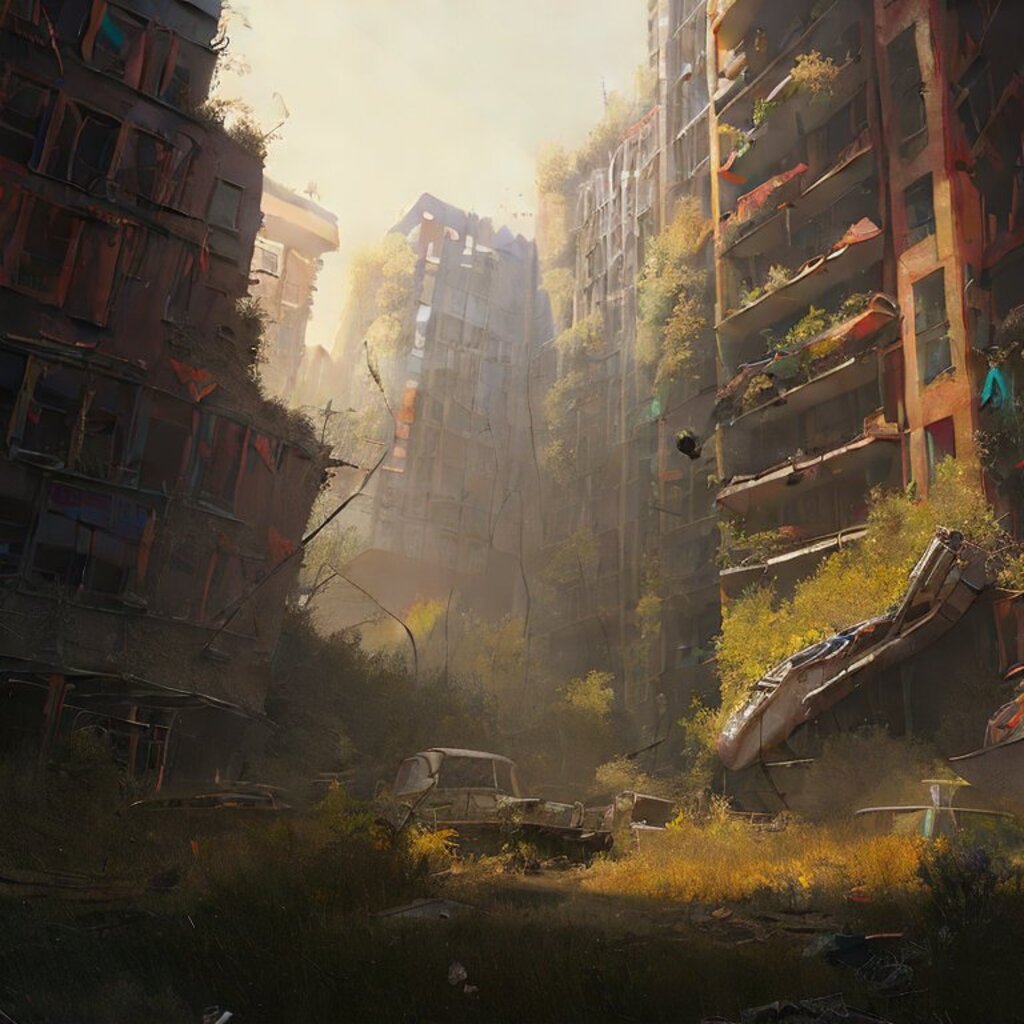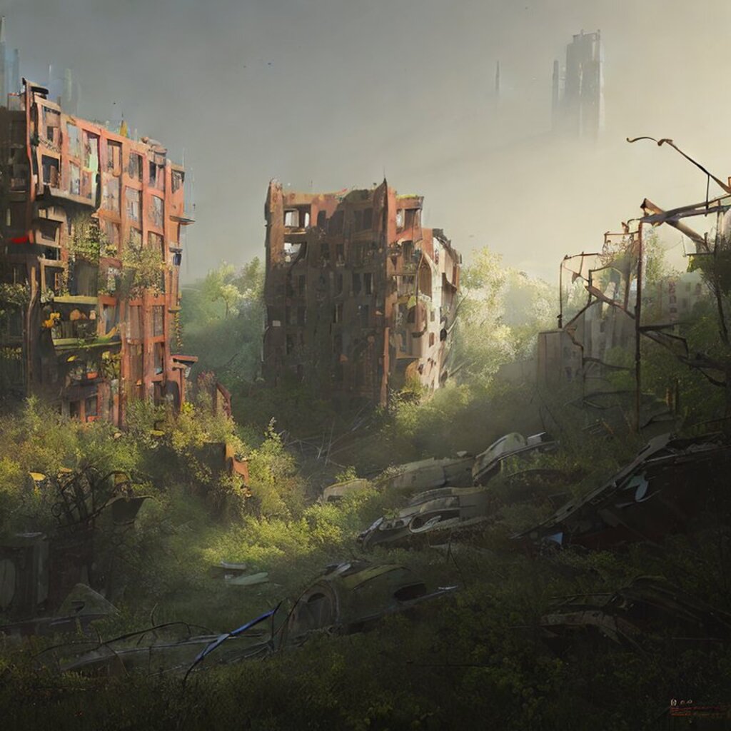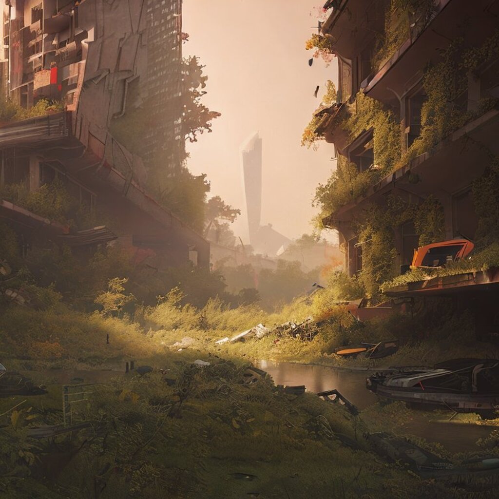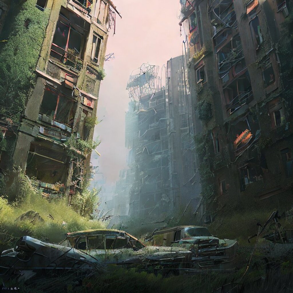 concept art of an abandoned ruined big city overgrown with nature by filip hodas and ismail inceoglu, hyper realistic, unreal engine, atmospheric, detailed, matte, godrays