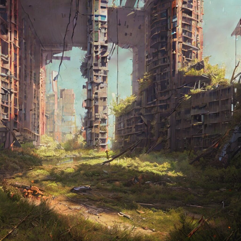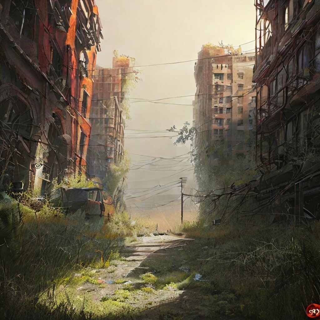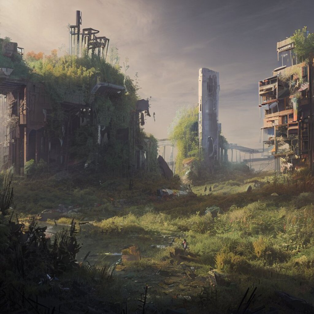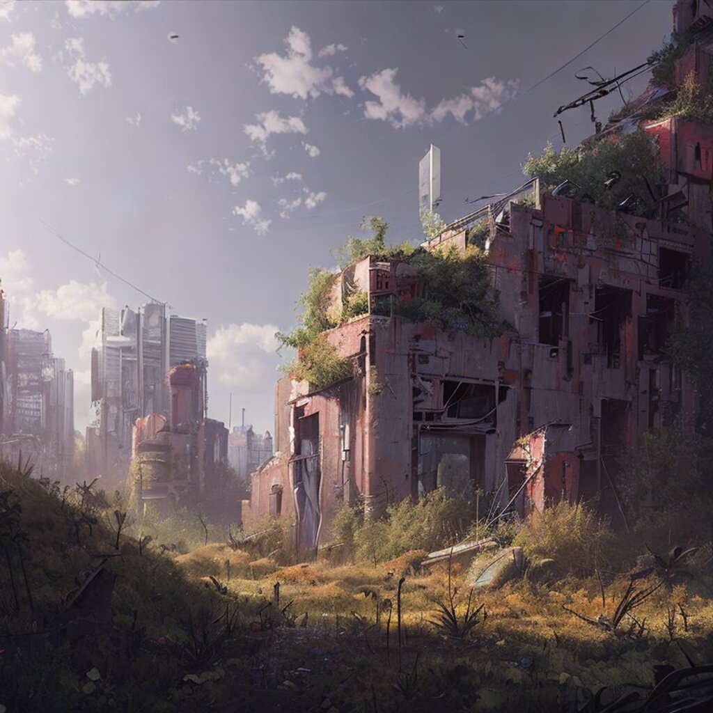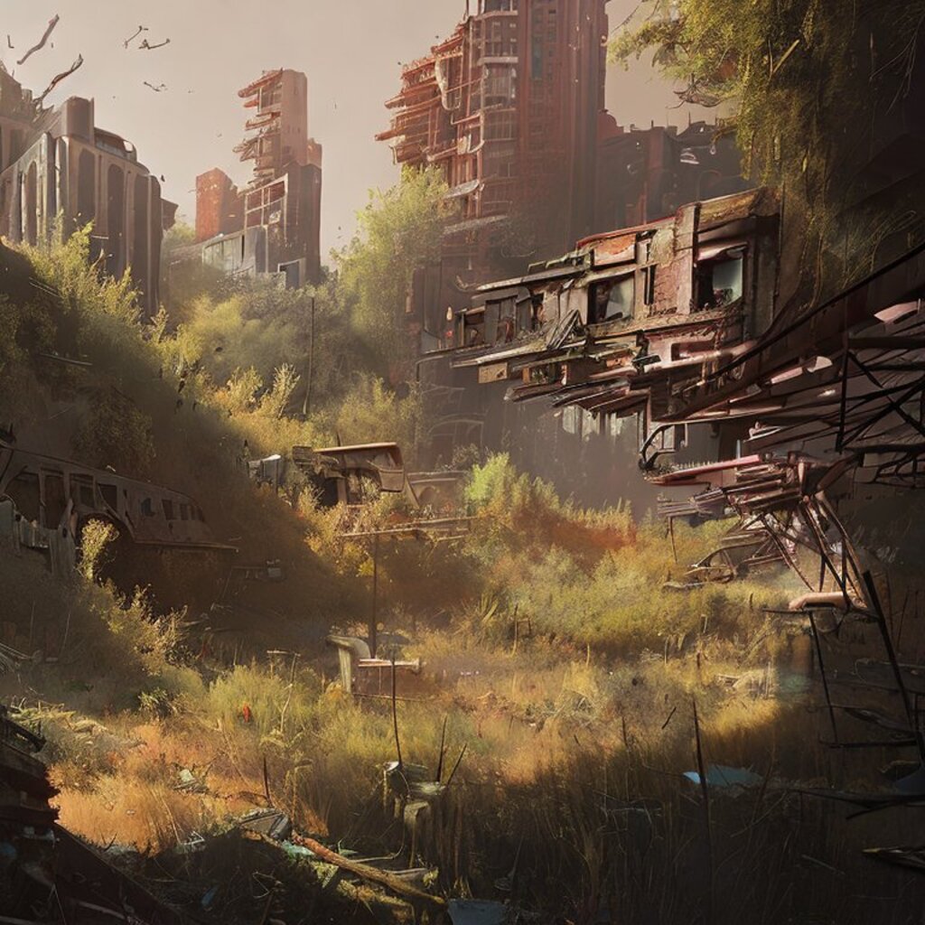 concept art of an abandoned ruined big city overgrown with nature by filip hodas and ismail inceoglu, hyper realistic, unreal engine, atmospheric, detailed, matte, godrays