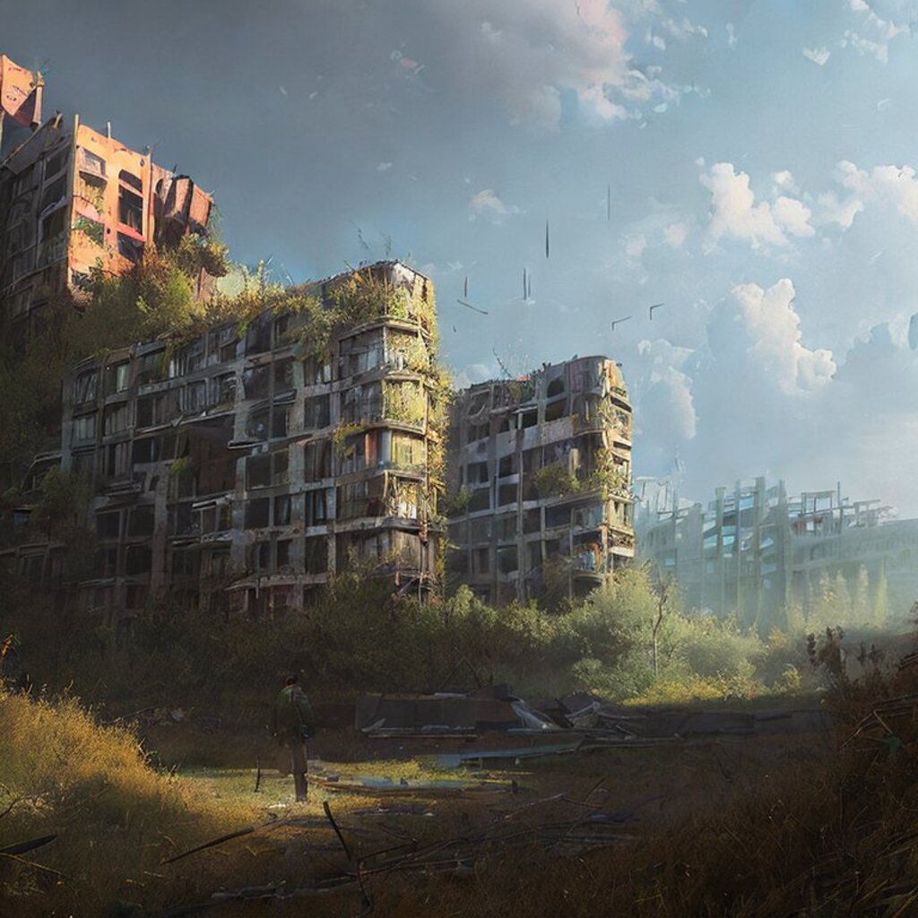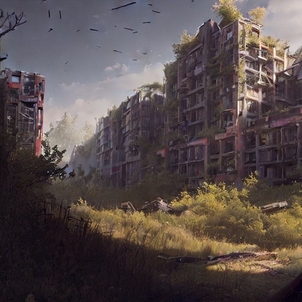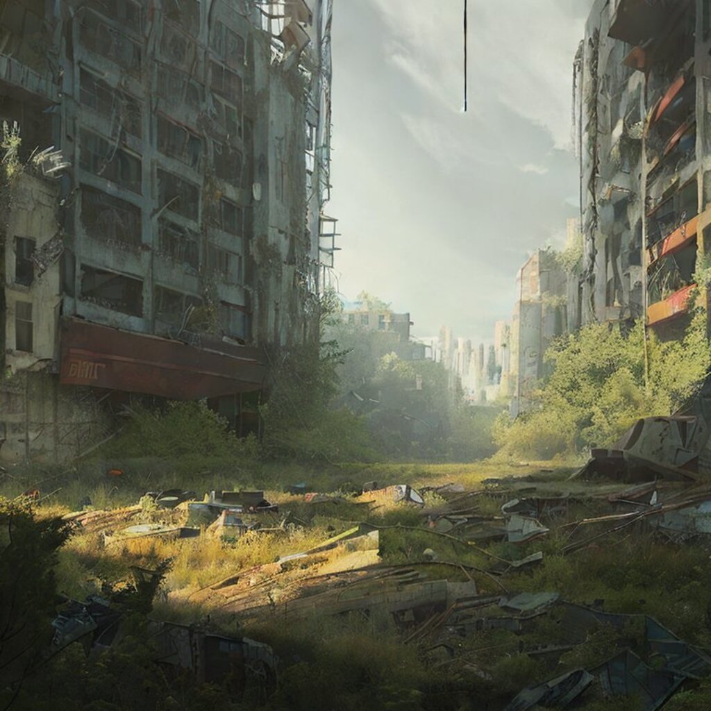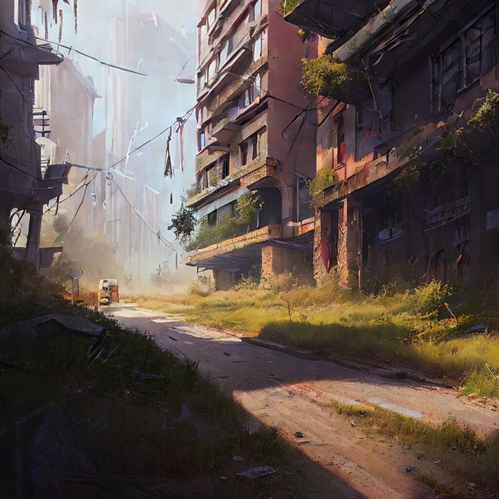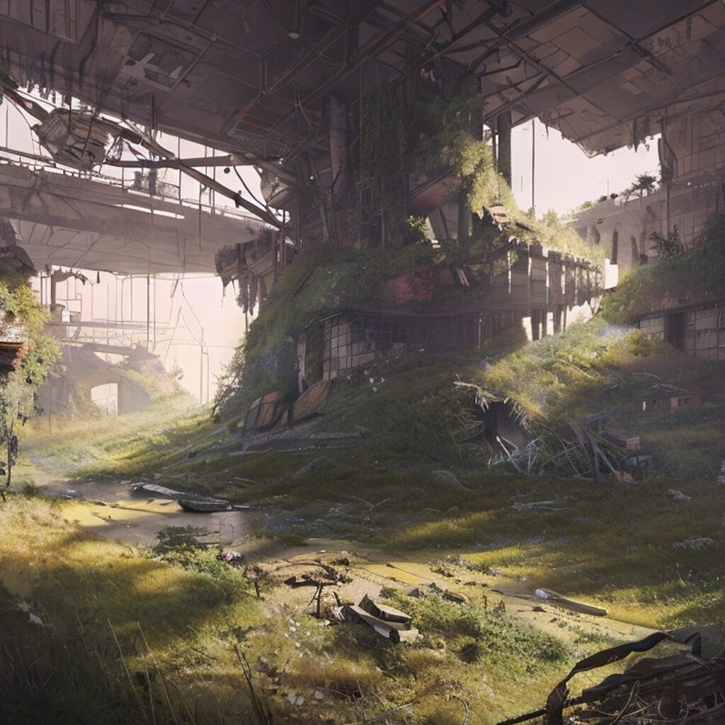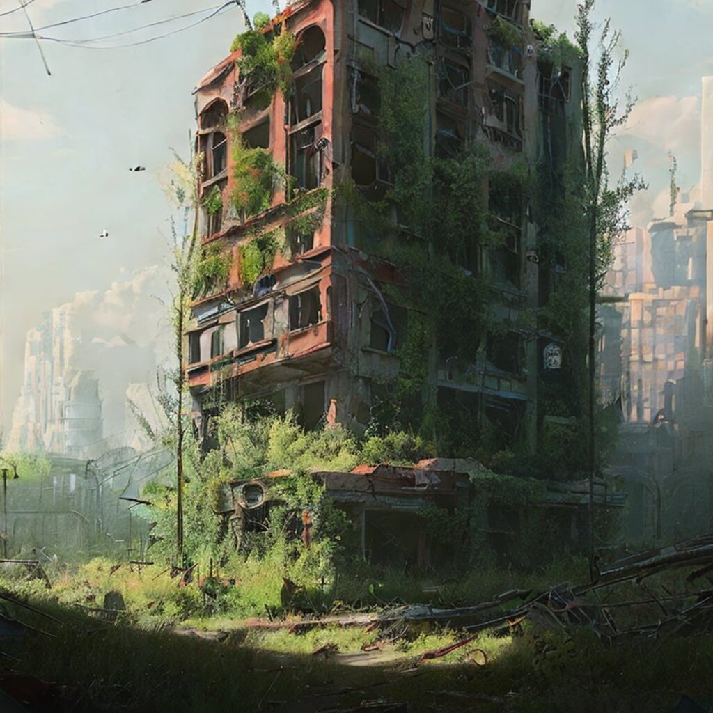 concept art of an abandoned ruined big city overgrown with nature by filip hodas and ismail inceoglu, hyper realistic, unreal engine, atmospheric, detailed, matte, godrays