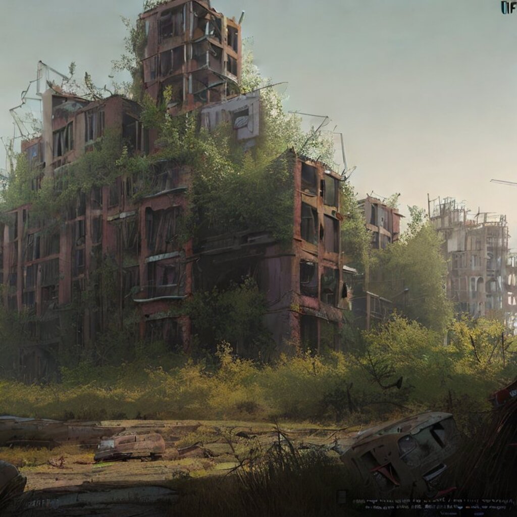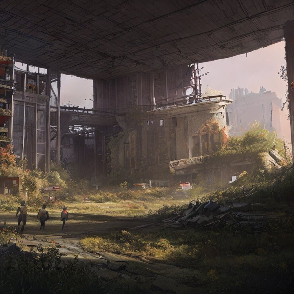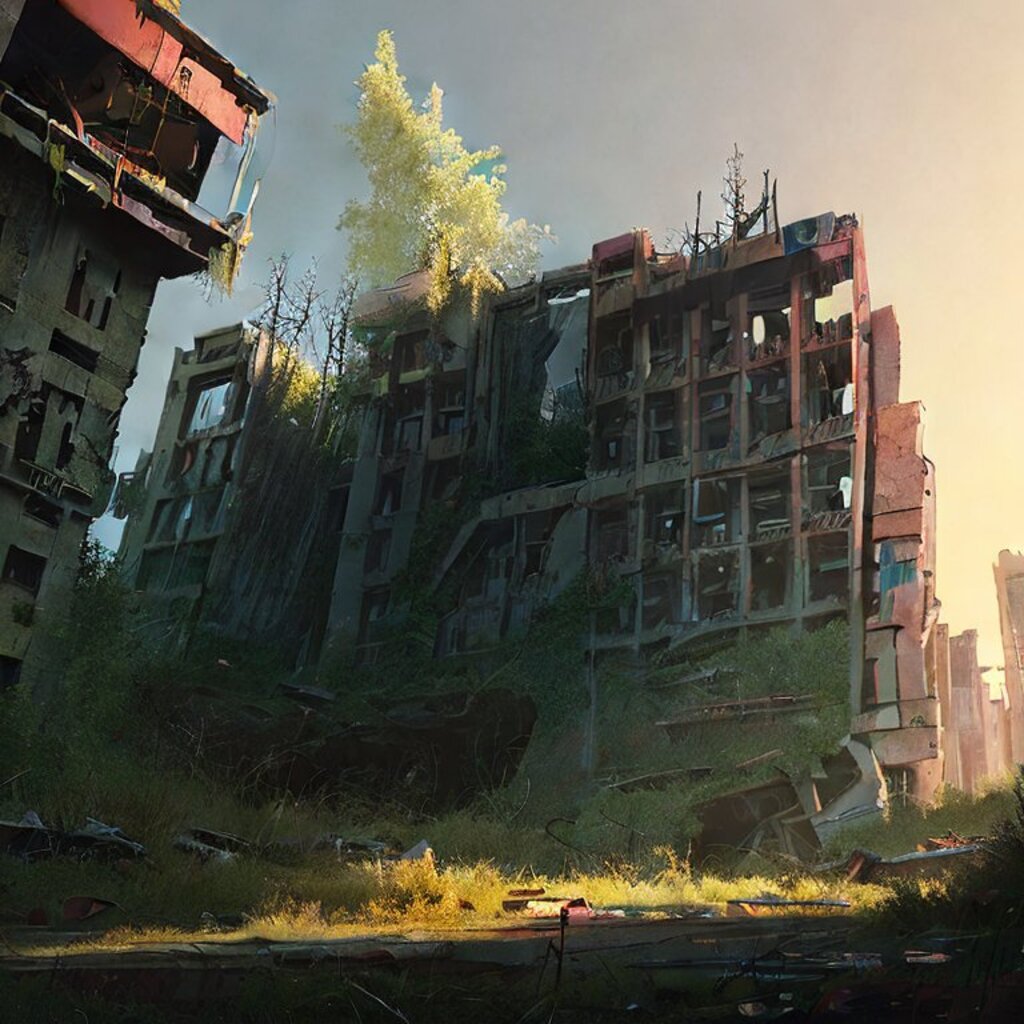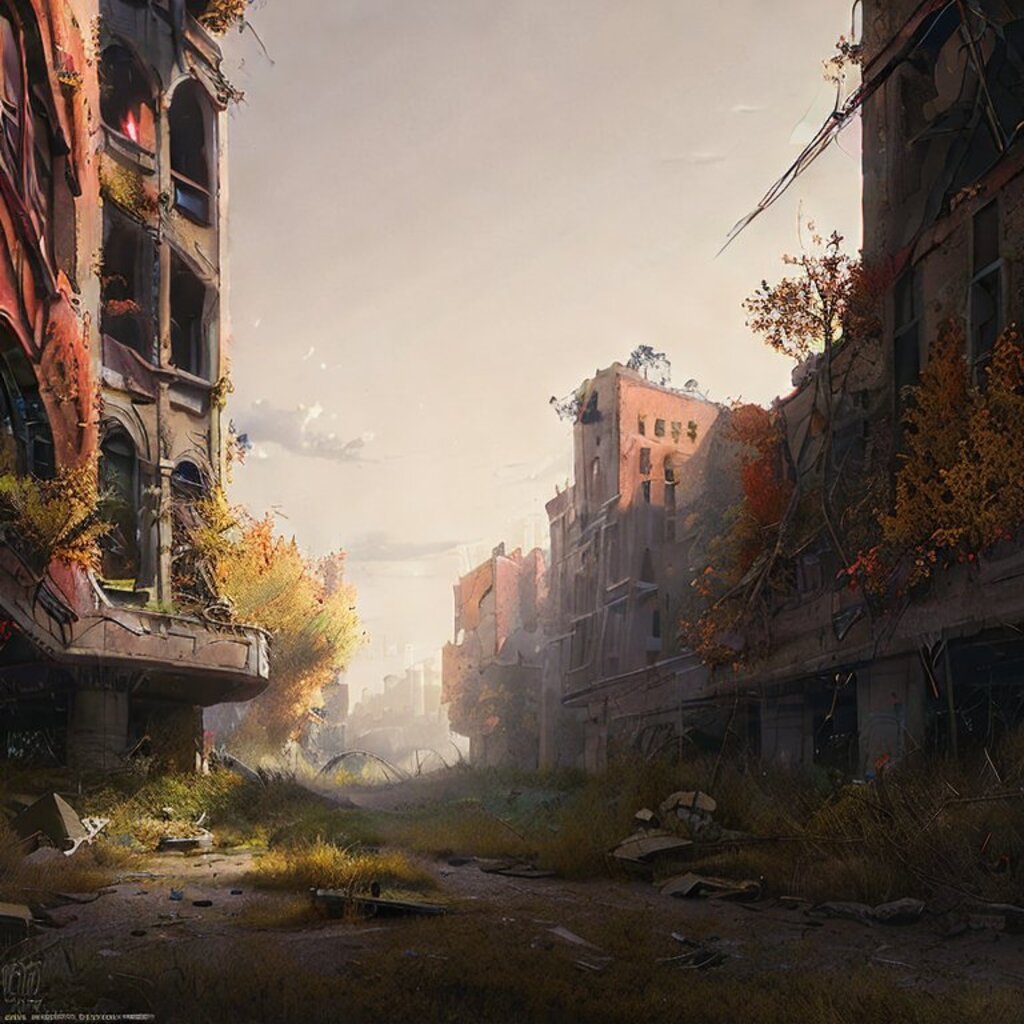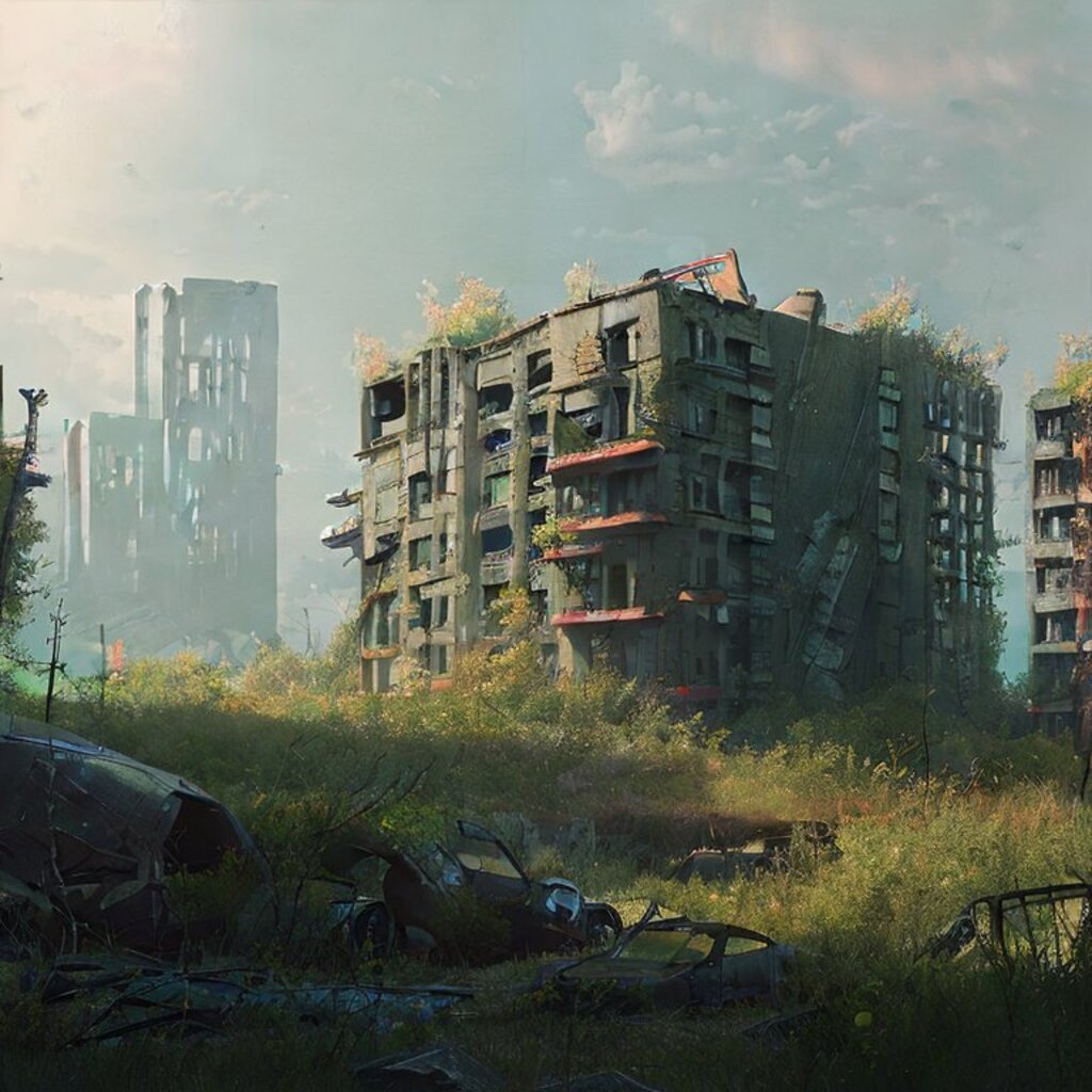 concept art of an abandoned ruined big city overgrown with nature by filip hodas and ismail inceoglu, hyper realistic, unreal engine, atmospheric, detailed, matte, godrays