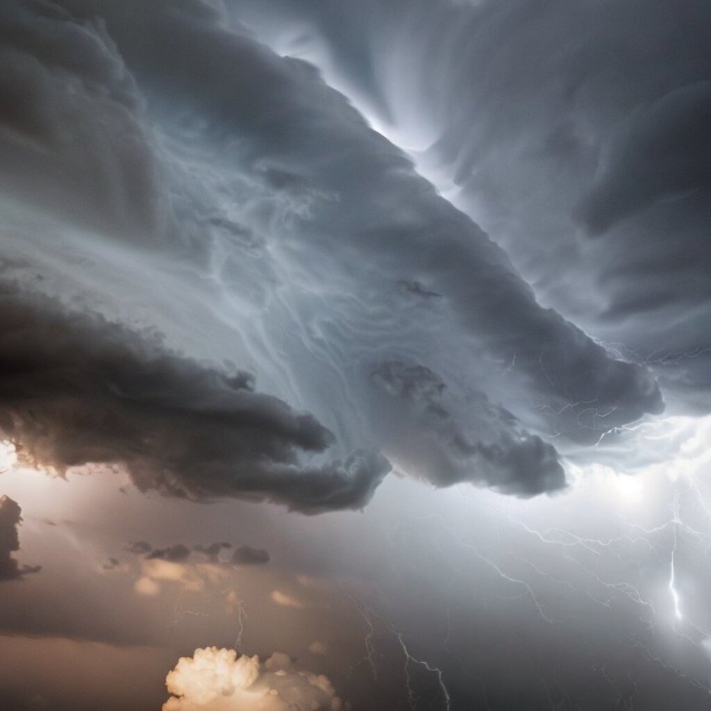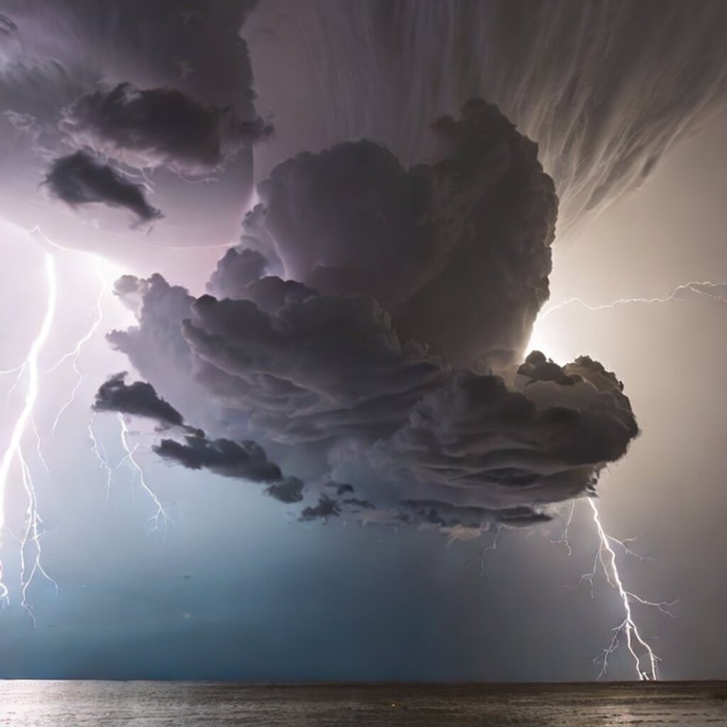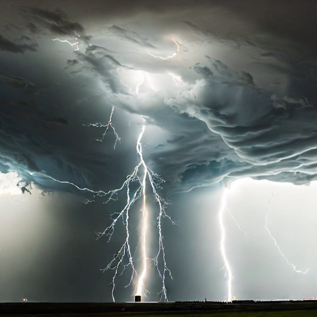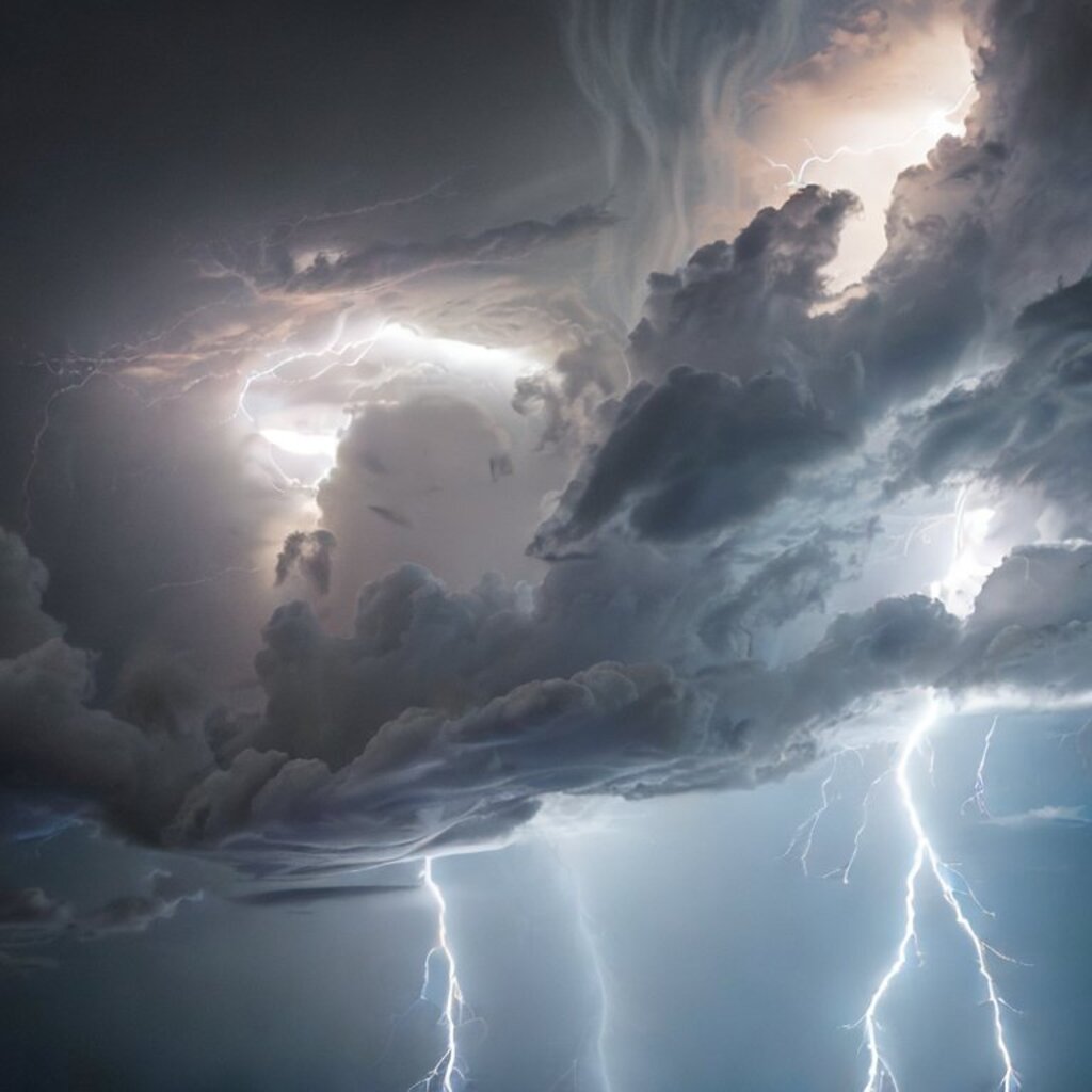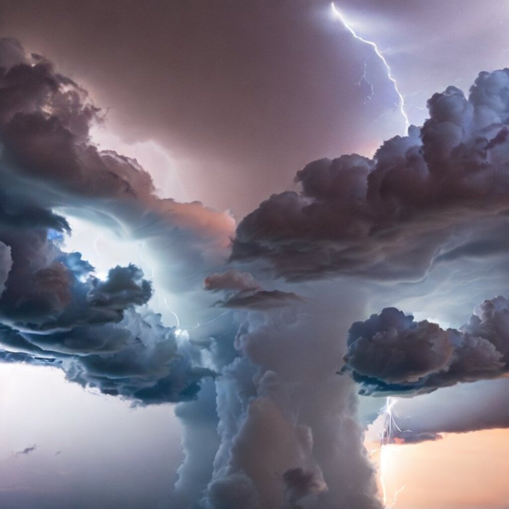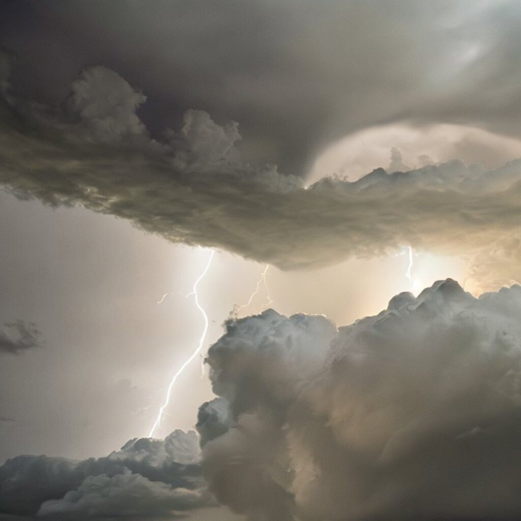 huge thunderstorm clouds like a tunnel, dramatic light, lightning