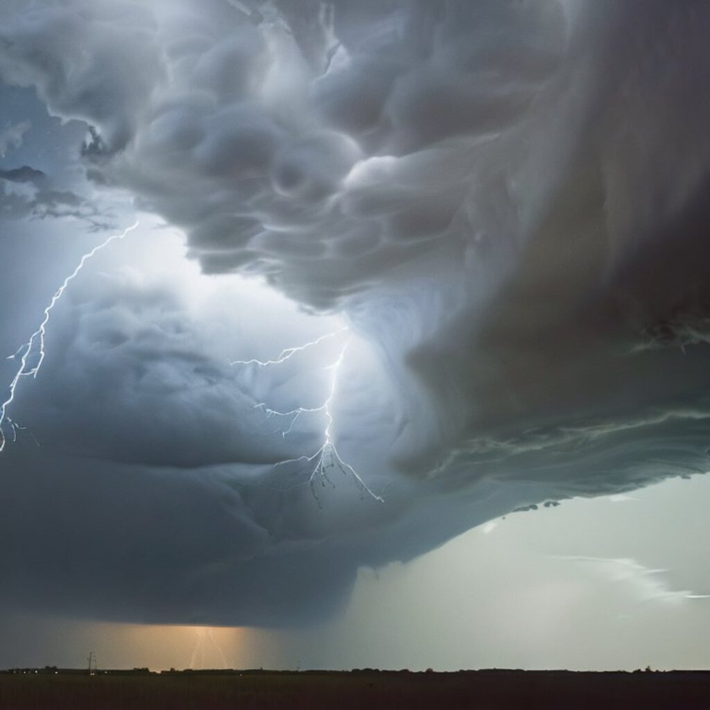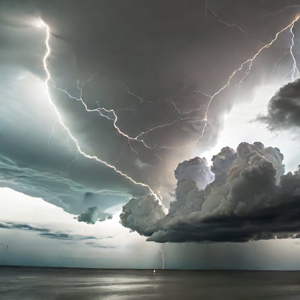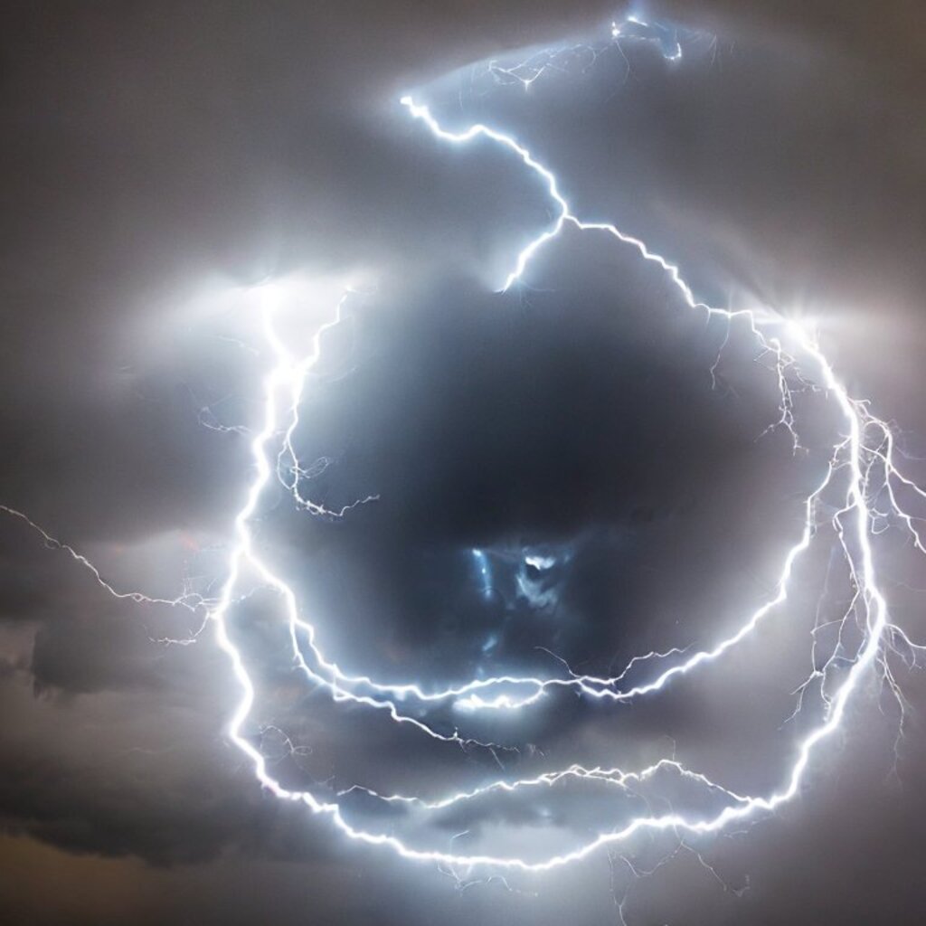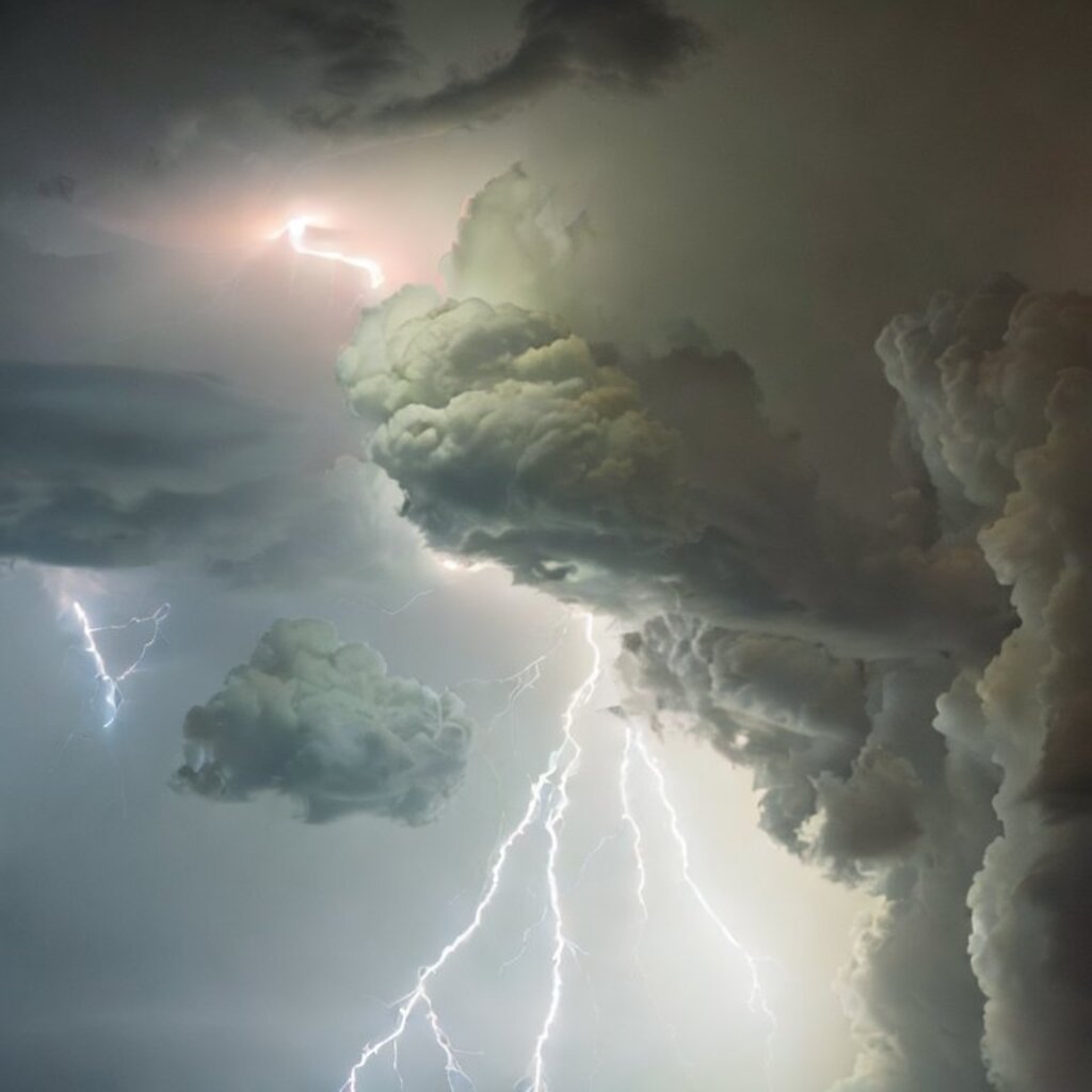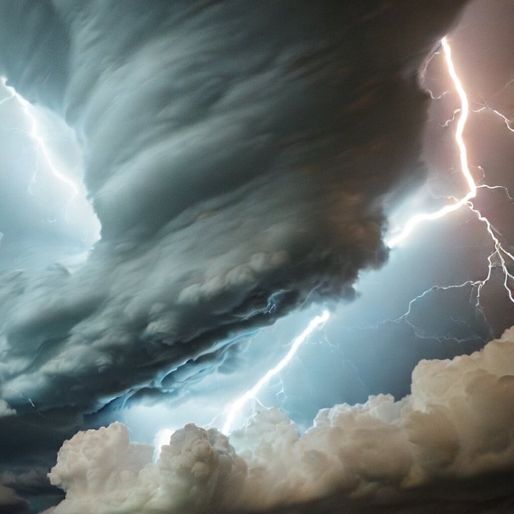 huge thunderstorm clouds like a tunnel, dramatic light, lightning